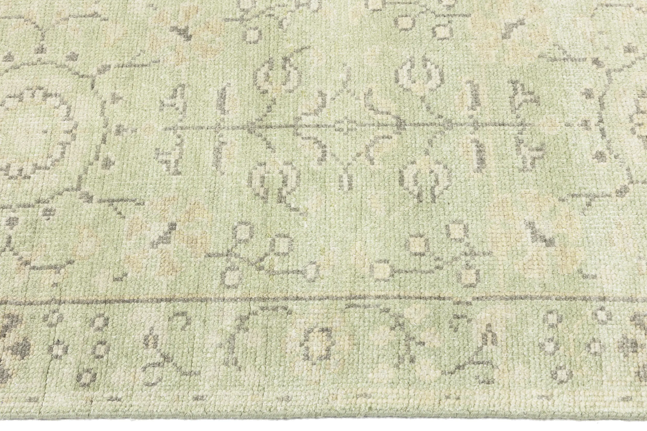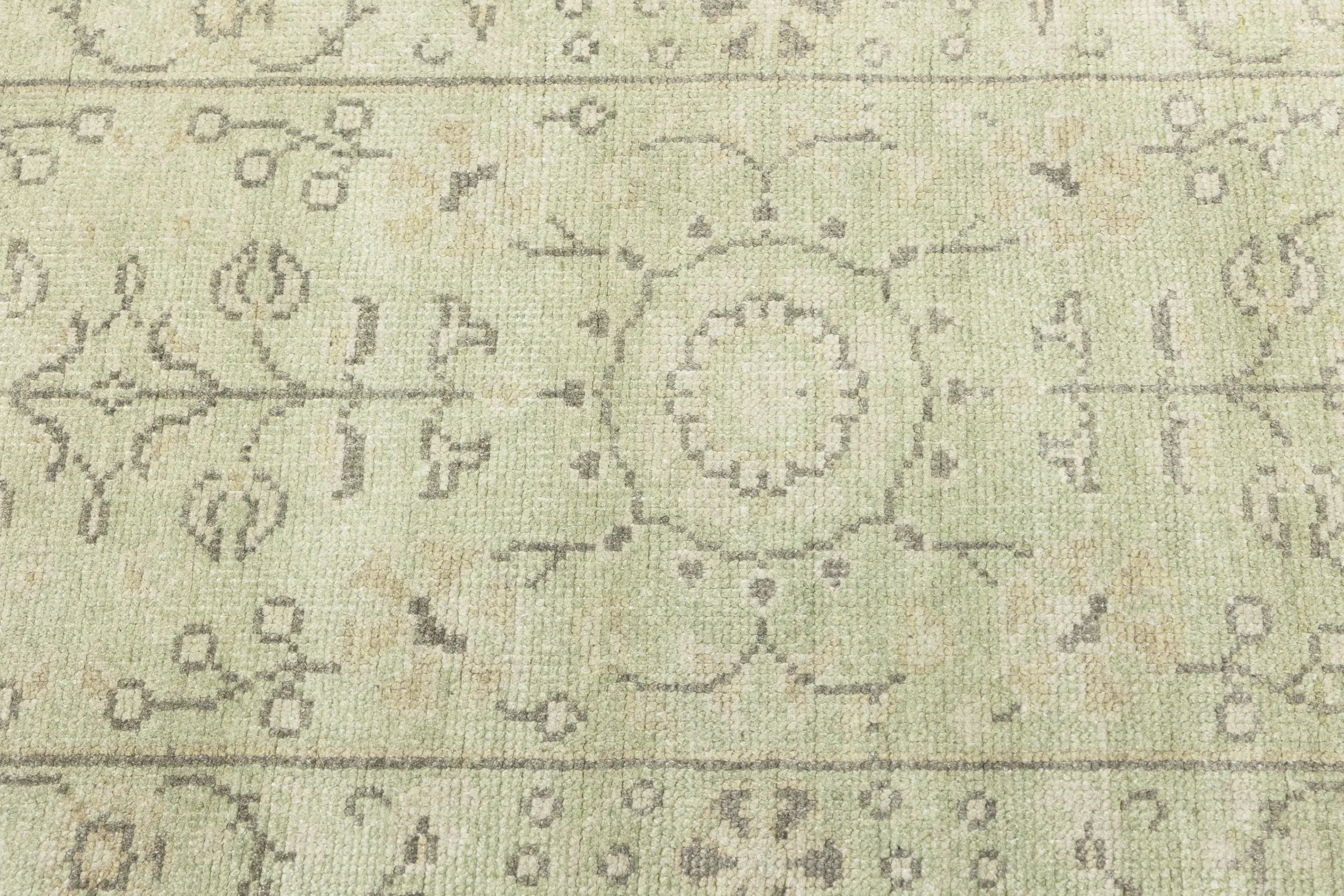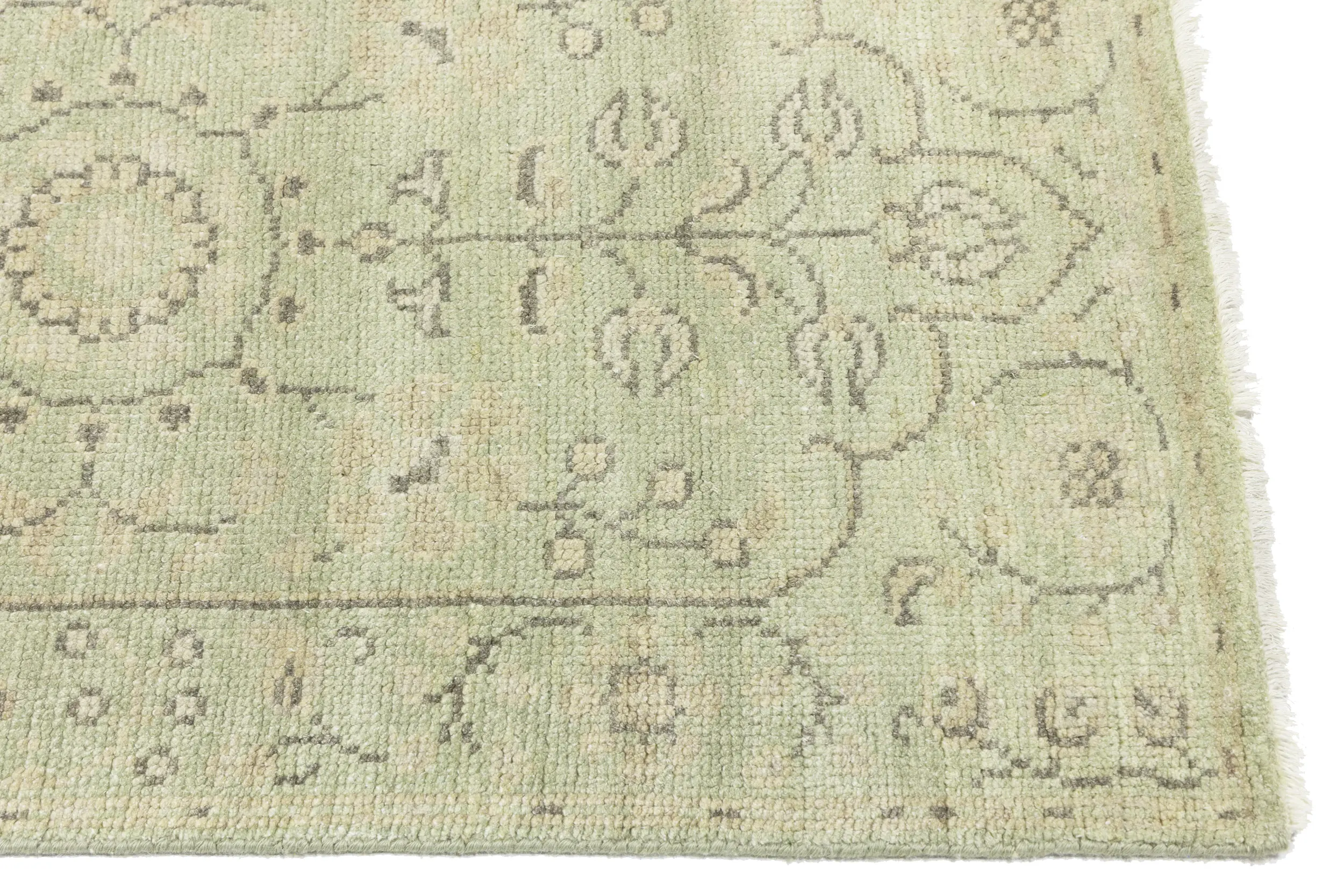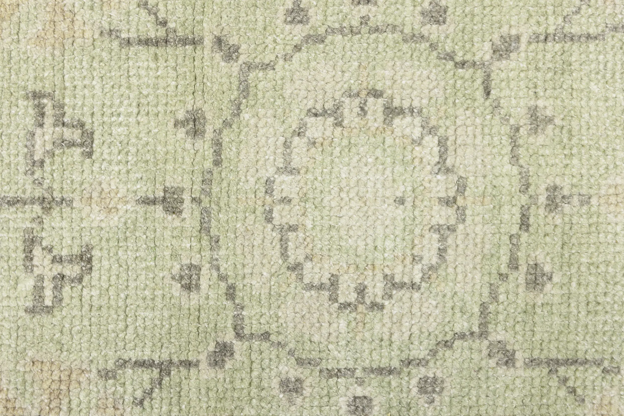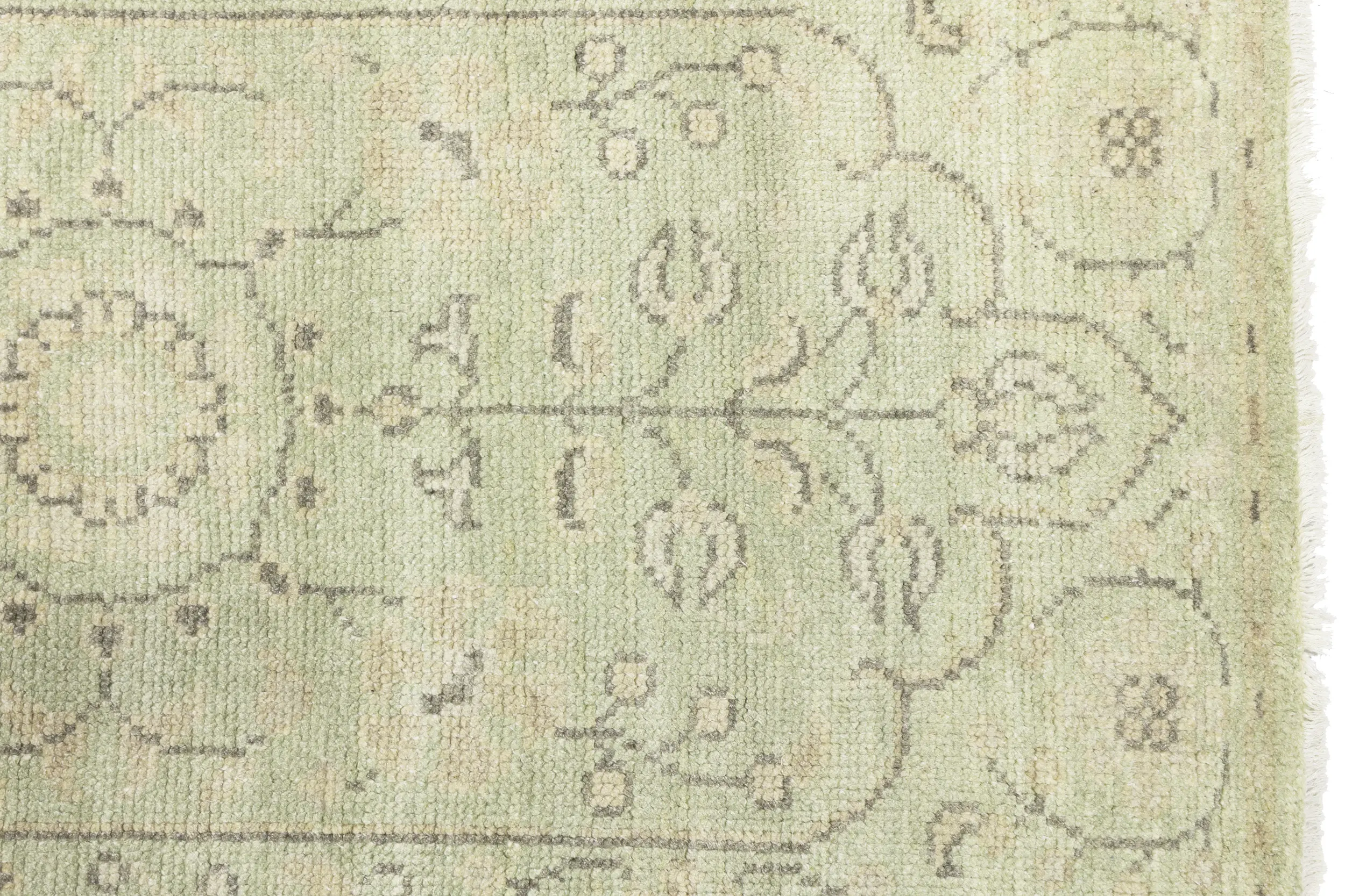 This genuine 2'8X13'9 green new Oriental runner was made by the hands of gifted weavers inspired by a variety of spectacular artistic designs, to recreate the aged look of the original piece with a richness of color and ornately patterned background field. What set this vintage style Oriental area runner from the others are the material and dye used (wool pile and cotton foundation), knot count, ancient designs, fantastic grades, and its regional historical connection: it has deep roots, from the story of the people who produced it to the meaning of the symbols and colors displayed across its canvas that have been praised for centuries. This Indian home décor carpet will be completely cozy and inviting that never will go out of style! Also, this Oriental runner would be among your most valuable treasures, it is a great investment that accrues value over time, and it will last for generations because was woven with high-quality, all-natural wool. Environmentally friendly, opulent yet affordable; this rug will give you a thorough amount of character to help define your living space with elegance and warmth that will capture the eyes and attention of your audience (homeowners, designers, decorators, family and friends).