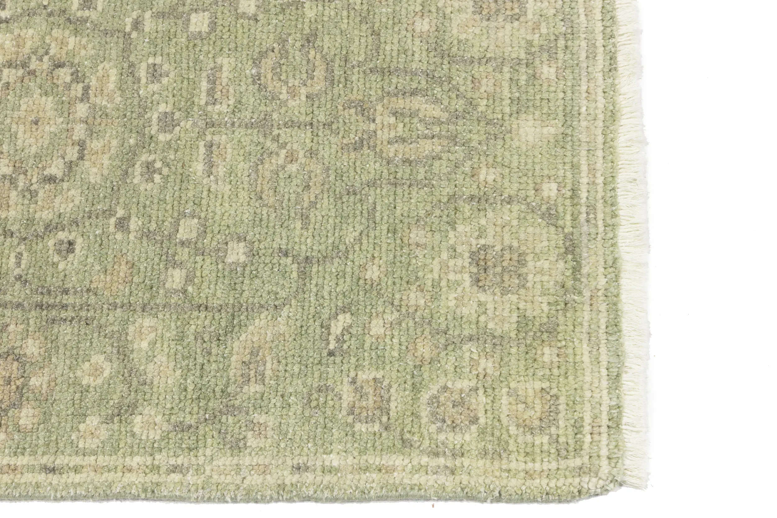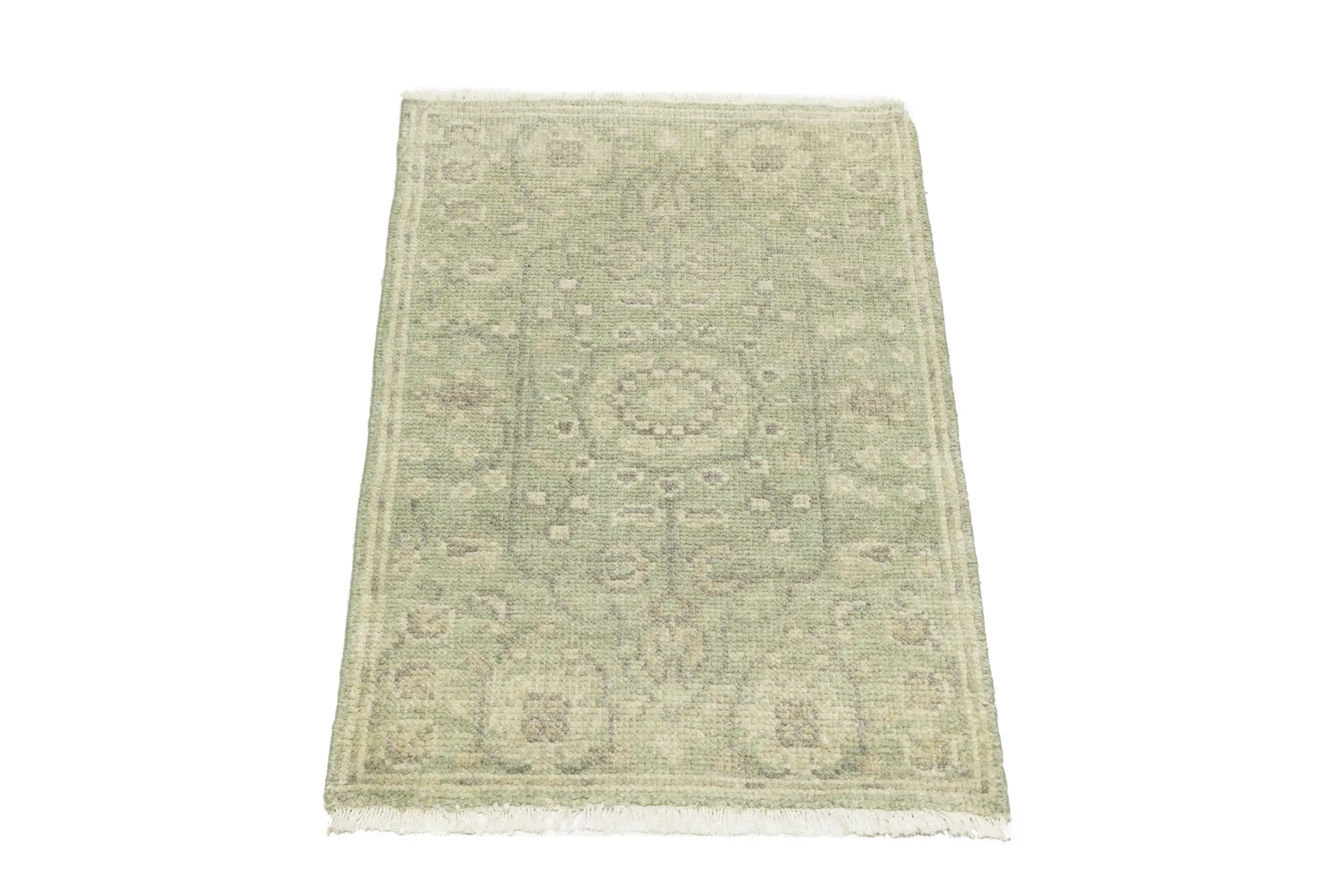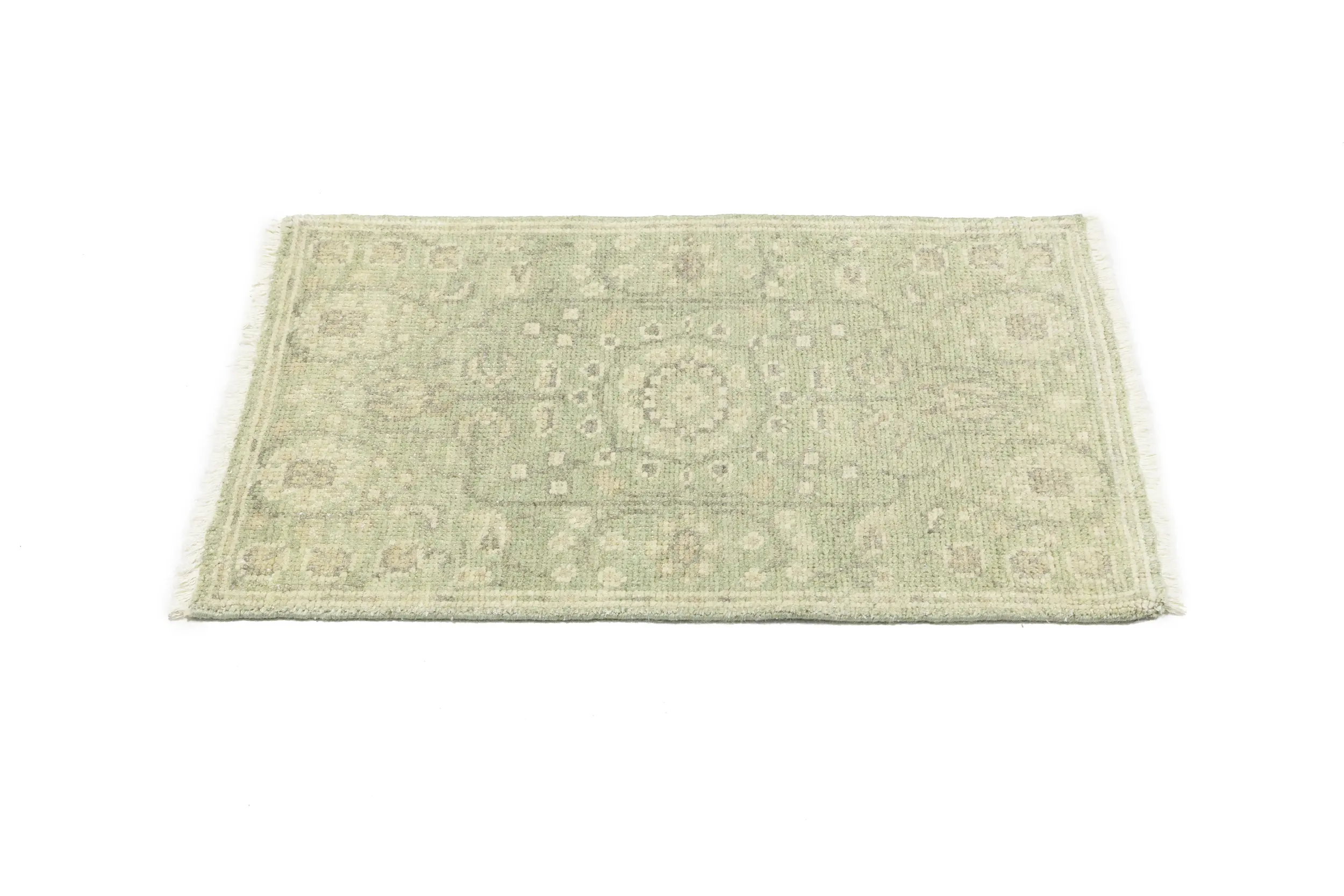 This genuine 2X3 green new Oriental rug was made by the hands of gifted weavers inspired by a variety of spectacular artistic designs, to recreate the aged look of the original piece with a richness of color and ornately patterned background field. What set this vintage style Oriental area rug from the others are the material and dye used (wool pile and cotton foundation), knot count, ancient designs, fantastic grades, and its regional historical connection: it has deep roots, from the story of the people who produced it to the meaning of the symbols and colors displayed across its canvas that have been praised for centuries. This Indian home décor carpet will be completely cozy and inviting that never will go out of style! Also, this Oriental rug would be among your most valuable treasures, it is a great investment that accrues value over time, and it will last for generations because was woven with high-quality, all-natural wool. Environmentally friendly, opulent yet affordable; this rug will give you a thorough amount of character to help define your living space with elegance and warmth that will capture the eyes and attention of your audience (homeowners, designers, decorators, family and friends).