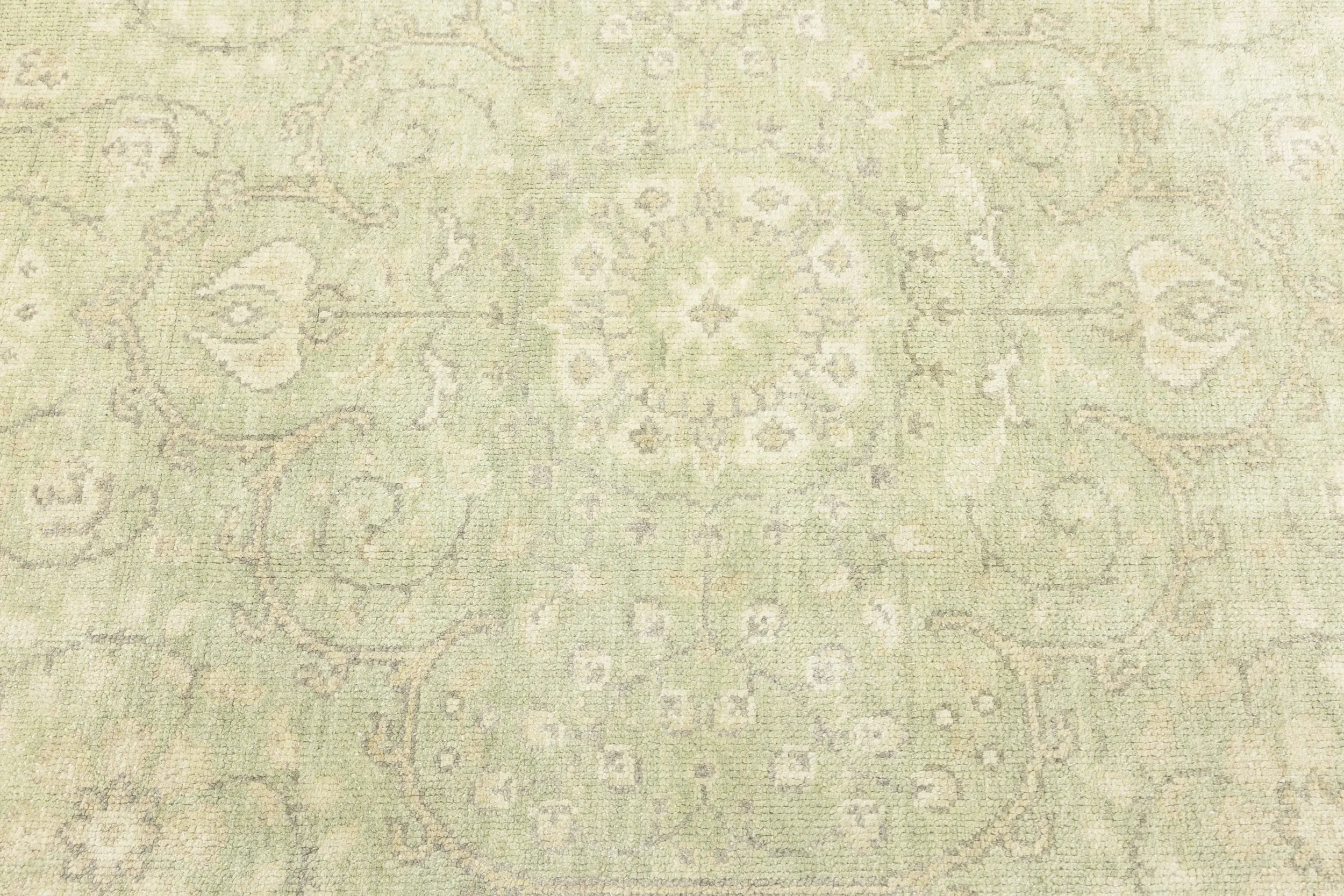 This genuine 6X6 green new Oriental rug was made by the hands of gifted weavers inspired by a variety of spectacular artistic designs, to recreate the aged look of the original piece with a richness of color and ornately patterned background field. What set this vintage style Oriental area rug from the others are the material and dye used (wool pile and cotton foundation), knot count, ancient designs, fantastic grades, and its regional historical connection: it has deep roots, from the story of the people who produced it to the meaning of the symbols and colors displayed across its canvas that have been praised for centuries. This Indian home décor carpet will be completely cozy and inviting that never will go out of style! Also, this Oriental rug would be among your most valuable treasures, it is a great investment that accrues value over time, and it will last for generations because was woven with high-quality, all-natural wool. Environmentally friendly, opulent yet affordable; this rug will give you a thorough amount of character to help define your living space with elegance and warmth that will capture the eyes and attention of your audience (homeowners, designers, decorators, family and friends).
