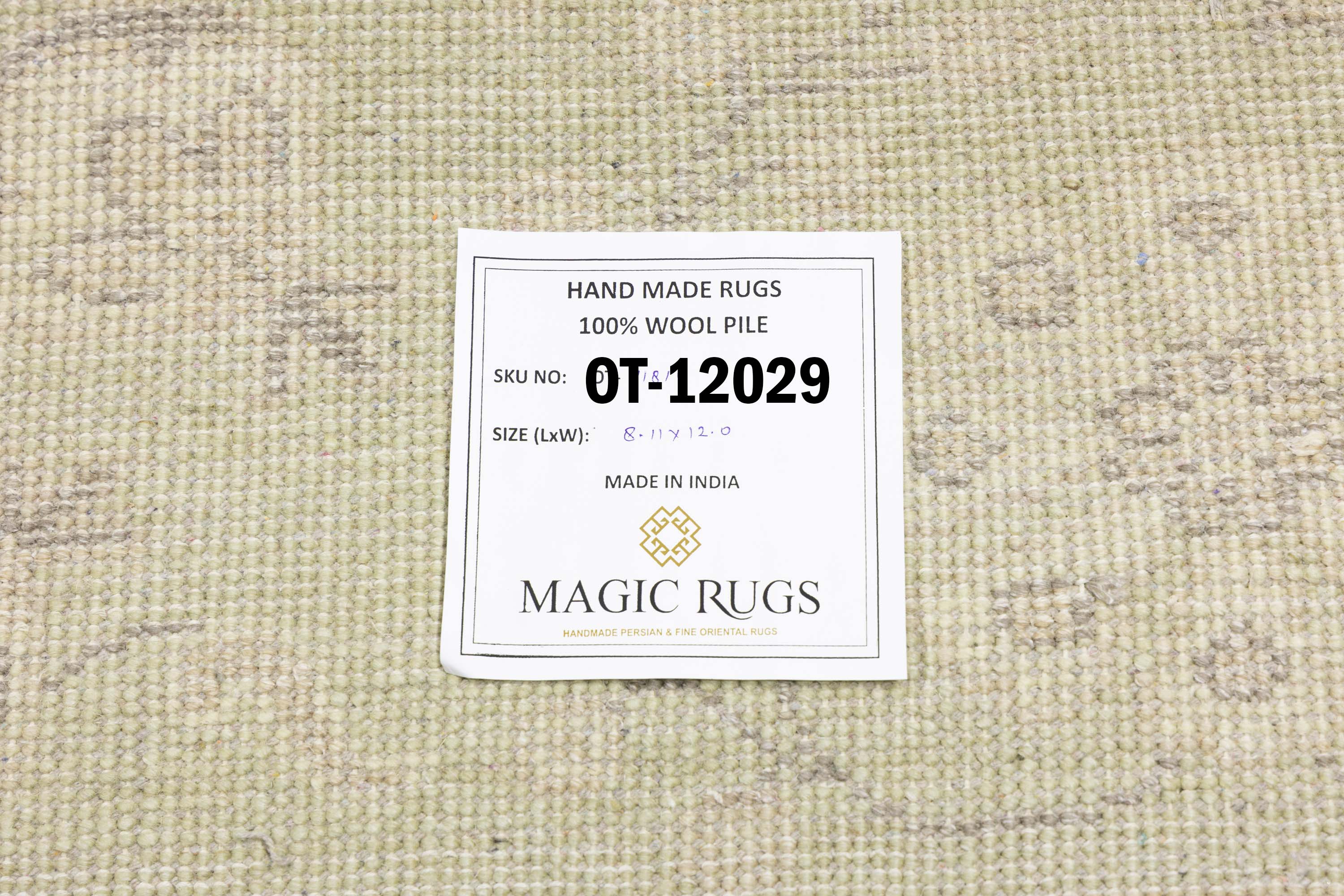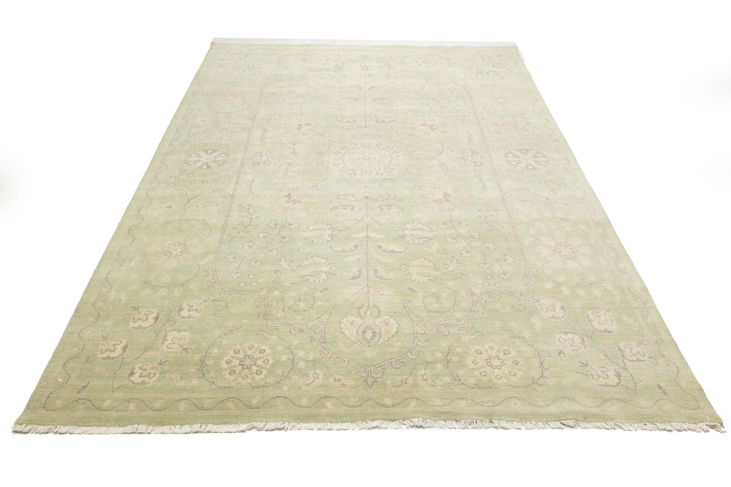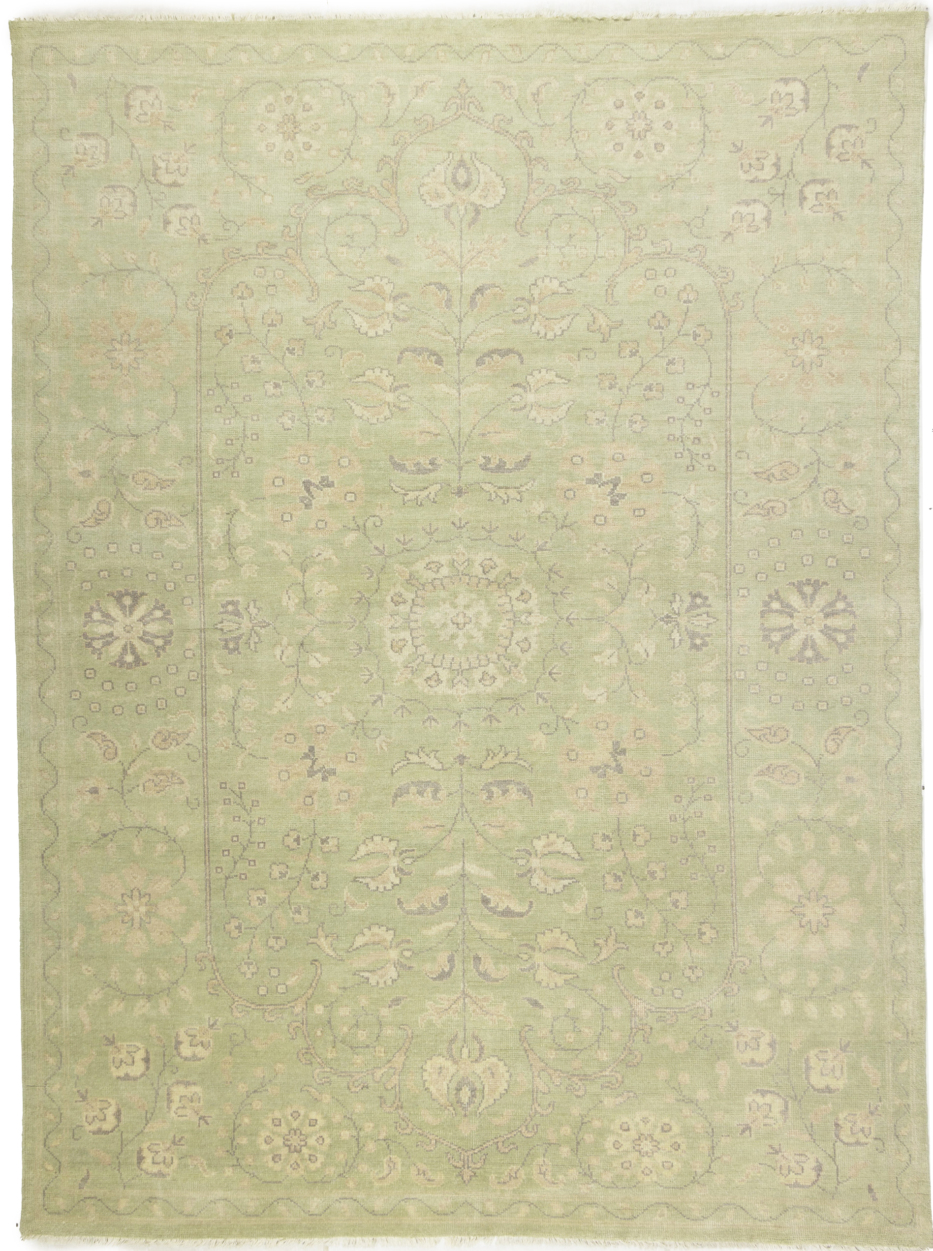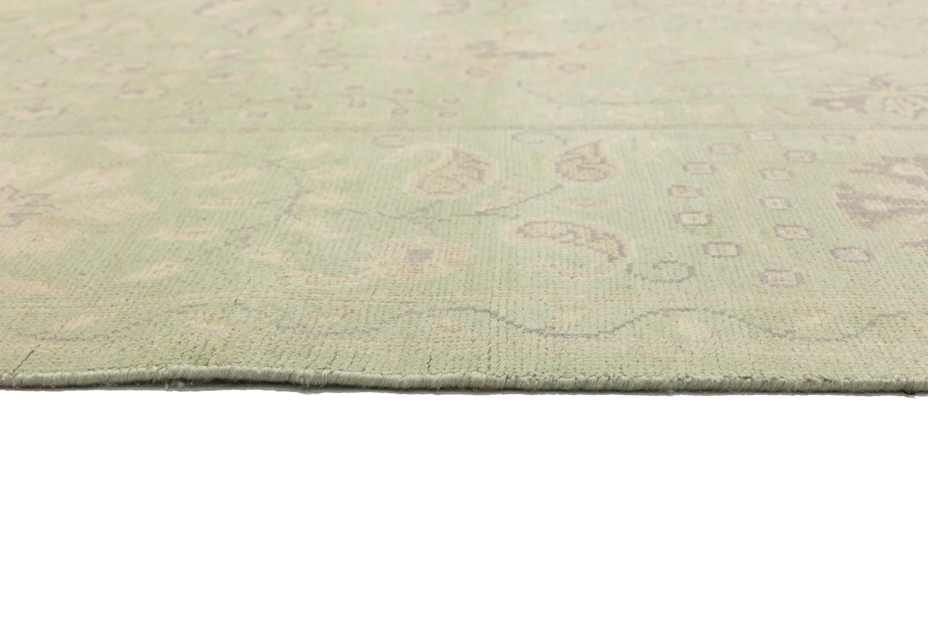 This genuine 9x12 light green new Oriental rug was made by the hands of gifted weavers inspired by a variety of spectacular artistic designs, to recreate the aged look of the original piece with a richness of color and ornately patterned background field. What set this vintage style Oriental area rug from the others are the material and dye used (wool pile and cotton foundation), knot count, ancient designs, fantastic grades, and its regional historical connection: it has deep roots, from the story of the people who produced it to the meaning of the symbols and colors displayed across its canvas that have been praised for centuries. This Indian home décor carpet will be completely cozy and inviting that never will go out of style! Also, this Oriental rug would be among your most valuable treasures, it is a great investment that accrues value over time, and it will last for generations because was woven with high-quality, all-natural wool. Environmentally friendly, opulent yet affordable; this rug will give you a thorough amount of character to help define your living space with elegance and warmth that will capture the eyes and attention of your audience (homeowners, designers, decorators, family and friends). OT-12029