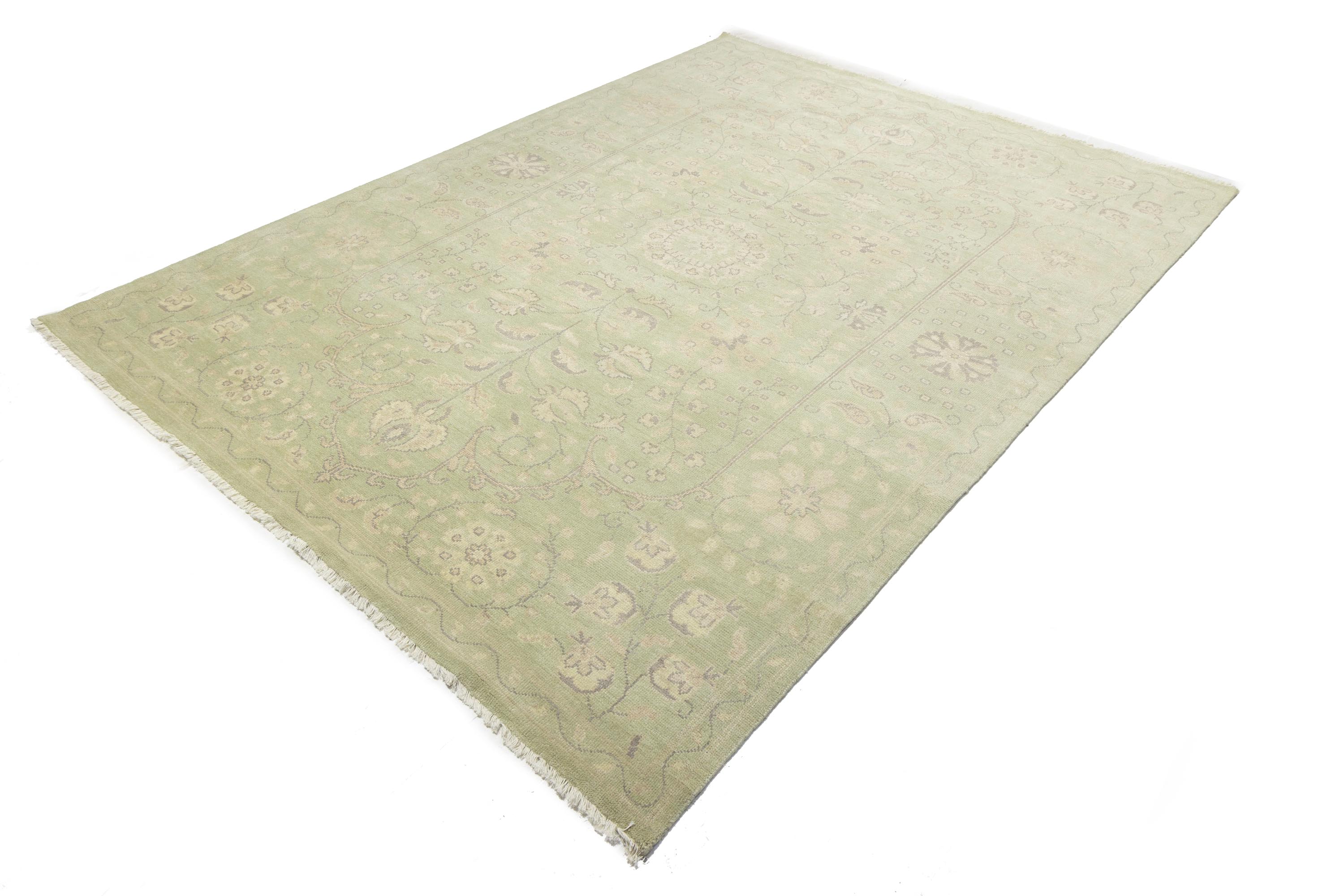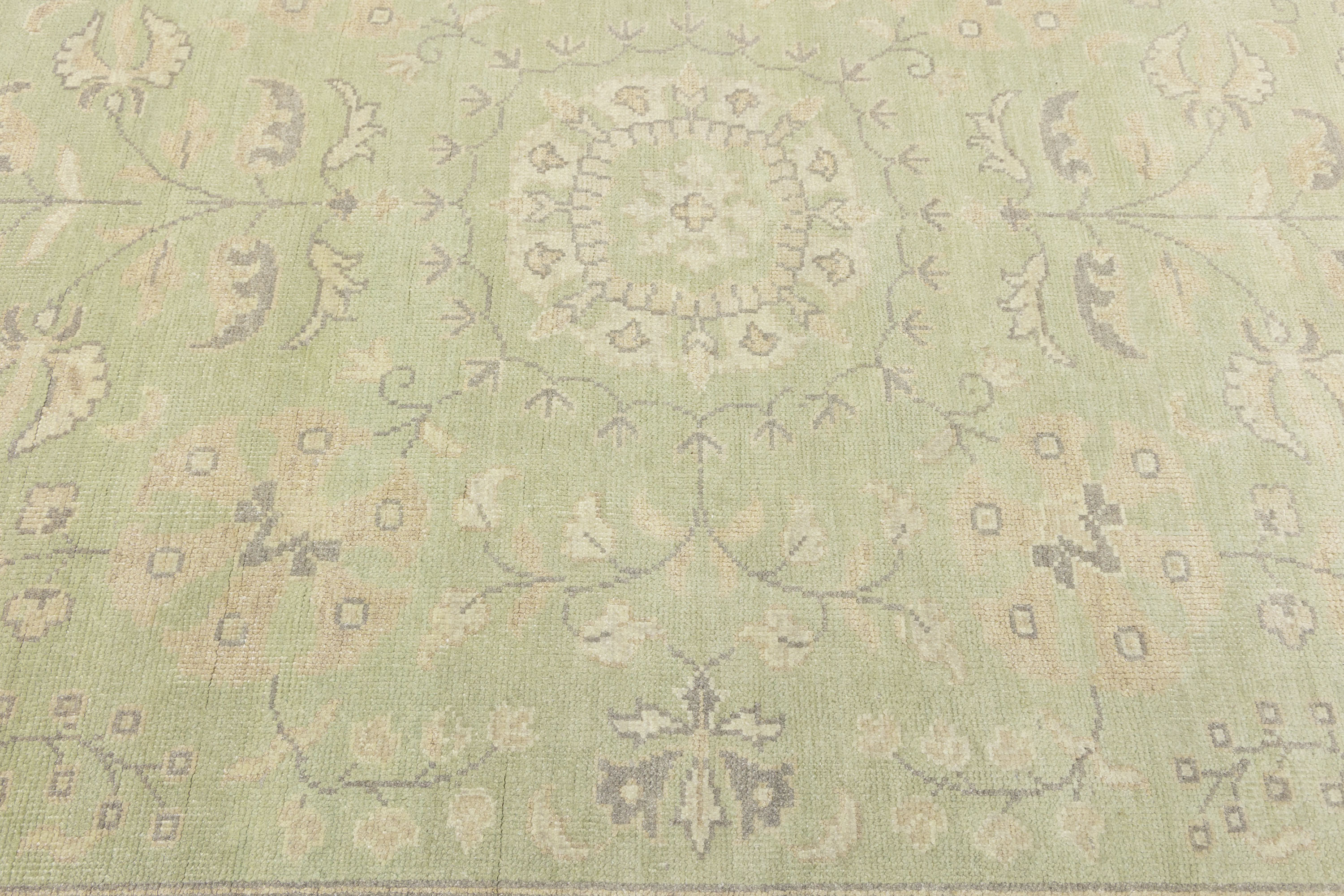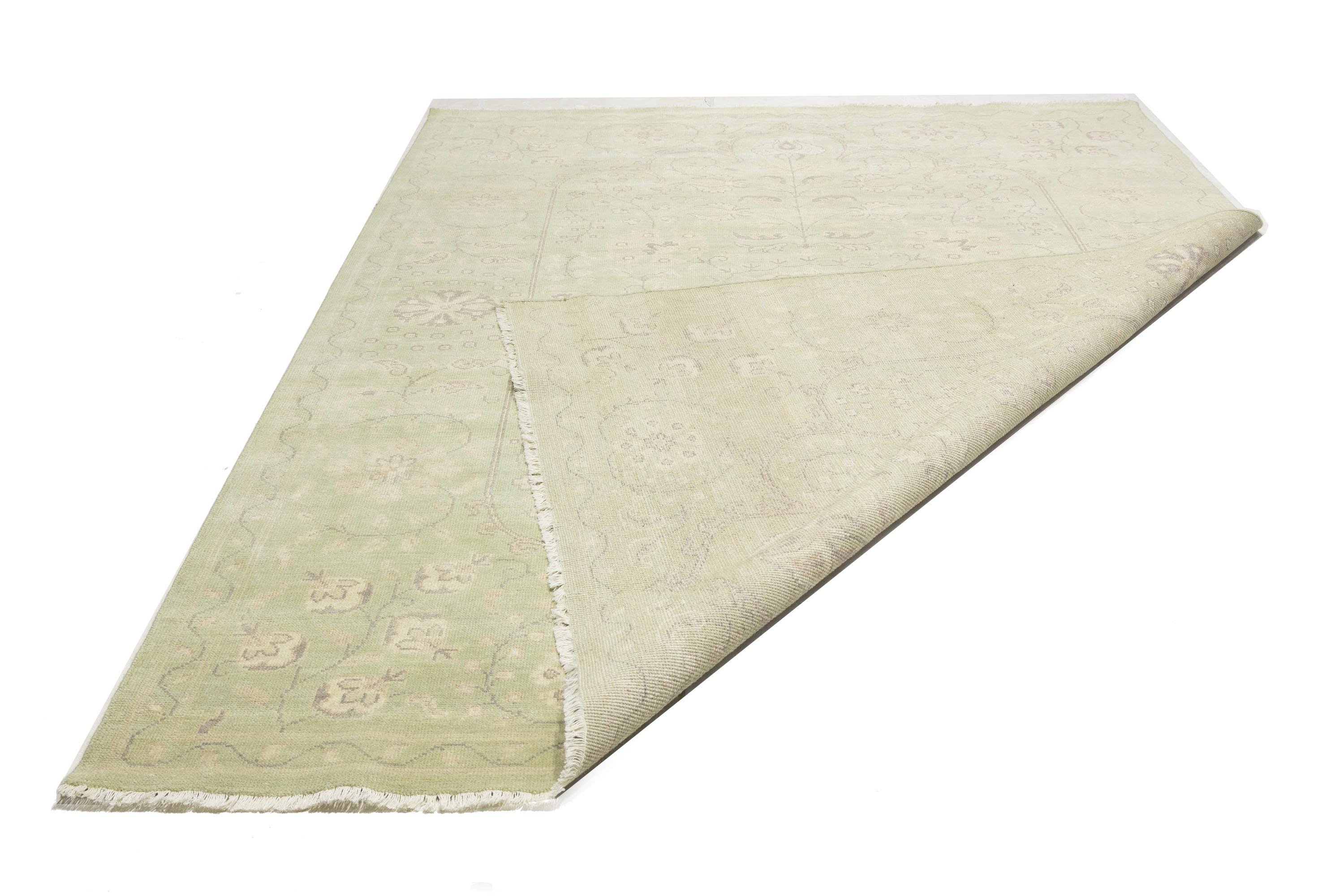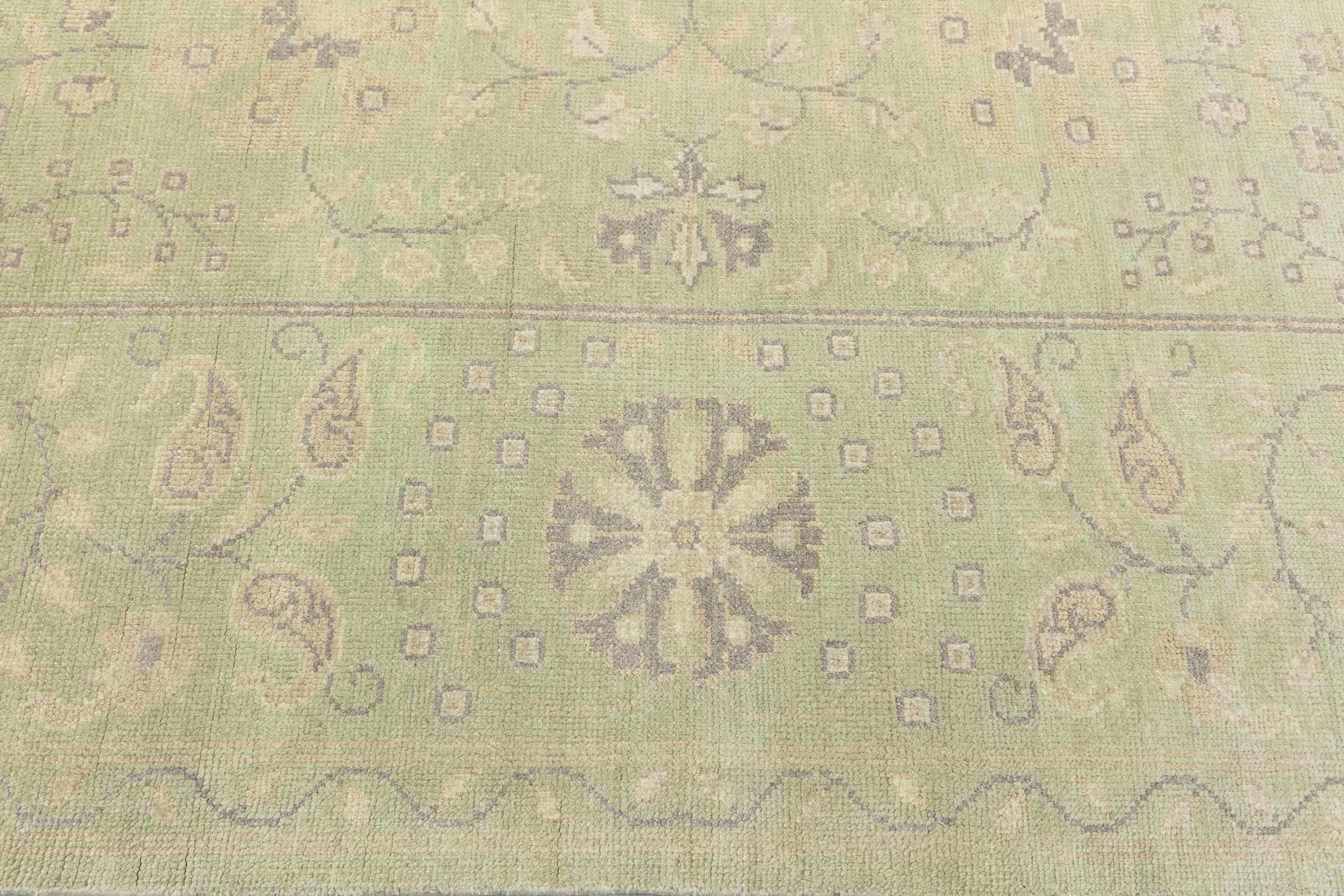 This genuine 9x12 light green new Oriental rug was made by the hands of gifted weavers inspired by a variety of spectacular artistic designs, to recreate the aged look of the original piece with a richness of color and ornately patterned background field. What set this vintage style Oriental area rug from the others are the material and dye used (wool pile and cotton foundation), knot count, ancient designs, fantastic grades, and its regional historical connection: it has deep roots, from the story of the people who produced it to the meaning of the symbols and colors displayed across its canvas that have been praised for centuries. This Indian home décor carpet will be completely cozy and inviting that never will go out of style! Also, this Oriental rug would be among your most valuable treasures, it is a great investment that accrues value over time, and it will last for generations because was woven with high-quality, all-natural wool. Environmentally friendly, opulent yet affordable; this rug will give you a thorough amount of character to help define your living space with elegance and warmth that will capture the eyes and attention of your audience (homeowners, designers, decorators, family and friends). OT-12029