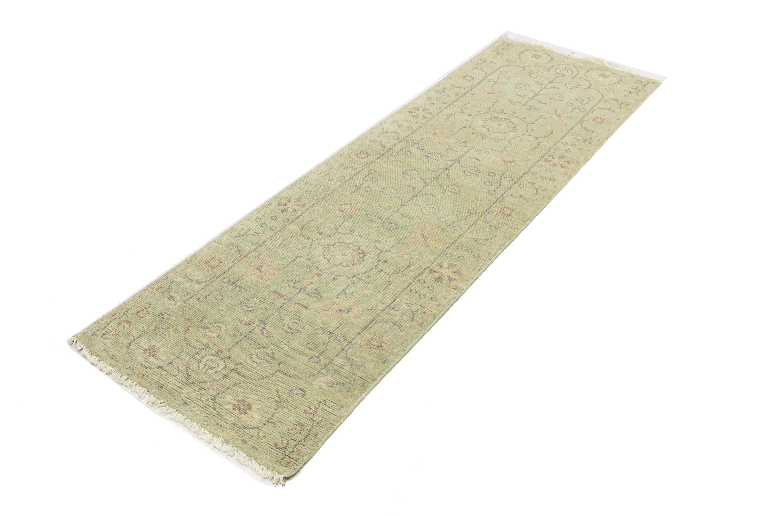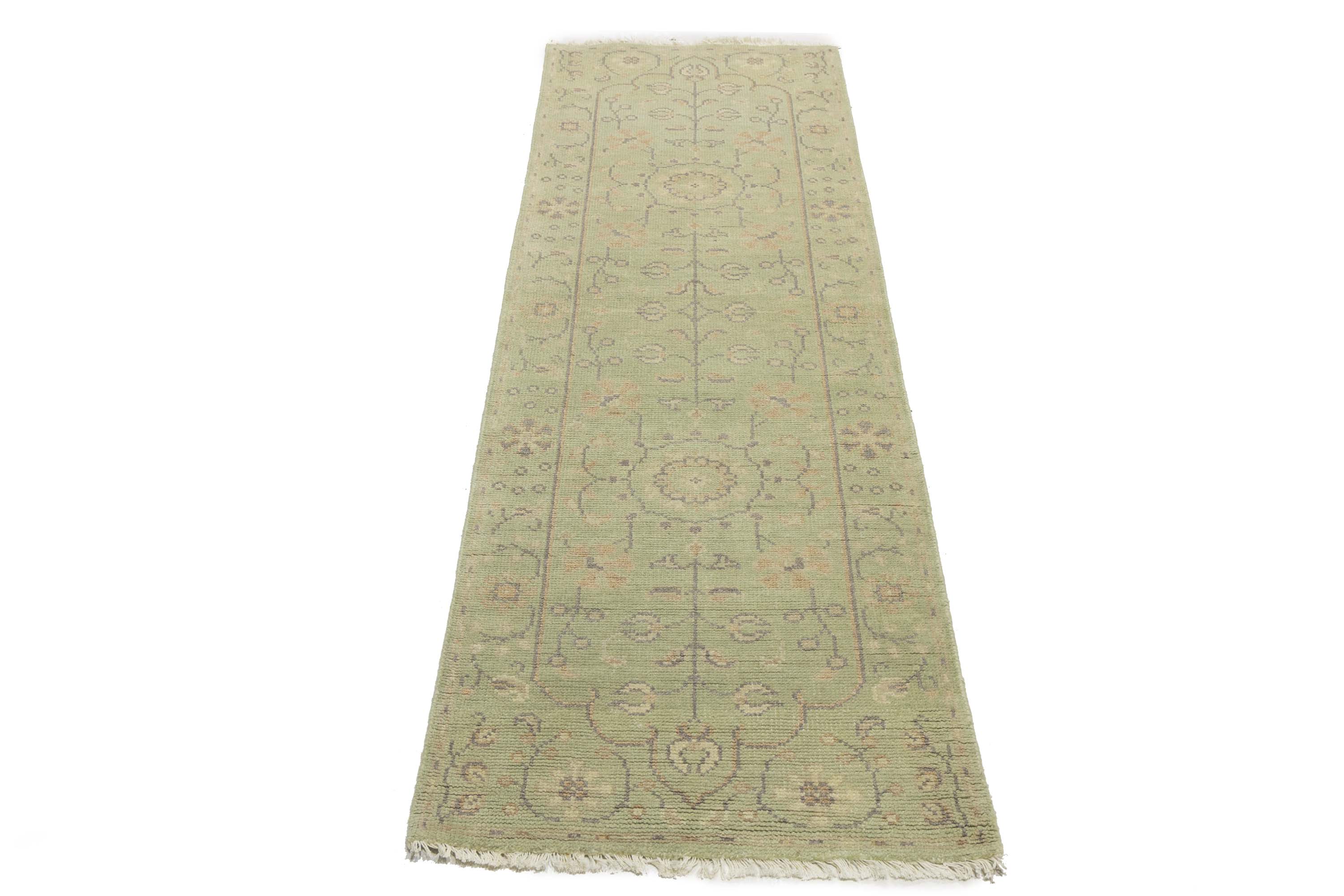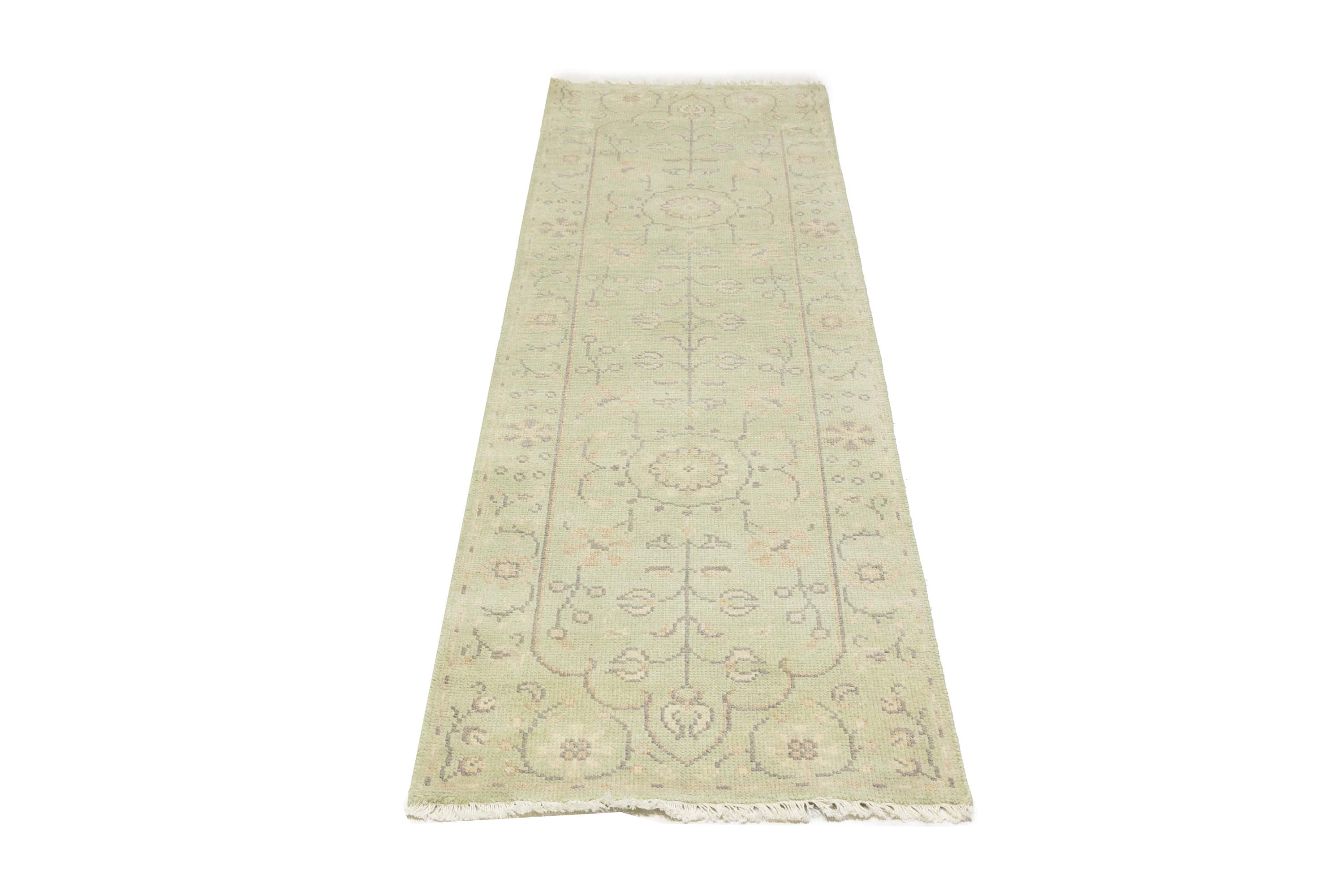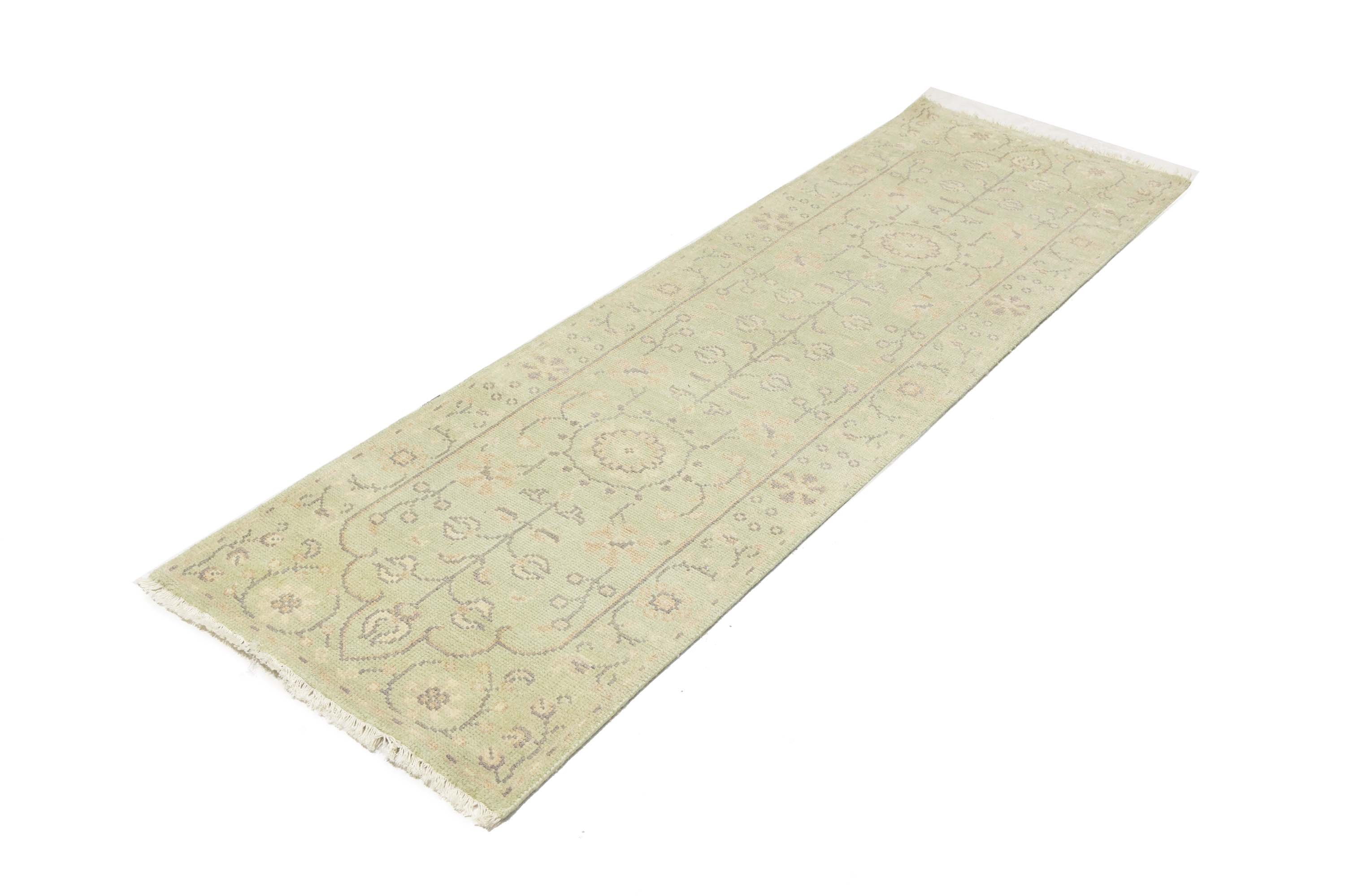 This original 2'6X7'10 light green new Oriental runner was made by the hands of talented weavers influenced by a variety of gorgeous symmetrical artistic designs, to recreate the aged look of the unique piece with a richness of color and very balanced background field. What set this vintage style Oriental area runner from the others are the material and dye used (wool pile and cotton foundation), knot count, antique designs, fantastic grades, and its regional historical connection: it has deep roots, from the story of the people who produced it to the meaning of the symbols and colors displayed across its canvas that have been praised for centuries. This Indian home décor carpet will be completely cozy and inviting that never will go out of style! Also, this Oriental rug would be among your most valuable treasures, it is a great investment that accrues value over time, and it will last a lifetime because was woven with high-quality, all-natural wool. Eco-friendly, opulent yet affordable; this runner will give you an extra pop of character to help define your home environment with sophistication and warmth that will capture the eyes and attention of your audience (homeowners, designers, decorators, family and friends).