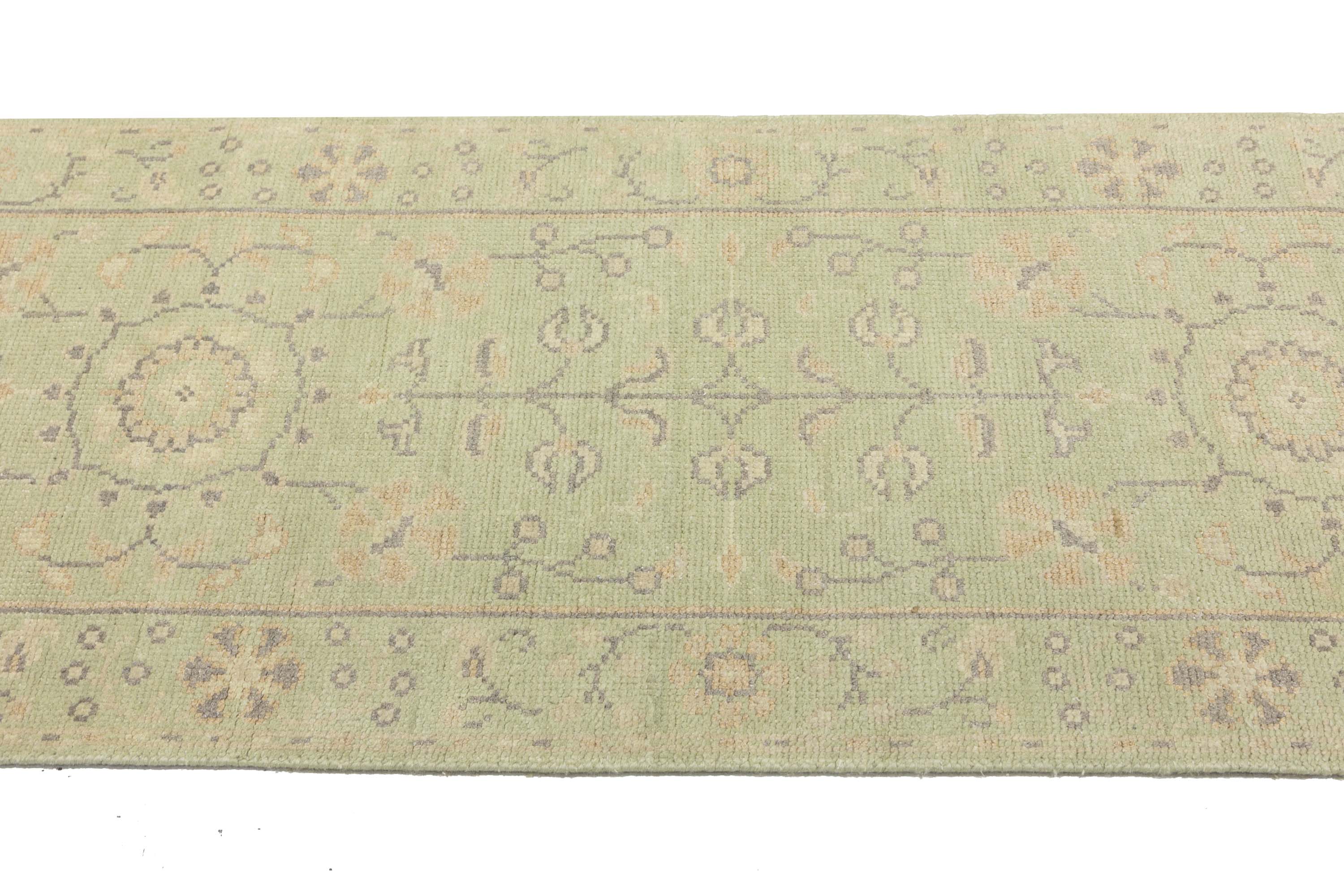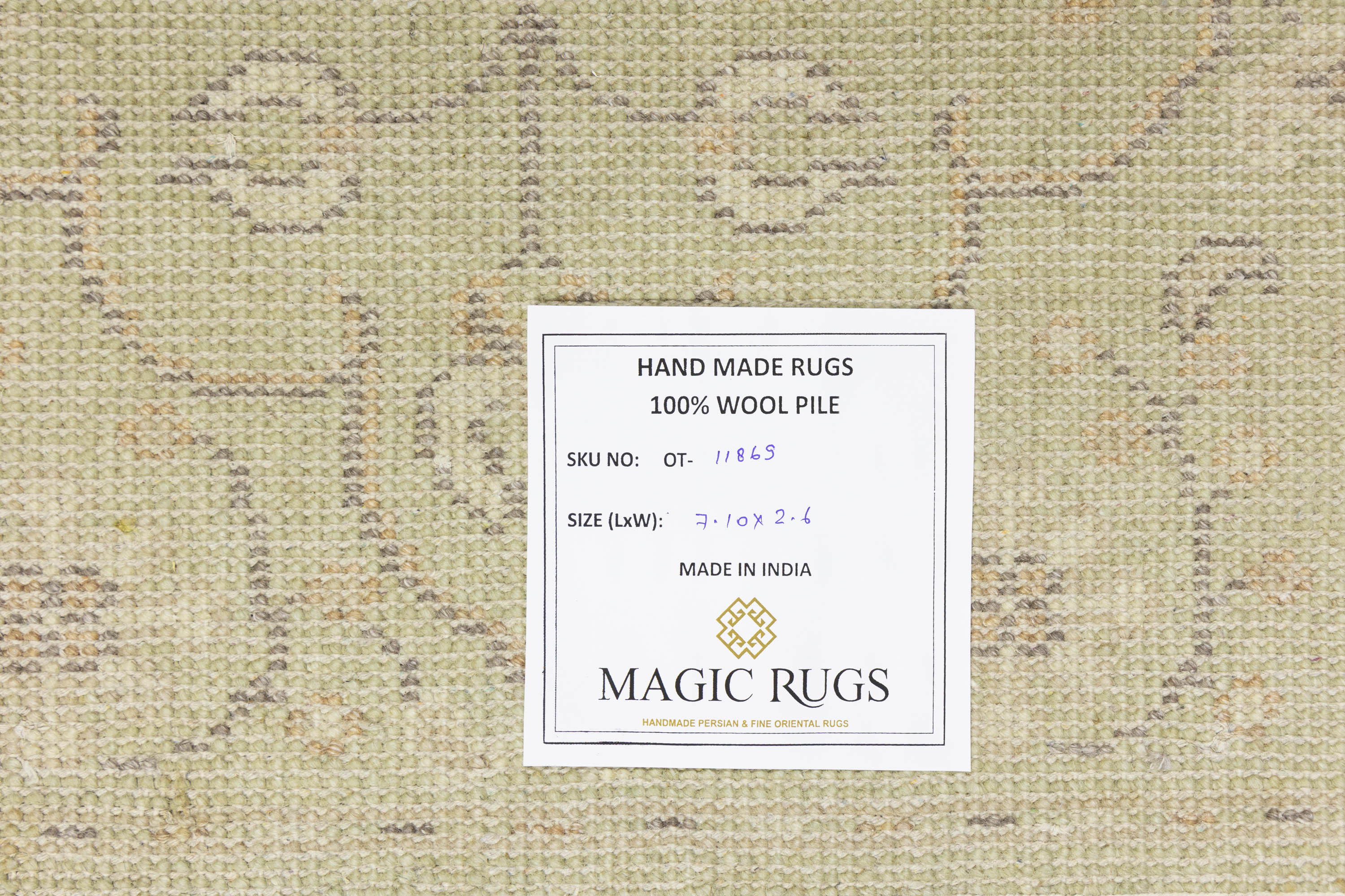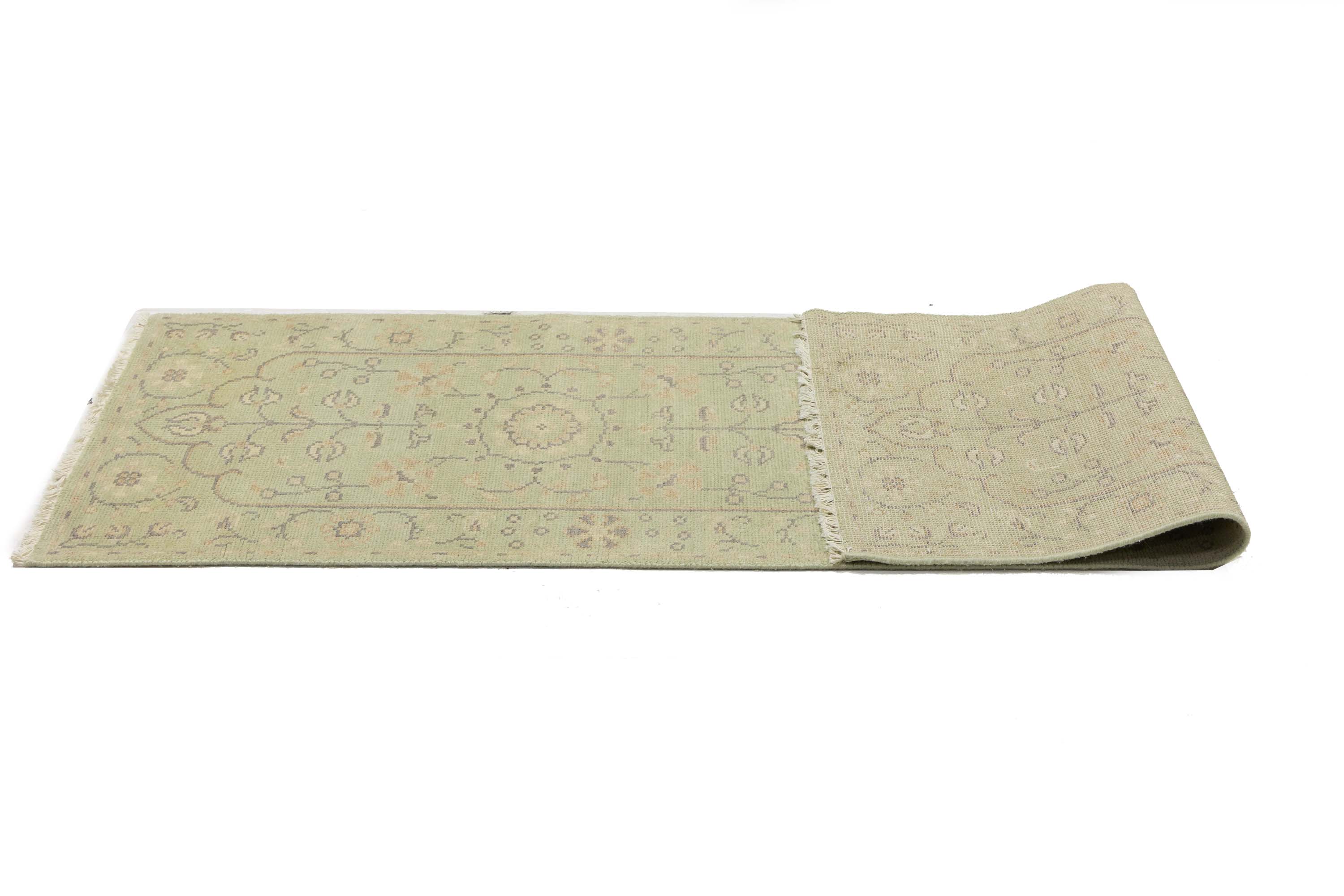 This original 2'6X7'10 light green new Oriental runner was made by the hands of talented weavers influenced by a variety of gorgeous symmetrical artistic designs, to recreate the aged look of the unique piece with a richness of color and very balanced background field. What set this vintage style Oriental area runner from the others are the material and dye used (wool pile and cotton foundation), knot count, antique designs, fantastic grades, and its regional historical connection: it has deep roots, from the story of the people who produced it to the meaning of the symbols and colors displayed across its canvas that have been praised for centuries. This Indian home décor carpet will be completely cozy and inviting that never will go out of style! Also, this Oriental rug would be among your most valuable treasures, it is a great investment that accrues value over time, and it will last a lifetime because was woven with high-quality, all-natural wool. Eco-friendly, opulent yet affordable; this runner will give you an extra pop of character to help define your home environment with sophistication and warmth that will capture the eyes and attention of your audience (homeowners, designers, decorators, family and friends).