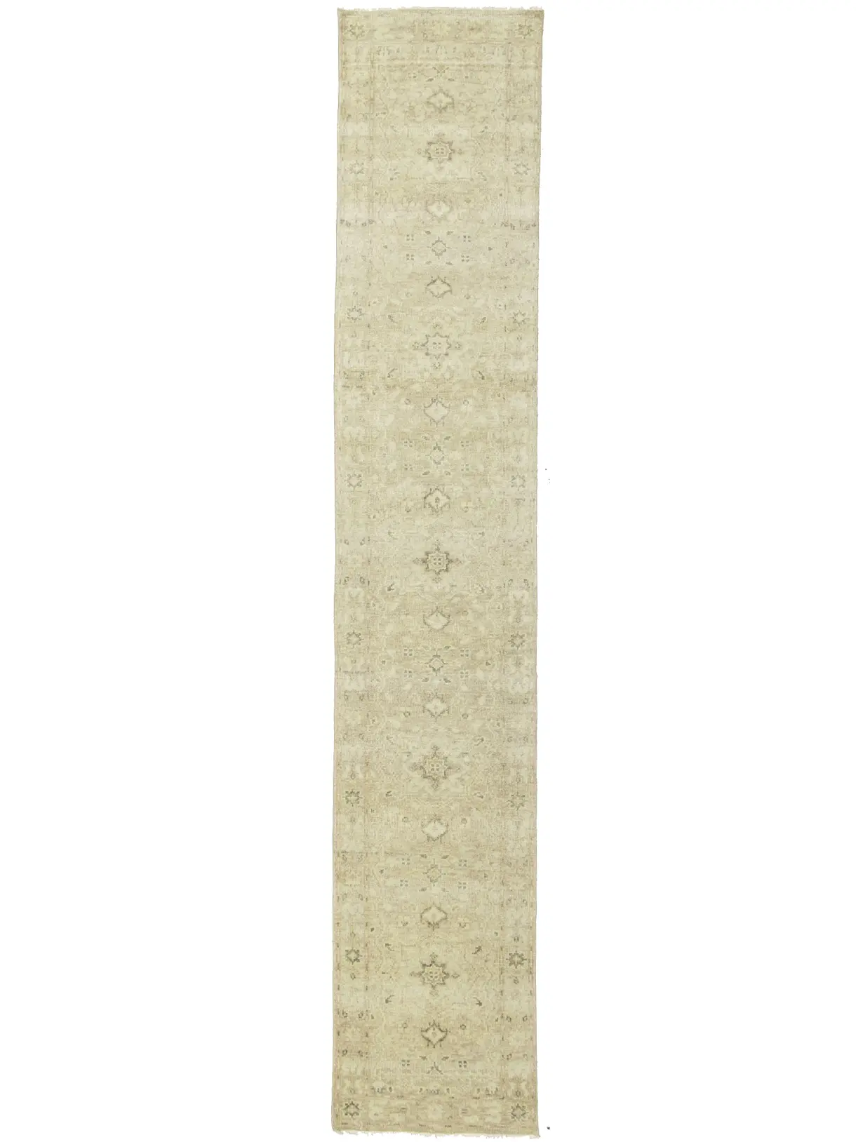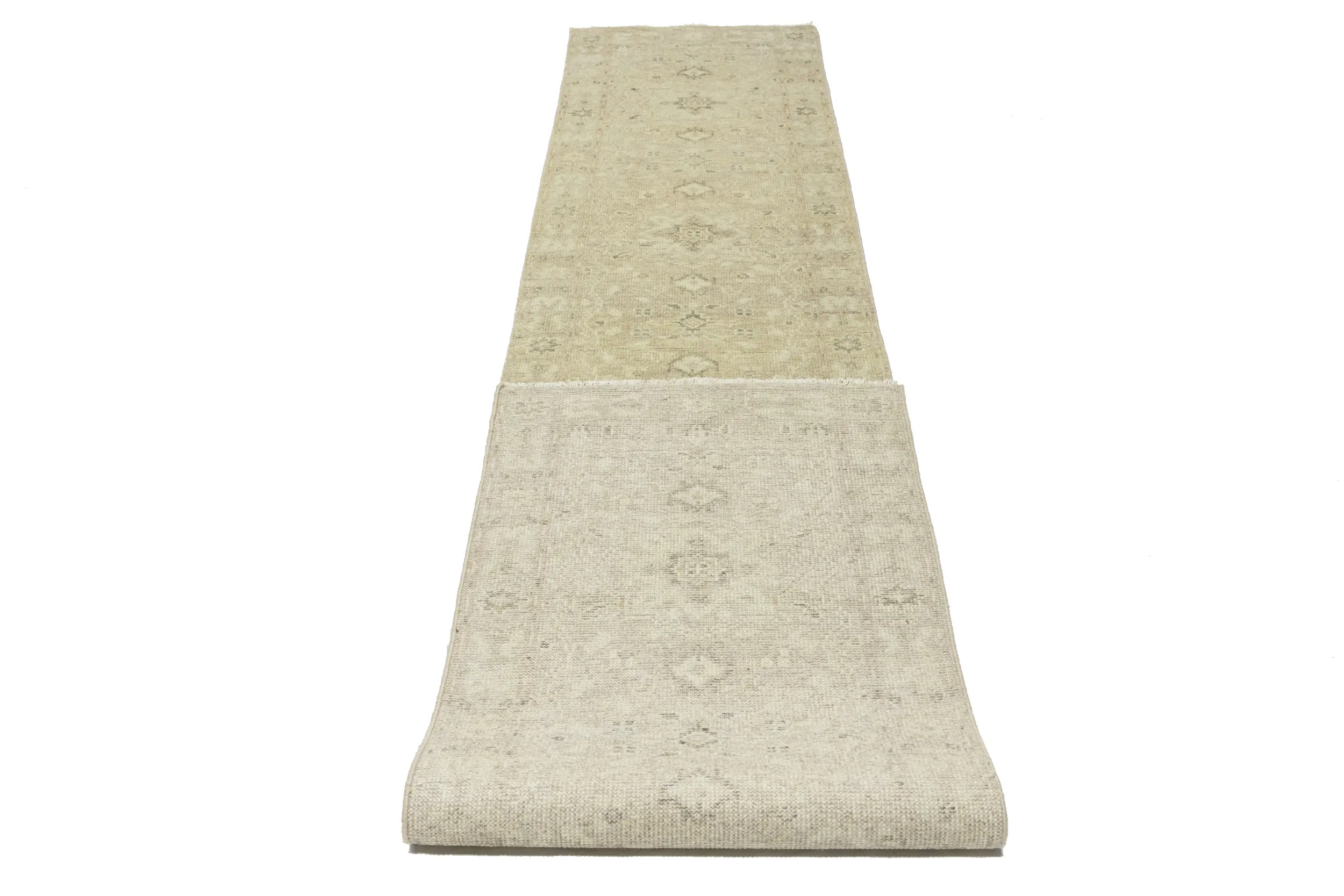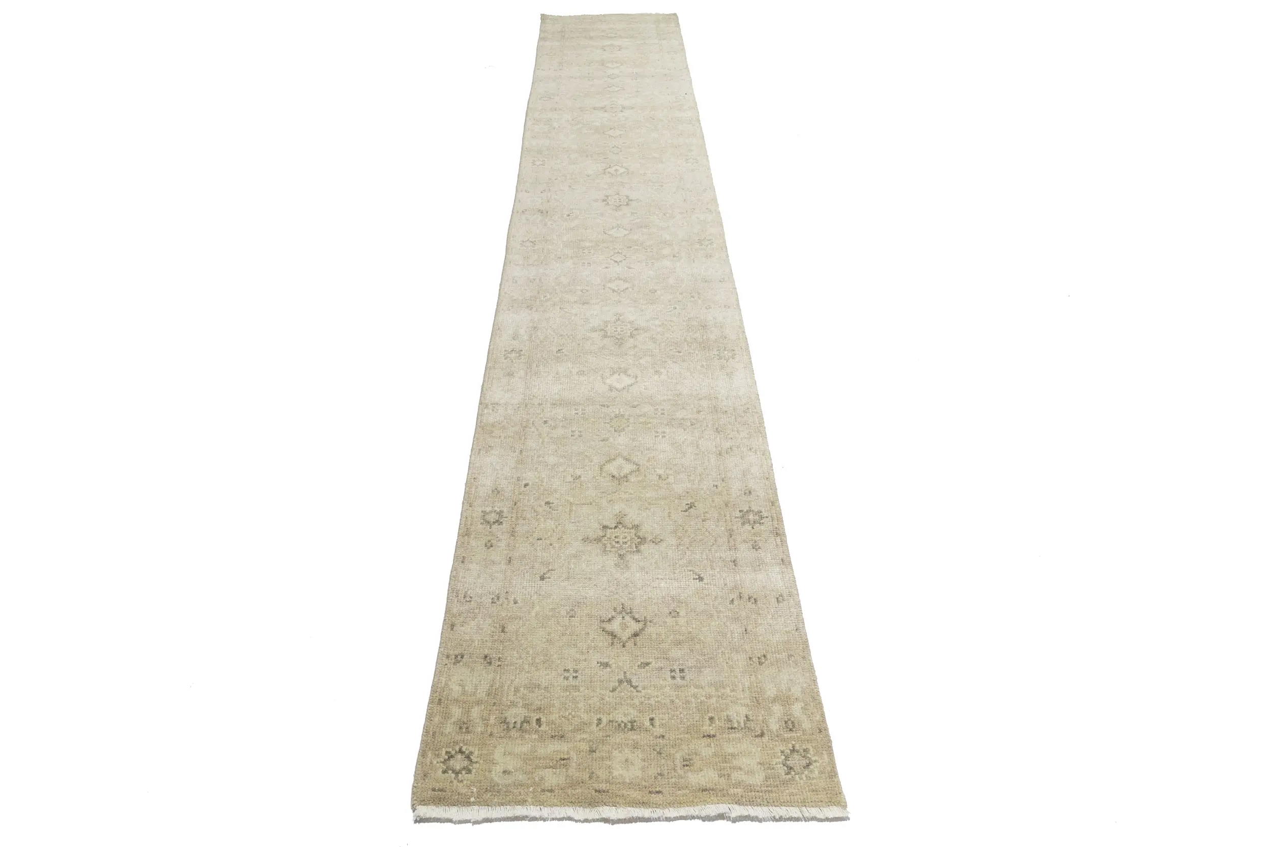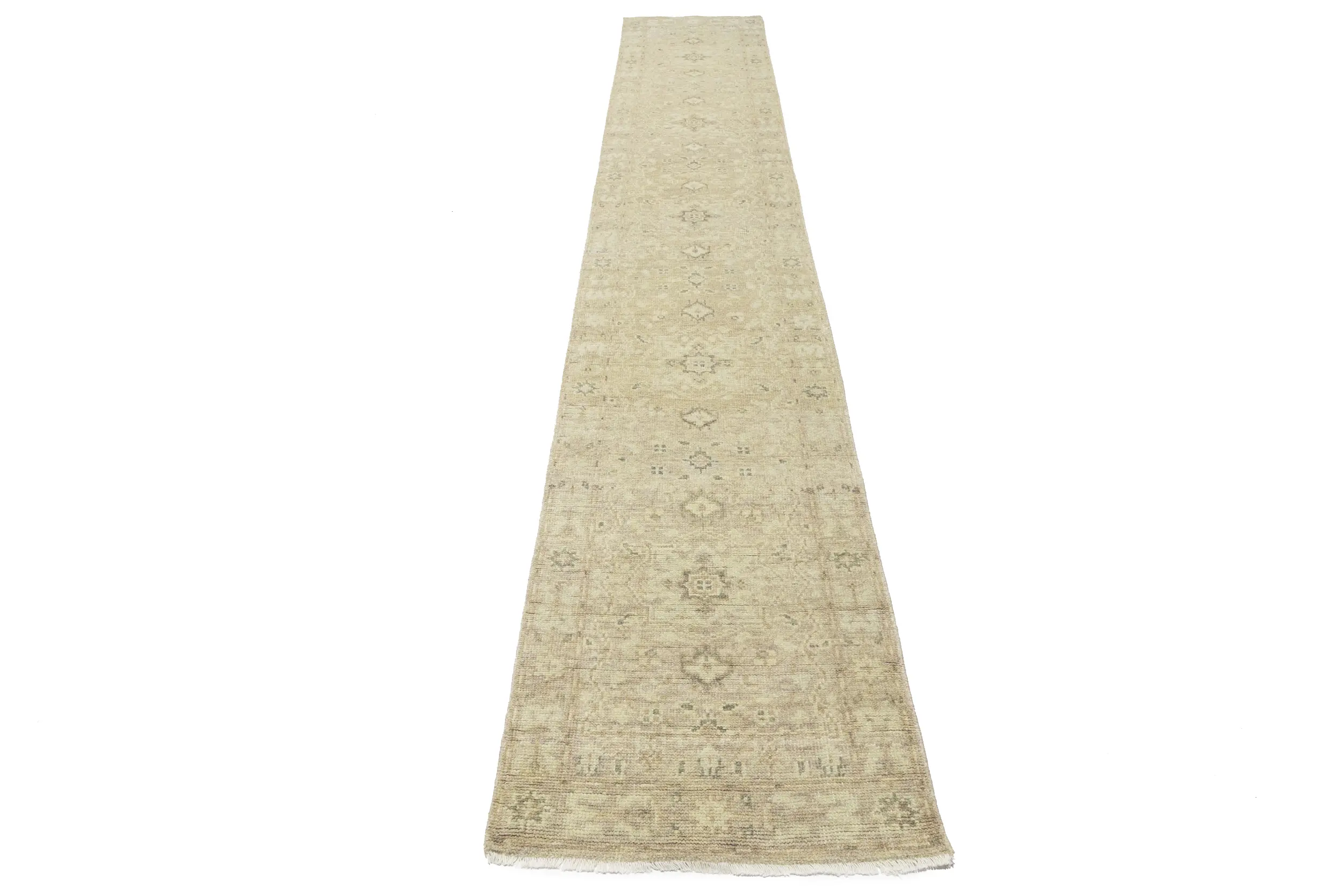 This genuine 3X14 beige new Oriental runner was made by the hands of gifted weavers inspired by a variety of spectacular artistic designs, to recreate the aged look of the original piece with a richness of color and ornately patterned background field. What set this vintage style Oriental area runner from the others are the material and dye used (wool pile and cotton foundation), knot count, ancient designs, fantastic grades, and its regional historical connection: it has deep roots, from the story of the people who produced it to the meaning of the symbols and colors displayed across its canvas that have been praised for centuries. This Indian home décor carpet will be completely cozy and inviting that never will go out of style! Also, this Oriental rug would be among your most valuable treasures, it is a great investment that accrues value over time, and it will last for generations because was woven with high-quality, all-natural wool. Environmentally friendly, opulent yet affordable; this runner will give you a thorough amount of character to help define your living space with elegance and warmth that will capture the eyes and attention of your audience (homeowners, designers, decorators, family and friends).