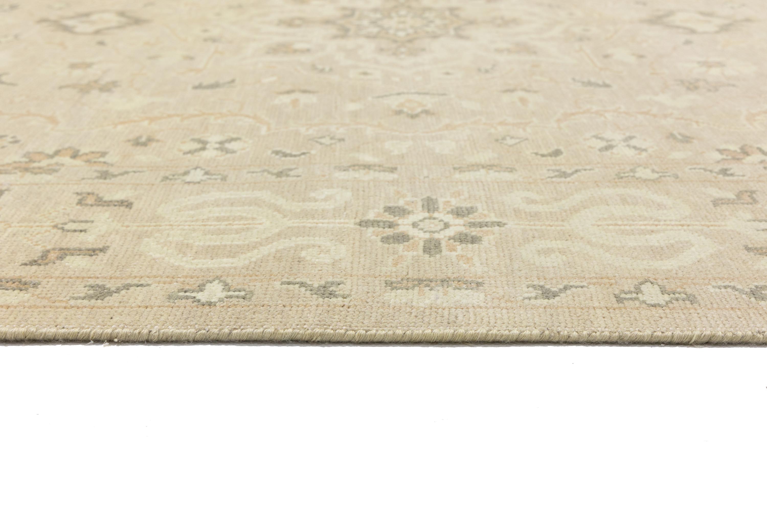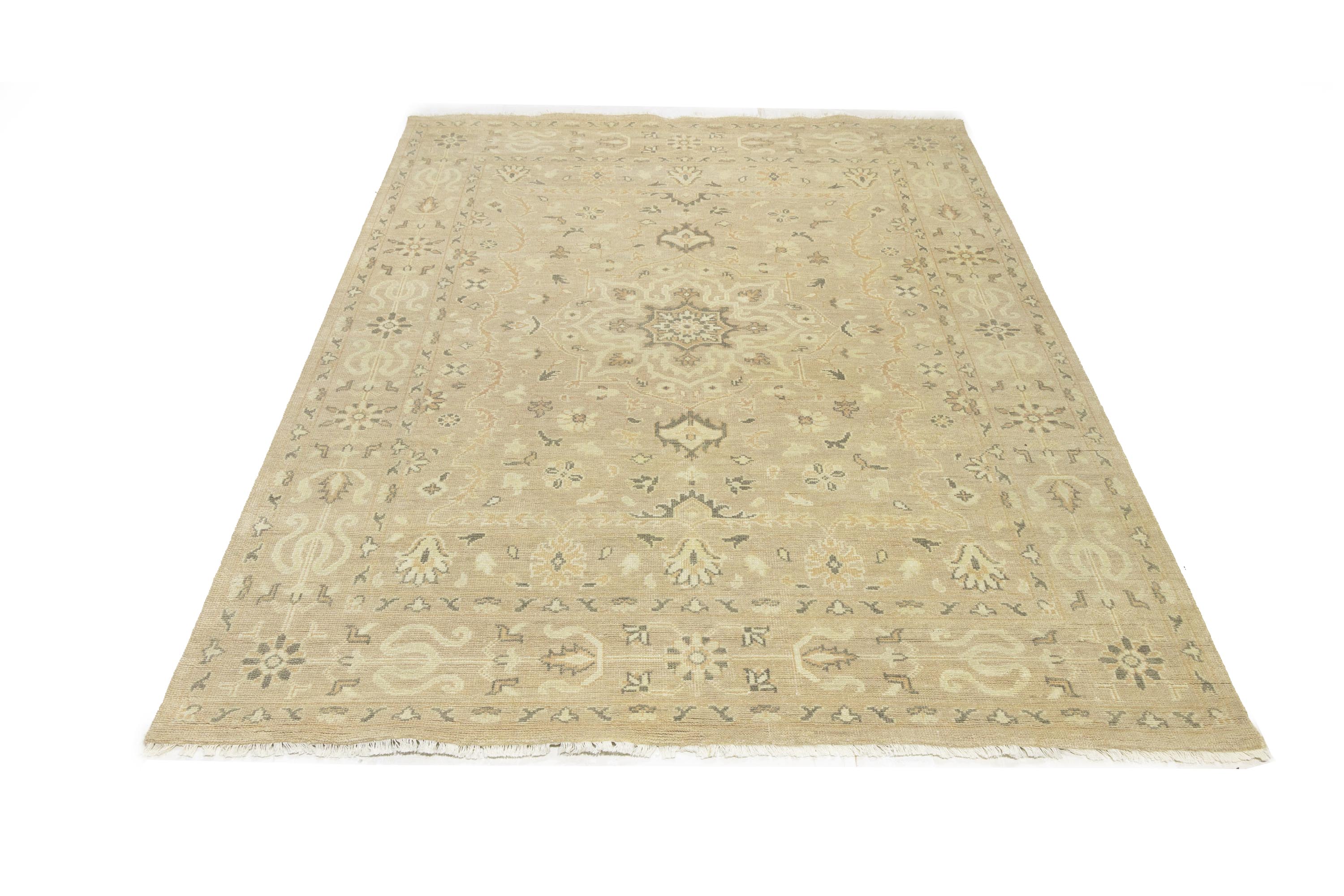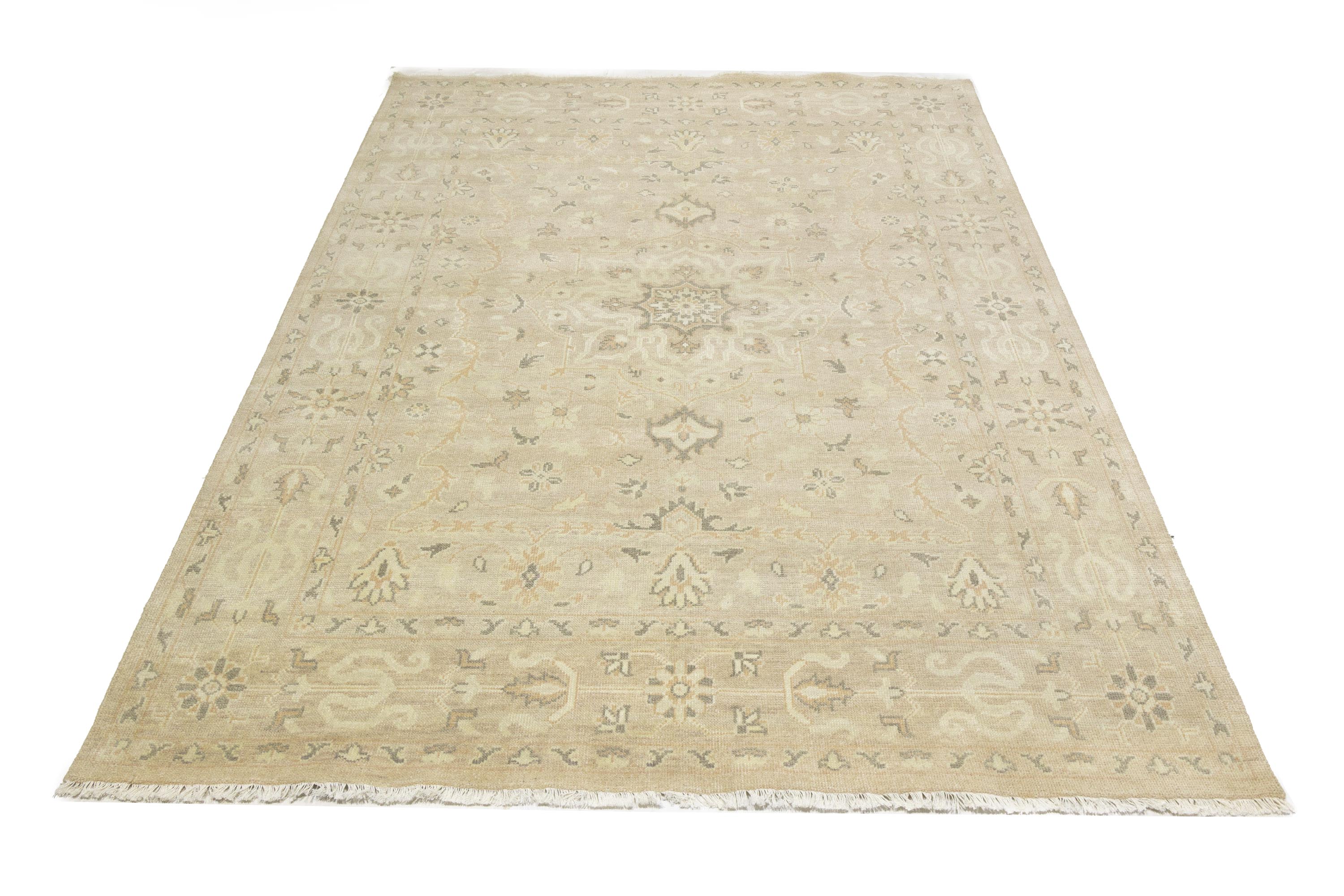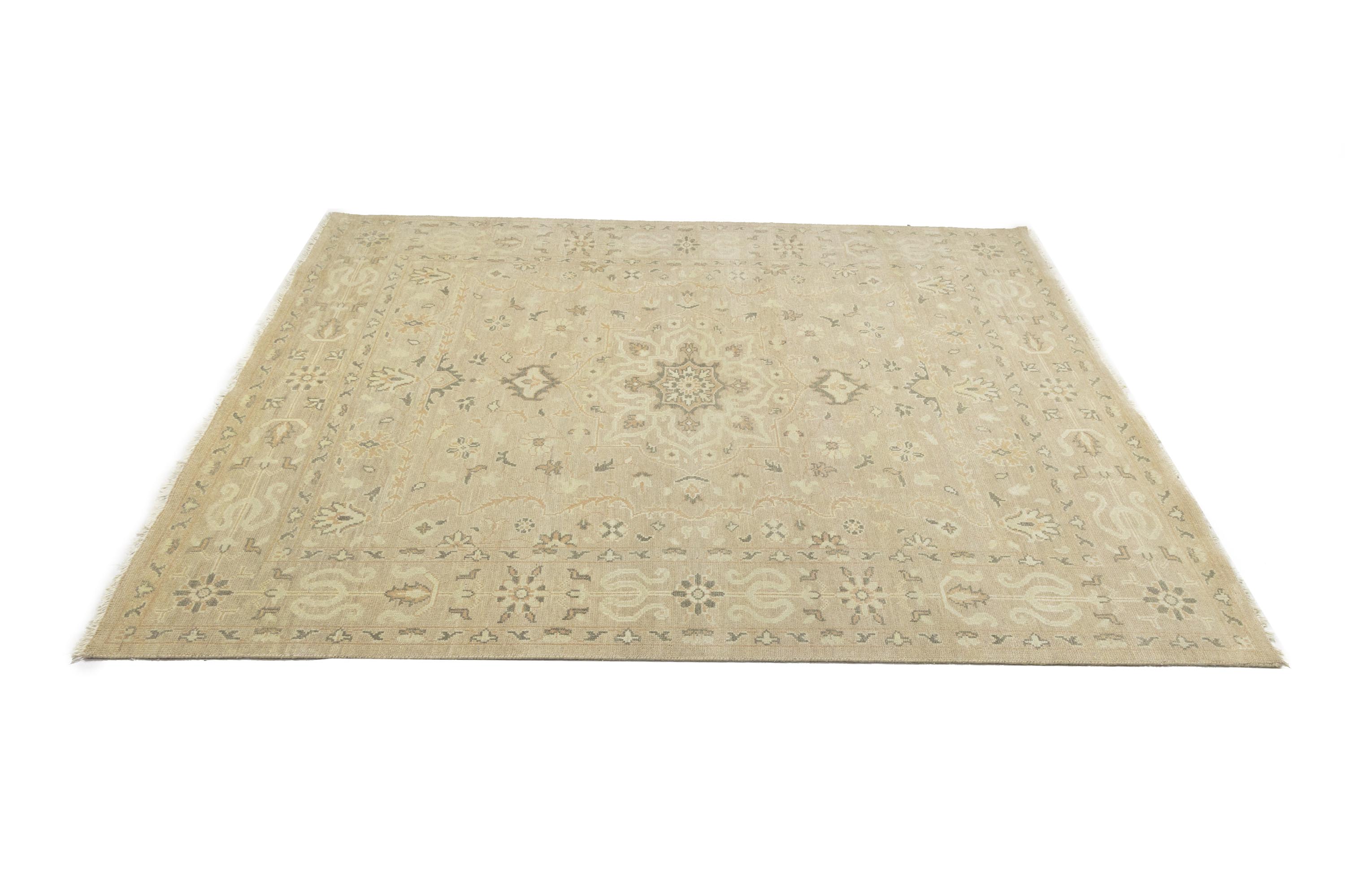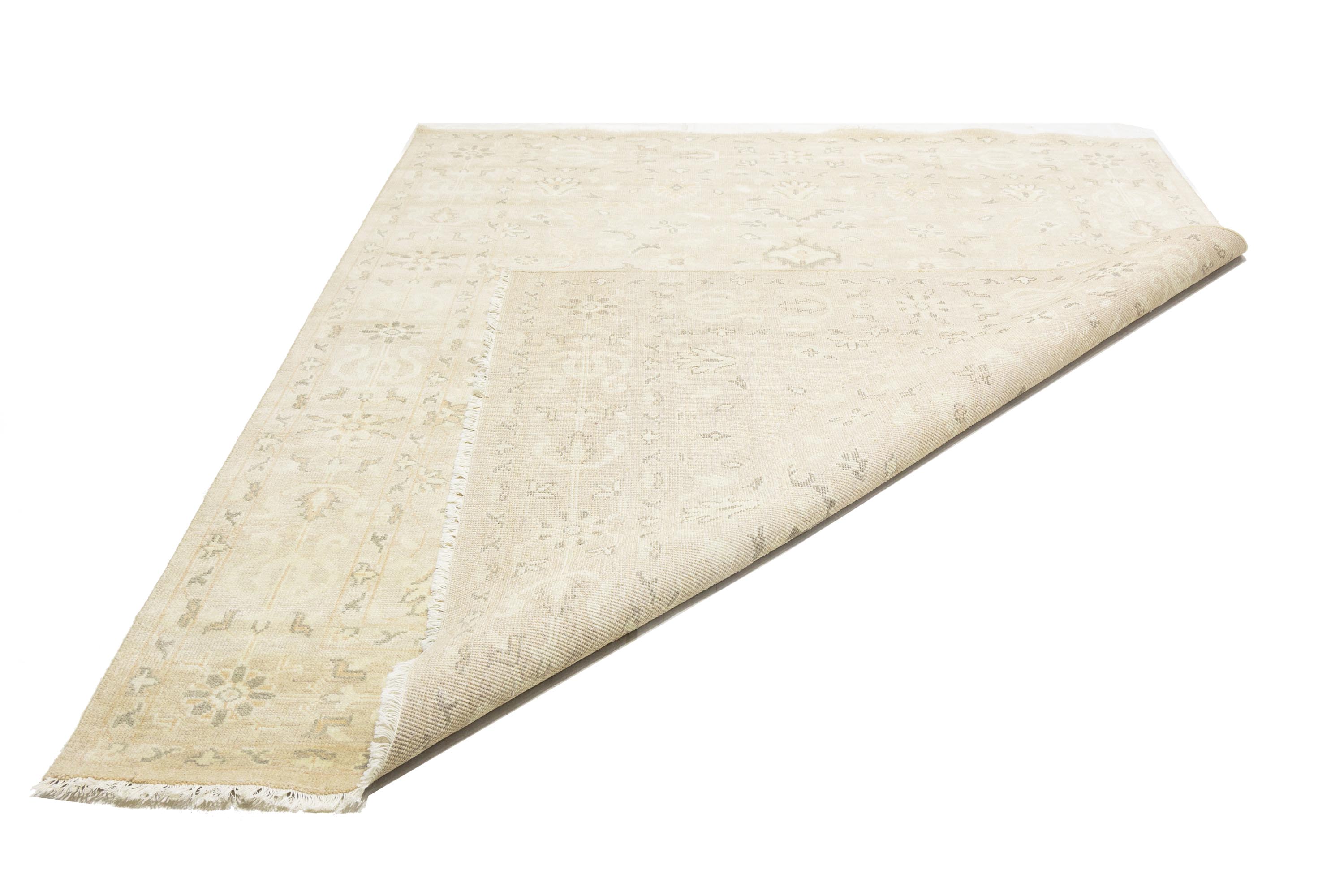 This genuine 8X10 muted beige new Oriental rug was made by the hands of gifted weavers inspired by a variety of spectacular artistic designs, to recreate the aged look of the original piece with a richness of color and ornately patterned background field. What set this vintage style Oriental area rug from the others are the material and dye used (wool pile and cotton foundation), knot count, ancient designs, fantastic grades, and its regional historical connection: it has deep roots, from the story of the people who produced it to the meaning of the symbols and colors displayed across its canvas that have been praised for centuries. This Indian home décor carpet will be completely cozy and inviting that never will go out of style! Also, this Oriental rug would be among your most valuable treasures, it is a great investment that accrues value over time, and it will last for generations because was woven with high-quality, all-natural wool. Environmentally friendly, opulent yet affordable; this rug will give you a thorough amount of character to help define your living space with elegance and warmth that will capture the eyes and attention of your audience (homeowners, designers, decorators, family and friends). OT-12025