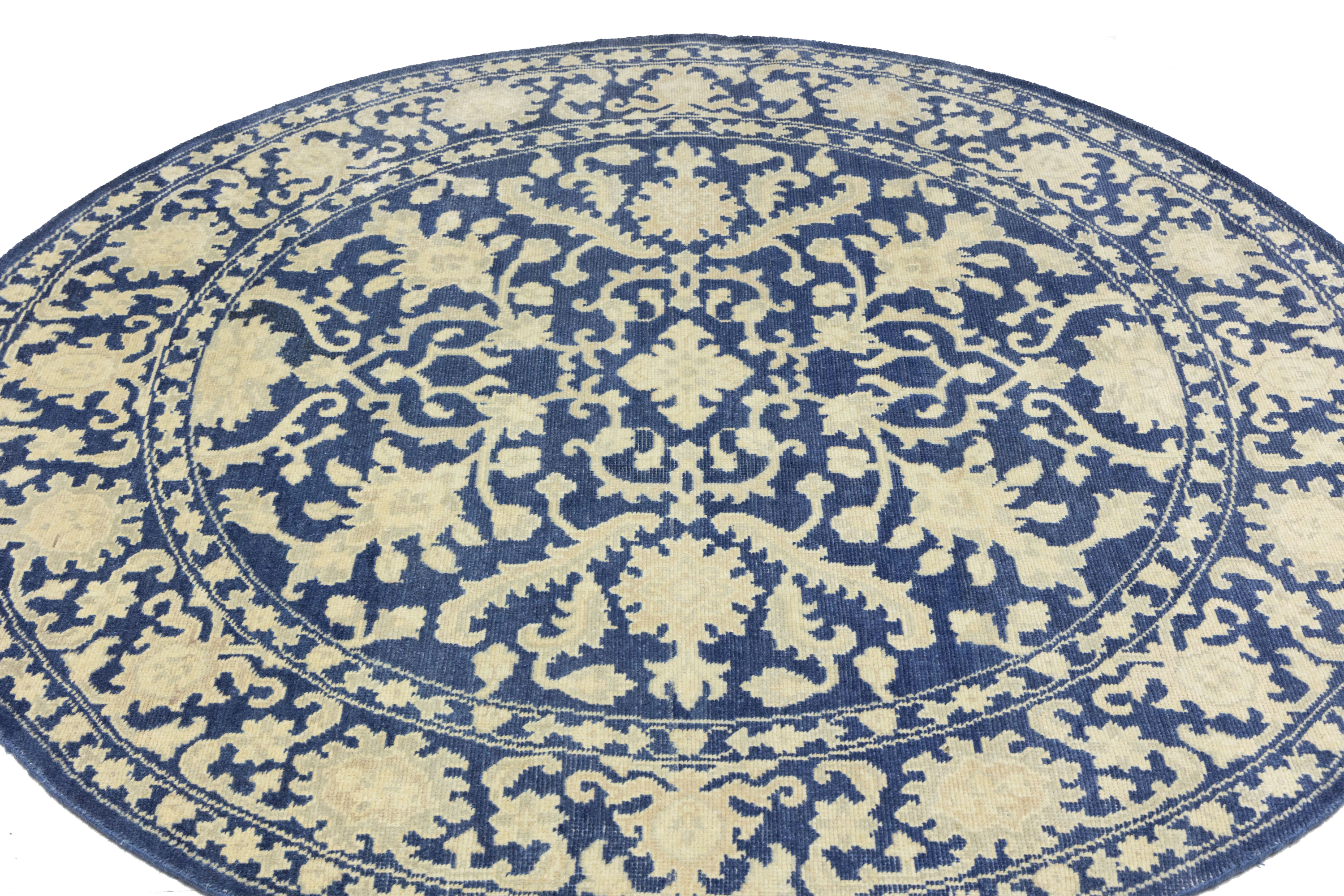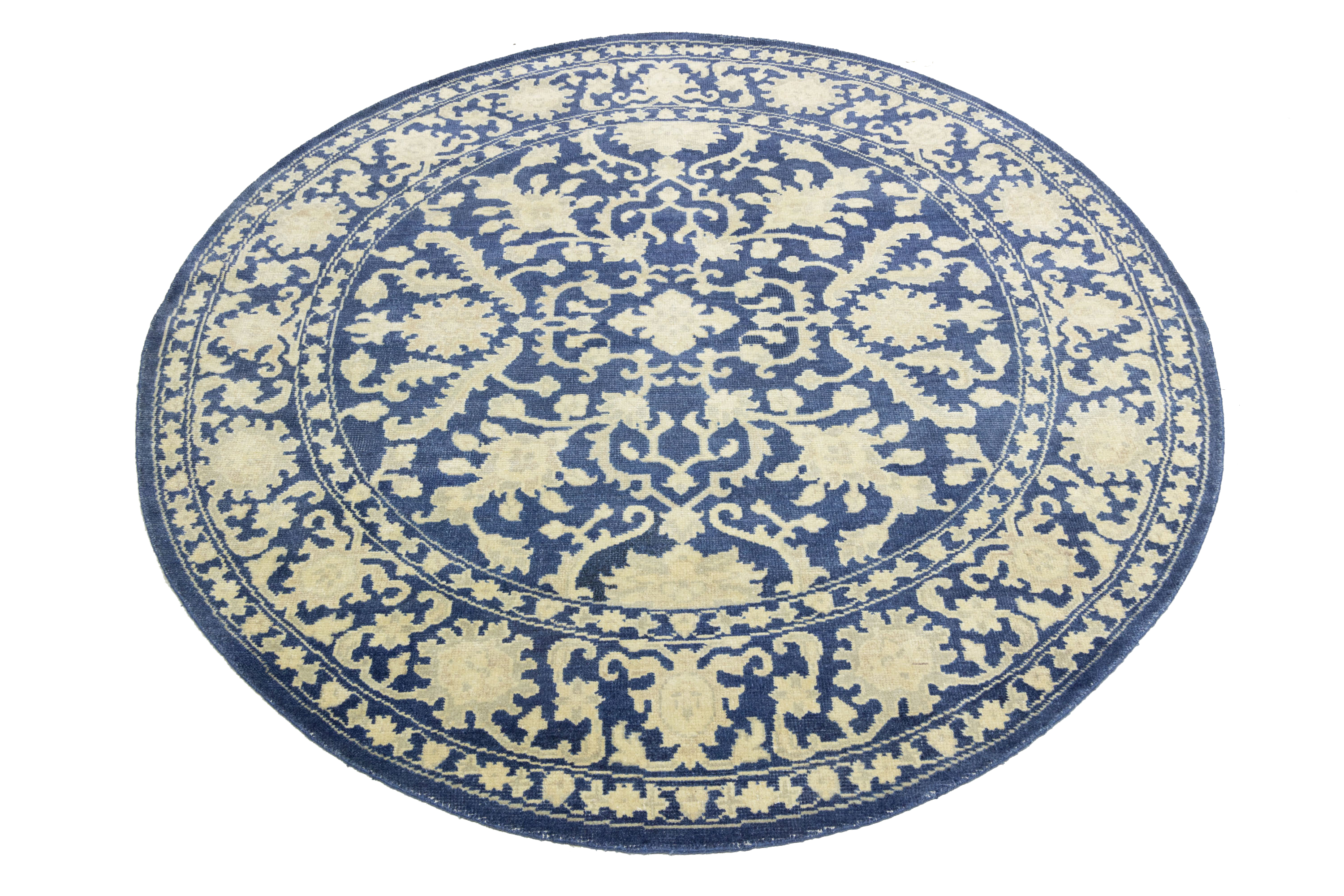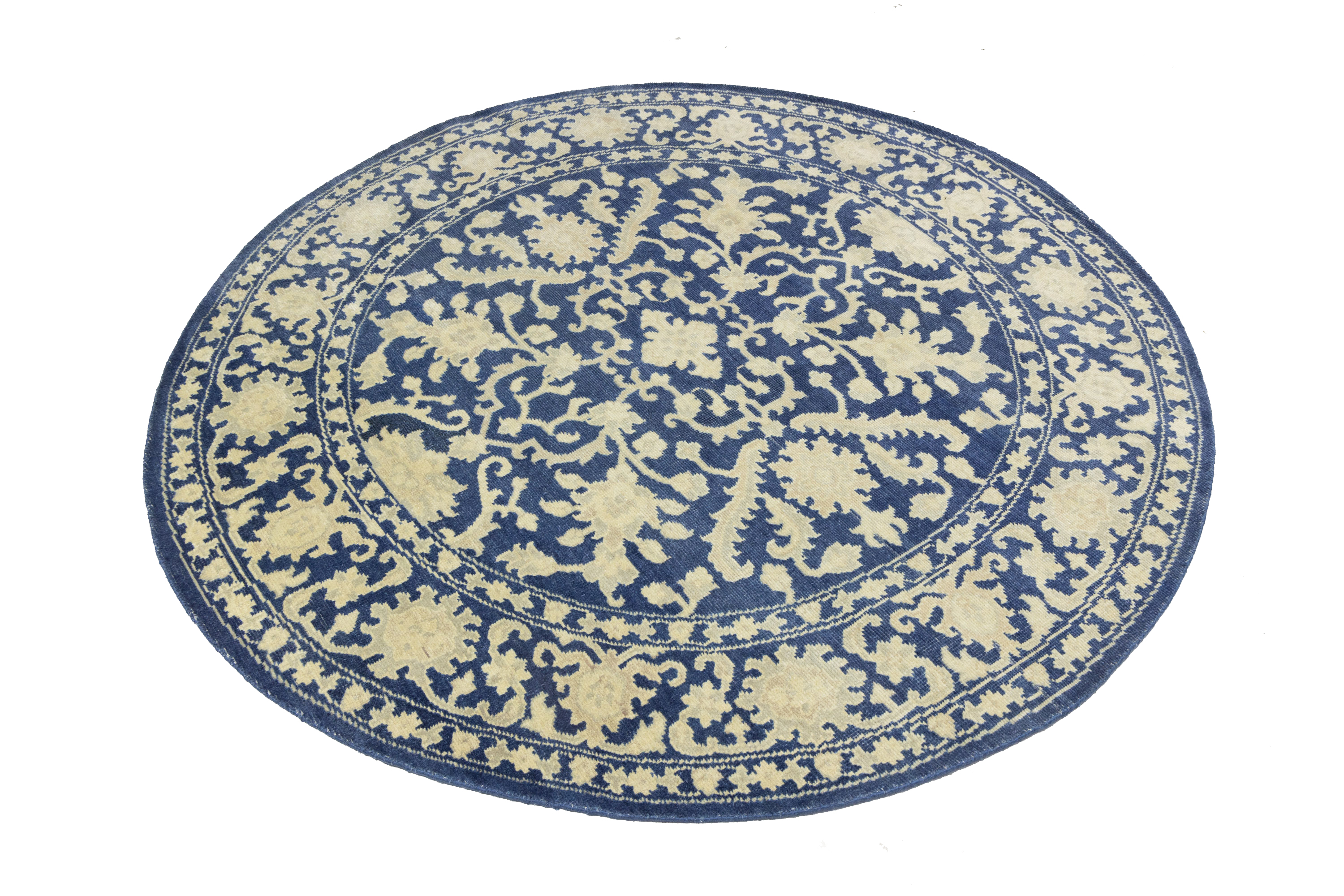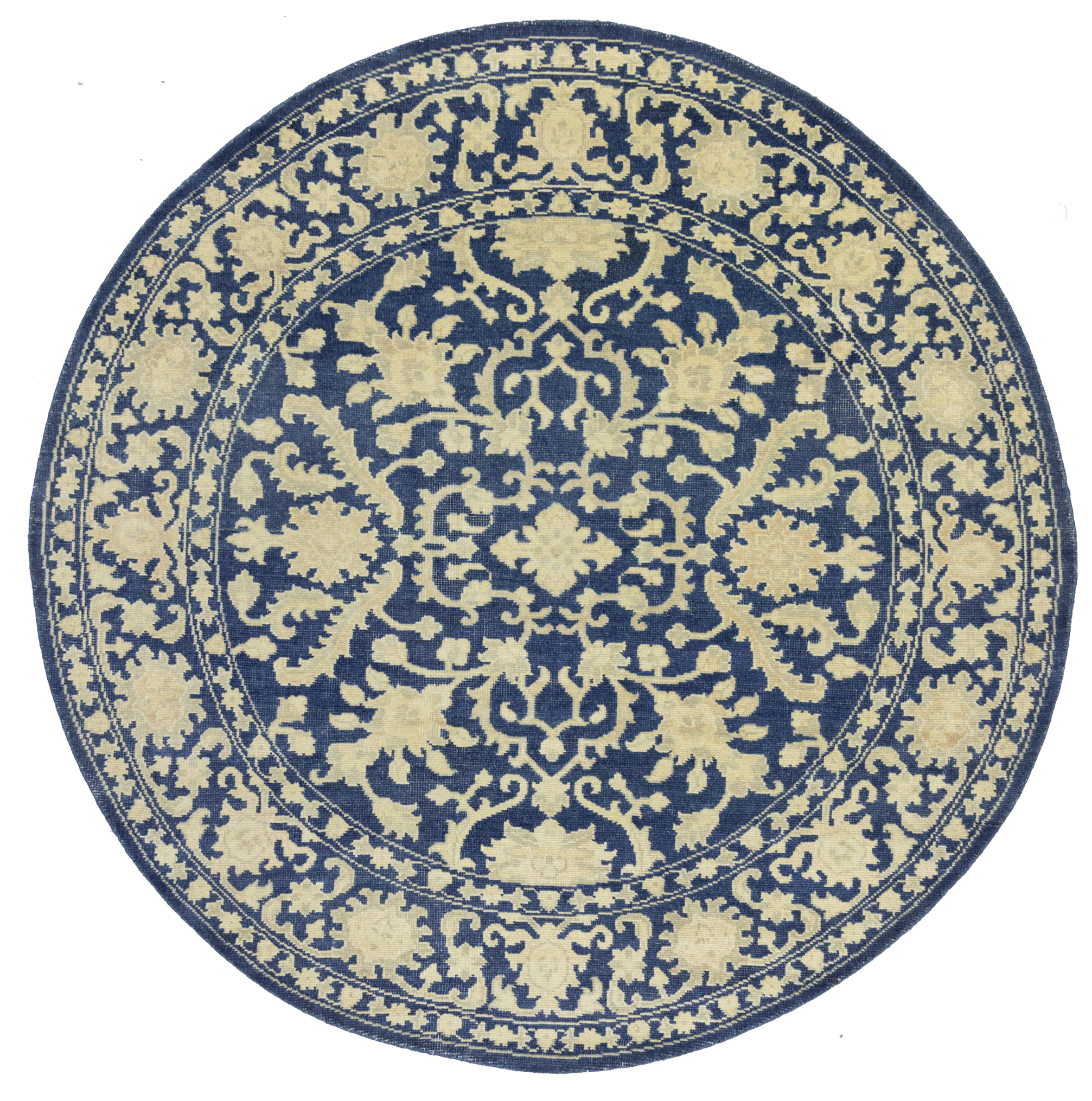 Muted Slate Blue Floral 8x8 Transitional Oriental Round Rug