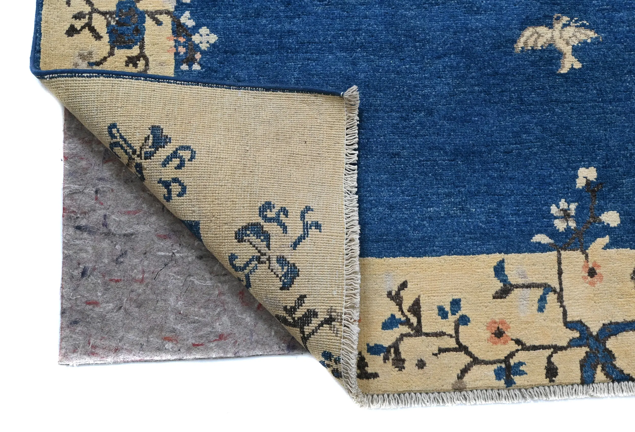 This authentic 5'2X6'5 navy blue Oriental rug was crafted by the hands of skilled weavers enthused by a variety of lovely artistic designs, to recreate the aged look of the unique piece with a richness of color and beautifully elaborated background field. What set this vintage style Oriental area rug from the others are the material and dye used (wool pile and cotton foundation), knot count, ancient designs, fantastic grades, and its regional historical connection: it has deep roots, from the story of the people who produced it to the meaning of the symbols and colors displayed across its canvas that have been praised for centuries. This Indian home décor carpet will be completely cozy and inviting that never will go out of style! Also, this Oriental rug would be among your most valuable treasures, it is a great investment that increase in value over time, and it will last for generations because was woven with high-quality, all-natural wool. Environmentally friendly, opulent yet affordable; this rug will give you a thorough amount of character to help define your living space with sophistication and warmth that will capture the eyes and attention of your audience (homeowners, designers, decorators, family and friends). RT-7705