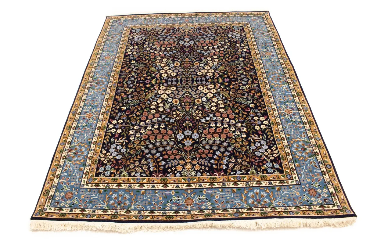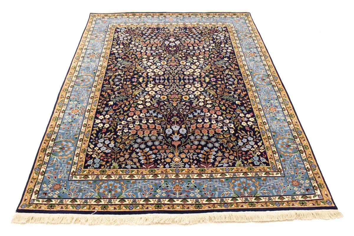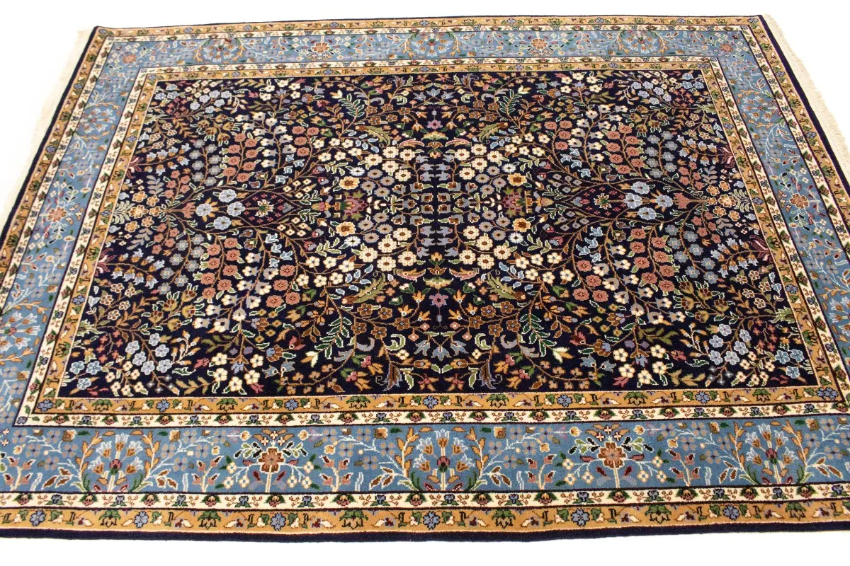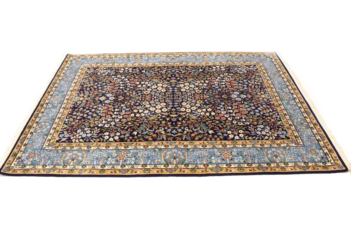 Handmade 6X8 blue Oriental rug made with vegetable dyes (fine wool pile and cotton foundation), exceptional knot count, and appealing ancient designs. This Oriental rug never will go out of style and would be among your most valuable treasures.