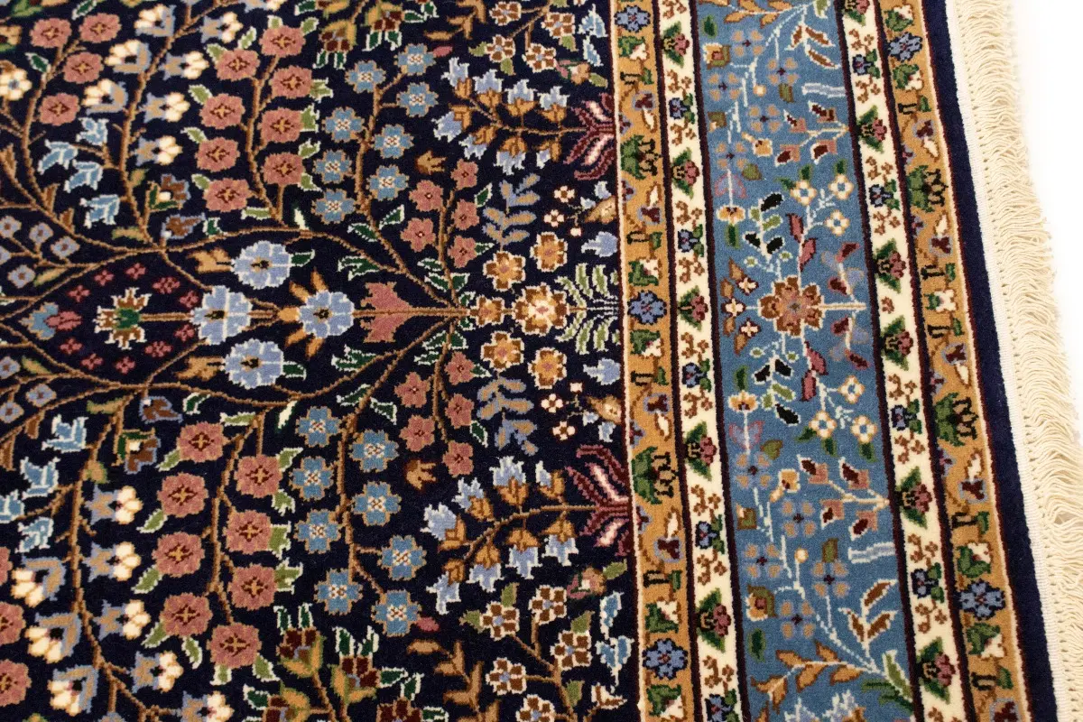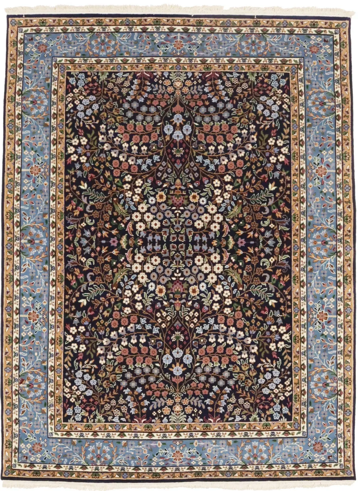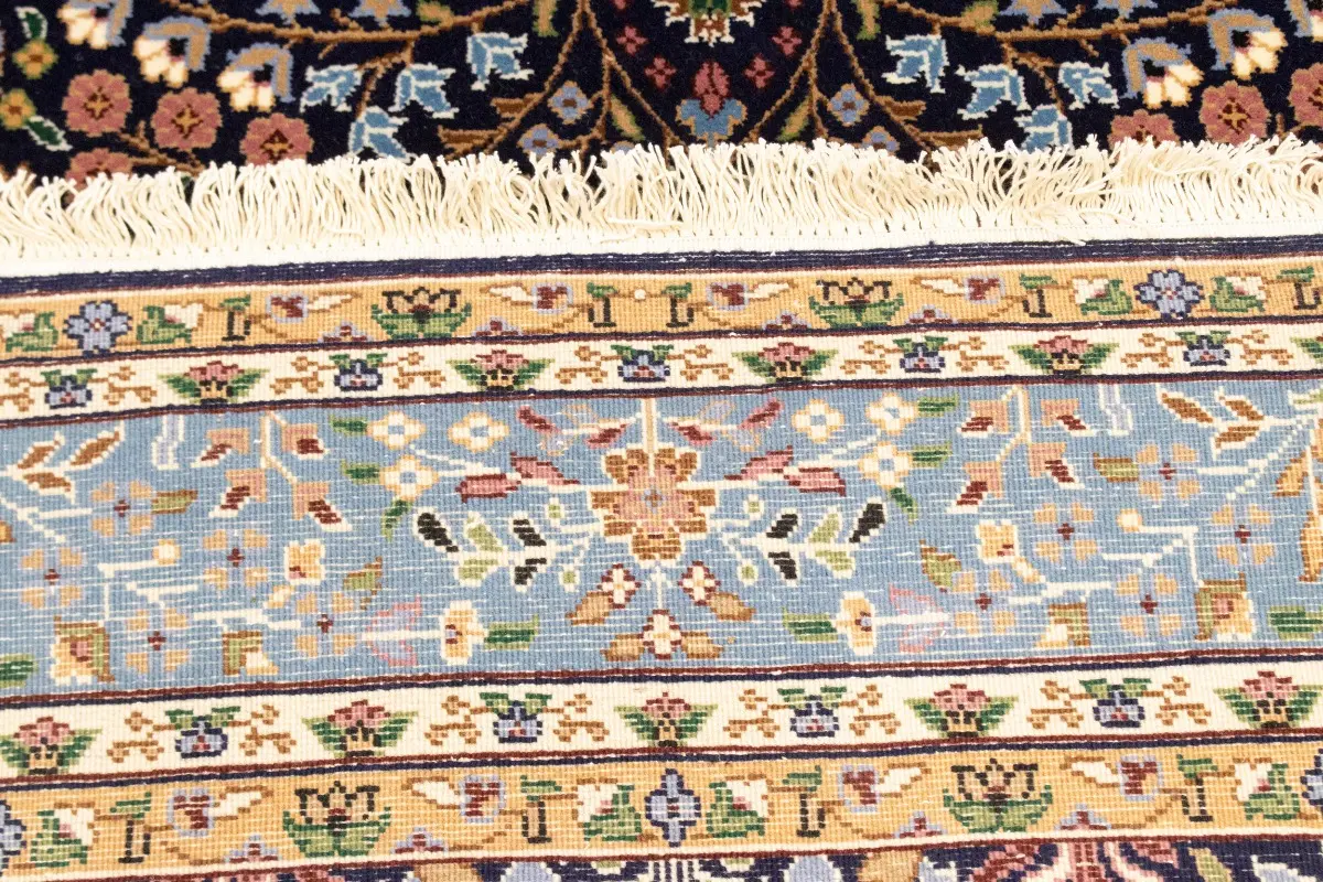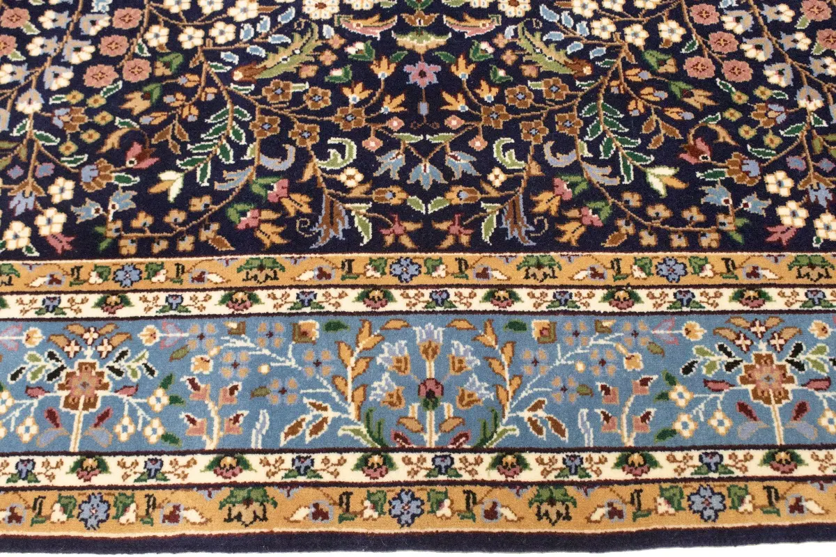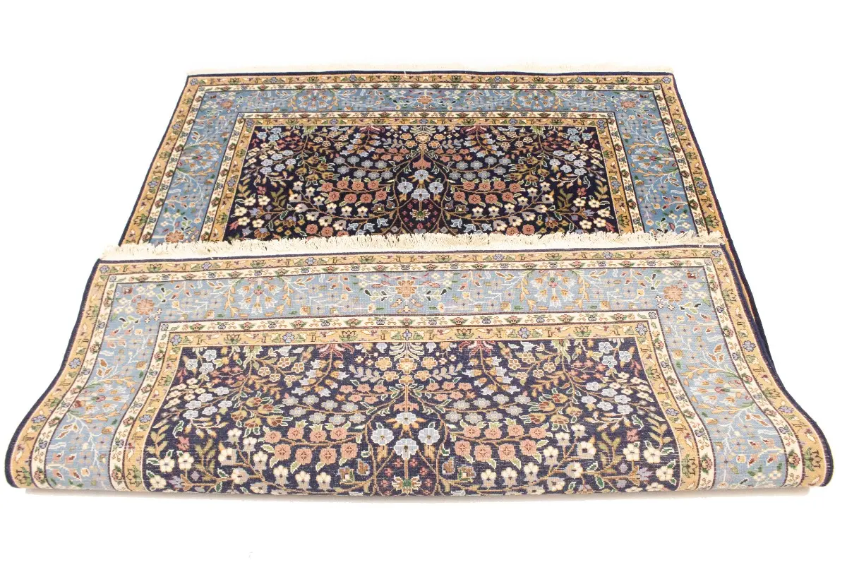 Handmade 6X8 blue Oriental rug made with vegetable dyes (fine wool pile and cotton foundation), exceptional knot count, and appealing ancient designs. This Oriental rug never will go out of style and would be among your most valuable treasures.