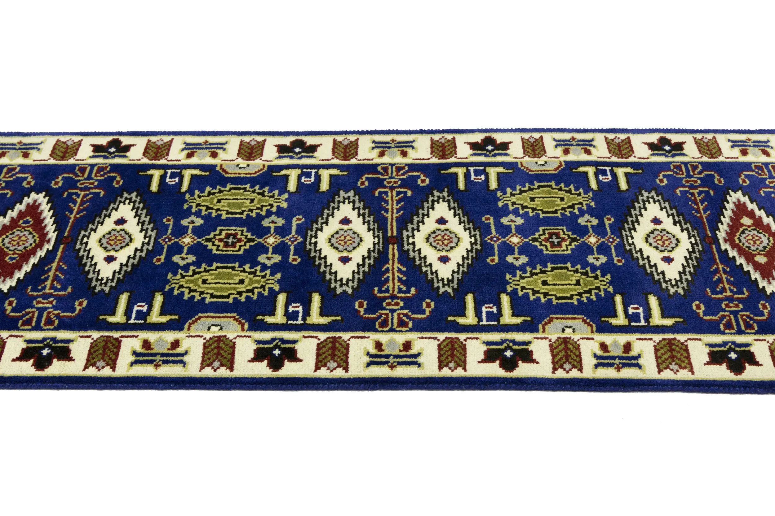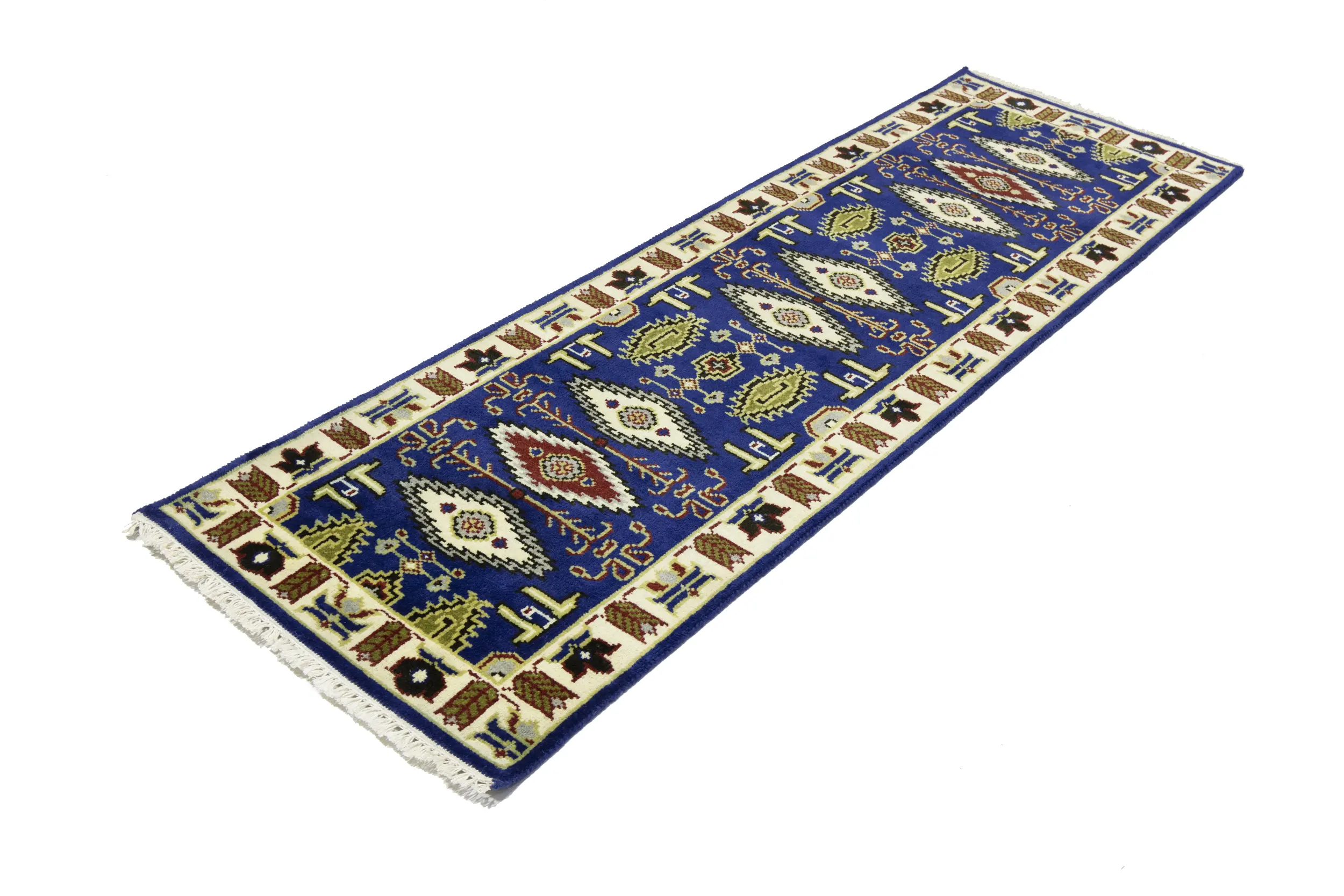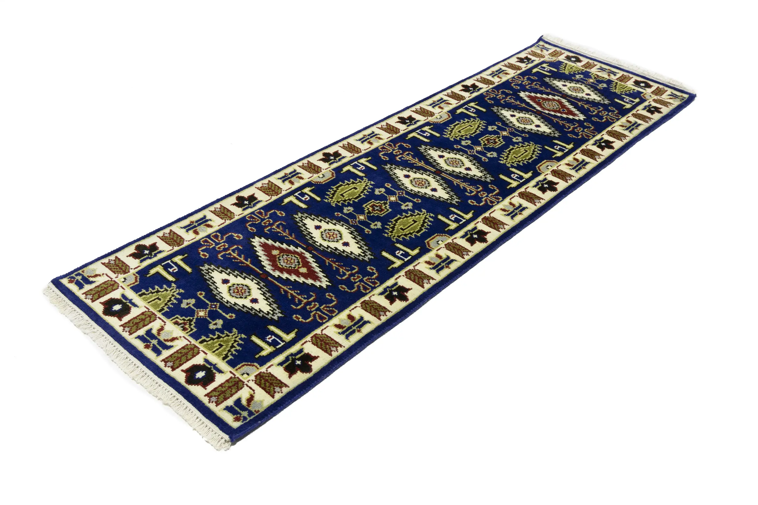 Navy Blue Geometric 3X8 Kazak Oriental Runner Rug