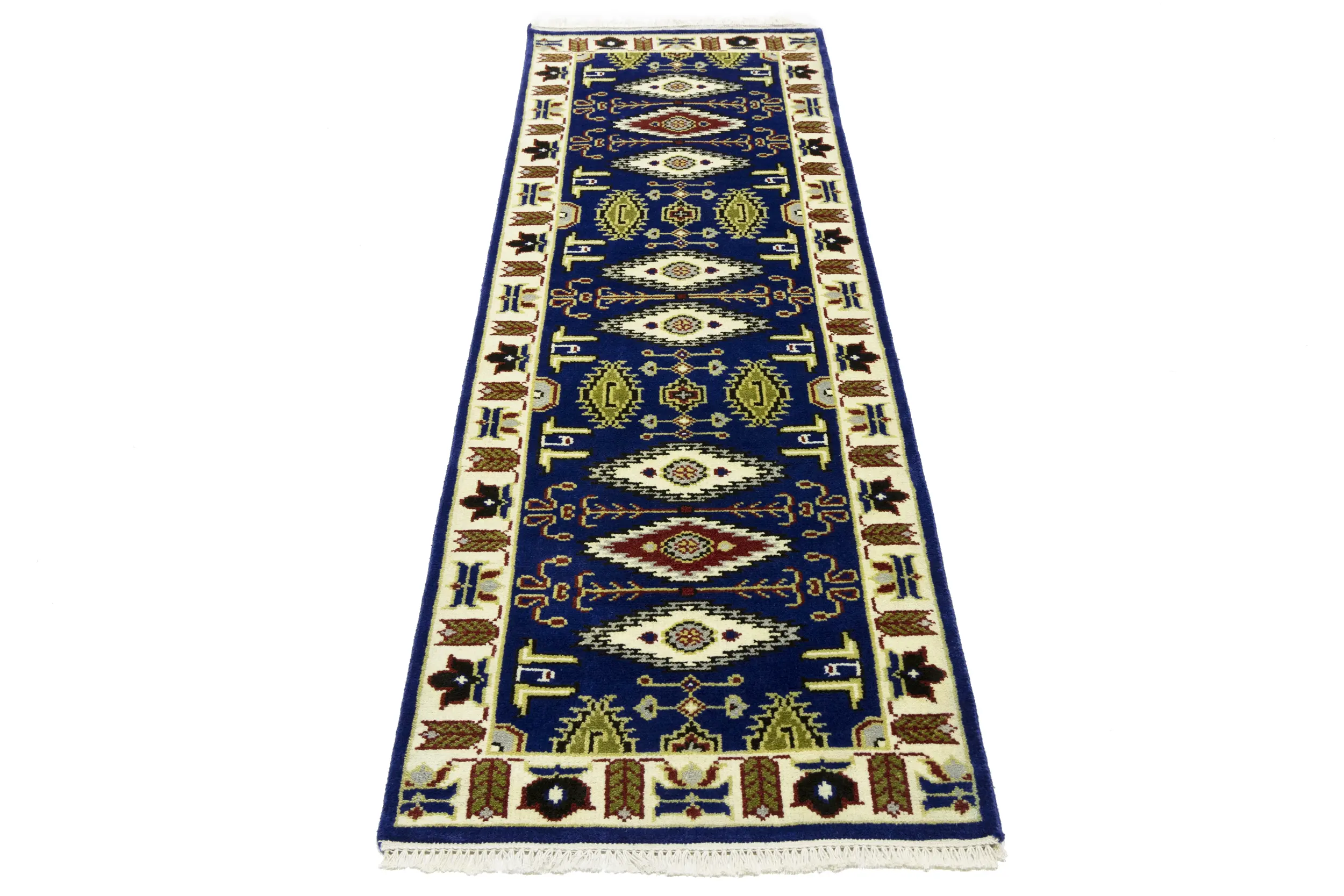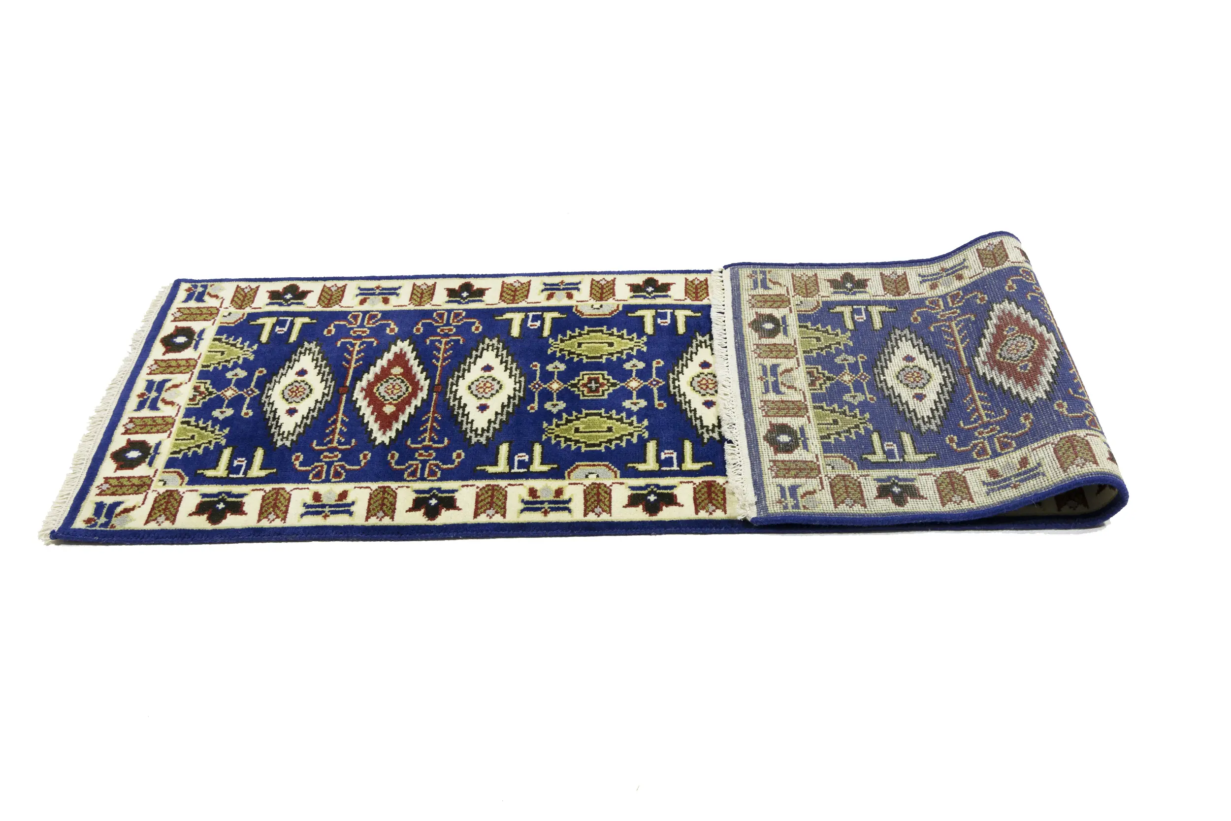 Handmade 3X8 blue oriental runner made with vegetable dyes (fine wool pile and cotton foundation), superior knot count, and appealing ancient designs. This Oriental runner never will go out of style and would be among your most valuable treasures.