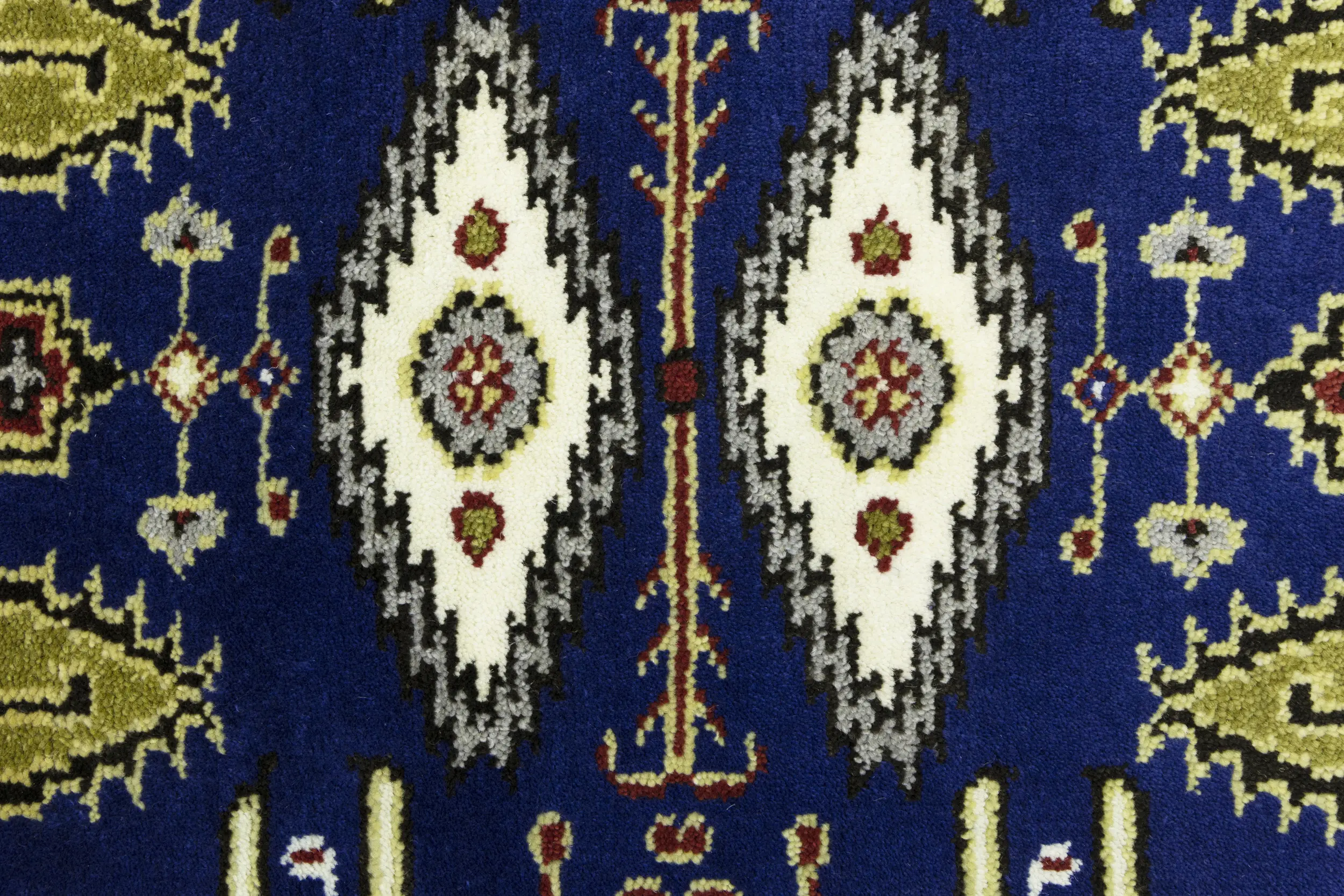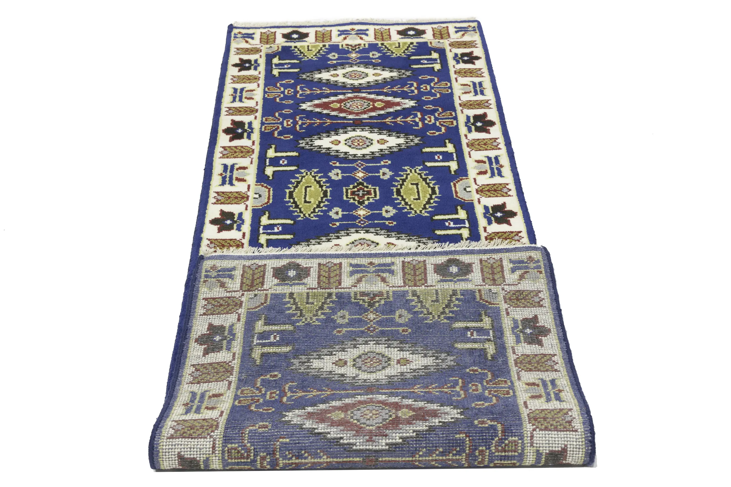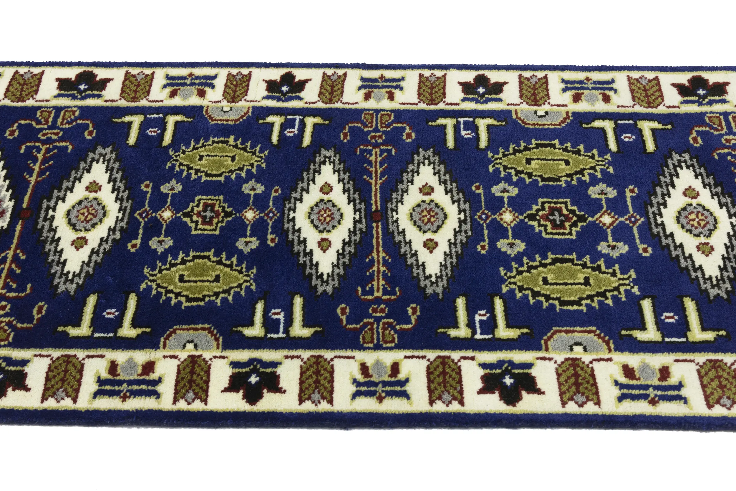 This genuine 3X8 blue new Oriental runner was made by the hands of gifted weavers inspired by a variety of spectacular artistic designs, to recreate the aged look of the original piece with a richness of color and ornately patterned background field. What set this vintage style Oriental area runner from the others are the material and dye used (wool pile and cotton foundation), knot count, ancient designs, fantastic grades, and its regional historical connection: it has deep roots, from the story of the people who produced it to the meaning of the symbols and colors displayed across its canvas that have been praised for centuries. This Indian home décor carpet will be completely cozy and inviting that never will go out of style! Also, this Oriental runner would be among your most valuable treasures, it is a great investment that accrues value over time, and it will last for generations because was woven with high-quality, all-natural wool. Environmentally friendly, opulent yet affordable; this rug will give you a thorough amount of character to help define your living space with elegance and warmth that will capture the eyes and attention of your audience (homeowners, designers, decorators, family and friends).
