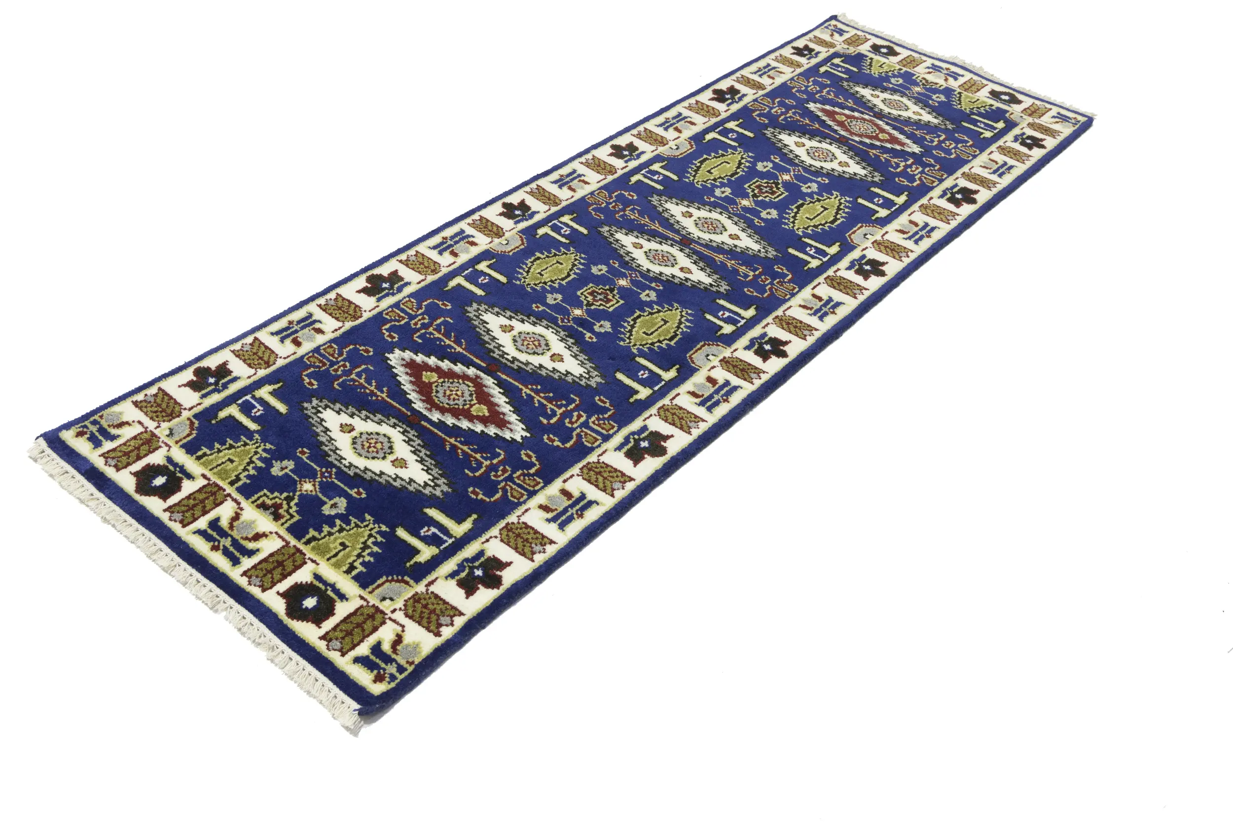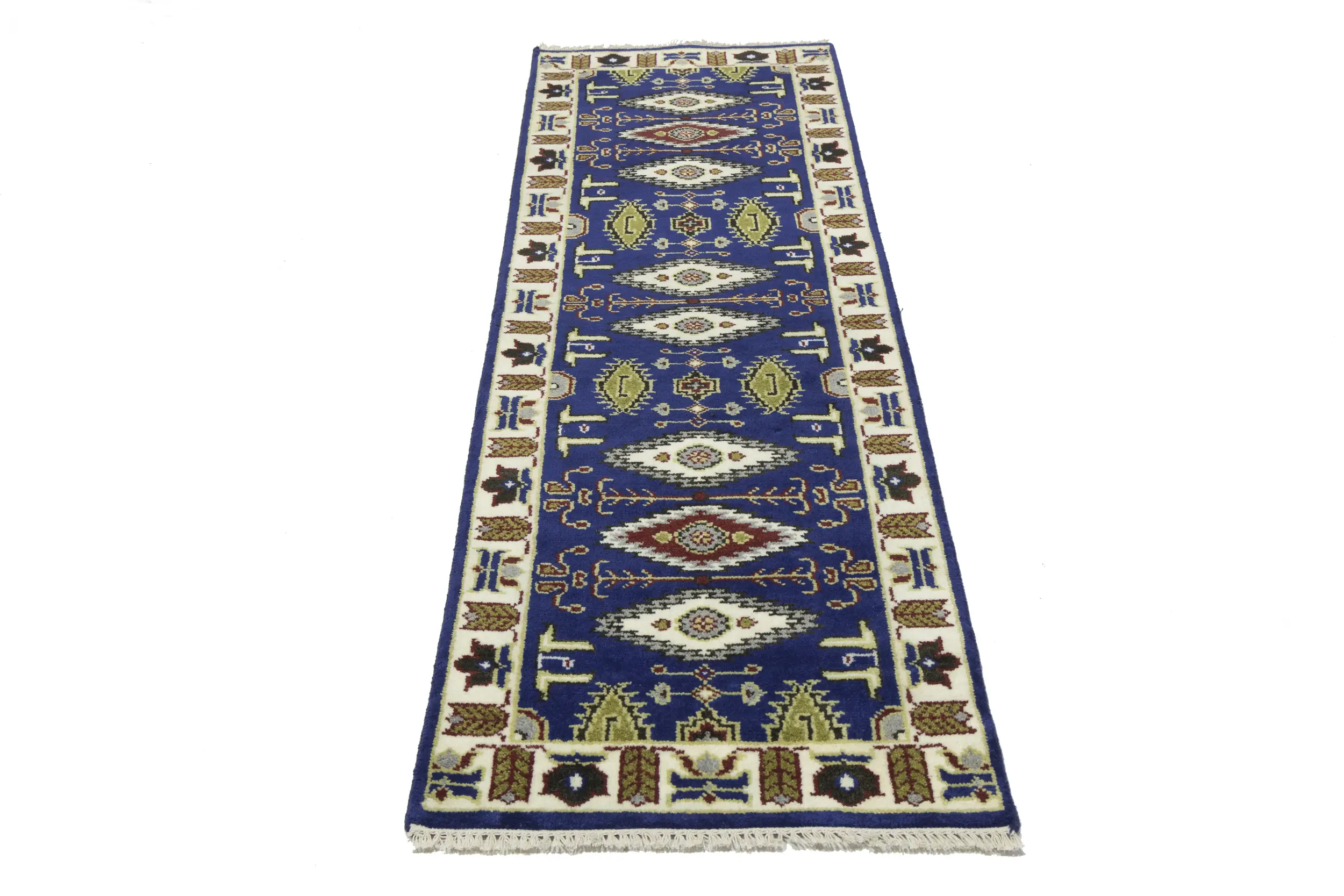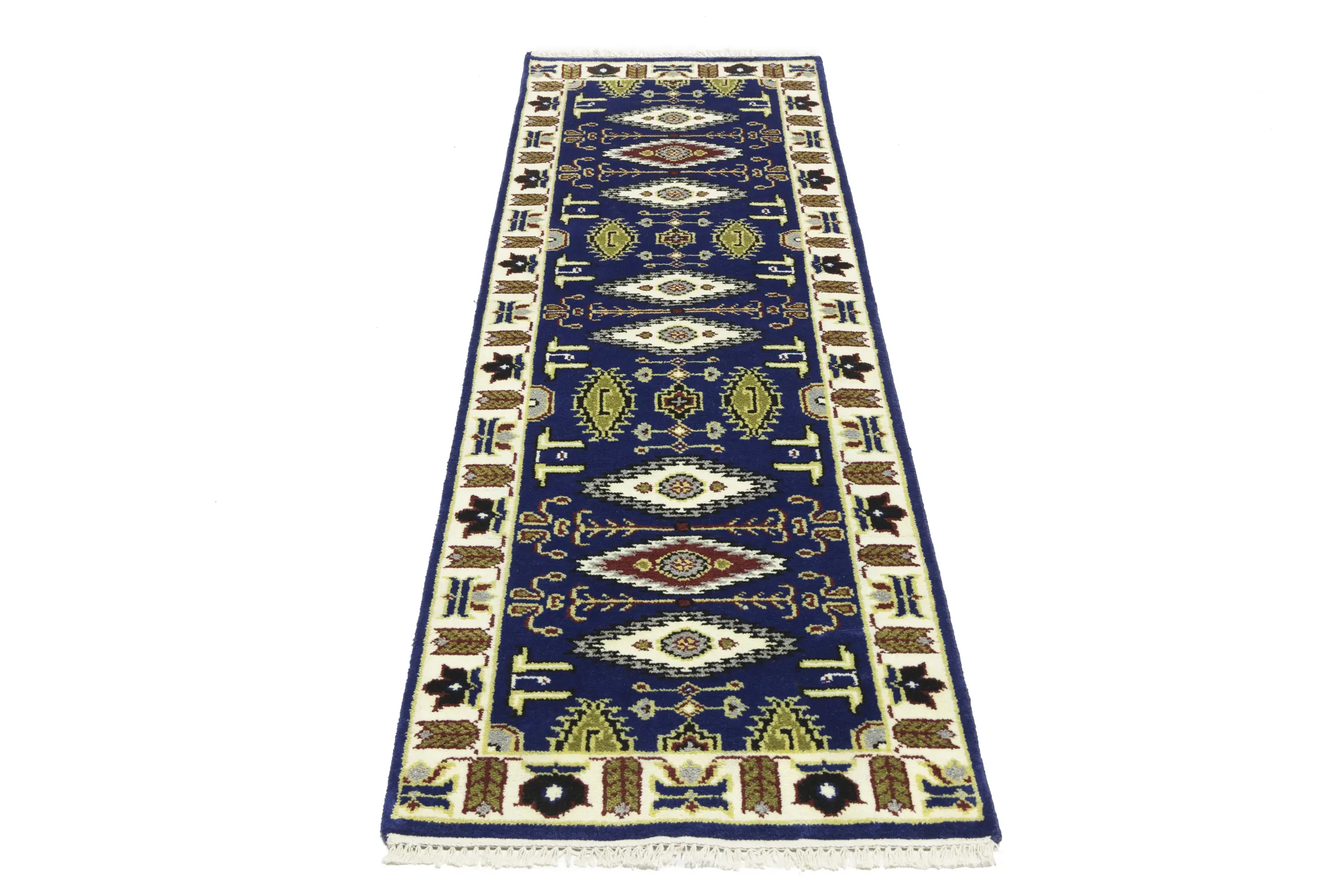 Handmade 3X8 blue oriental runner made with vegetable dyes (fine wool pile and cotton foundation), superior knot count, and appealing ancient designs. This Oriental runner never will go out of style and would be among your most valuable treasures.