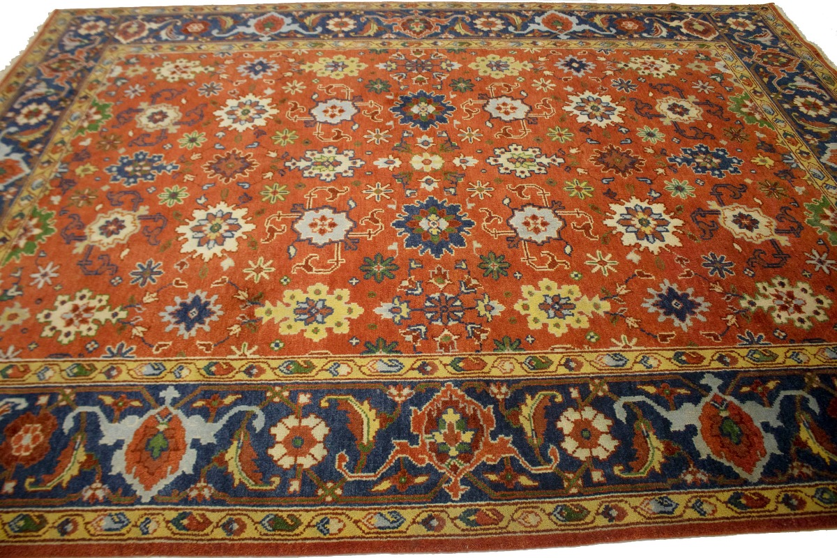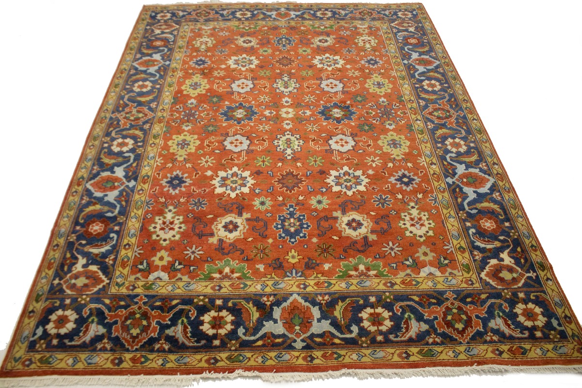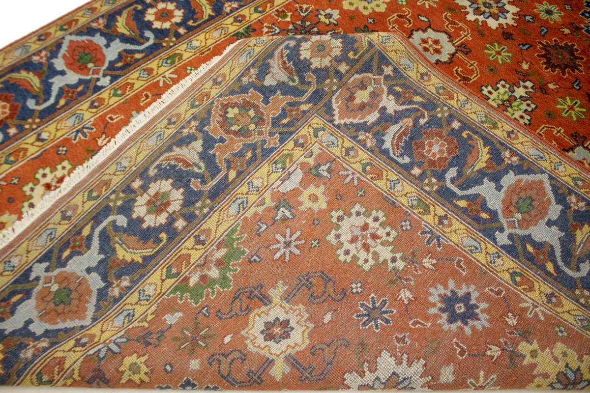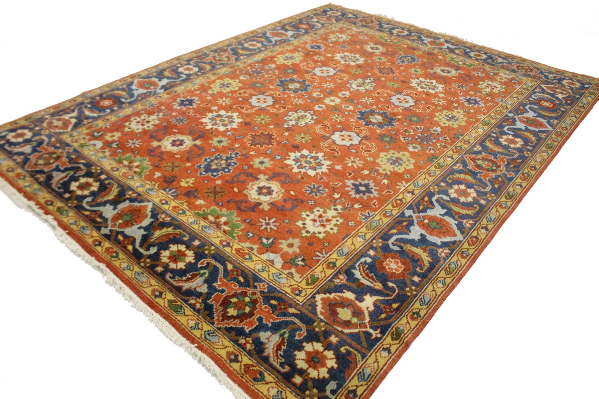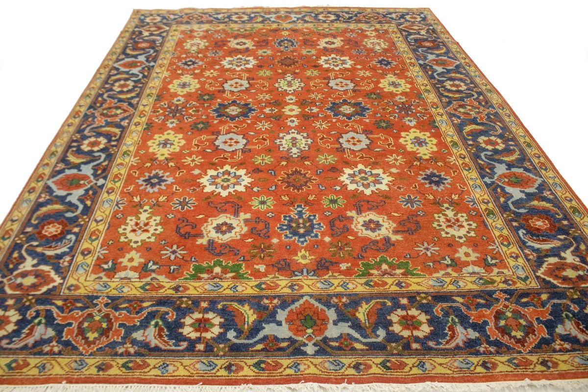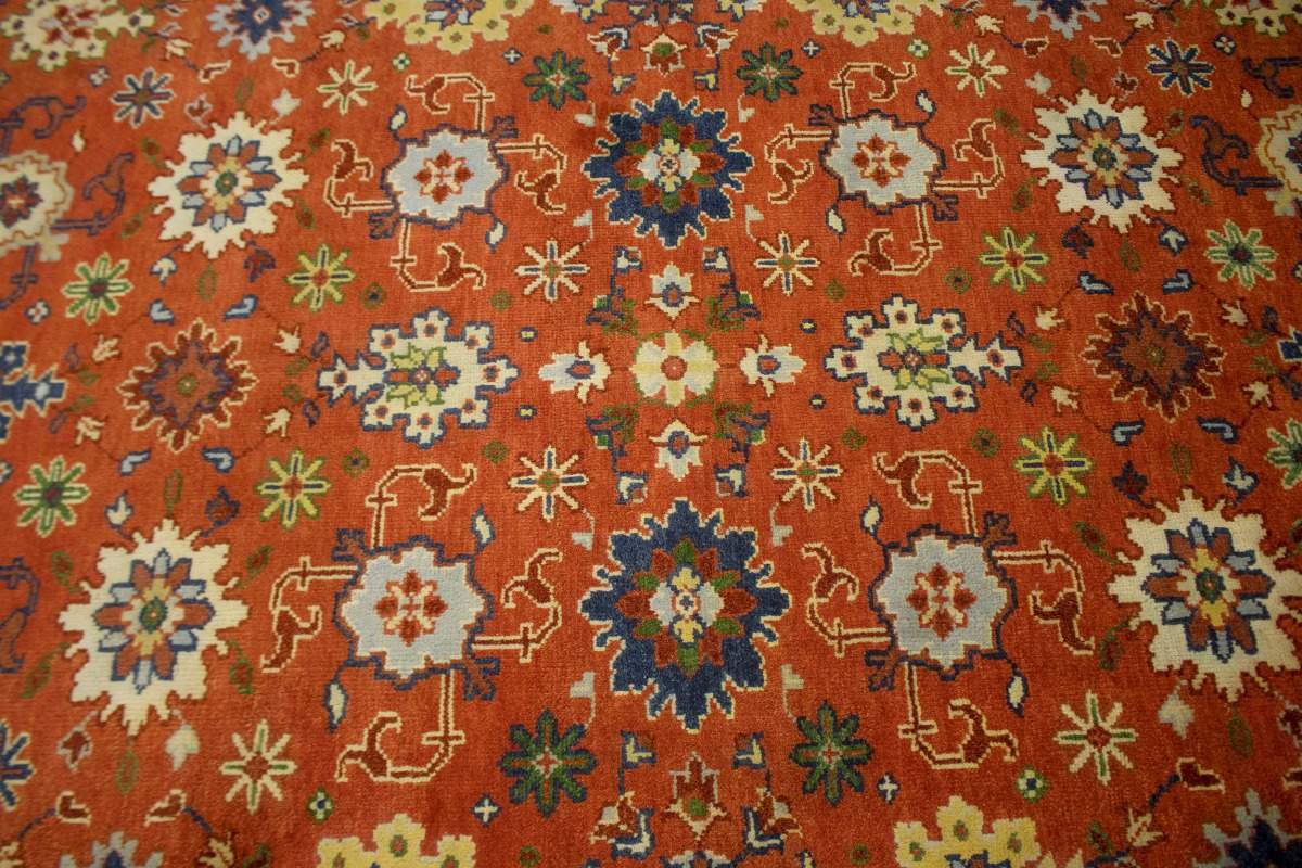 This authentic 9X12 orange new Oriental rug was masterly knotted by the hands of weavers inspired by a variety of wonderful artistic designs, to recreate the aged look of the original piece with a richness of color and intricate patterned background field. What set this vintage style Oriental area rug from the others are the material and dye used (wool pile and cotton foundation), knot count, antique designs, fantastic grades, and its regional historical connection: it has deep roots, from the story of the people who produced it to the meaning of the symbols and colors displayed across its canvas that have been praised for centuries. This Indian home décor carpet will be completely cozy and inviting that never will go out of style! Also, this Oriental rug would be among your most valuable treasures, it is a great investment that accrues value over time, and it will last for generations because was woven with high-quality, all-natural wool. Environmentally friendly, opulent yet affordable; this rug will give you a thorough amount of character to help define your living space with luxury and warmth that will capture the eyes and attention of your audience (homeowners, designers, decorators, family and friends). OT-4117