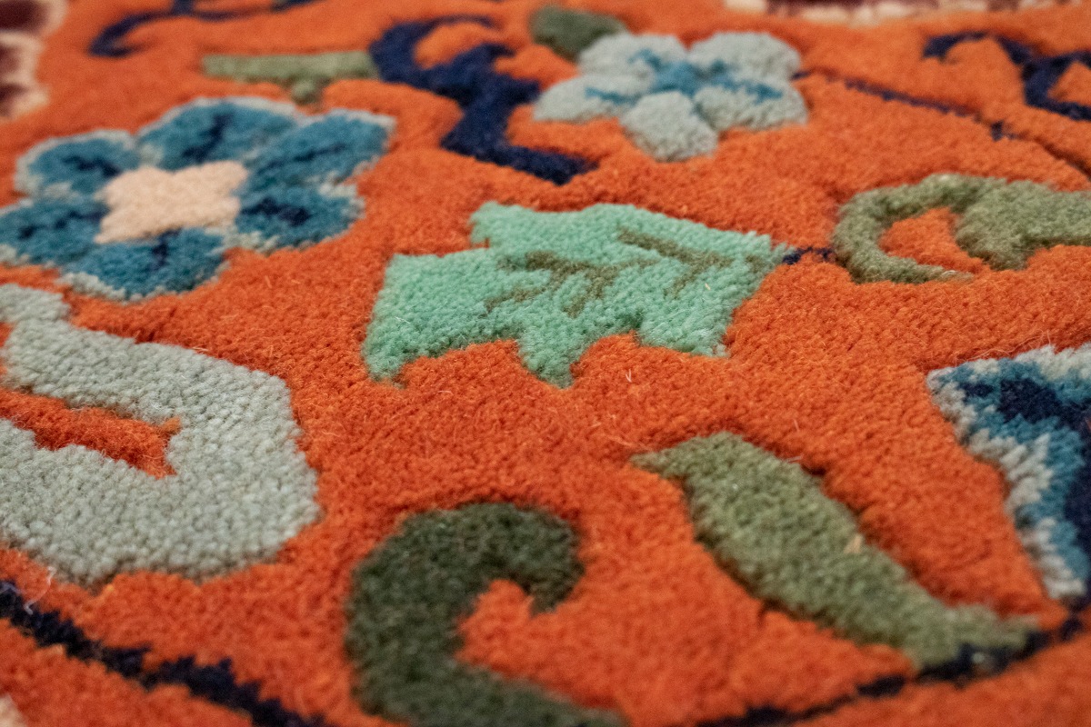This genuine 6X9 orange new Oriental rug was made by the hands of gifted weavers inspired by a variety of spectacular artistic designs, to recreate the aged look of the original piece with a richness of color and ornately patterned background field. What set this vintage style Oriental area rug/runner from the others are the material and dye used (wool pile and cotton foundation), knot count, ancient designs, fantastic grades, and its regional historical connection: it has deep roots, from the story of the people who produced it to the meaning of the symbols and colors displayed across its canvas that have been praised for centuries. This Indian home décor carpet will be completely cozy and inviting that never will go out of style! Also, this Oriental rug would be among your most valuable treasures, it is a great investment that accrues value over time, and it will last for generations because was woven with high-quality, all-natural wool. Environmentally friendly, opulent yet affordable; this rug/runner will give you a thorough amount of character to help define your living space with elegance and warmth that will capture the eyes and attention of your audience (homeowners, designers, decorators, family and friends). OT-2271