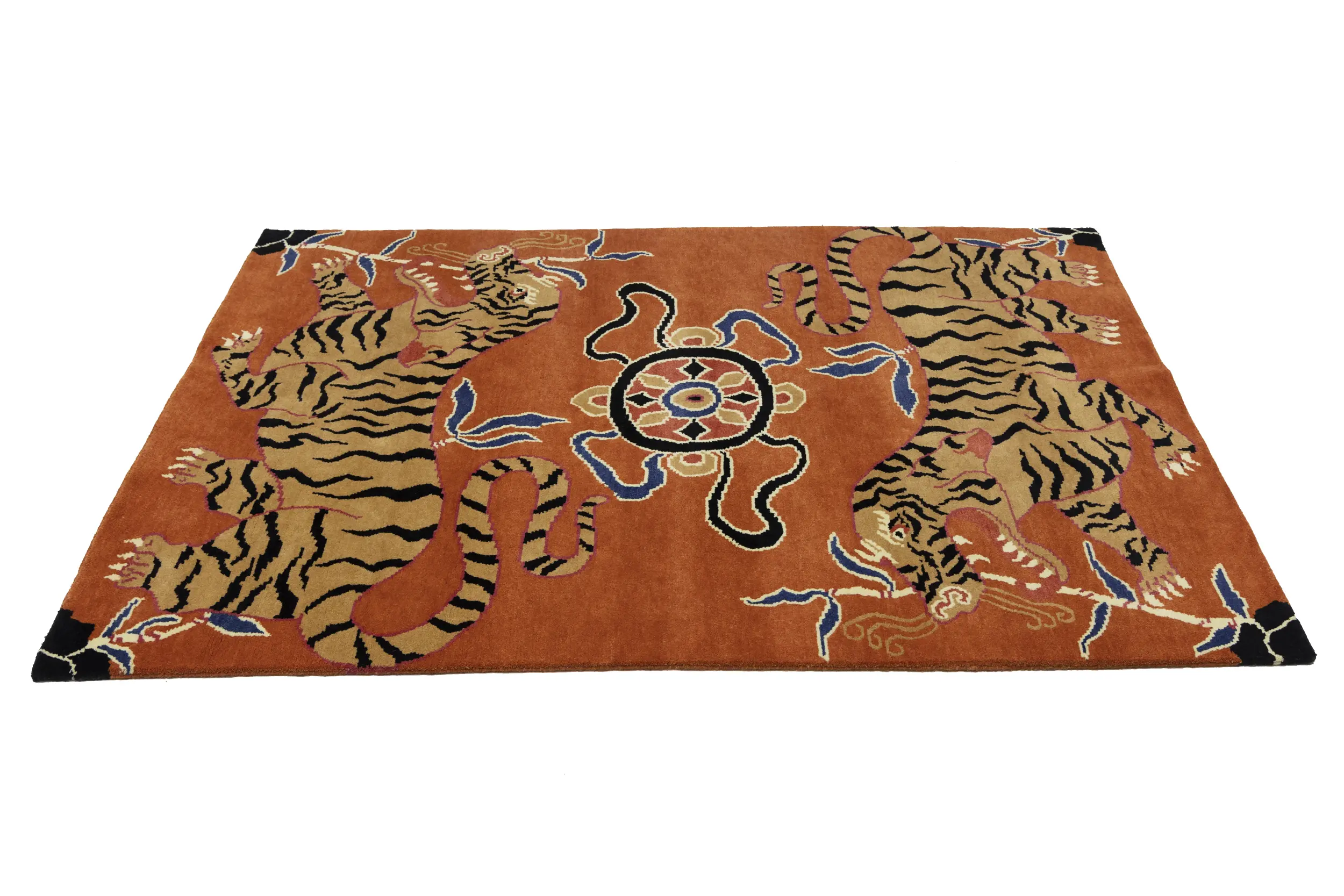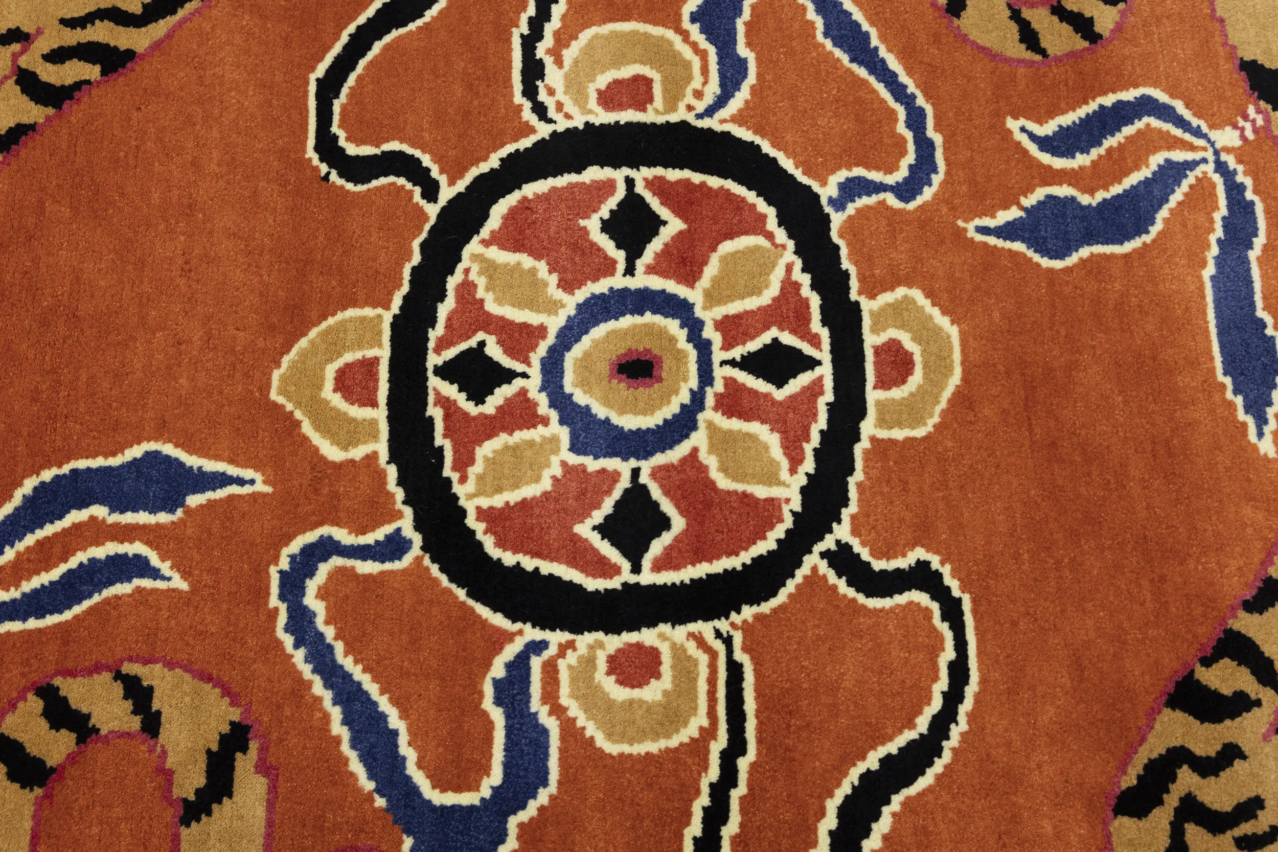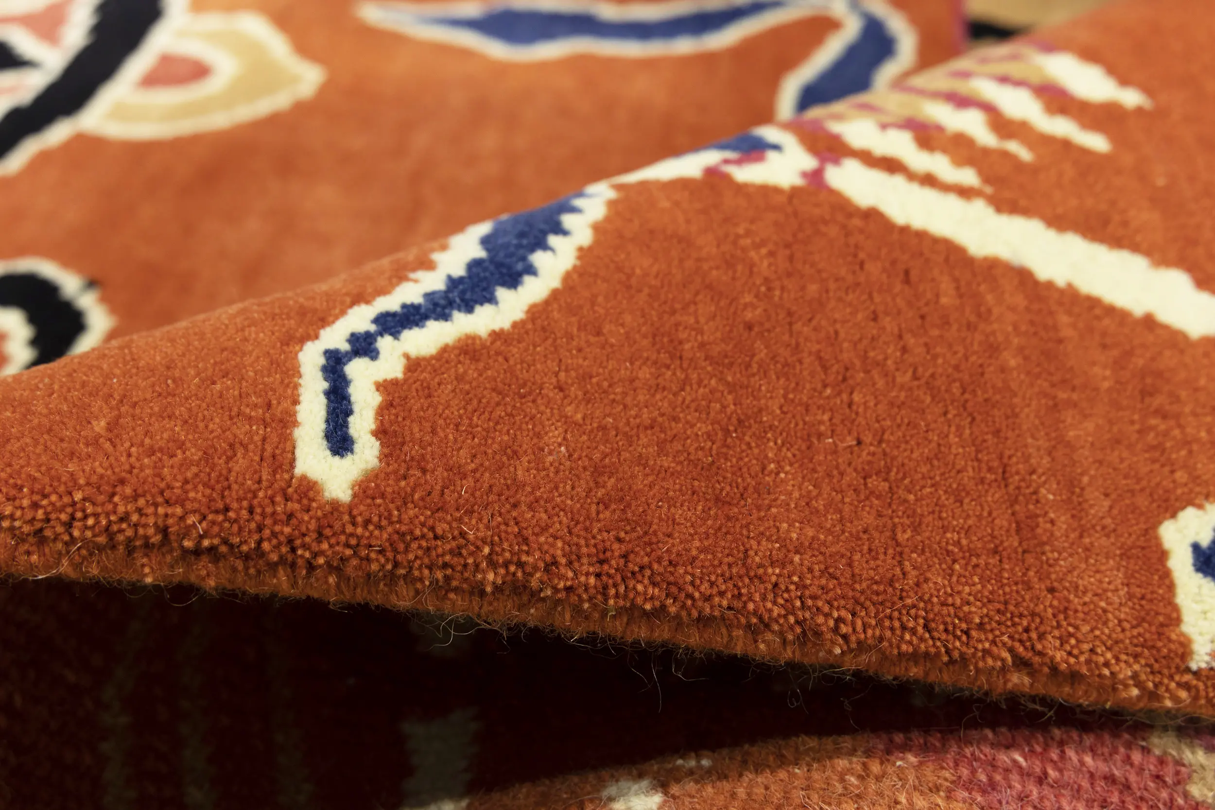 This authentic 5X7 orange new Oriental rug was crafted by the hands of skilled weavers enthused by a variety of lovely artistic designs, to recreate the aged look of the unique piece with a richness of color and beautifully elaborated background field. What set this vintage style Oriental area rug from the others are the material and dye used (wool pile and cotton foundation), knot count, ancient designs, fantastic grades, and its regional historical connection: it has deep roots, from the story of the people who produced it to the meaning of the symbols and colors displayed across its canvas that have been praised for centuries. This Indian home décor carpet will be completely cozy and inviting that never will go out of style! Also, this Oriental rug would be among your most valuable treasures, it is a great investment that increase in value over time, and it will last for generations because was woven with high-quality, all-natural wool. Environmentally friendly, opulent yet affordable; this rug will give you a thorough amount of character to help define your living space with sophistication and warmth that will capture the eyes and attention of your audience (homeowners, designers, decorators, family and friends).