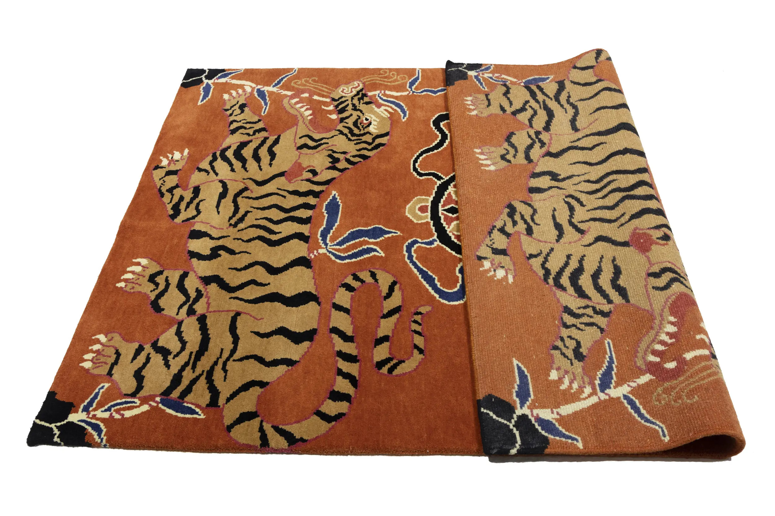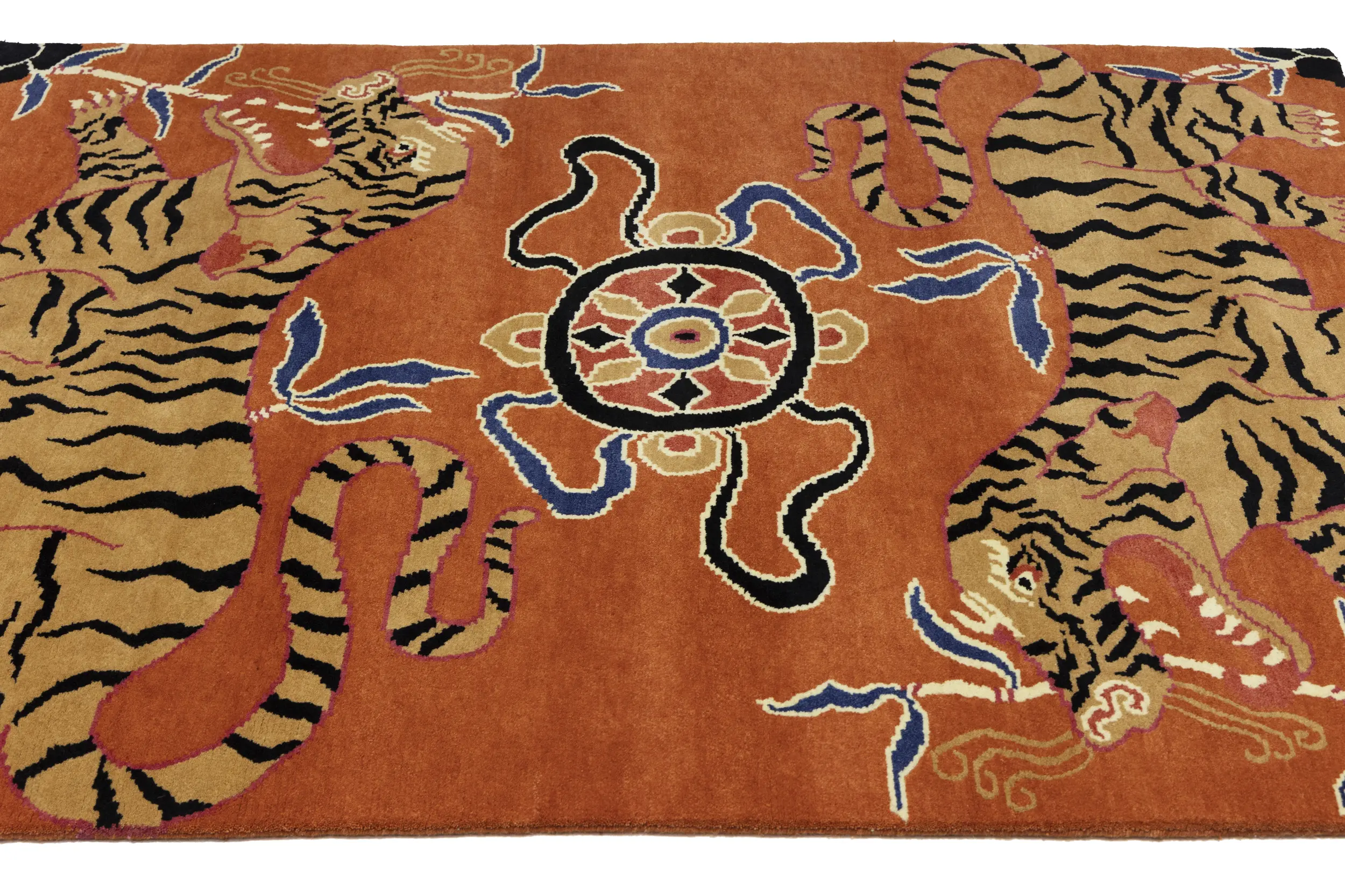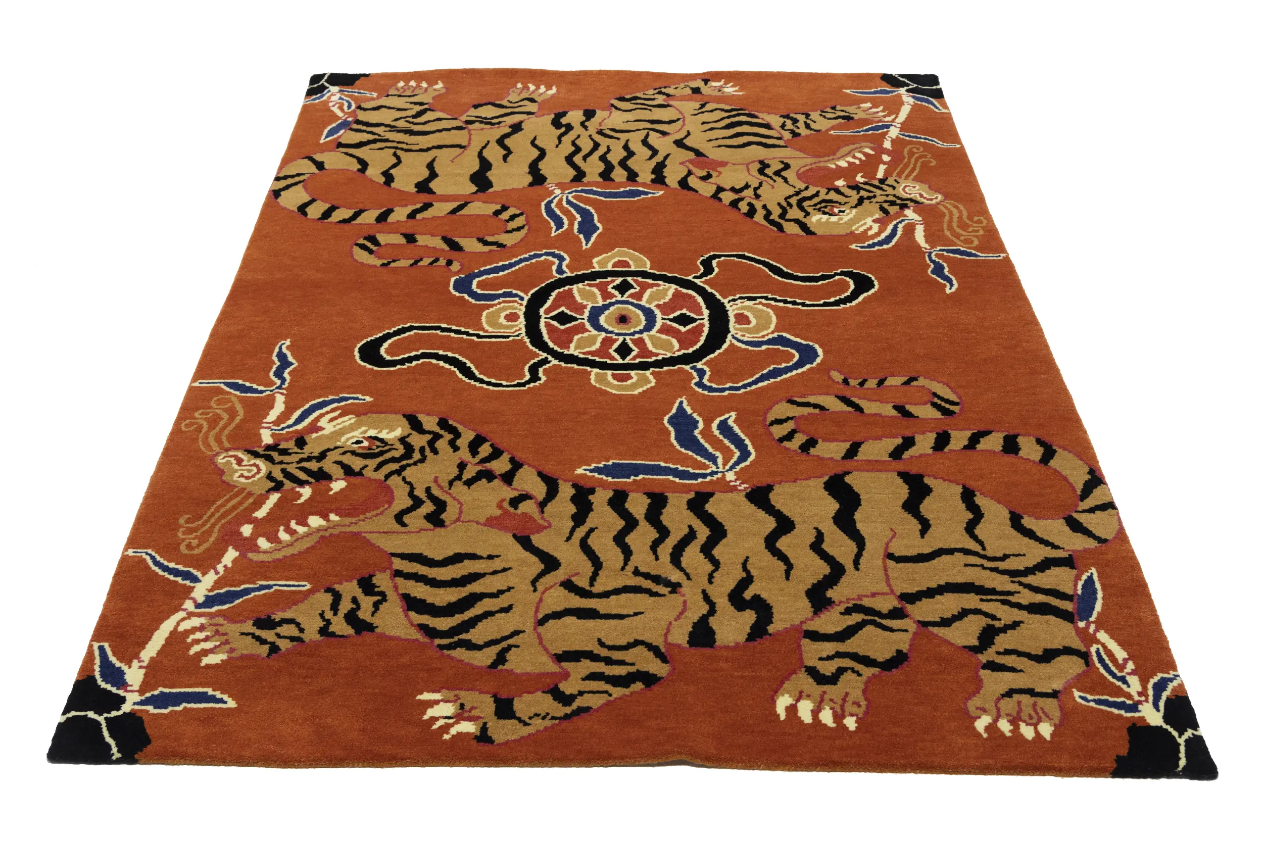 This authentic 5X7 orange new Oriental rug was crafted by the hands of skilled weavers enthused by a variety of lovely artistic designs, to recreate the aged look of the unique piece with a richness of color and beautifully elaborated background field. What set this vintage style Oriental area rug from the others are the material and dye used (wool pile and cotton foundation), knot count, ancient designs, fantastic grades, and its regional historical connection: it has deep roots, from the story of the people who produced it to the meaning of the symbols and colors displayed across its canvas that have been praised for centuries. This Indian home décor carpet will be completely cozy and inviting that never will go out of style! Also, this Oriental rug would be among your most valuable treasures, it is a great investment that increase in value over time, and it will last for generations because was woven with high-quality, all-natural wool. Environmentally friendly, opulent yet affordable; this rug will give you a thorough amount of character to help define your living space with sophistication and warmth that will capture the eyes and attention of your audience (homeowners, designers, decorators, family and friends).