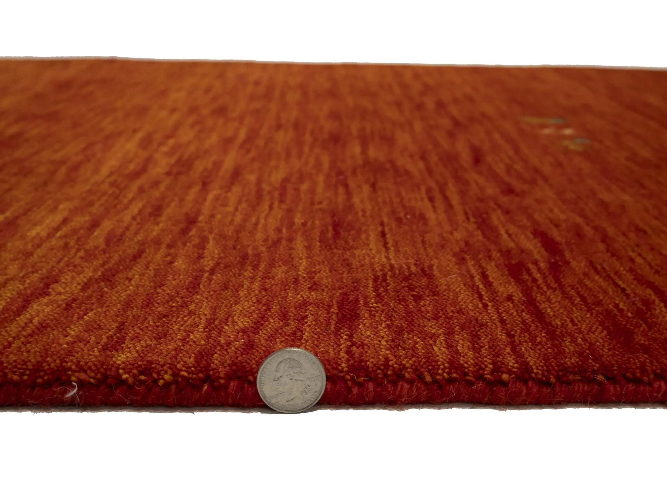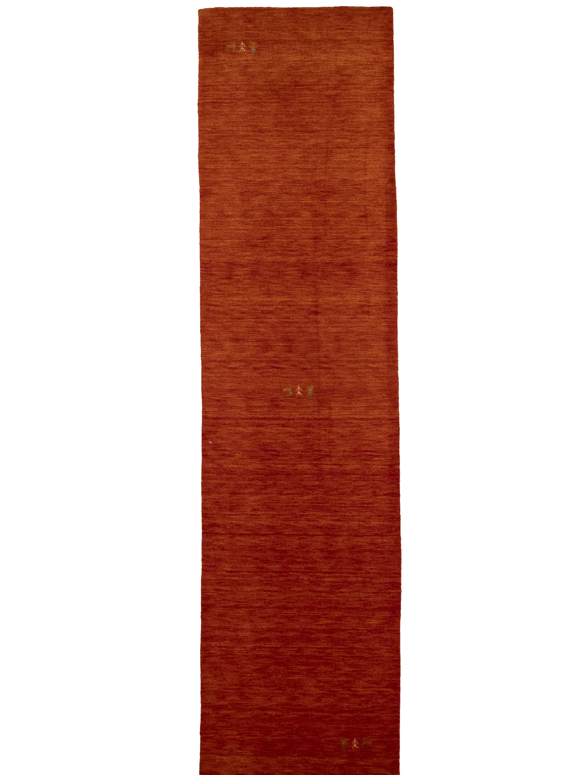 This hand-loomed 3X10 Orange-red Oriental Runner rug from India features a modern, Solid design that seamlessly integrates traditional craftsmanship with contemporary style, showcasing a striking Brown primary color. It provides a luxuriant softness and durability underfoot, as it is constructed from premium wool with a cotton foundation. The rug is optimized for high-traffic areas due to its medium pile height and knot density of 100 knots per square inch, which ensures durability and comfort. This rug, which is in exceptional condition and was recently manufactured, is an ideal complement to any contemporary setting, providing both versatility and timeless elegance.