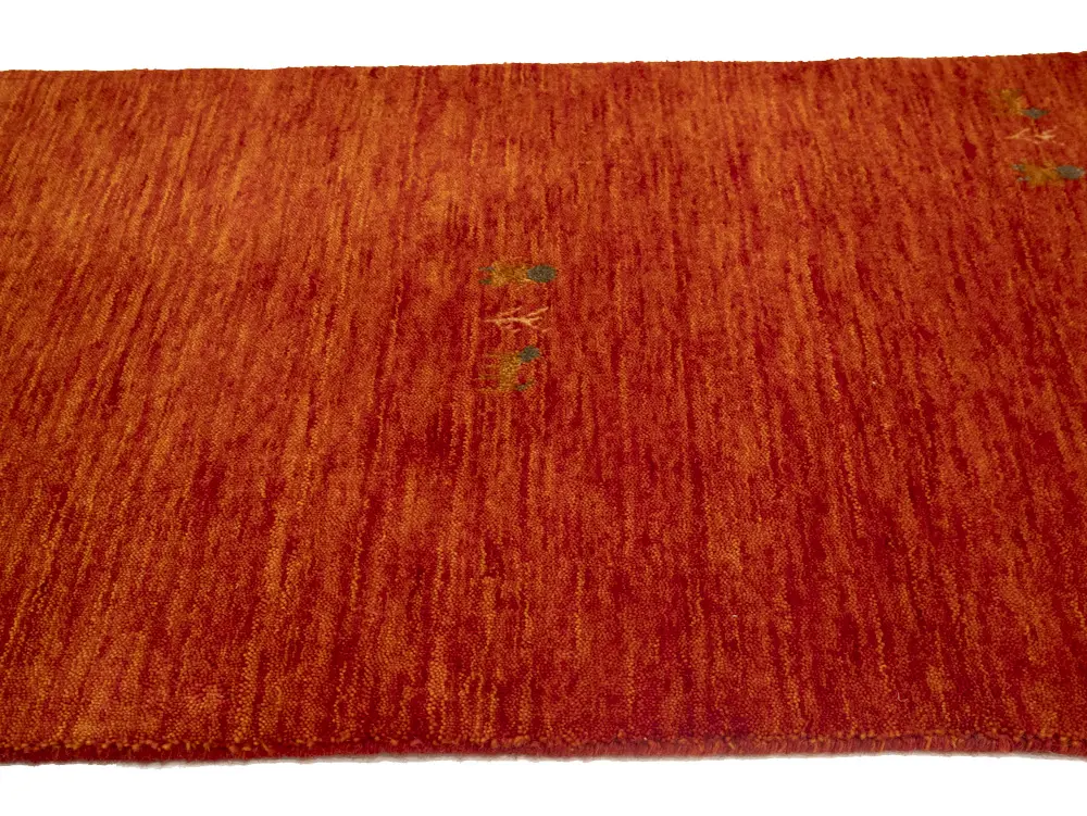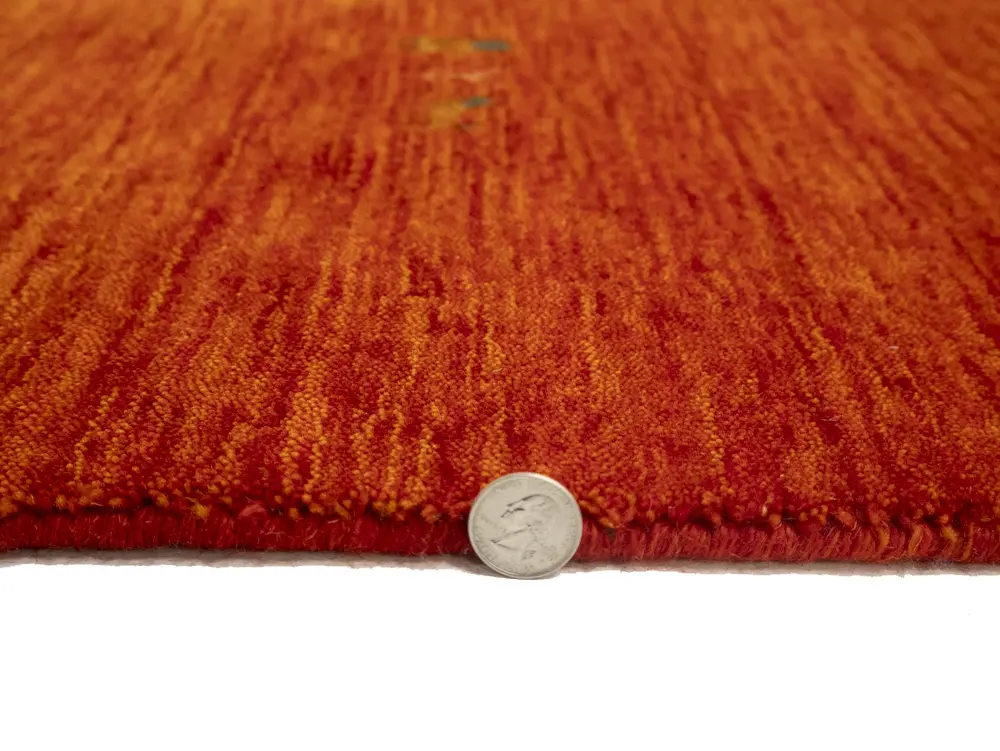This hand-loomed Oriental rug from India features a modern, Pictorial design that seamlessly integrates traditional craftsmanship with contemporary style, showcasing a striking Orange-red primary color. It provides a luxuriant softness and durability underfoot, as it is constructed from premium wool with a cotton foundation. The rug is optimized for high-traffic areas due to its medium pile height and knot density of 100 knots per square inch, which ensures durability and comfort. This rug, which is in exceptional condition and was recently manufactured, is an ideal complement to any contemporary setting, providing both versatility and timeless elegance.