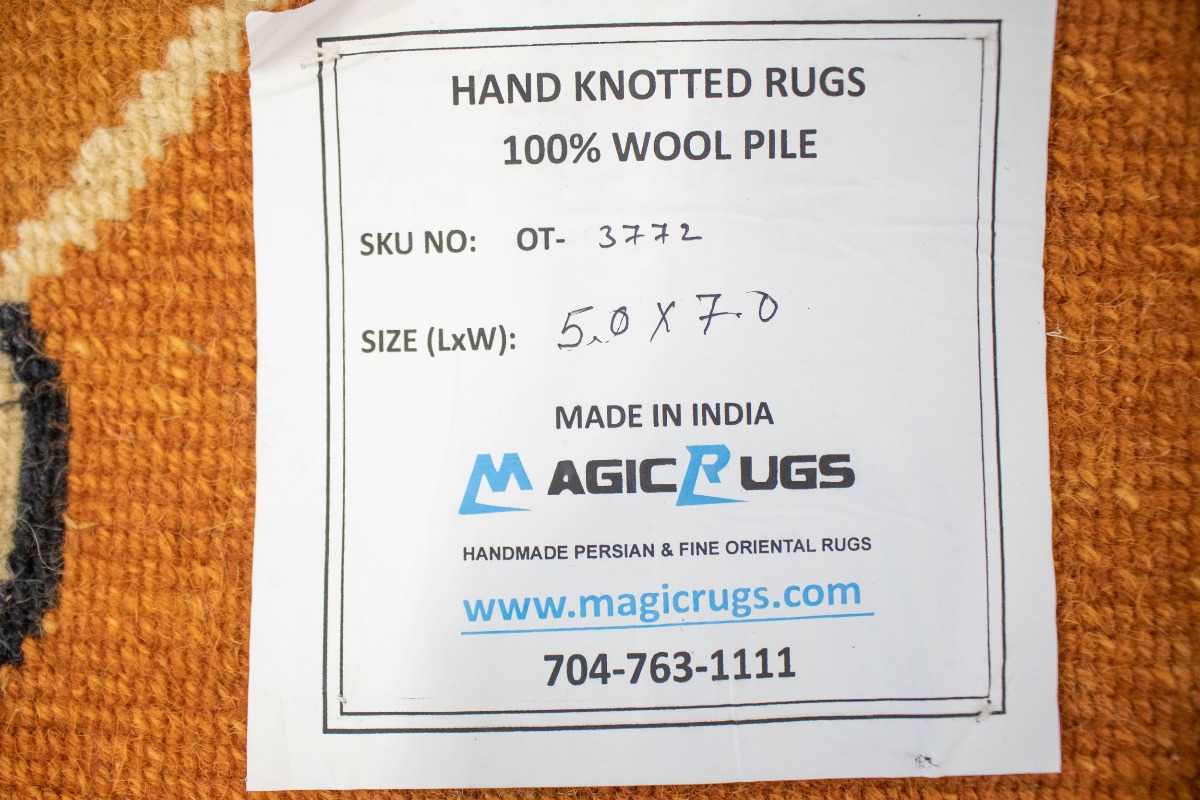 Handmade 5X7 orange Oriental rug made with natural dyes (fine wool pile and cotton foundation), superior knot count, and appealing ancient designs. This Oriental rug never will go out of style and would be among your most valuable treasures.