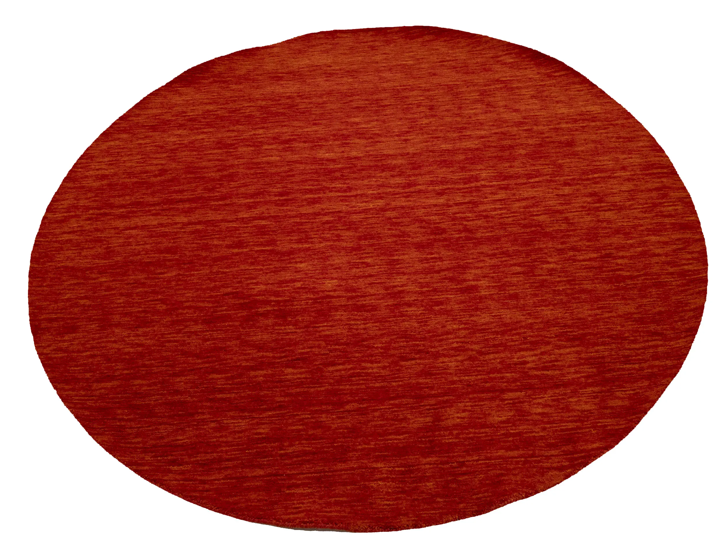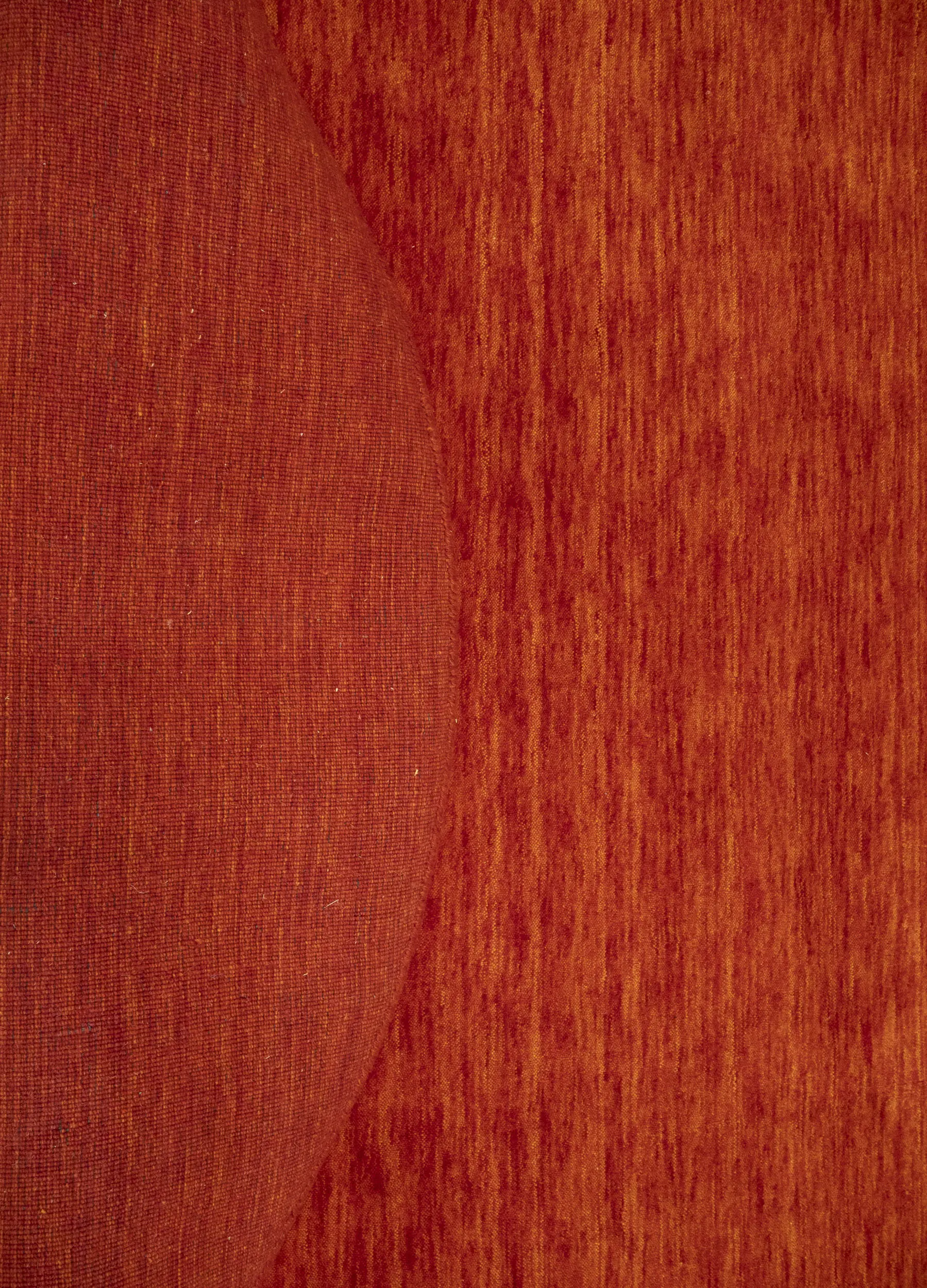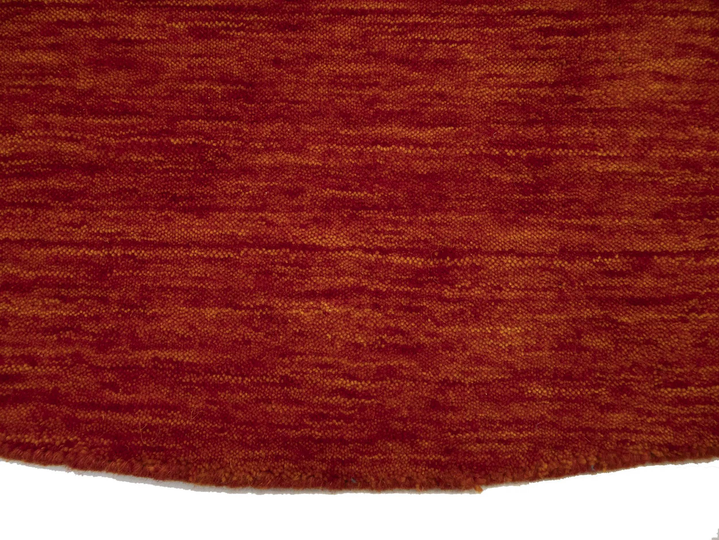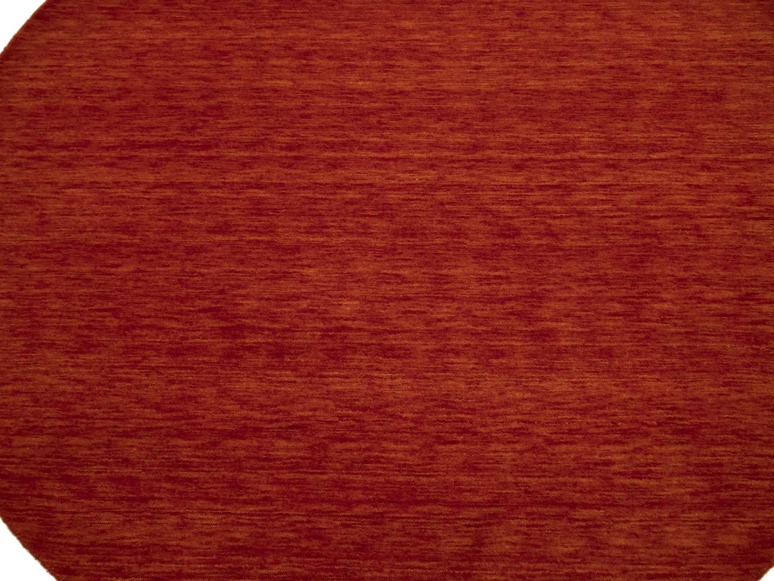 This hand-loomed 6X6 Orange Red Oriental rug from India features a modern, Solid design that seamlessly integrates traditional craftsmanship with contemporary style, showcasing a striking Orange Red primary color. It provides a luxuriant softness and durability underfoot, as it is constructed from premium wool with a cotton foundation. The rug is optimized for high-traffic areas due to its medium pile height and knot density of 100 knots per square inch, which ensures durability and comfort. This rug, which is in exceptional condition and was recently manufactured, is an ideal complement to any contemporary setting, providing both versatility and timeless elegance.