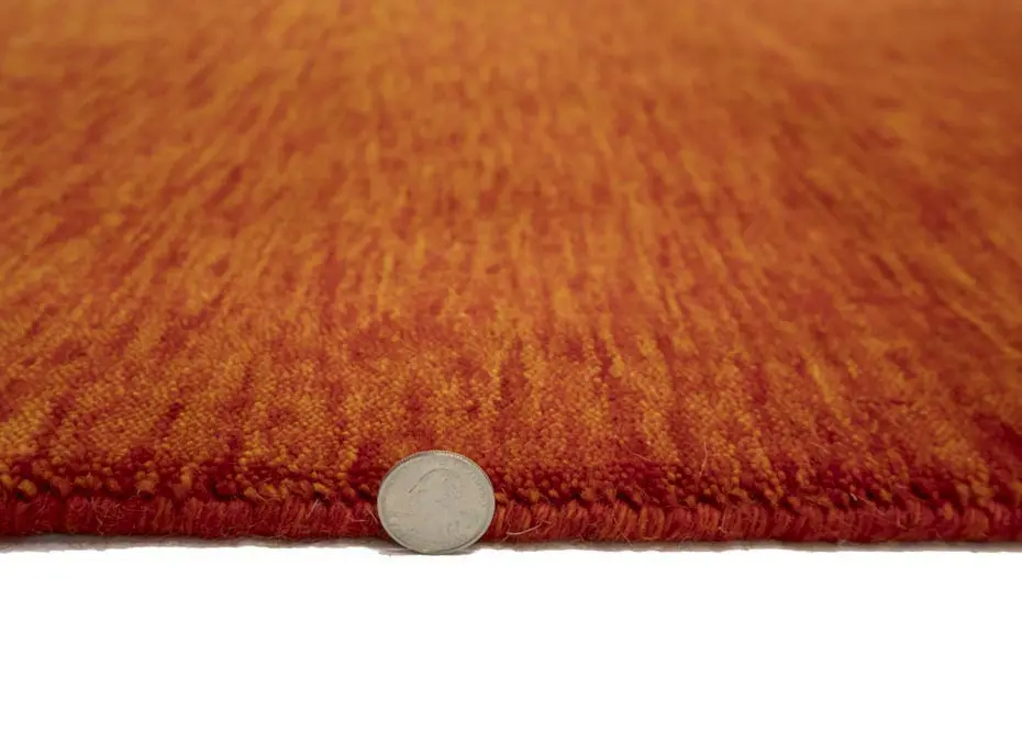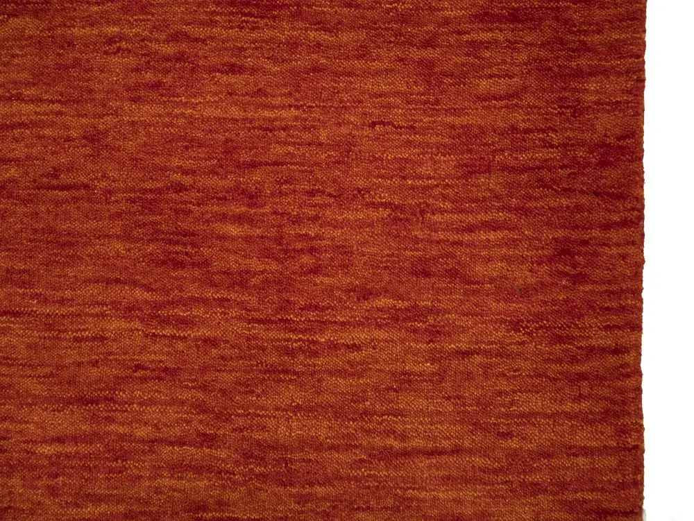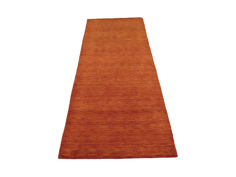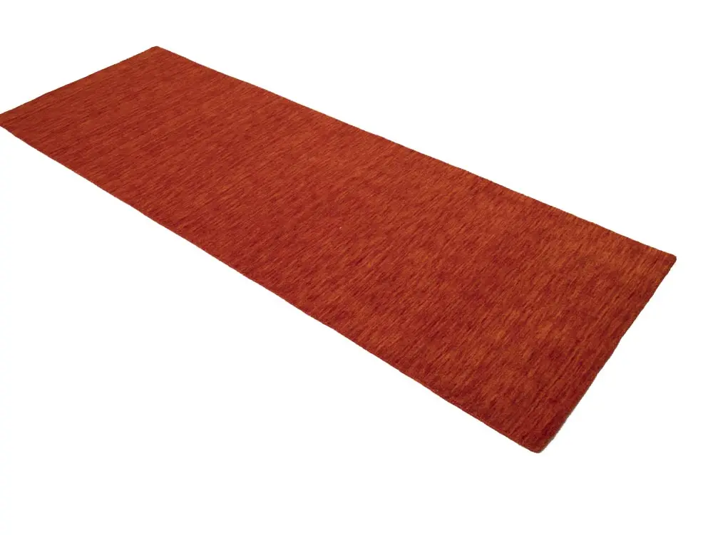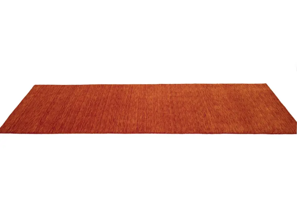 This hand-loomed 3X8 Orange Red Oriental rug from India features a modern, Solid design that seamlessly integrates traditional craftsmanship with contemporary style, showcasing a striking Orange Red primary color. It provides a luxuriant softness and durability underfoot, as it is constructed from premium wool with a cotton foundation. The rug is optimized for high-traffic areas due to its medium pile height and knot density of 100 knots per square inch, which ensures durability and comfort. This rug, which is in exceptional condition and was recently manufactured, is an ideal complement to any contemporary setting, providing both versatility and timeless elegance.