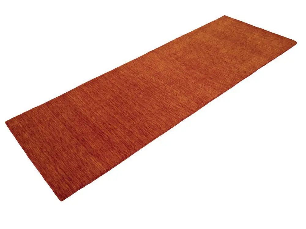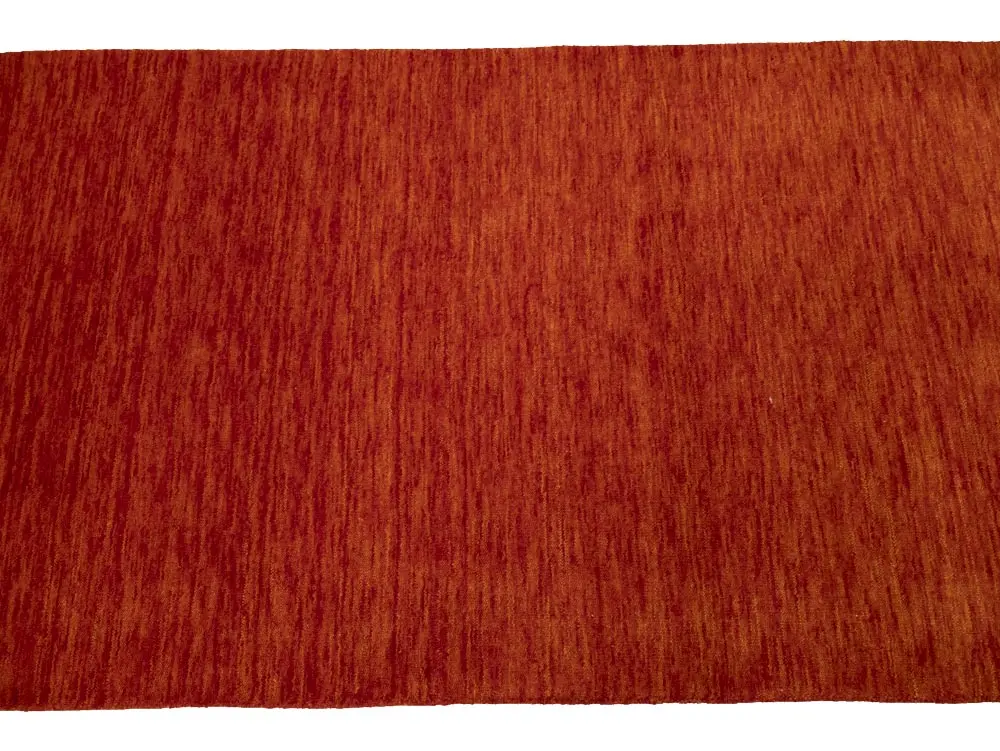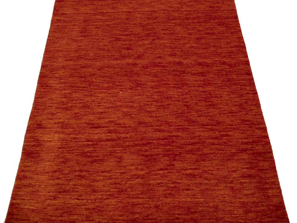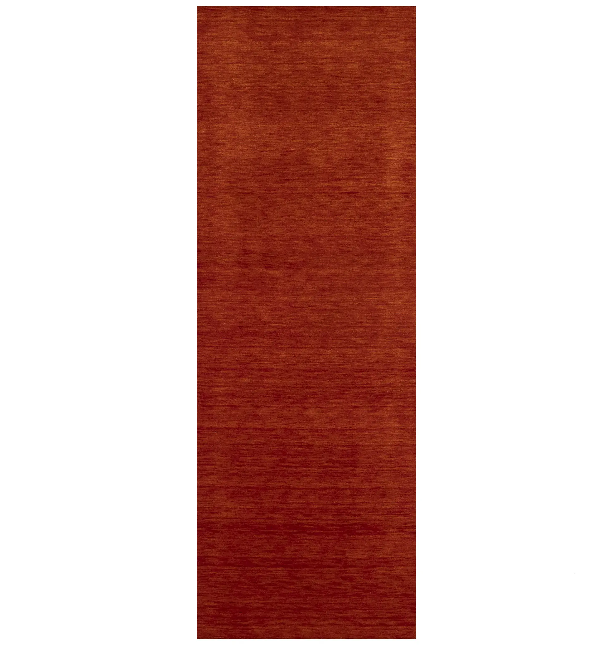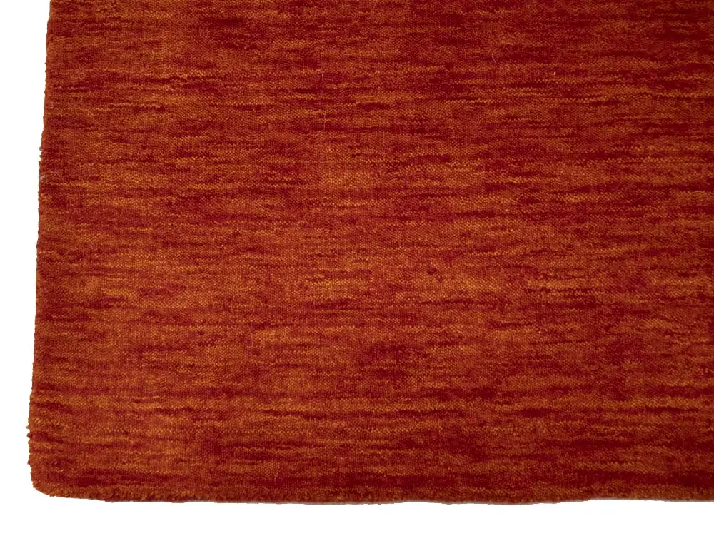 This hand-loomed 3X8 Orange Red Oriental rug from India features a modern, Solid design that seamlessly integrates traditional craftsmanship with contemporary style, showcasing a striking Orange Red primary color. It provides a luxuriant softness and durability underfoot, as it is constructed from premium wool with a cotton foundation. The rug is optimized for high-traffic areas due to its medium pile height and knot density of 100 knots per square inch, which ensures durability and comfort. This rug, which is in exceptional condition and was recently manufactured, is an ideal complement to any contemporary setting, providing both versatility and timeless elegance.