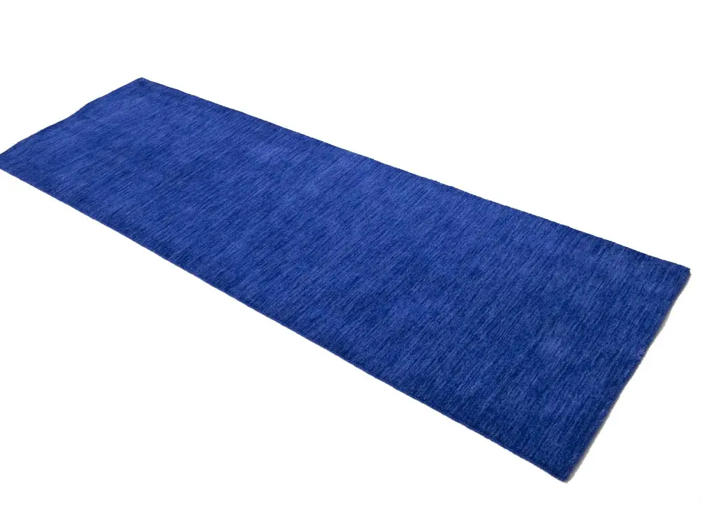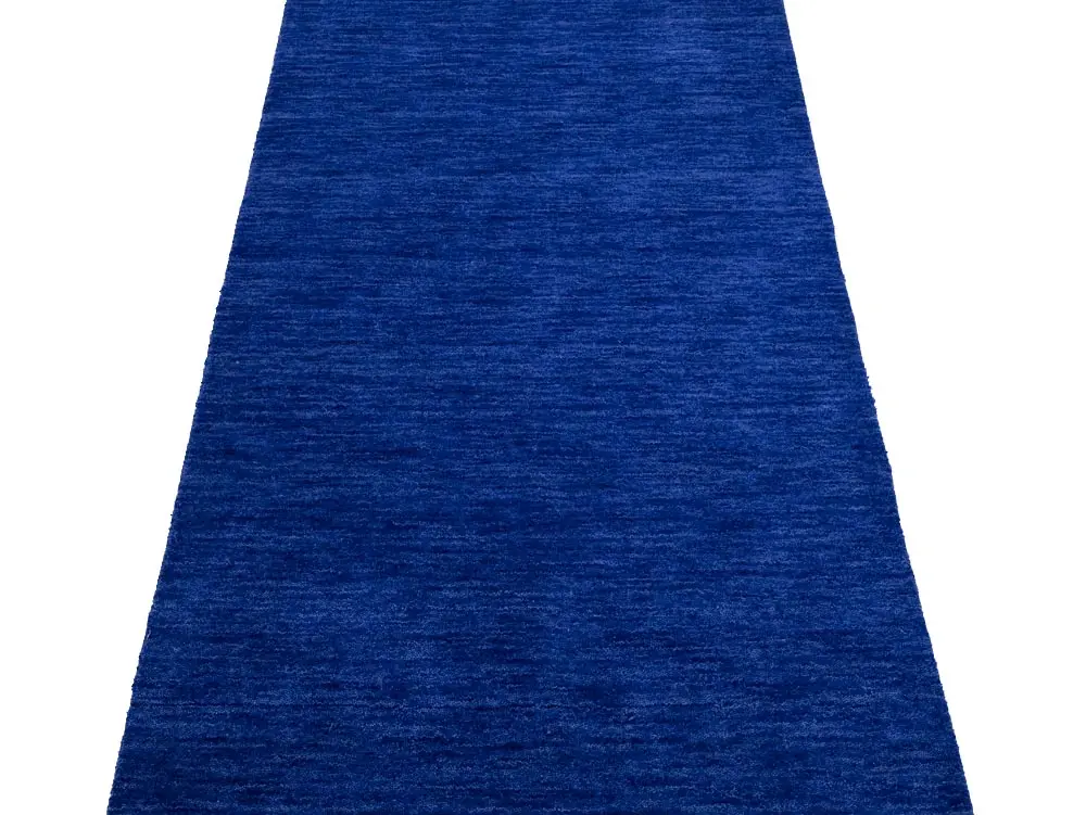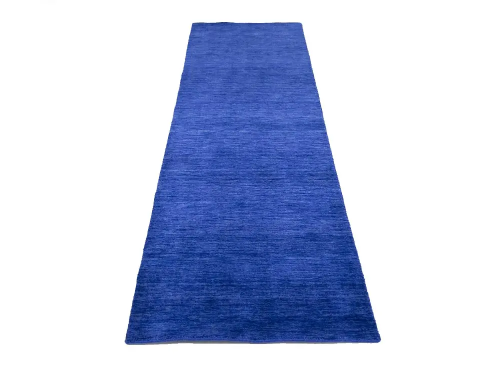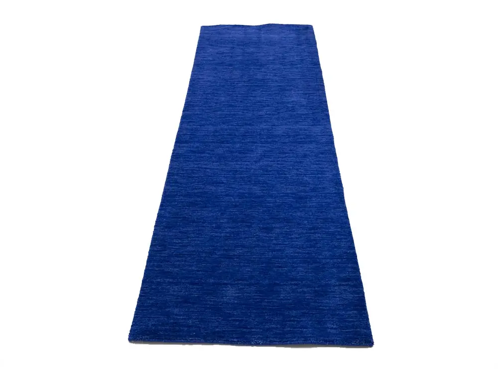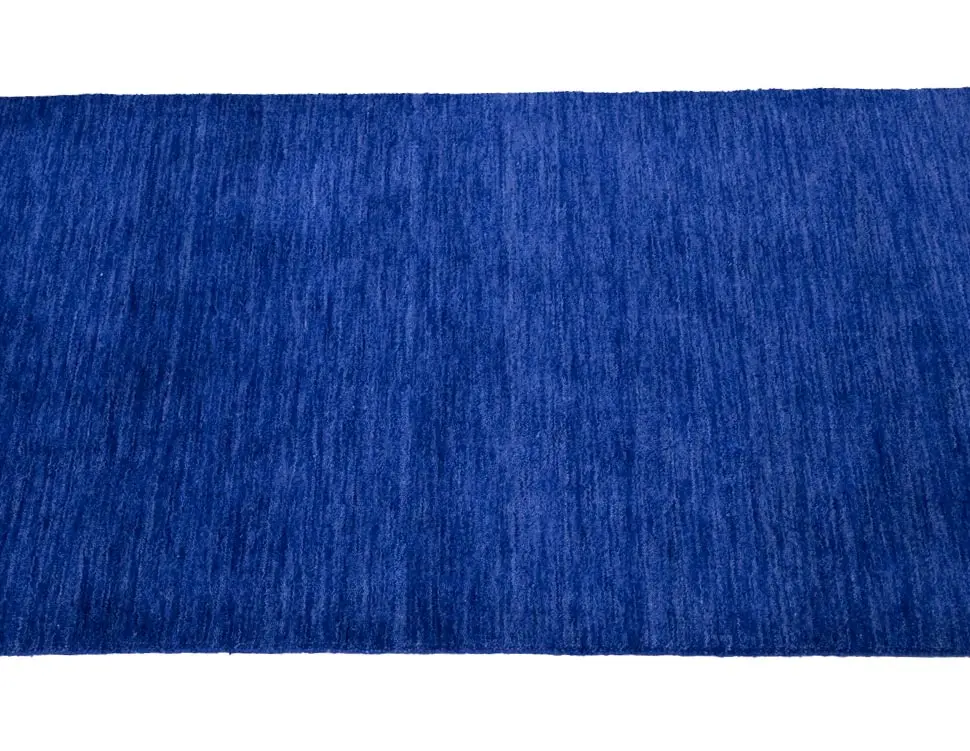 This hand-loomed 3X8 Royal Blue Oriental Runner rug from India features a modern, Solid design that seamlessly integrates traditional craftsmanship with contemporary style, showcasing a striking Royal Blue primary color. It provides a luxuriant softness and durability underfoot, as it is constructed from premium wool with a cotton foundation. The rug is optimized for high-traffic areas due to its medium pile height and knot density of 100 knots per square inch, which ensures durability and comfort. This rug, which is in exceptional condition and was recently manufactured, is an ideal complement to any contemporary setting, providing both versatility and timeless elegance.