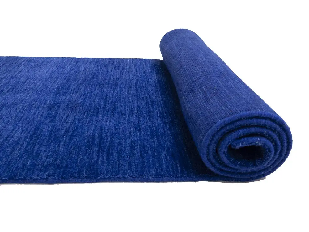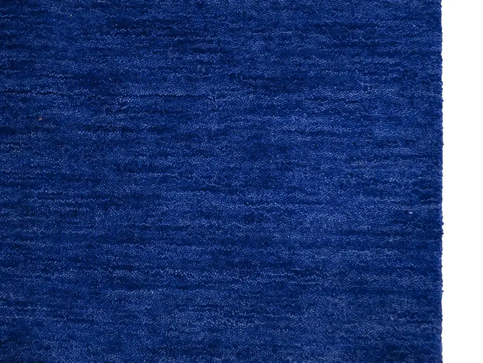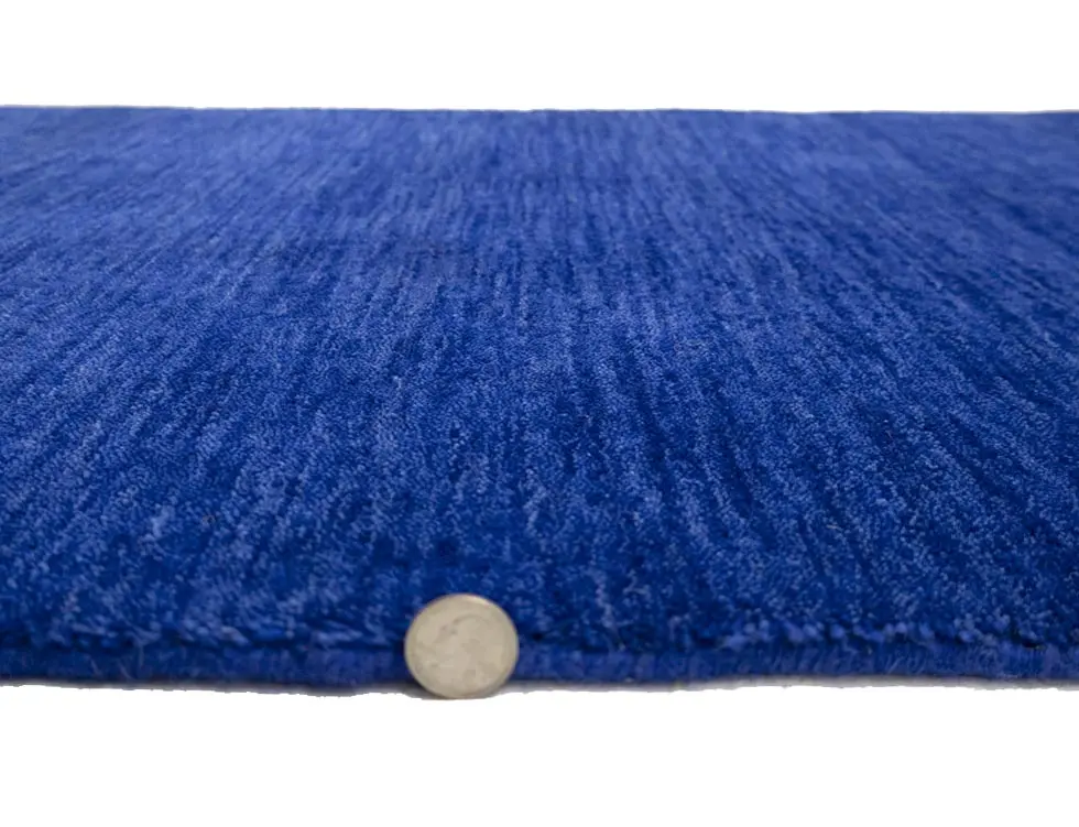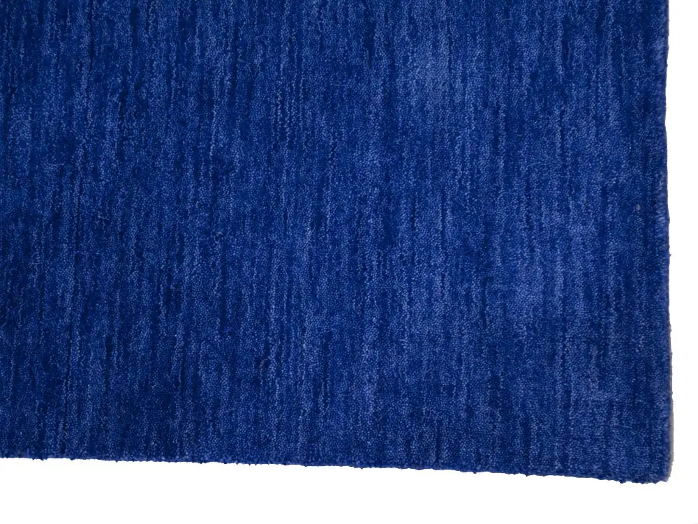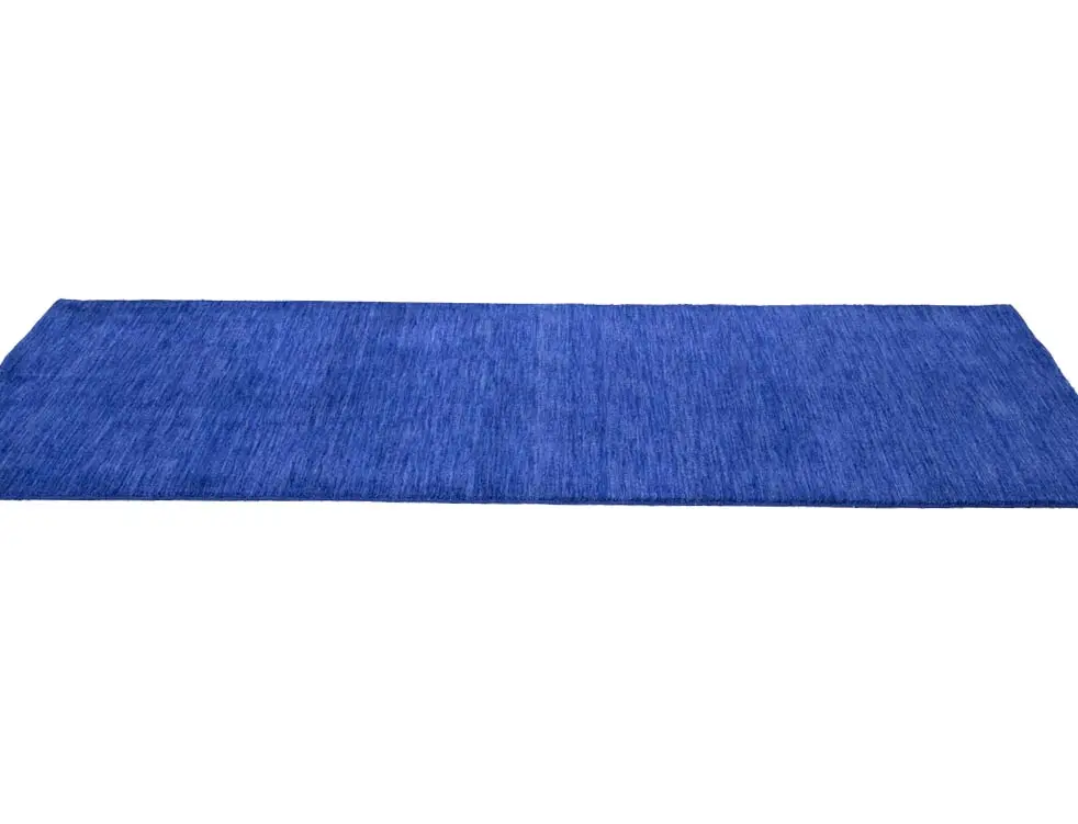 This hand-loomed 3X8 Royal Blue Oriental Runner rug from India features a modern, Solid design that seamlessly integrates traditional craftsmanship with contemporary style, showcasing a striking Royal Blue primary color. It provides a luxuriant softness and durability underfoot, as it is constructed from premium wool with a cotton foundation. The rug is optimized for high-traffic areas due to its medium pile height and knot density of 100 knots per square inch, which ensures durability and comfort. This rug, which is in exceptional condition and was recently manufactured, is an ideal complement to any contemporary setting, providing both versatility and timeless elegance.
