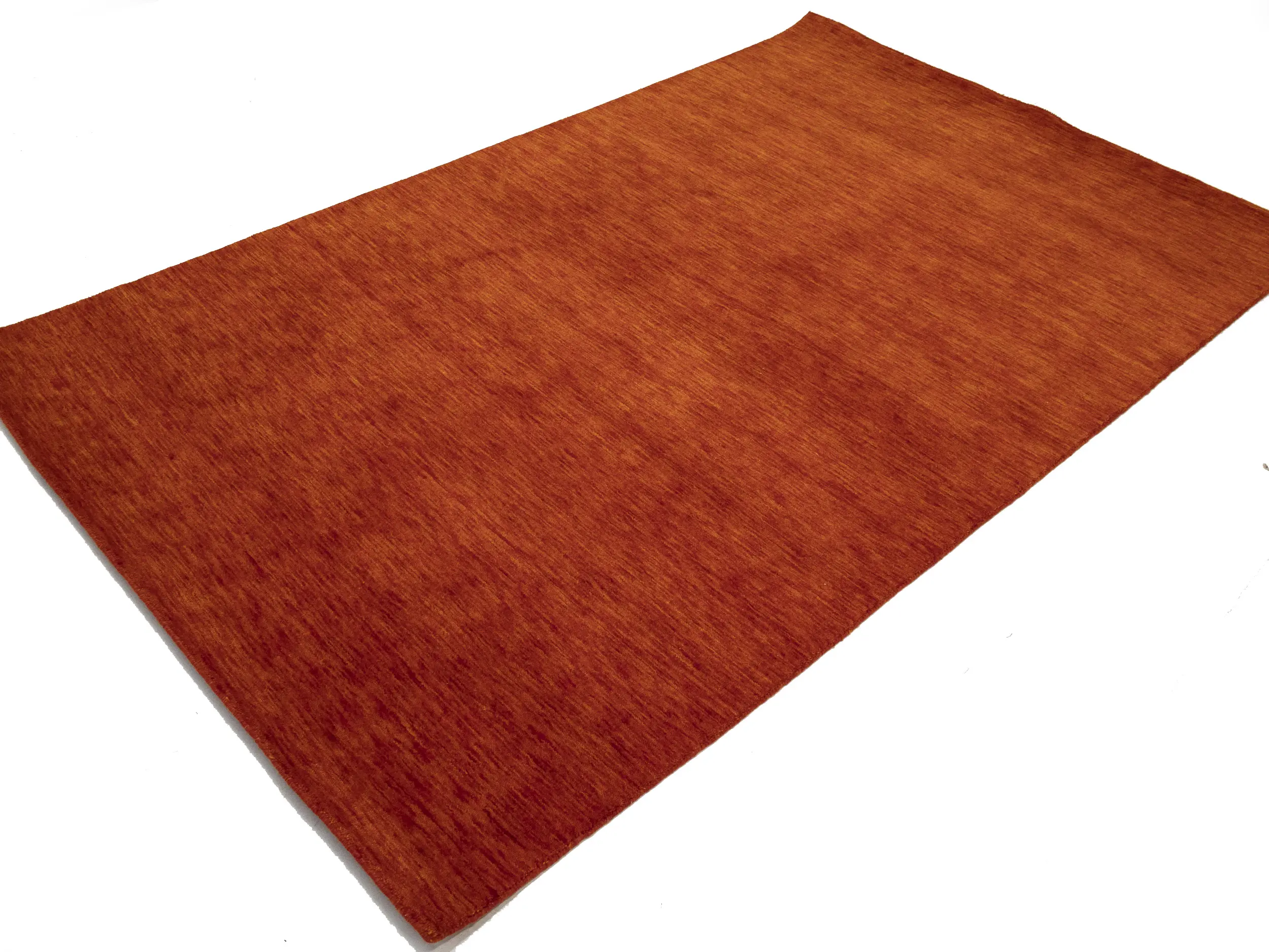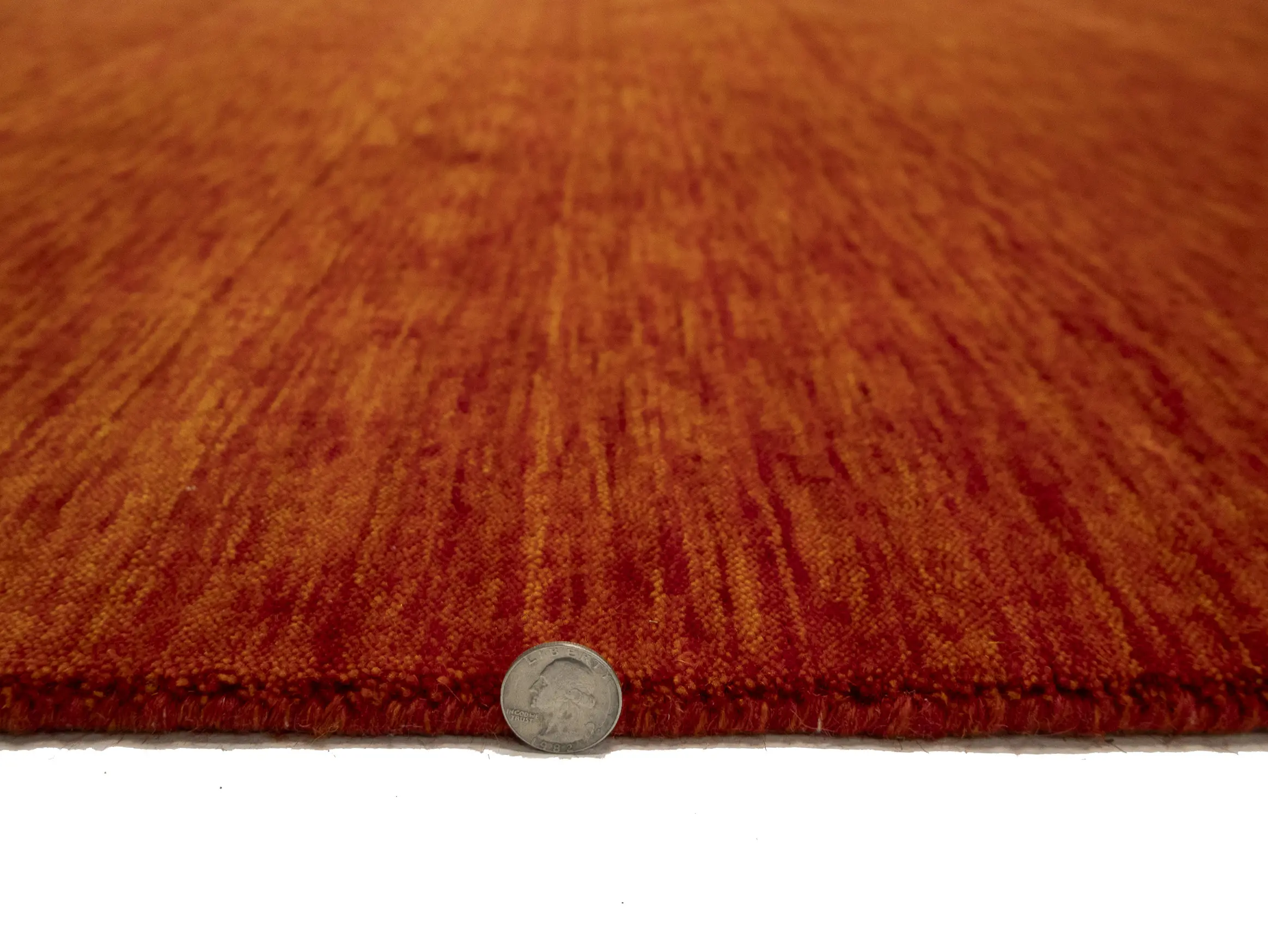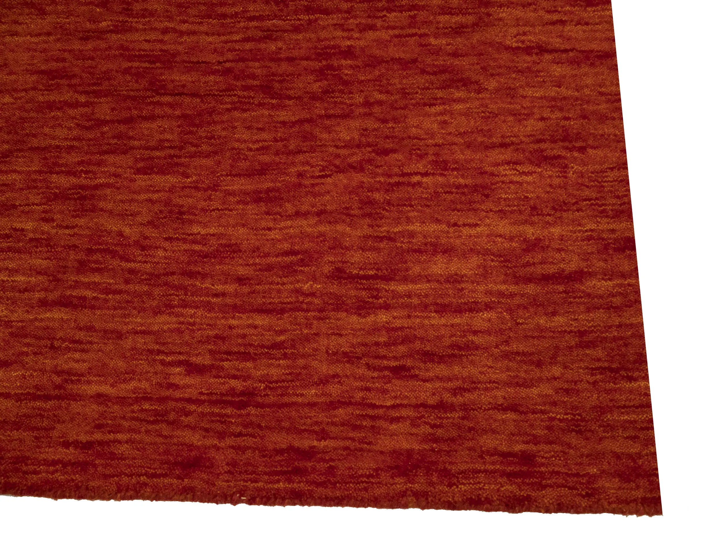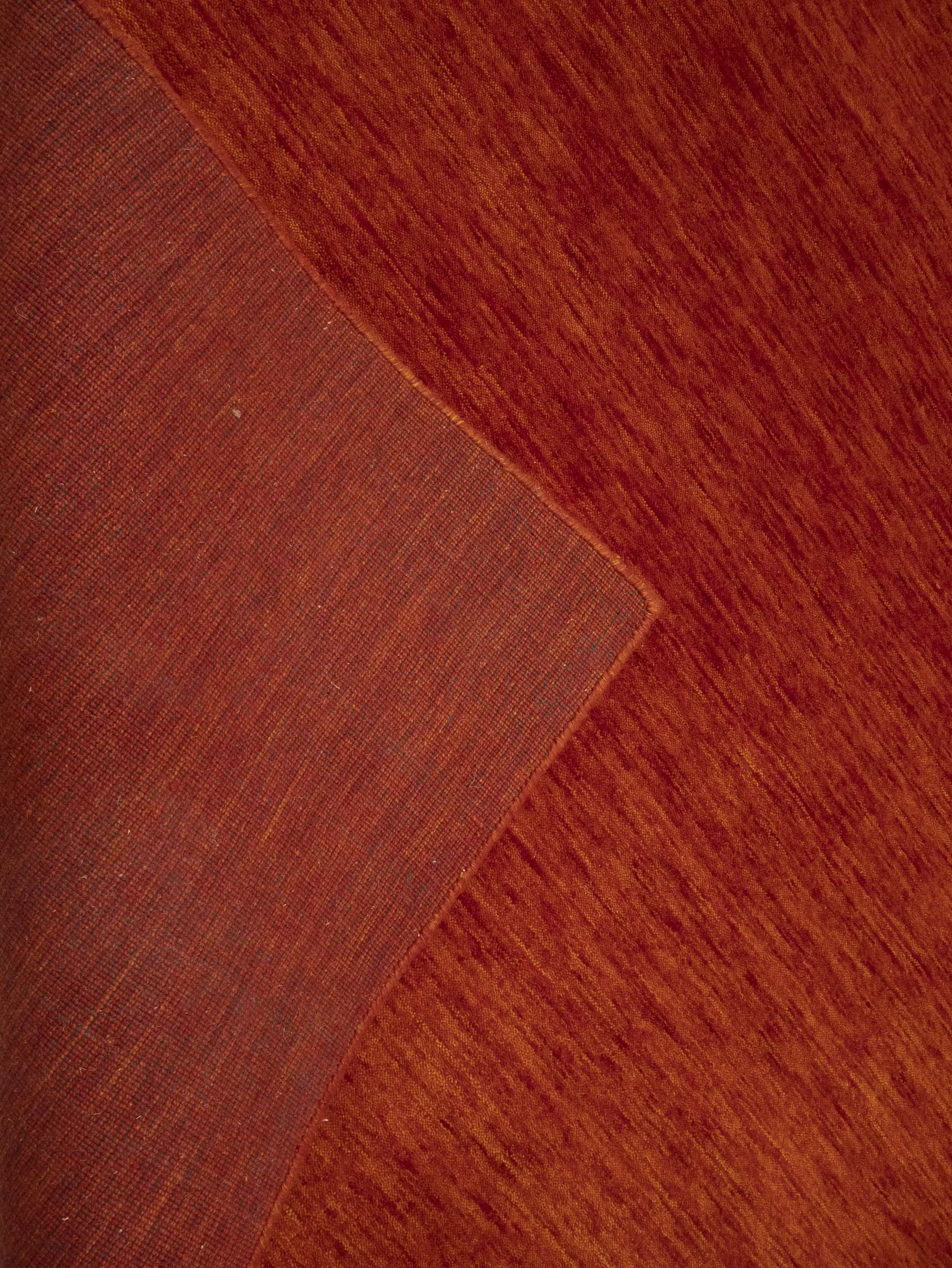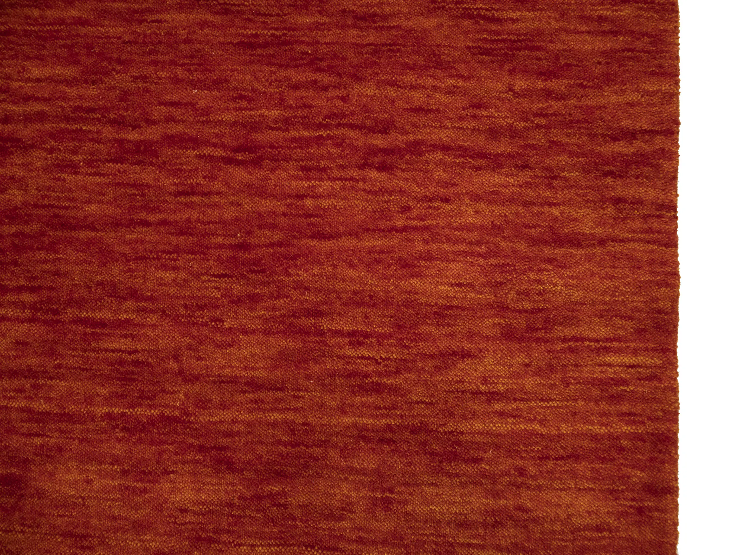 This hand-loomed 5X8 Orange Red Oriental rug from India features a modern, Solid design that seamlessly integrates traditional craftsmanship with contemporary style, showcasing a striking Orange Red primary color. It provides a luxuriant softness and durability underfoot, as it is constructed from premium wool with a cotton foundation. The rug is optimized for high-traffic areas due to its medium pile height and knot density of 100 knots per square inch, which ensures durability and comfort. This rug, which is in exceptional condition and was recently manufactured, is an ideal complement to any contemporary setting, providing both versatility and timeless elegance.