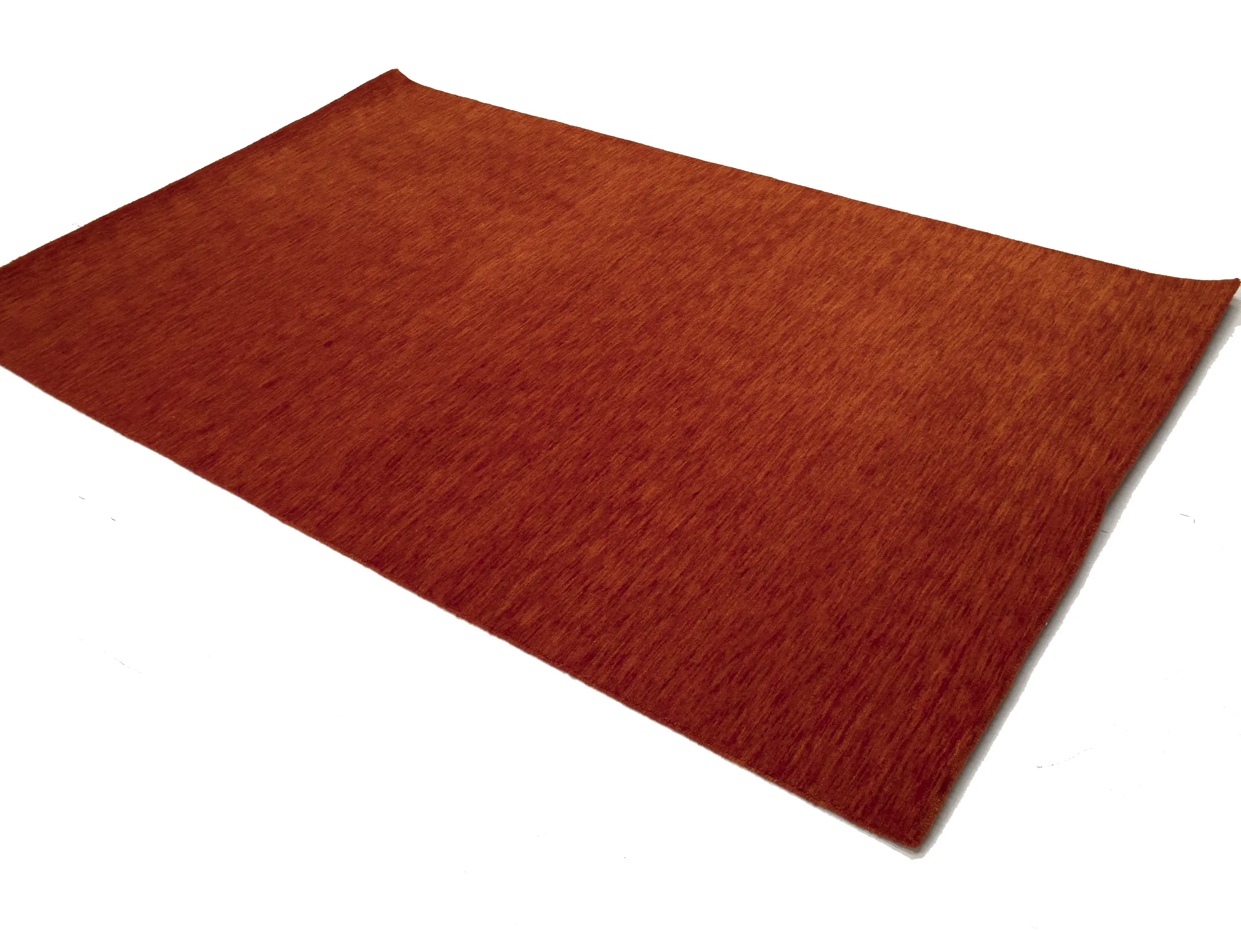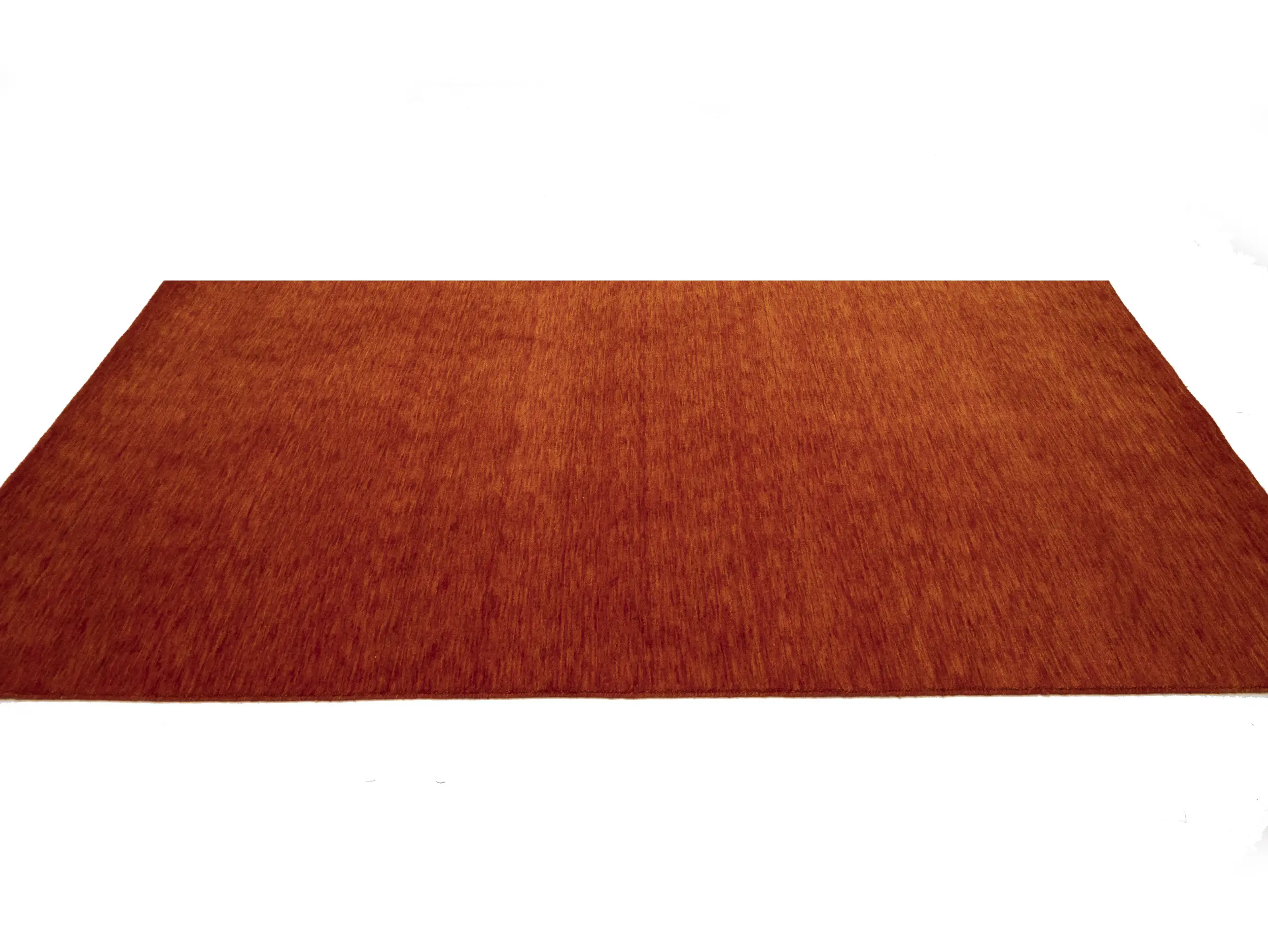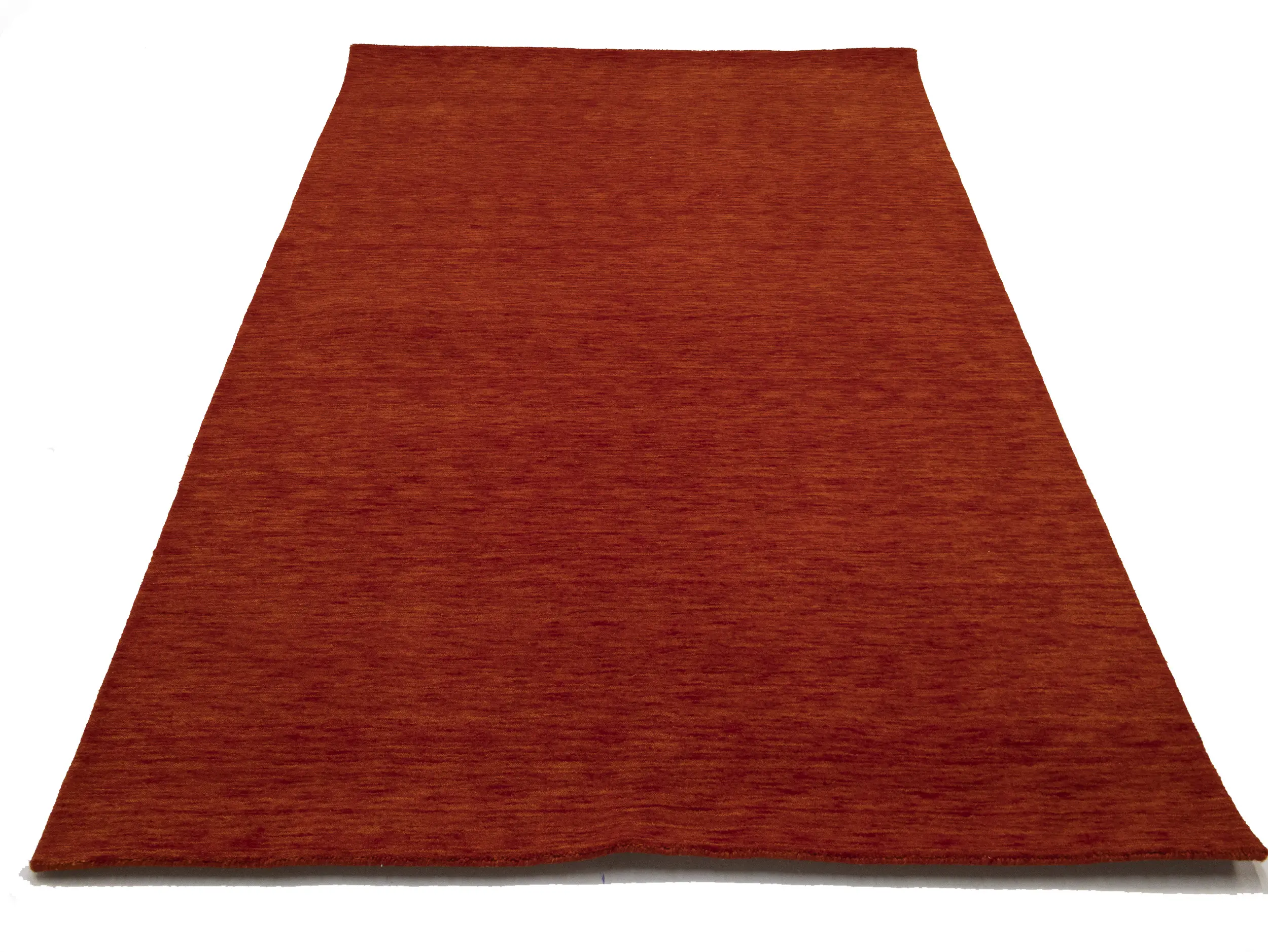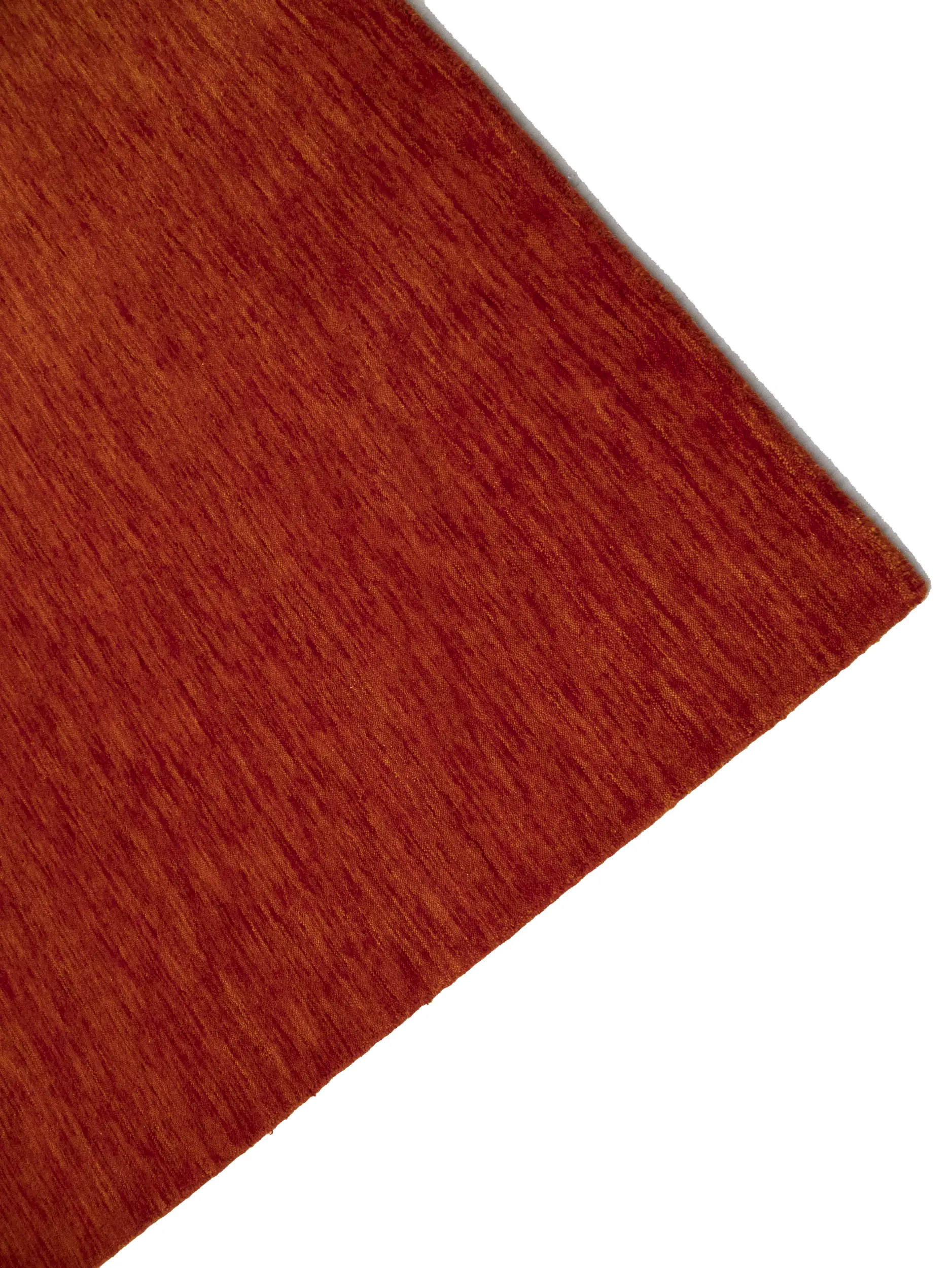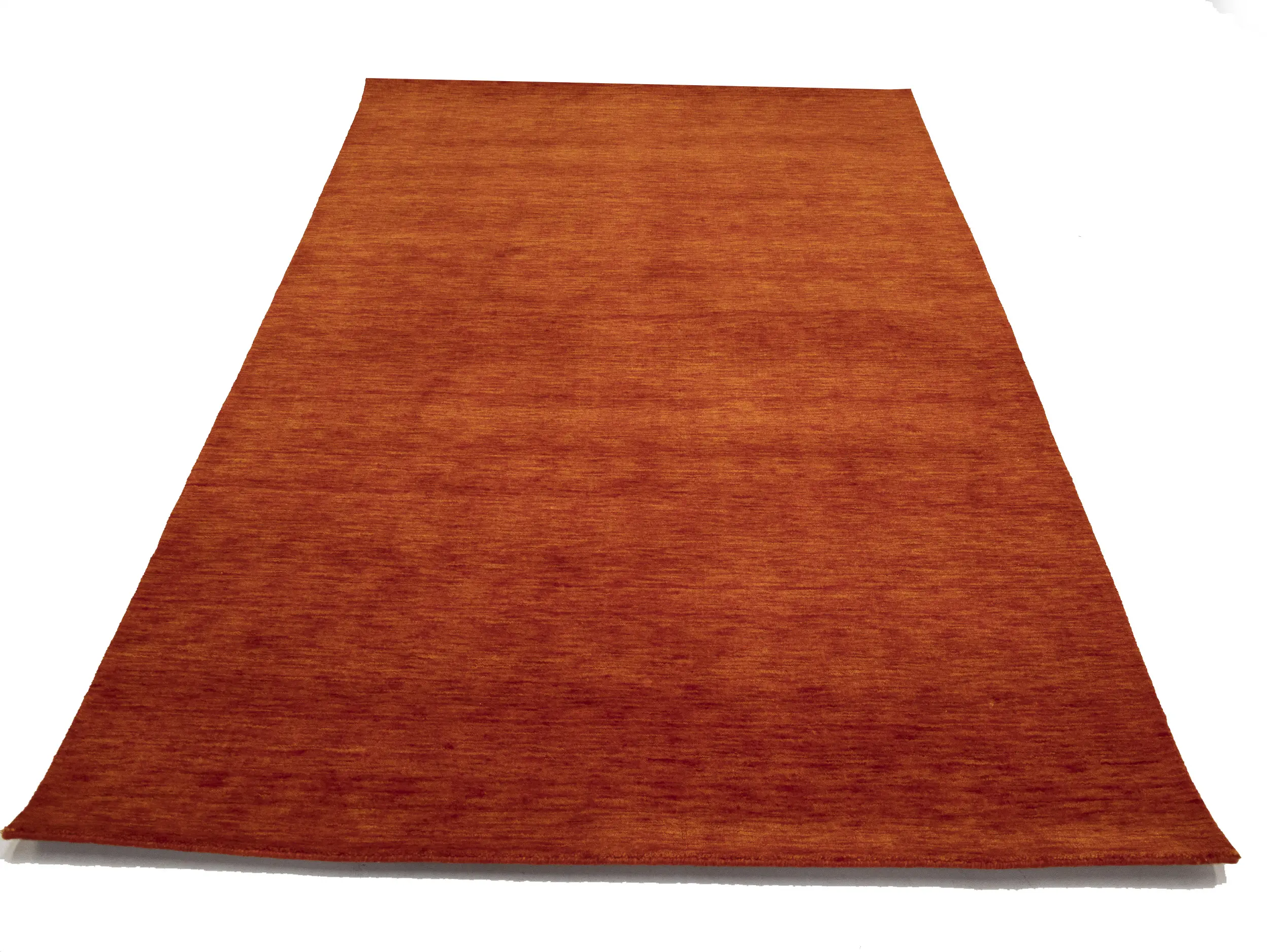 This hand-loomed 5X8 Orange Red Oriental rug from India features a modern, Solid design that seamlessly integrates traditional craftsmanship with contemporary style, showcasing a striking Orange Red primary color. It provides a luxuriant softness and durability underfoot, as it is constructed from premium wool with a cotton foundation. The rug is optimized for high-traffic areas due to its medium pile height and knot density of 100 knots per square inch, which ensures durability and comfort. This rug, which is in exceptional condition and was recently manufactured, is an ideal complement to any contemporary setting, providing both versatility and timeless elegance.