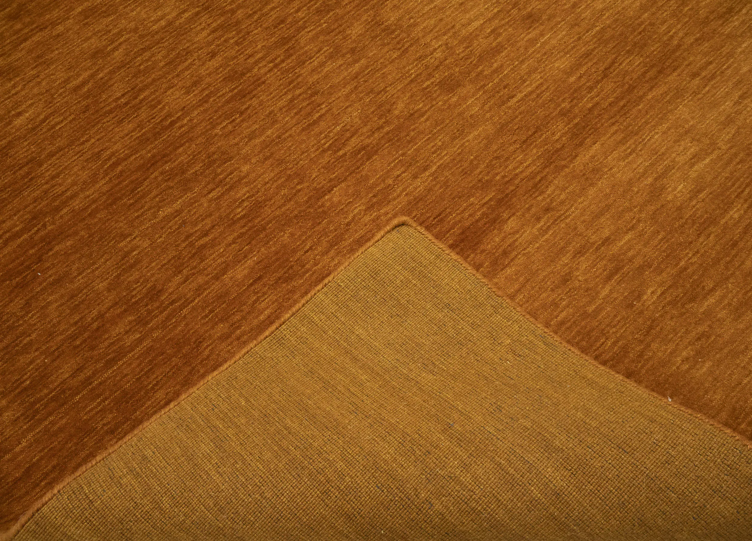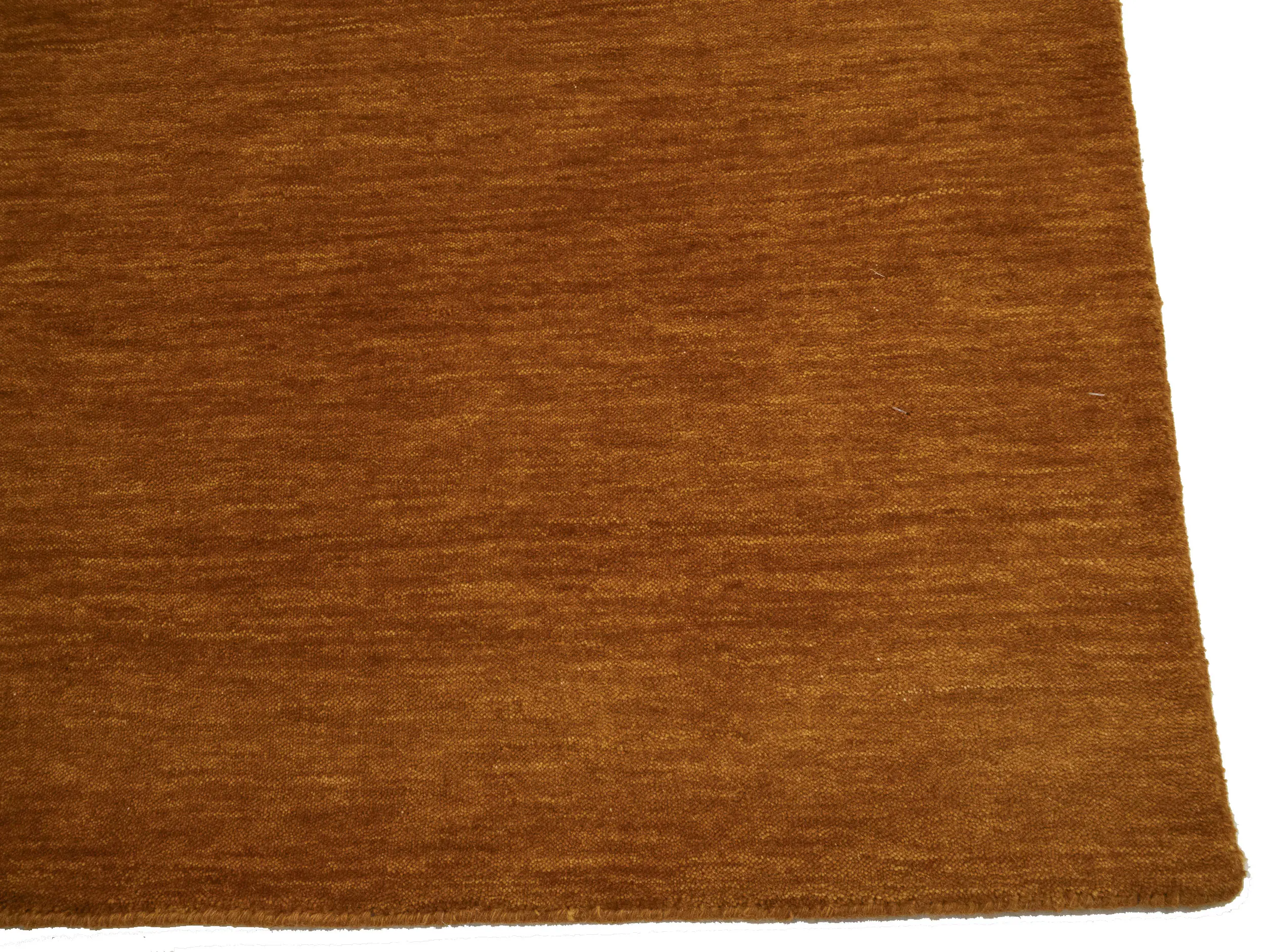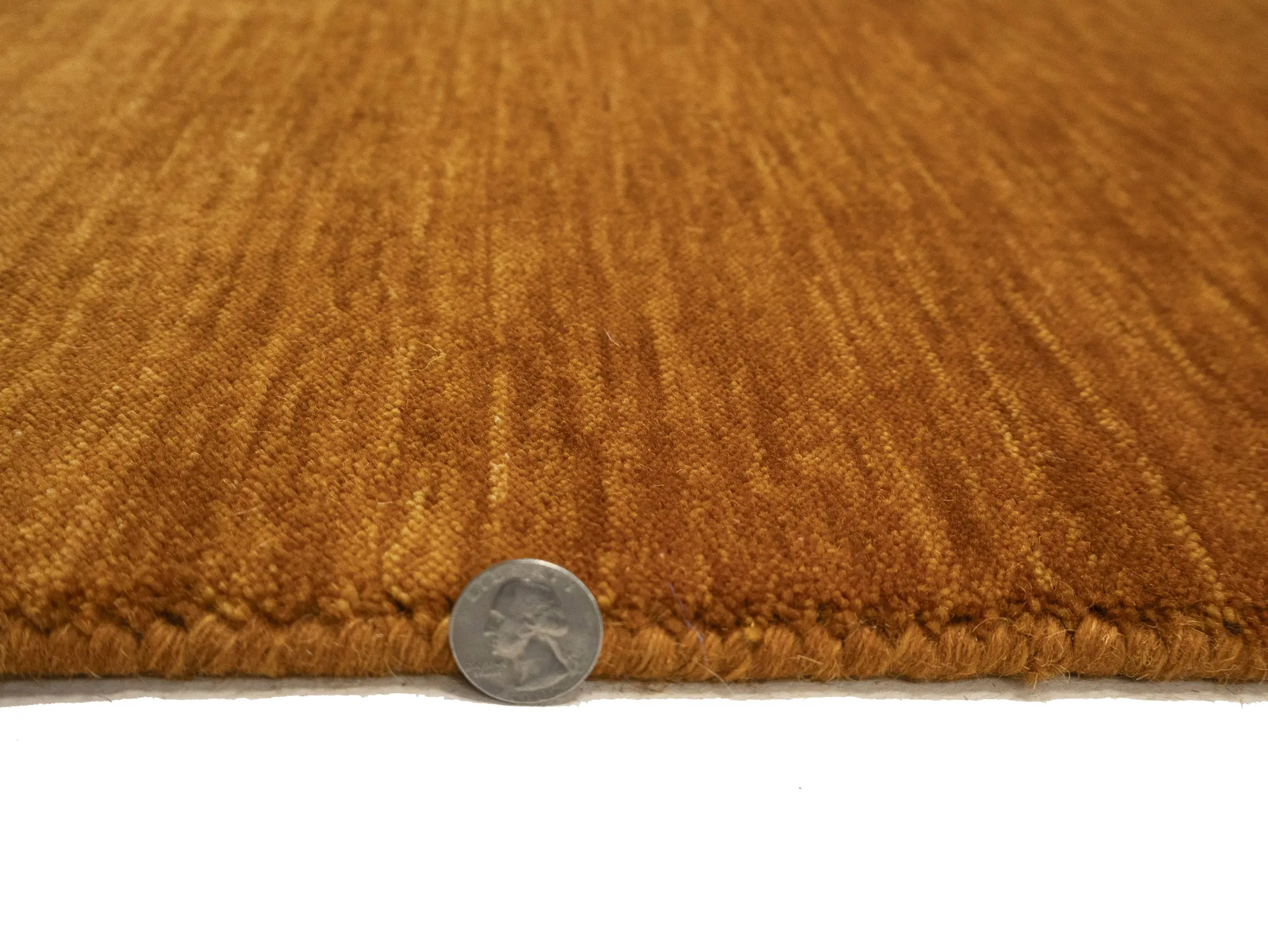 This hand-loomed 5X8 Orange Oriental rug from India features a modern, Solid design that seamlessly integrates traditional craftsmanship with contemporary style, showcasing a striking Orange primary color. It provides a luxuriant softness and durability underfoot, as it is constructed from premium wool with a cotton foundation. The rug is optimized for high-traffic areas due to its medium pile height and knot density of 100 knots per square inch, which ensures durability and comfort. This rug, which is in exceptional condition and was recently manufactured, is an ideal complement to any contemporary setting, providing both versatility and timeless elegance.