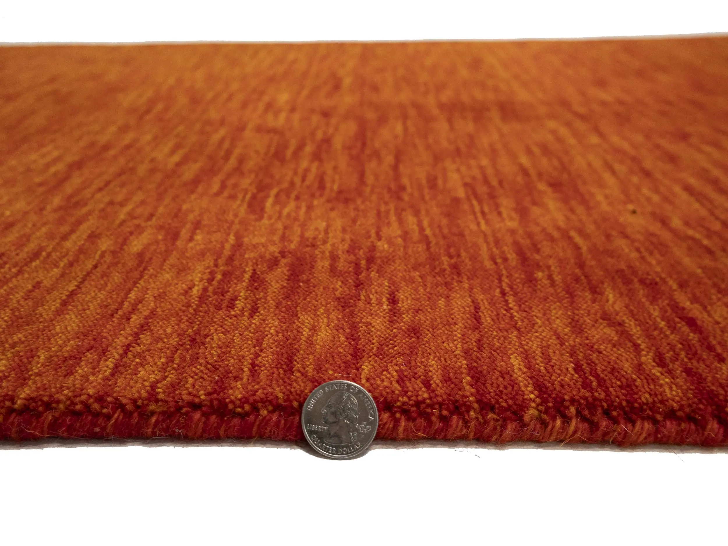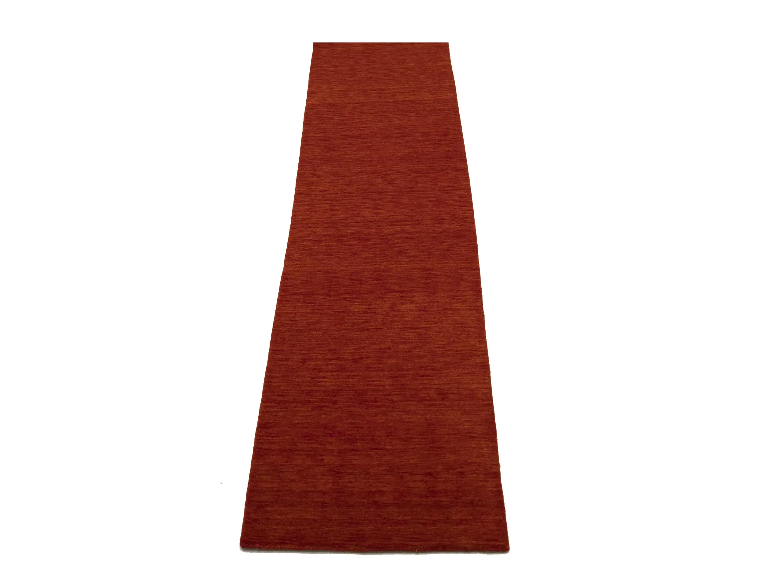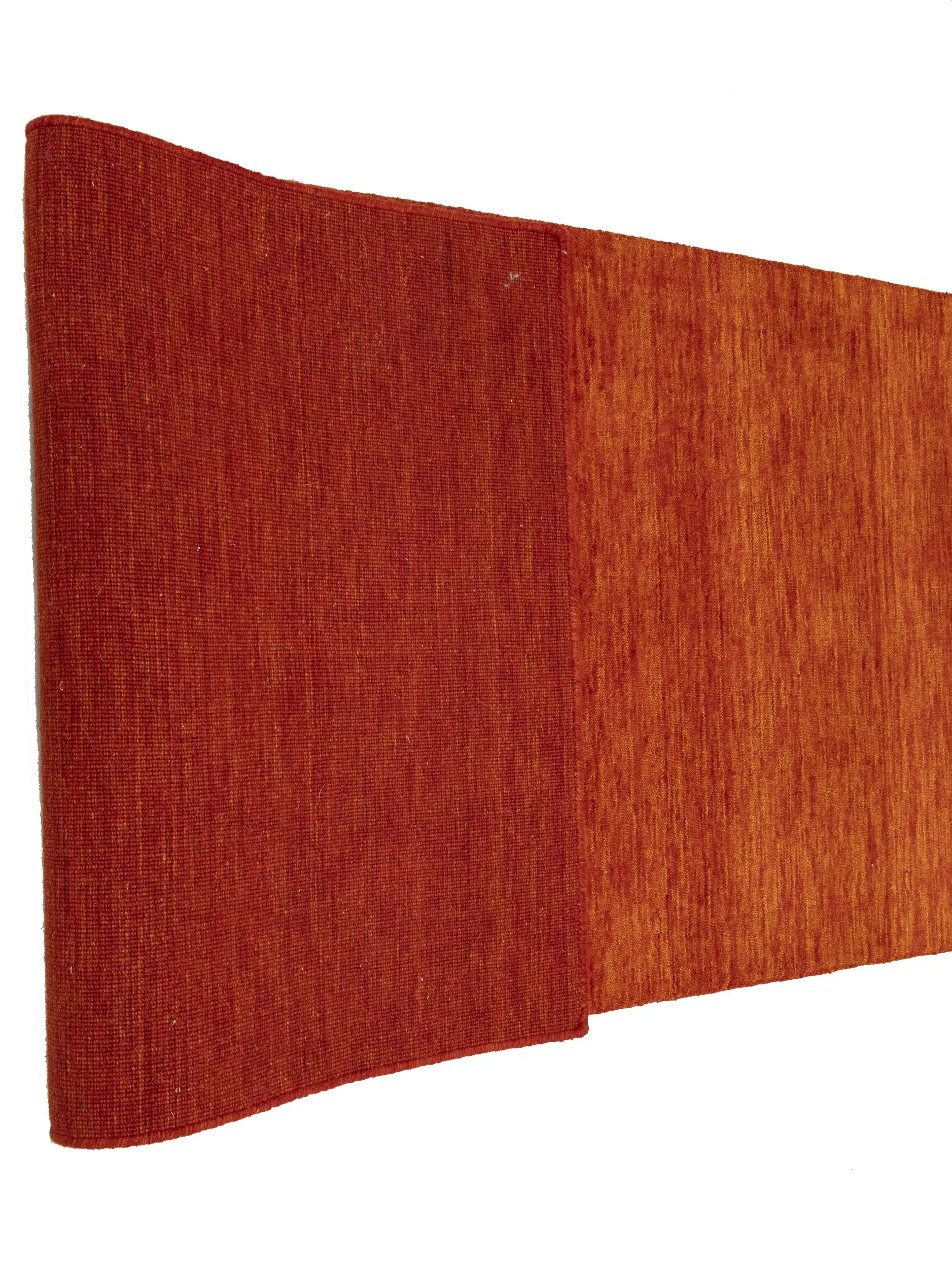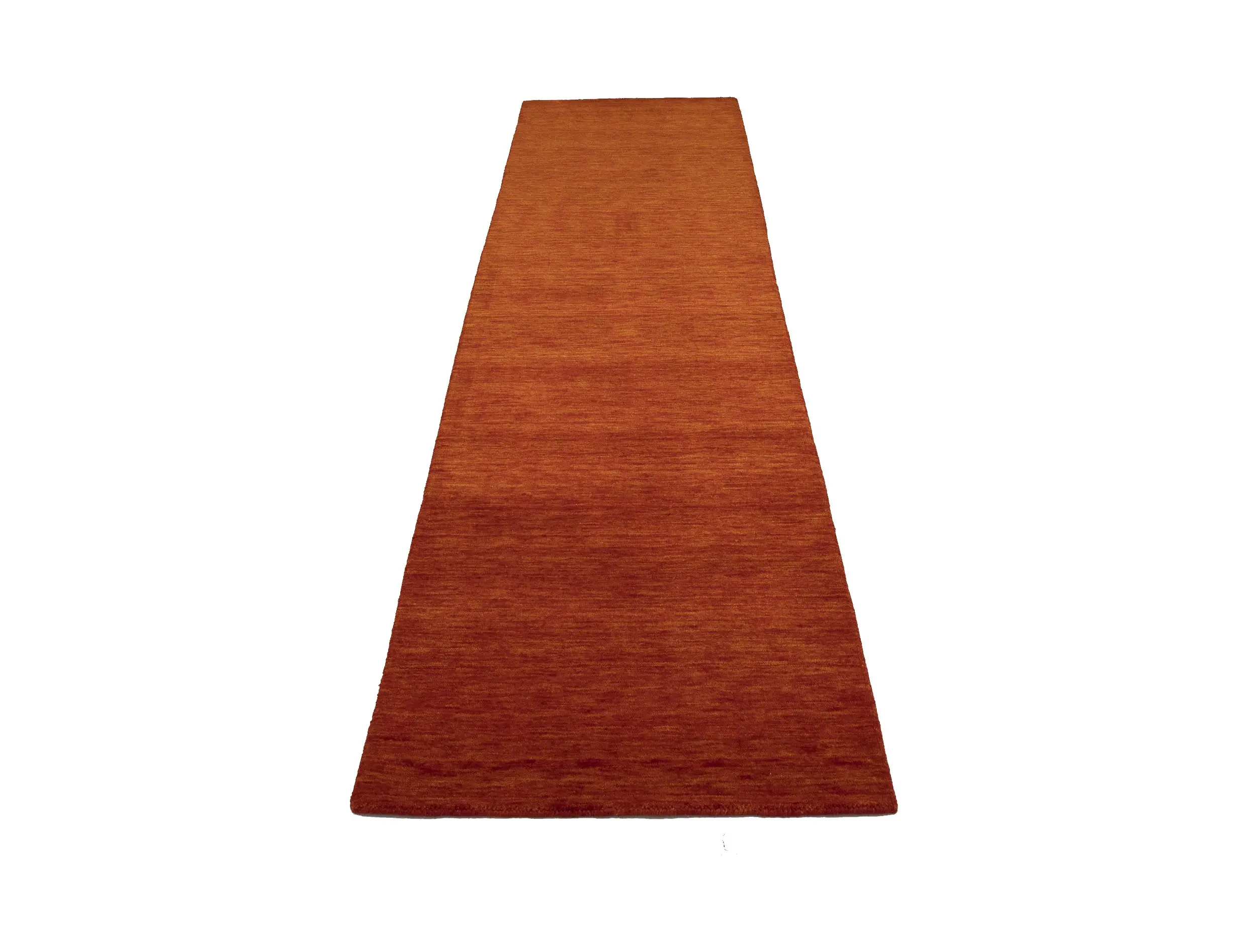 This hand-loomed 3X10 Orange Red Oriental rug from India features a modern, Solid design that seamlessly integrates traditional craftsmanship with contemporary style, showcasing a striking Orange Red primary color. It provides a luxuriant softness and durability underfoot, as it is constructed from premium wool with a cotton foundation. The rug is optimized for high-traffic areas due to its medium pile height and knot density of 100 knots per square inch, which ensures durability and comfort. This rug, which is in exceptional condition and was recently manufactured, is an ideal complement to any contemporary setting, providing both versatility and timeless elegance.