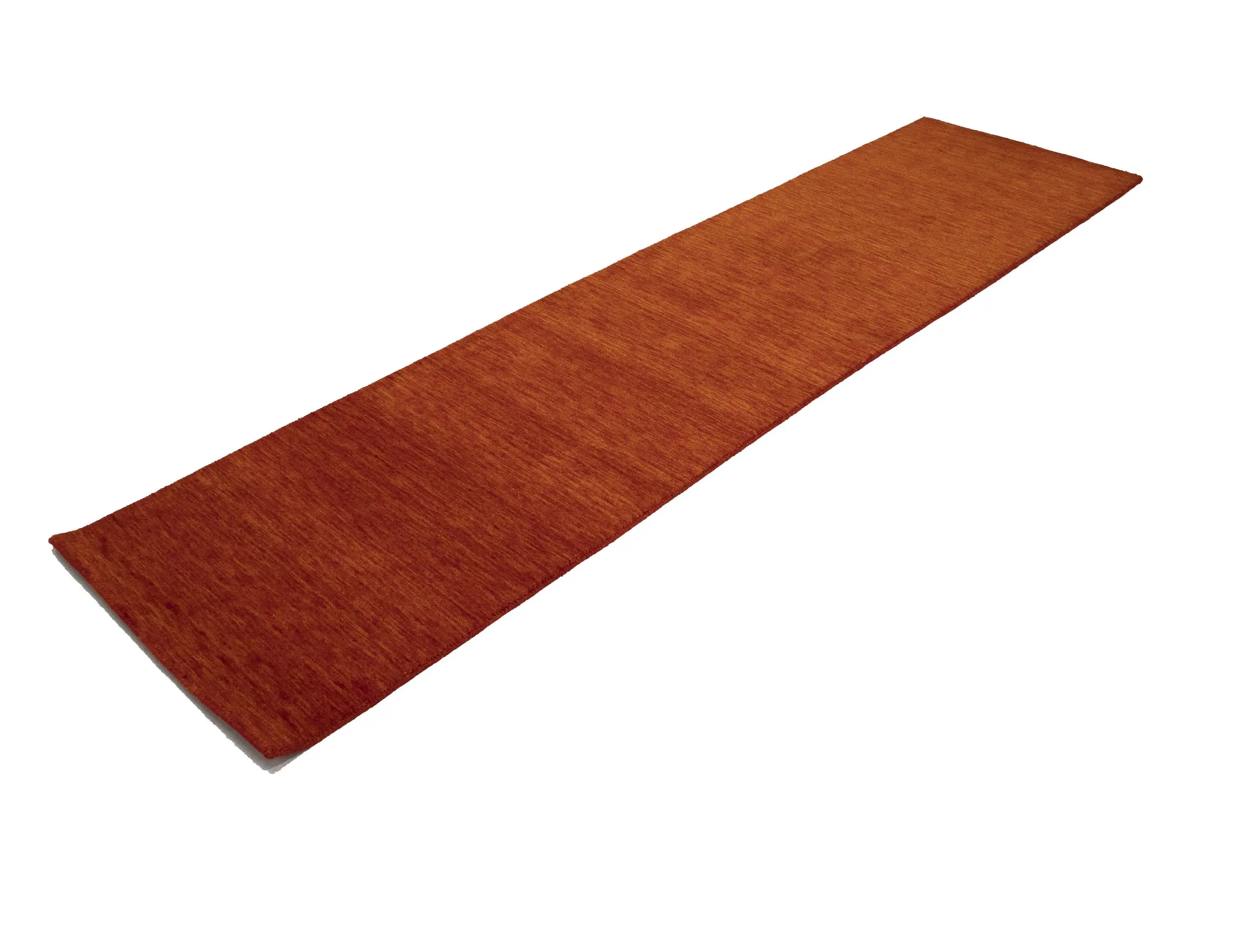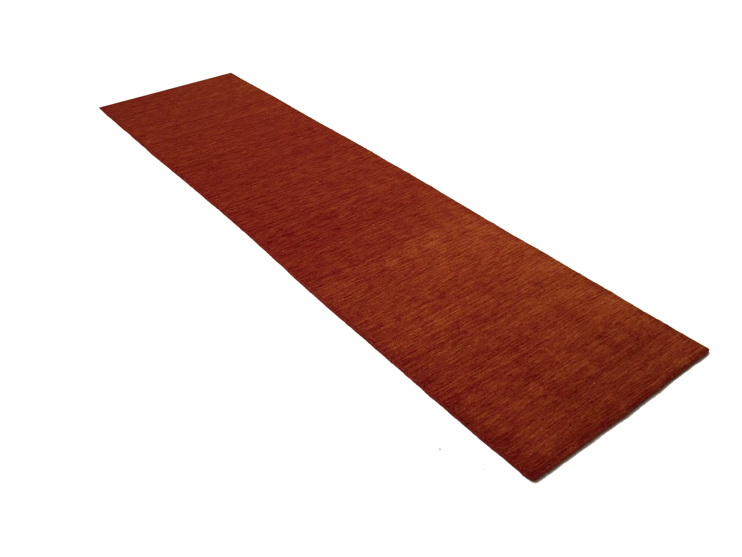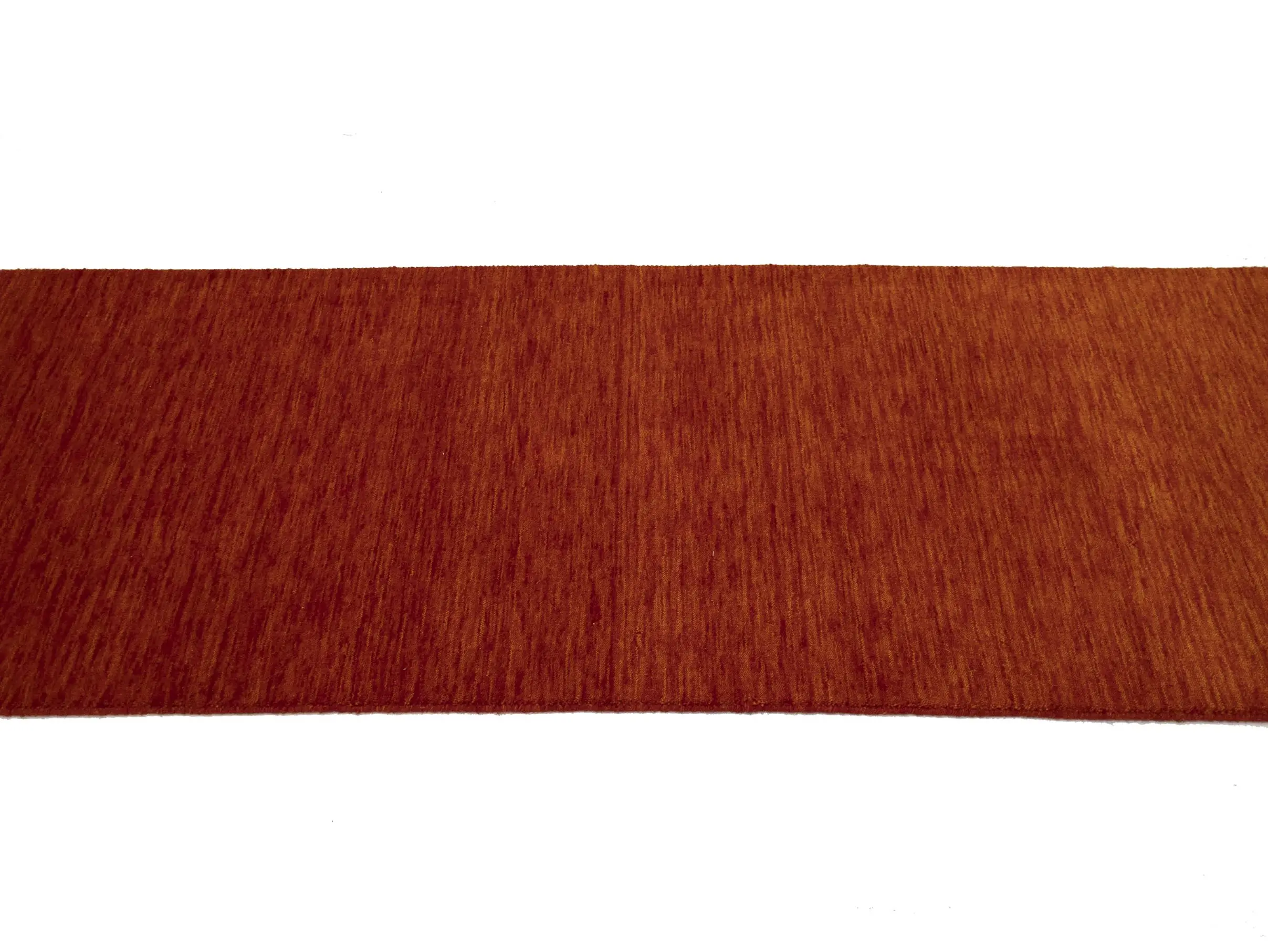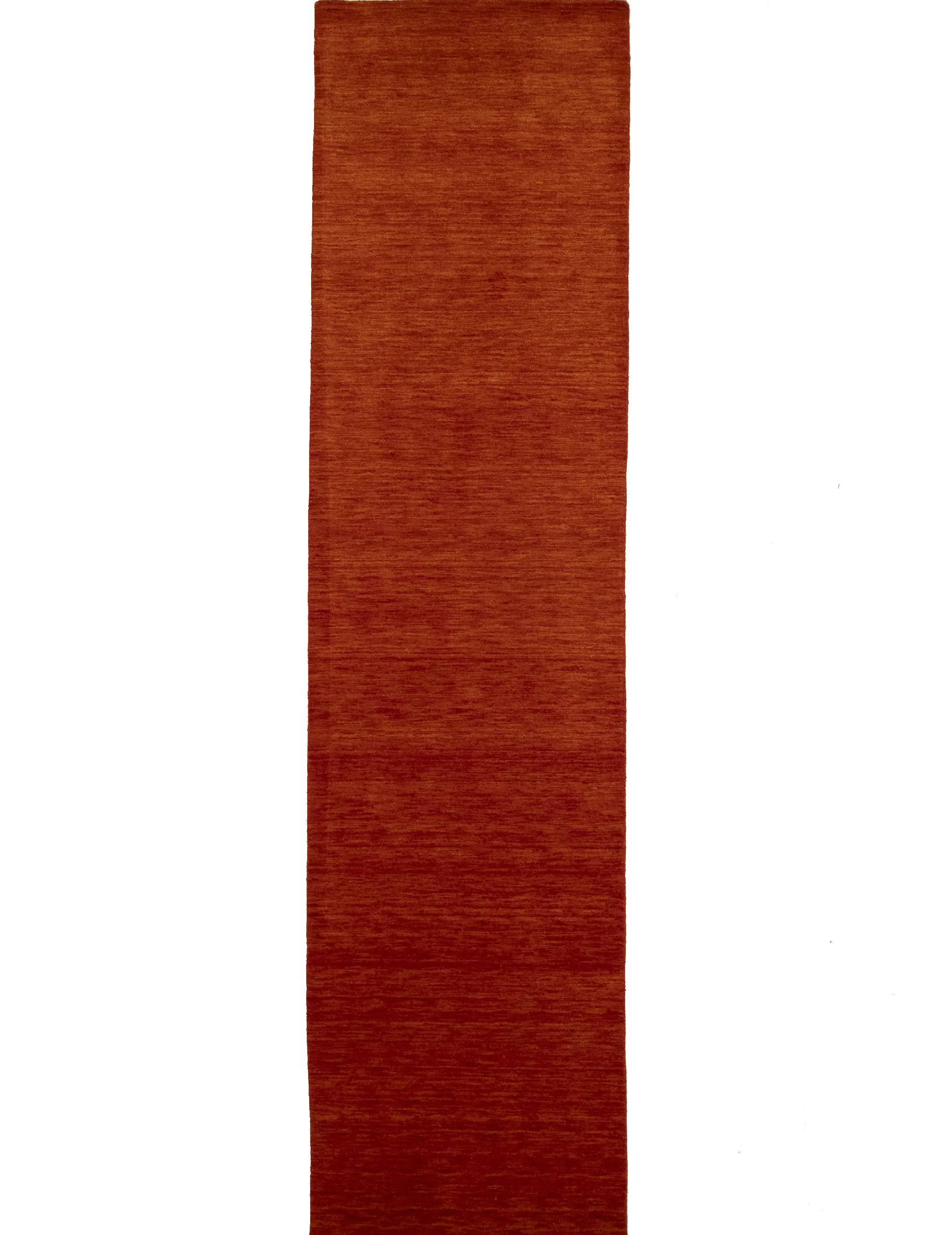 This hand-loomed 3X10 Orange Red Oriental rug from India features a modern, Solid design that seamlessly integrates traditional craftsmanship with contemporary style, showcasing a striking Orange Red primary color. It provides a luxuriant softness and durability underfoot, as it is constructed from premium wool with a cotton foundation. The rug is optimized for high-traffic areas due to its medium pile height and knot density of 100 knots per square inch, which ensures durability and comfort. This rug, which is in exceptional condition and was recently manufactured, is an ideal complement to any contemporary setting, providing both versatility and timeless elegance.