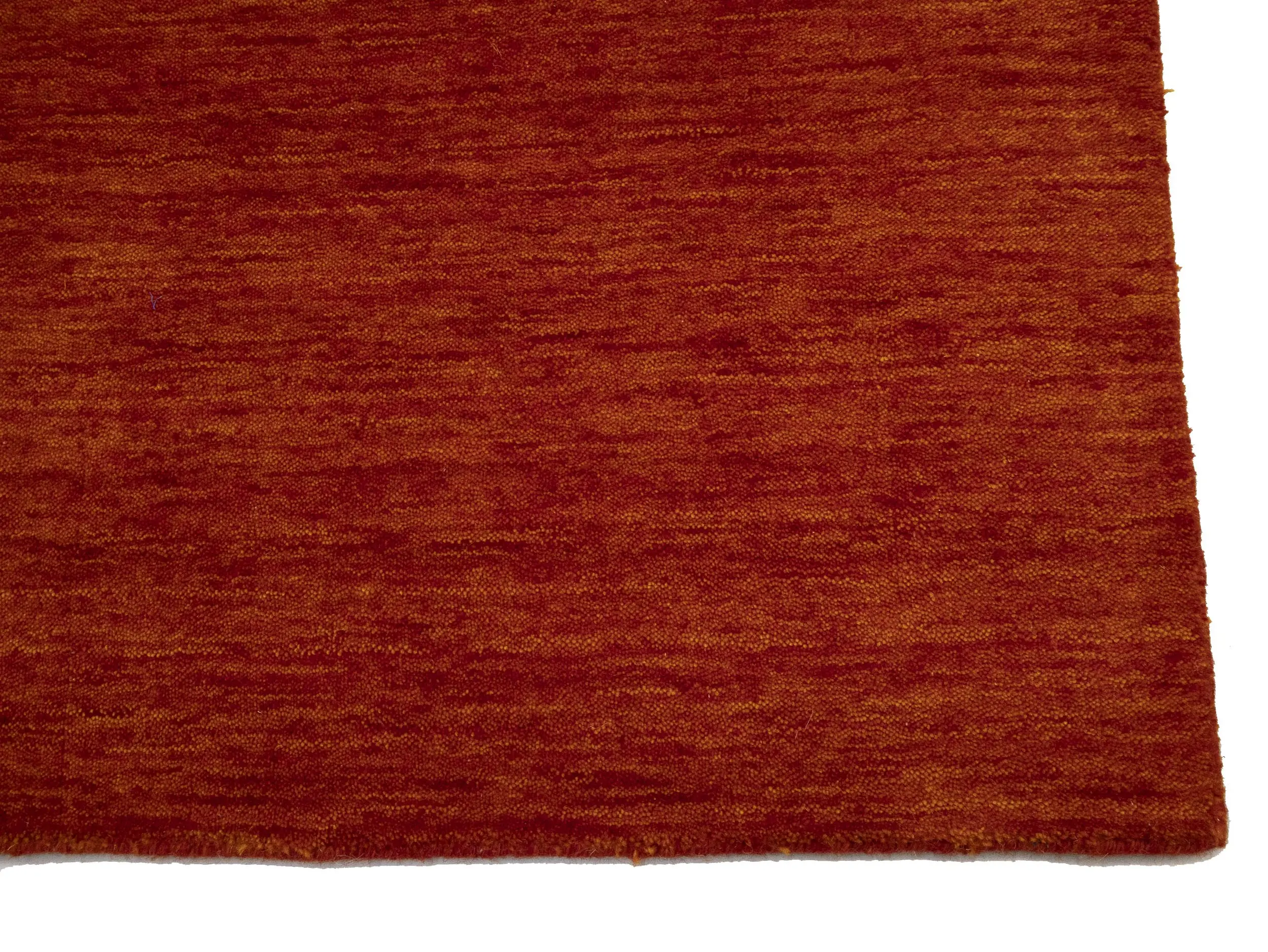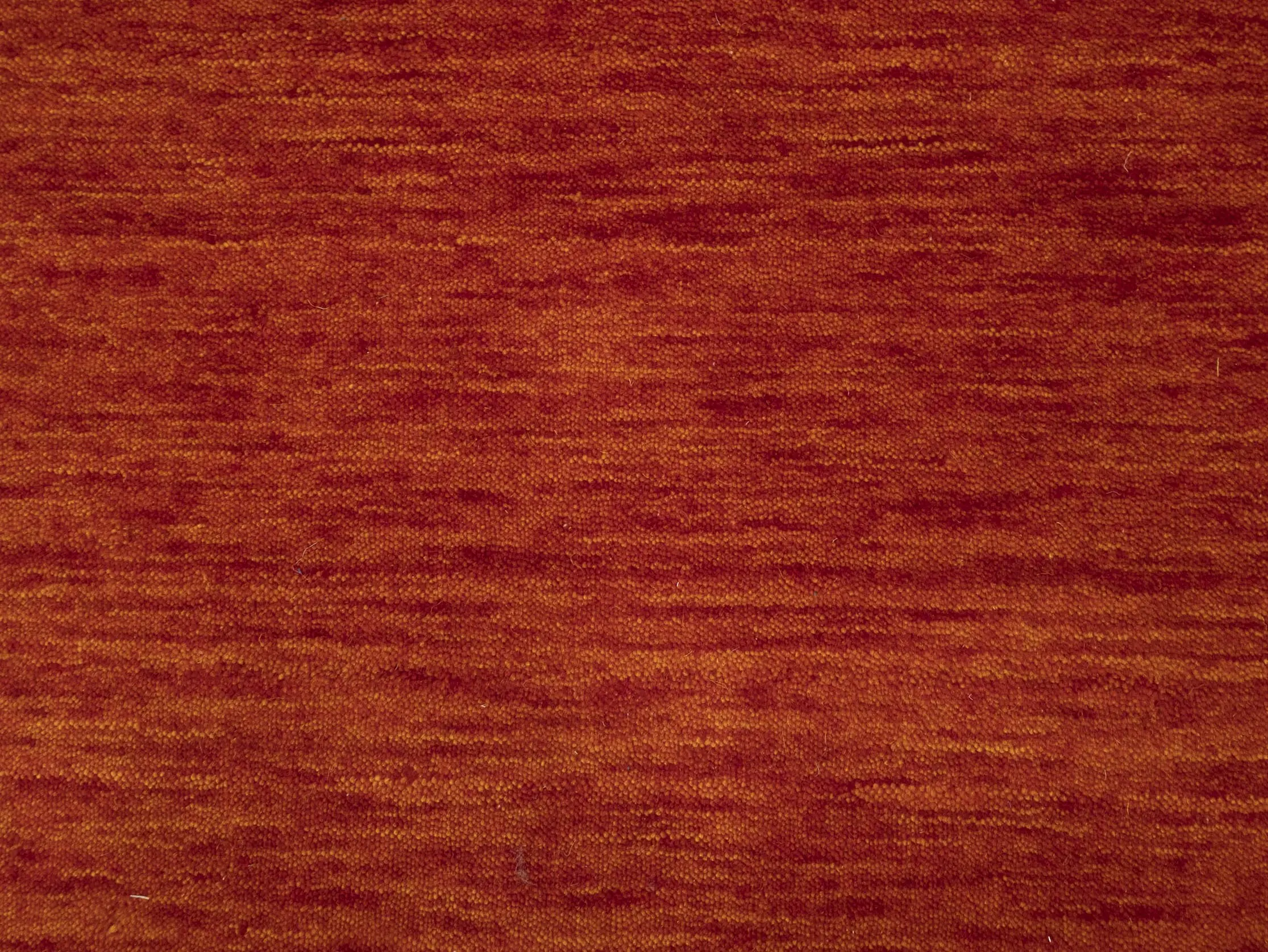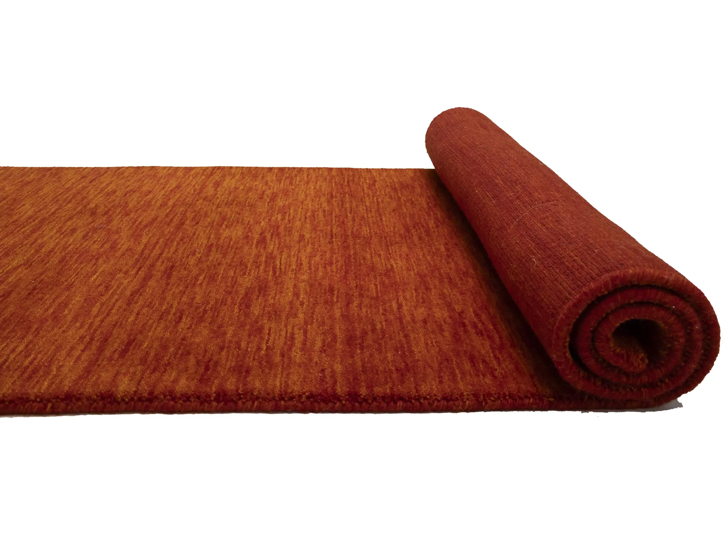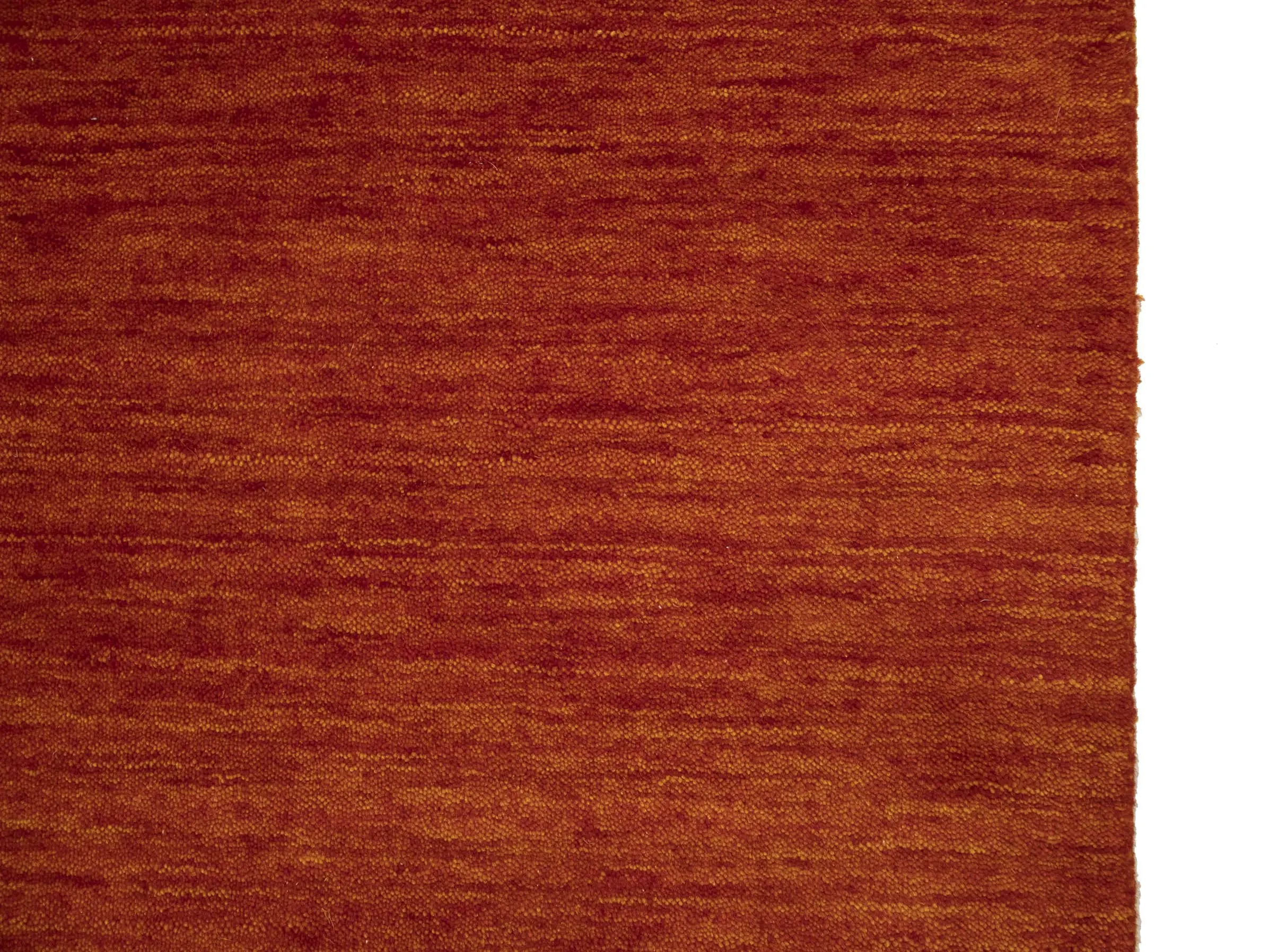 This hand-loomed 3X10 Orange Red Oriental rug from India features a modern, Solid design that seamlessly integrates traditional craftsmanship with contemporary style, showcasing a striking Orange Red primary color. It provides a luxuriant softness and durability underfoot, as it is constructed from premium wool with a cotton foundation. The rug is optimized for high-traffic areas due to its medium pile height and knot density of 100 knots per square inch, which ensures durability and comfort. This rug, which is in exceptional condition and was recently manufactured, is an ideal complement to any contemporary setting, providing both versatility and timeless elegance.