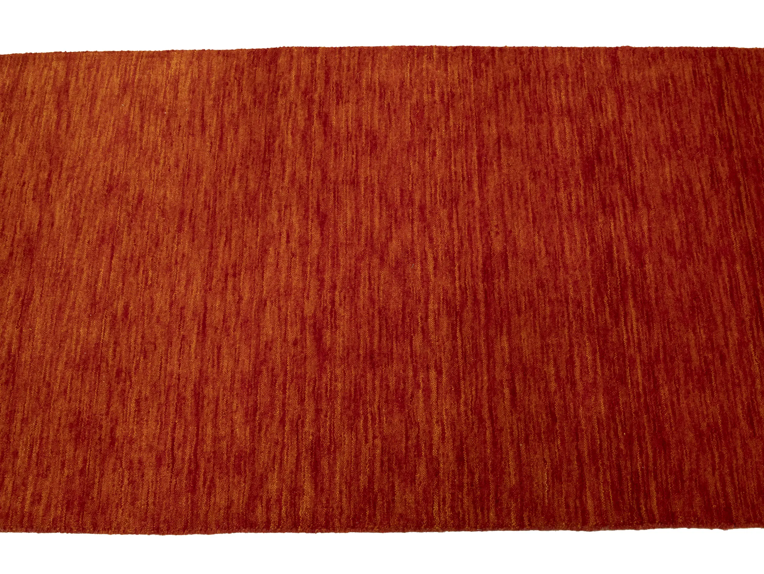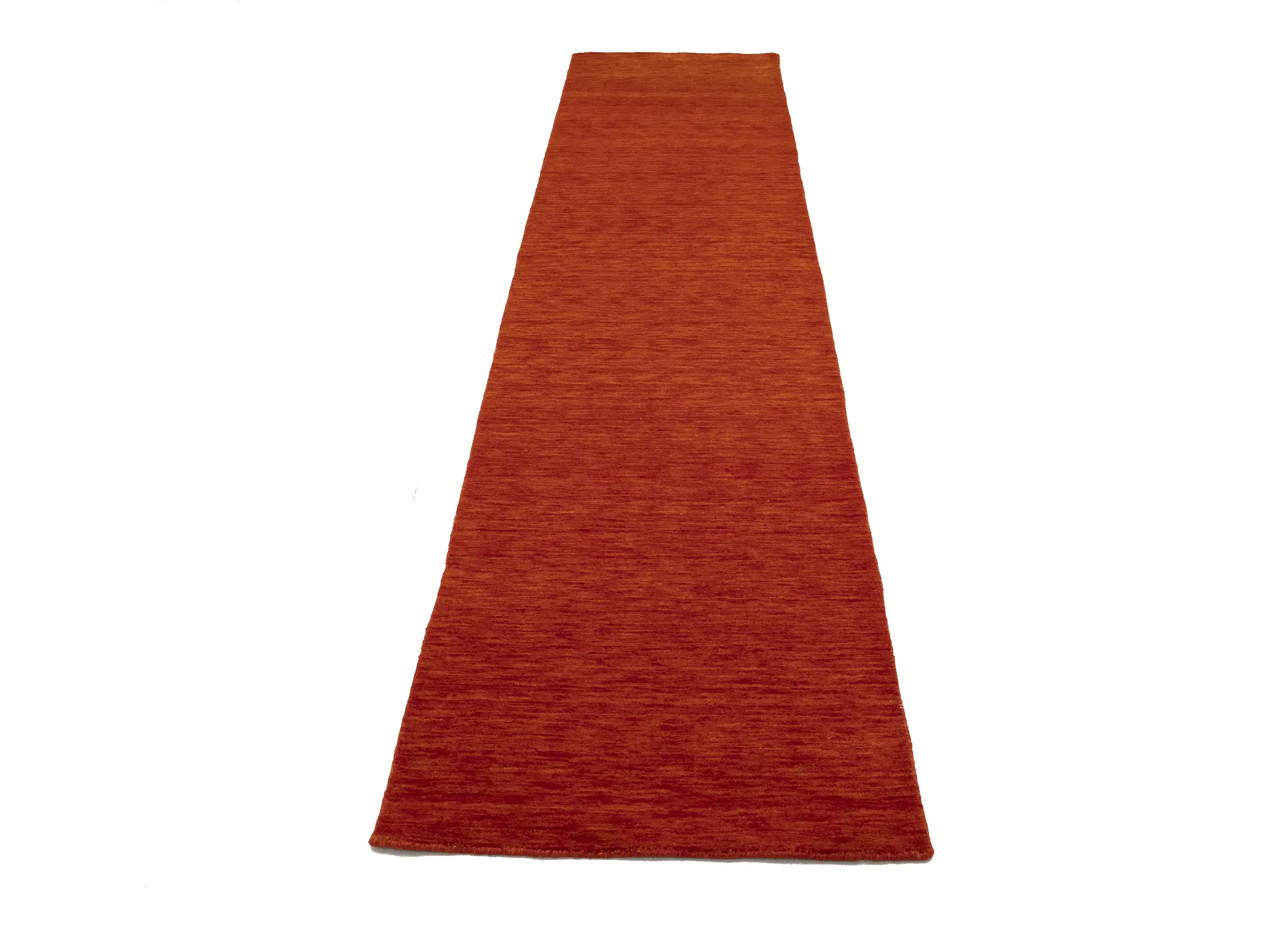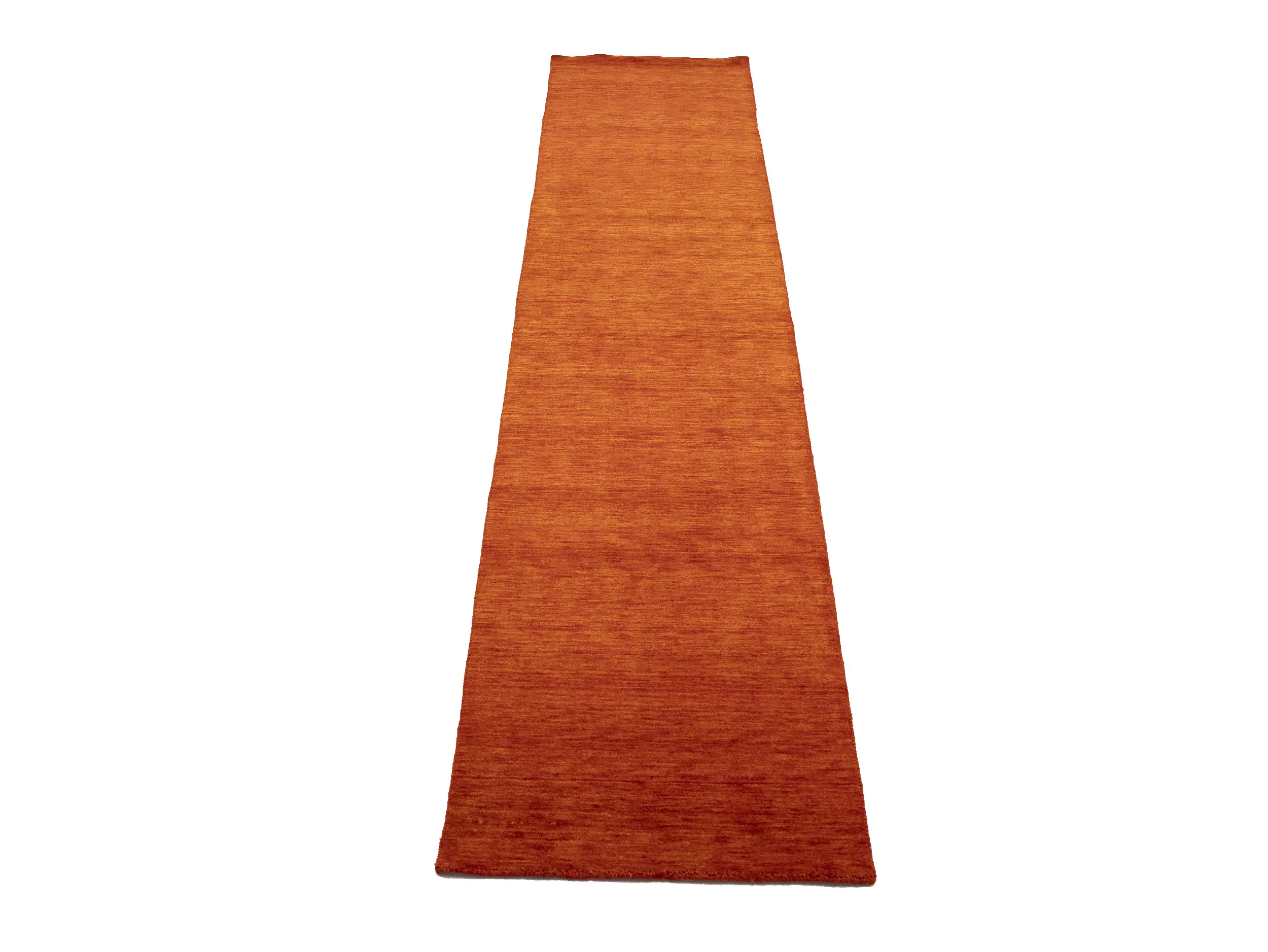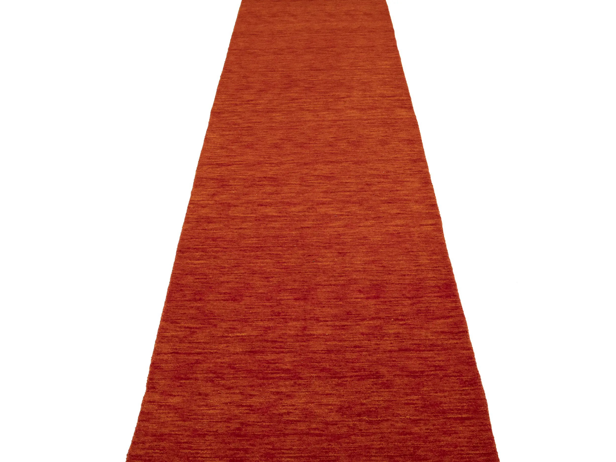This hand-loomed 3X12 Orange Red Oriental Runner rug from India features a modern, Solid design that seamlessly integrates traditional craftsmanship with contemporary style, showcasing a striking Orange Red primary color. It provides a luxuriant softness and durability underfoot, as it is constructed from premium wool with a cotton foundation. The rug is optimized for high-traffic areas due to its medium pile height and knot density of 100 knots per square inch, which ensures durability and comfort. This rug, which is in exceptional condition and was recently manufactured, is an ideal complement to any contemporary setting, providing both versatility and timeless elegance.