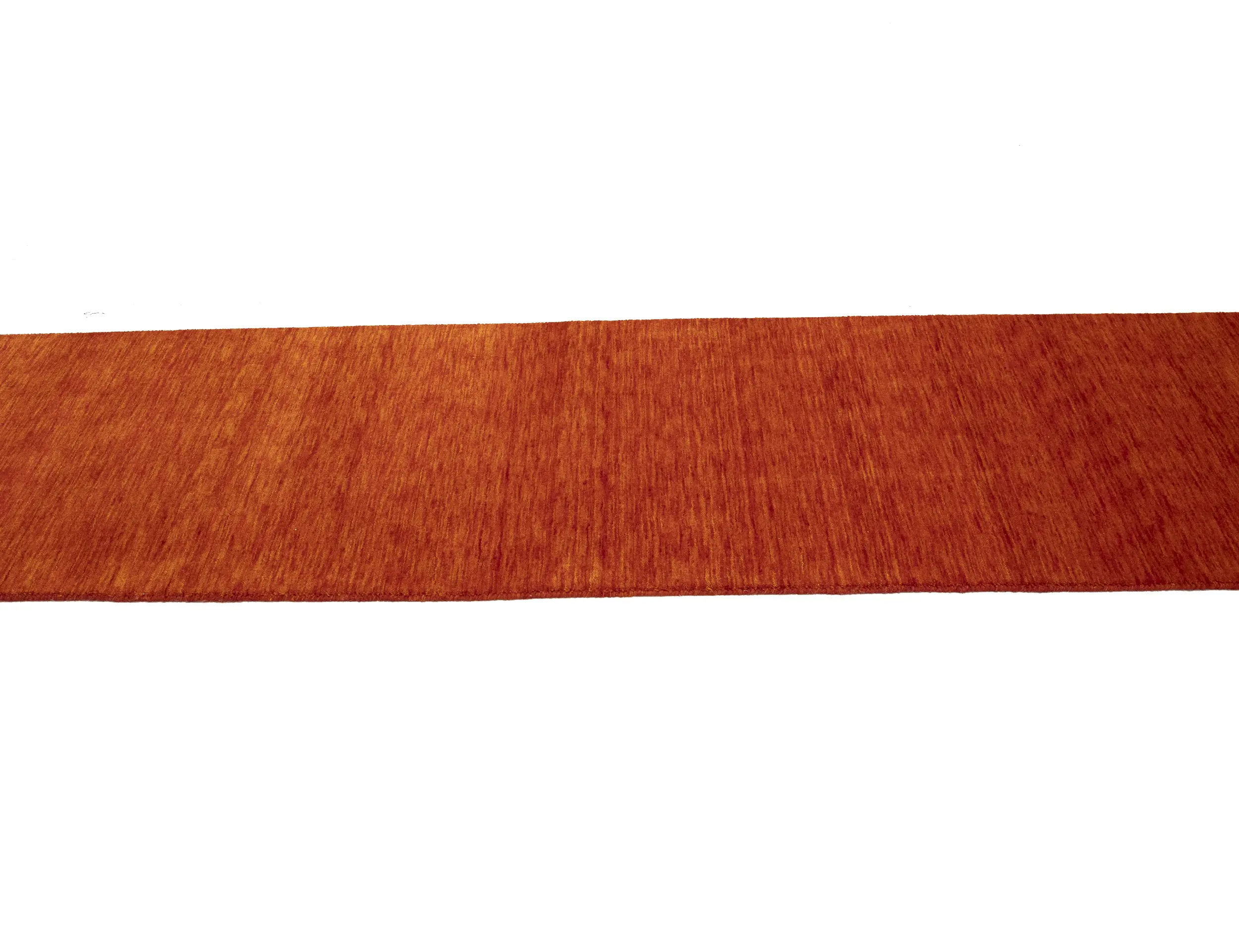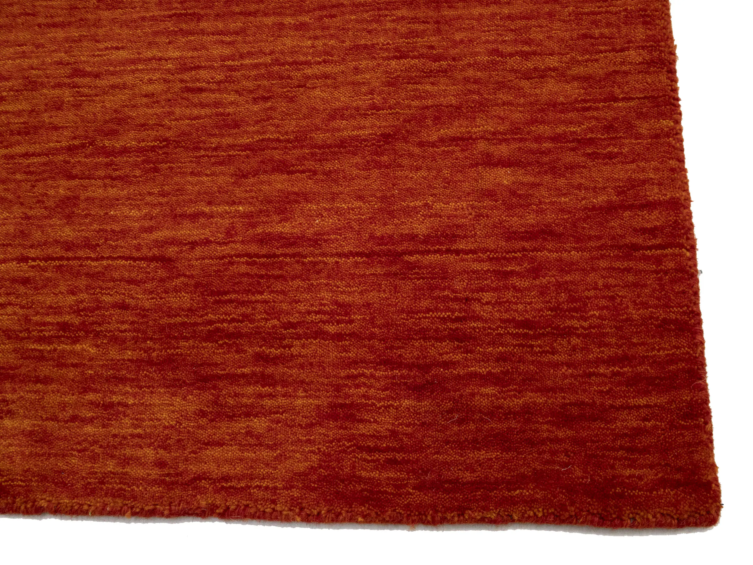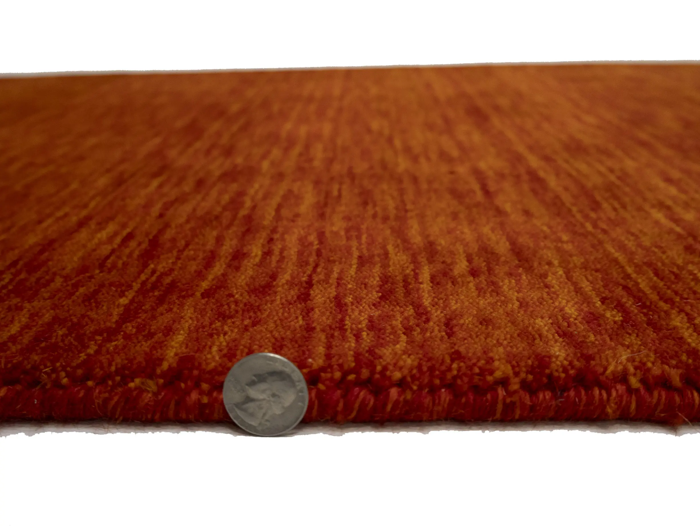 This hand-loomed 3X12 Orange Red Oriental Runner rug from India features a modern, Solid design that seamlessly integrates traditional craftsmanship with contemporary style, showcasing a striking Orange Red primary color. It provides a luxuriant softness and durability underfoot, as it is constructed from premium wool with a cotton foundation. The rug is optimized for high-traffic areas due to its medium pile height and knot density of 100 knots per square inch, which ensures durability and comfort. This rug, which is in exceptional condition and was recently manufactured, is an ideal complement to any contemporary setting, providing both versatility and timeless elegance.