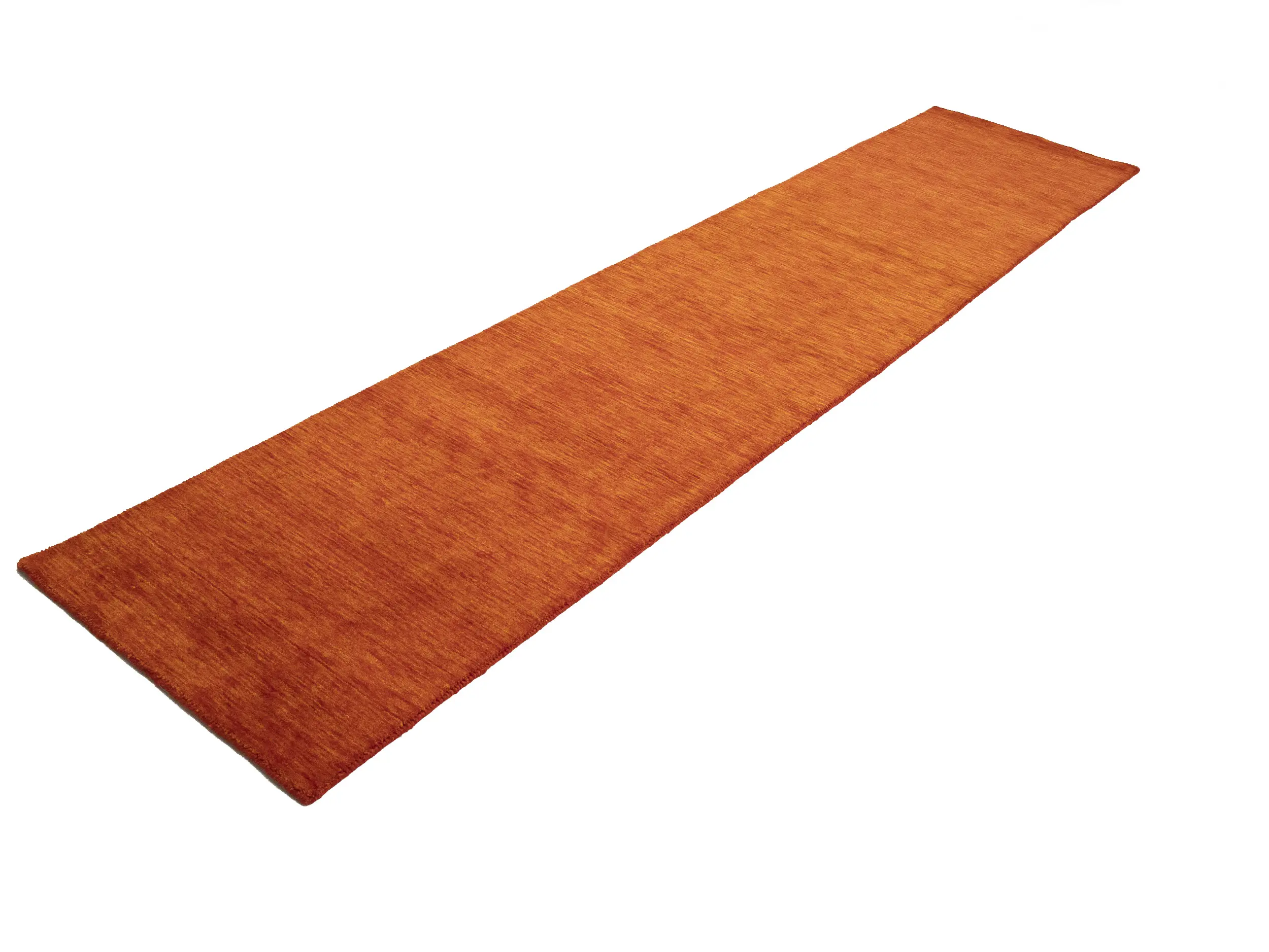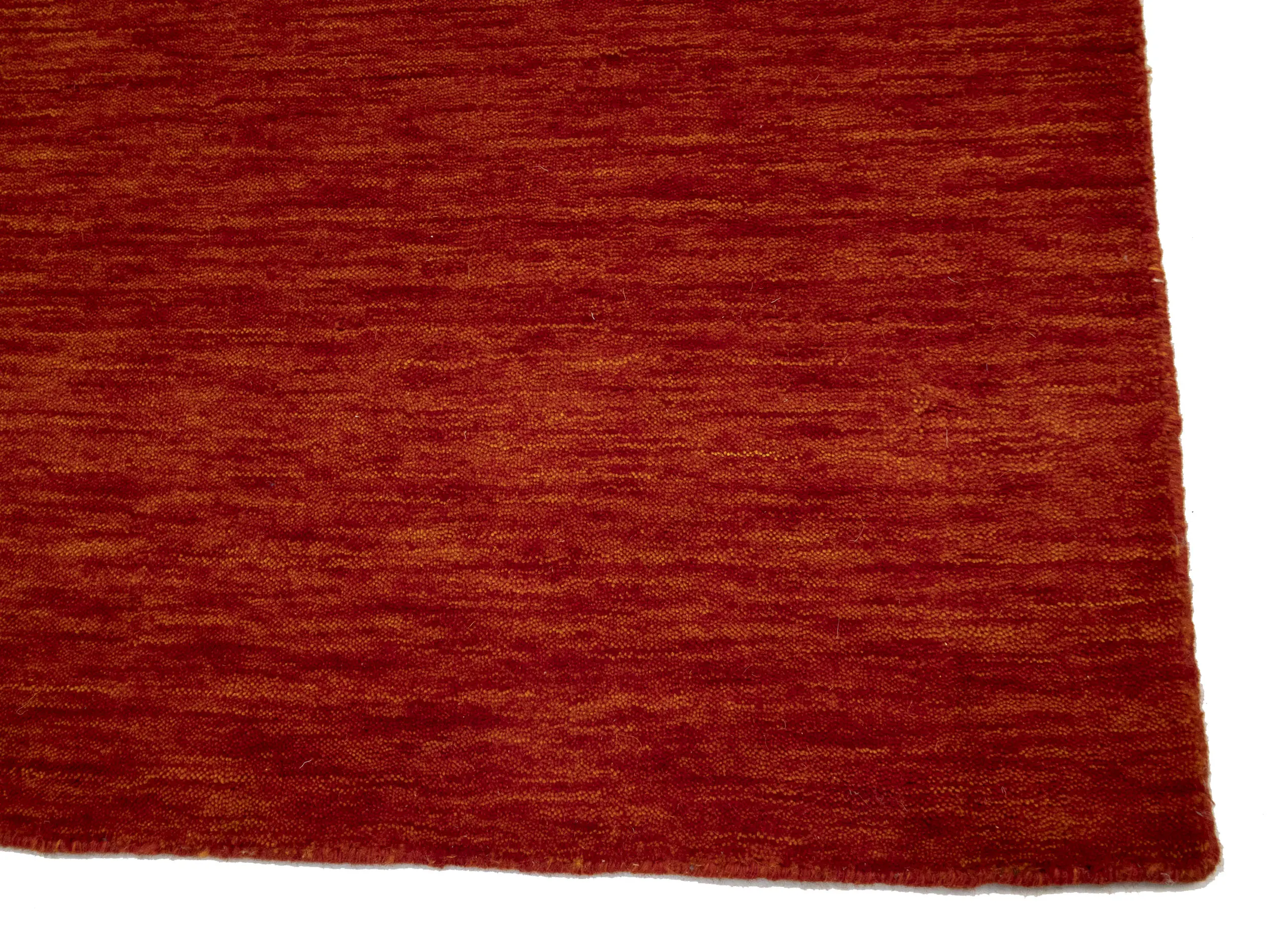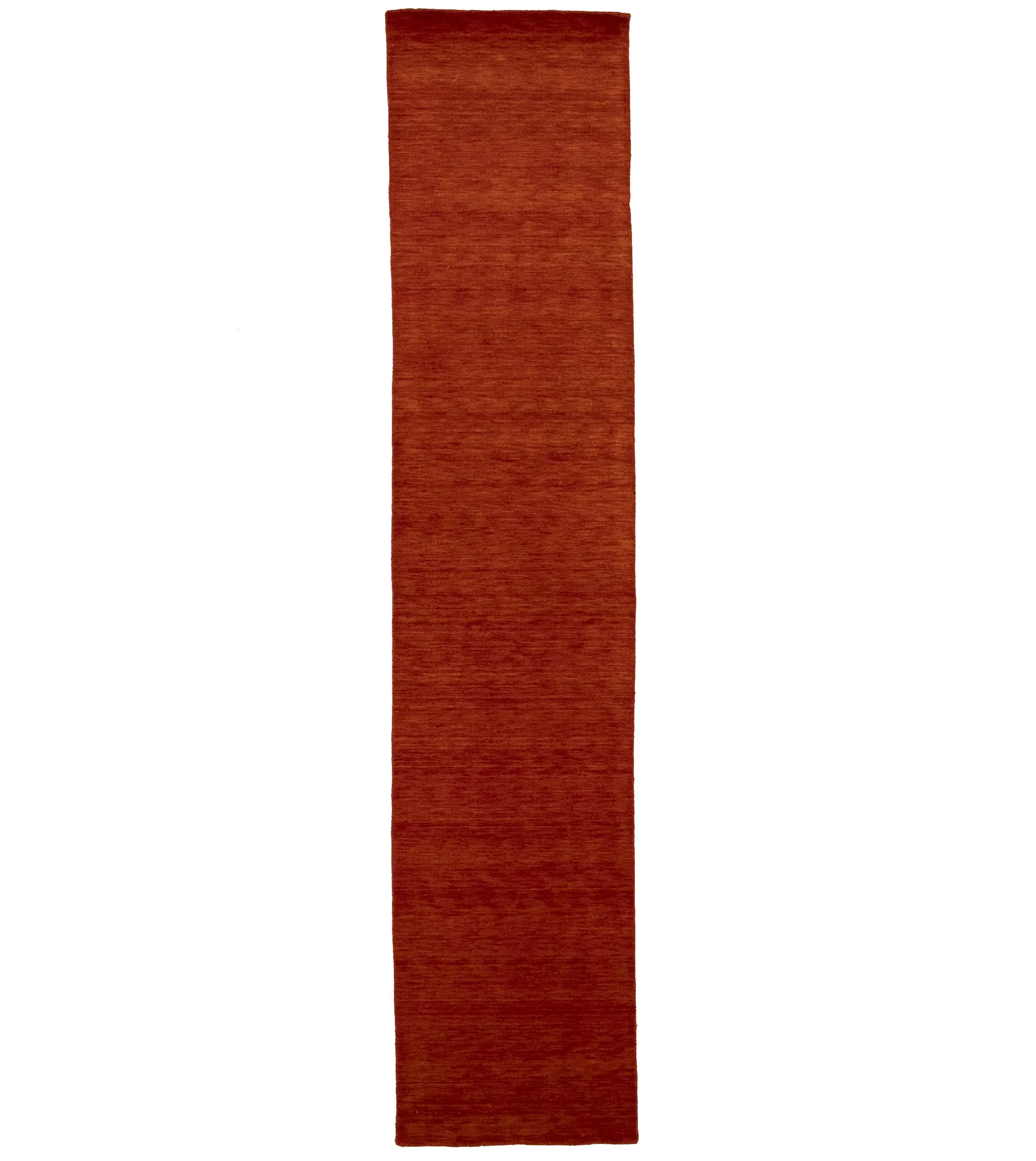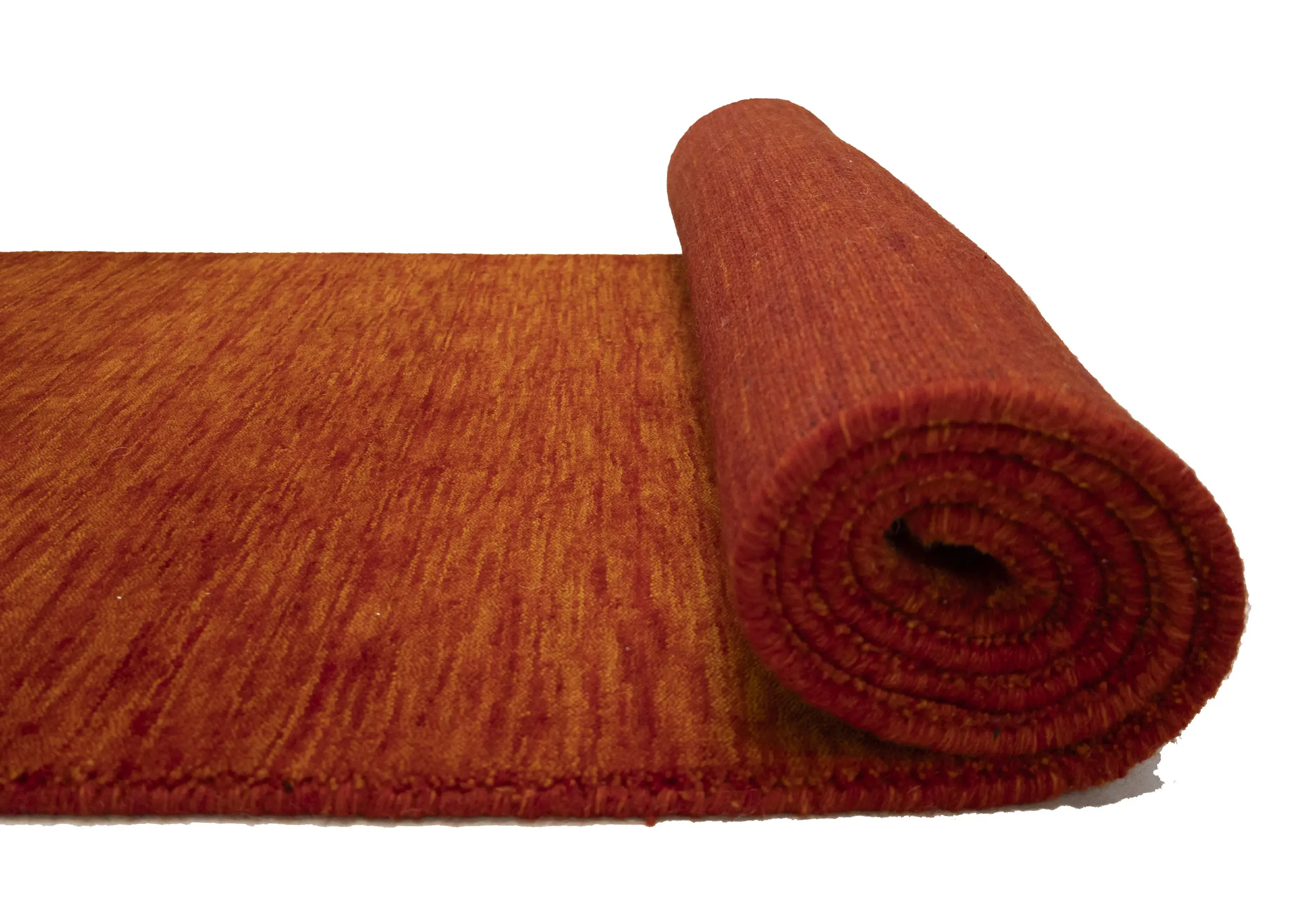 This hand-loomed 3X12 Orange Red Oriental Runner rug from India features a modern, Solid design that seamlessly integrates traditional craftsmanship with contemporary style, showcasing a striking Orange Red primary color. It provides a luxuriant softness and durability underfoot, as it is constructed from premium wool with a cotton foundation. The rug is optimized for high-traffic areas due to its medium pile height and knot density of 100 knots per square inch, which ensures durability and comfort. This rug, which is in exceptional condition and was recently manufactured, is an ideal complement to any contemporary setting, providing both versatility and timeless elegance.