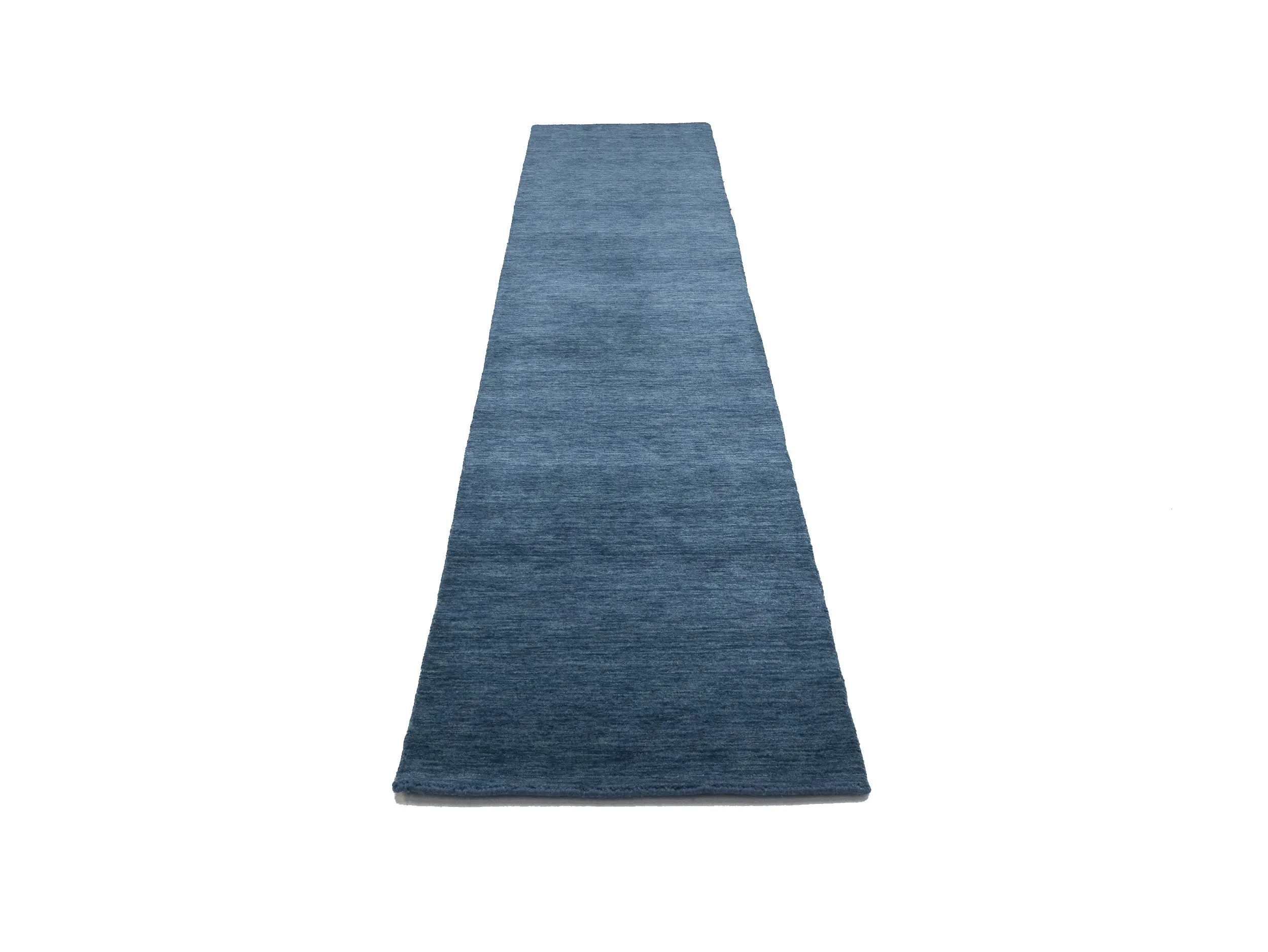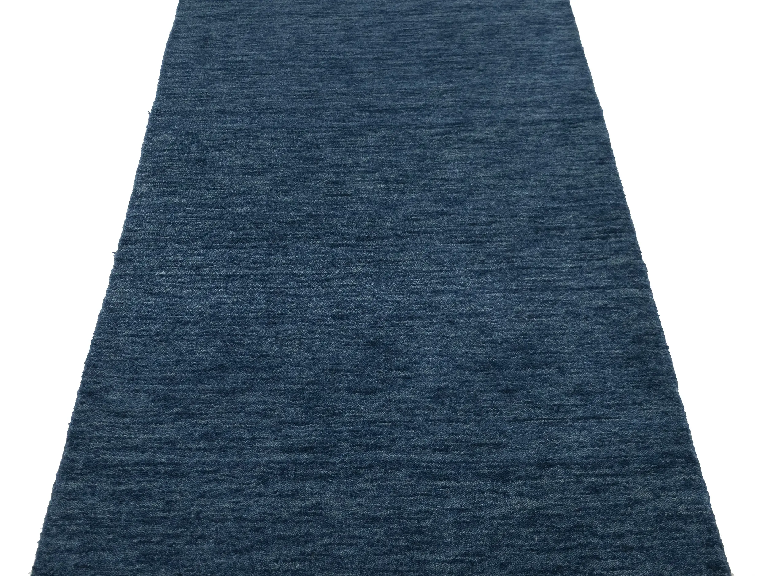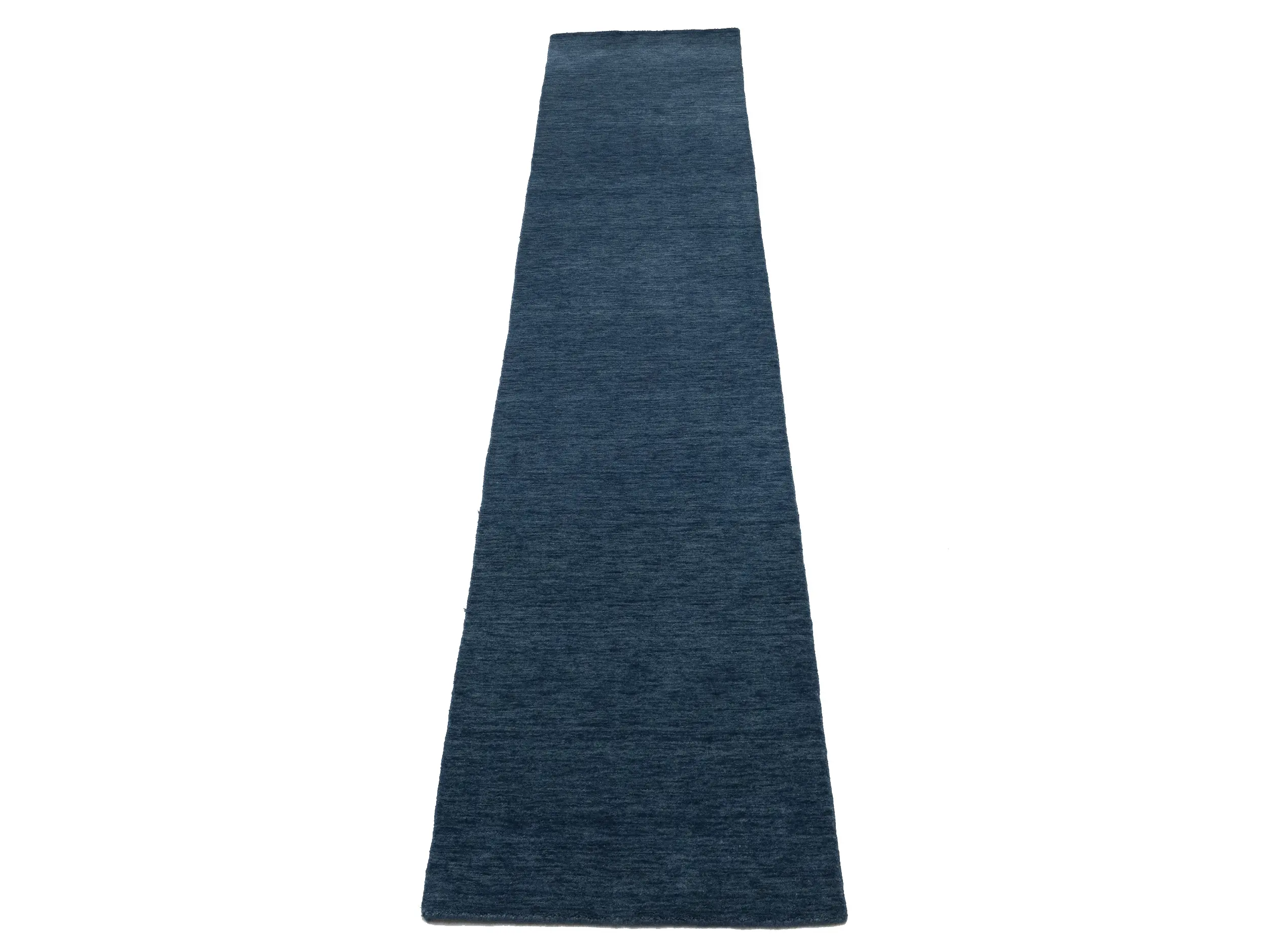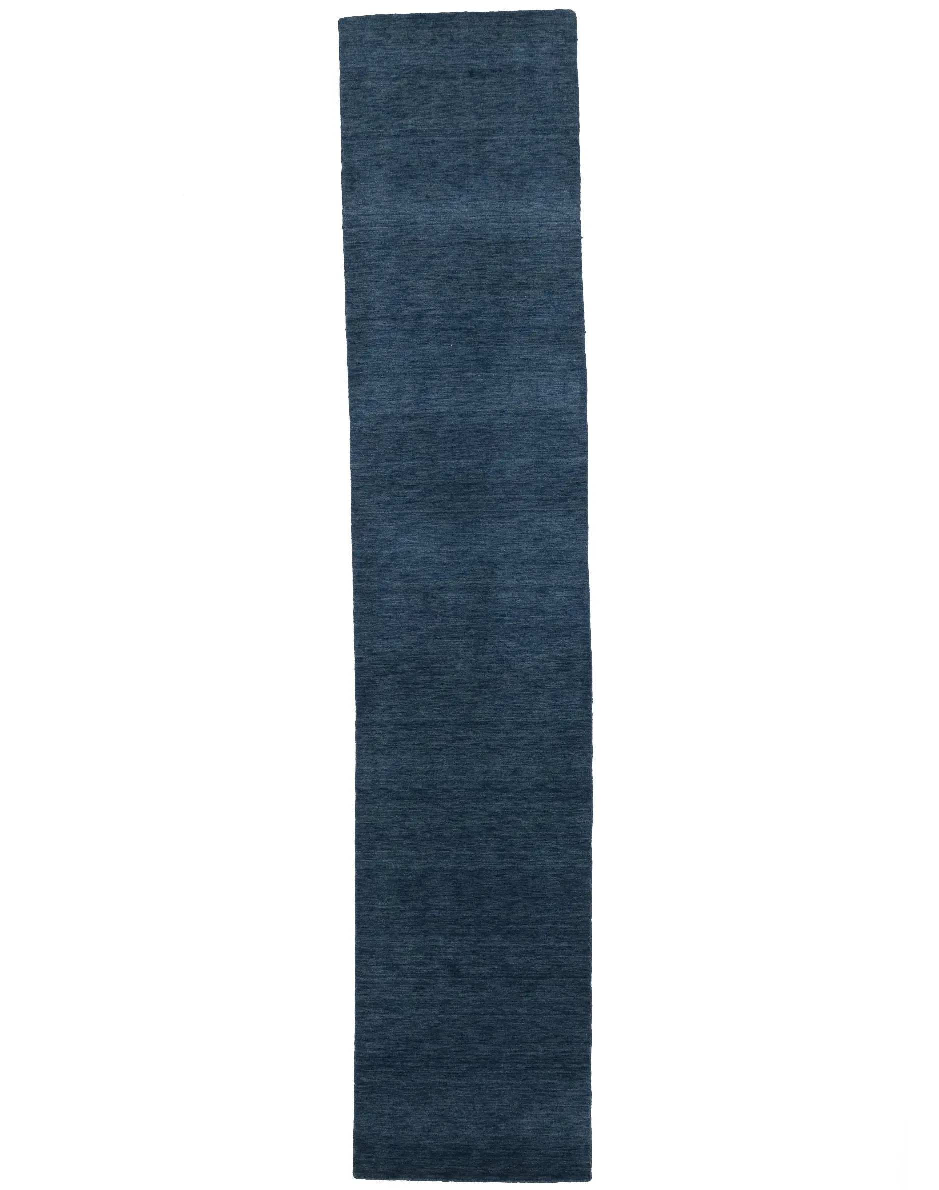 This hand-loomed 3X12 Steel Blue Oriental Runner rug from India features a modern, Solid design that seamlessly integrates traditional craftsmanship with contemporary style, showcasing a striking Steel Blue primary color. It provides a luxuriant softness and durability underfoot, as it is constructed from premium wool with a cotton foundation. The rug is optimized for high-traffic areas due to its medium pile height and knot density of 100 knots per square inch, which ensures durability and comfort. This rug, which is in exceptional condition and was recently manufactured, is an ideal complement to any contemporary setting, providing both versatility and timeless elegance.