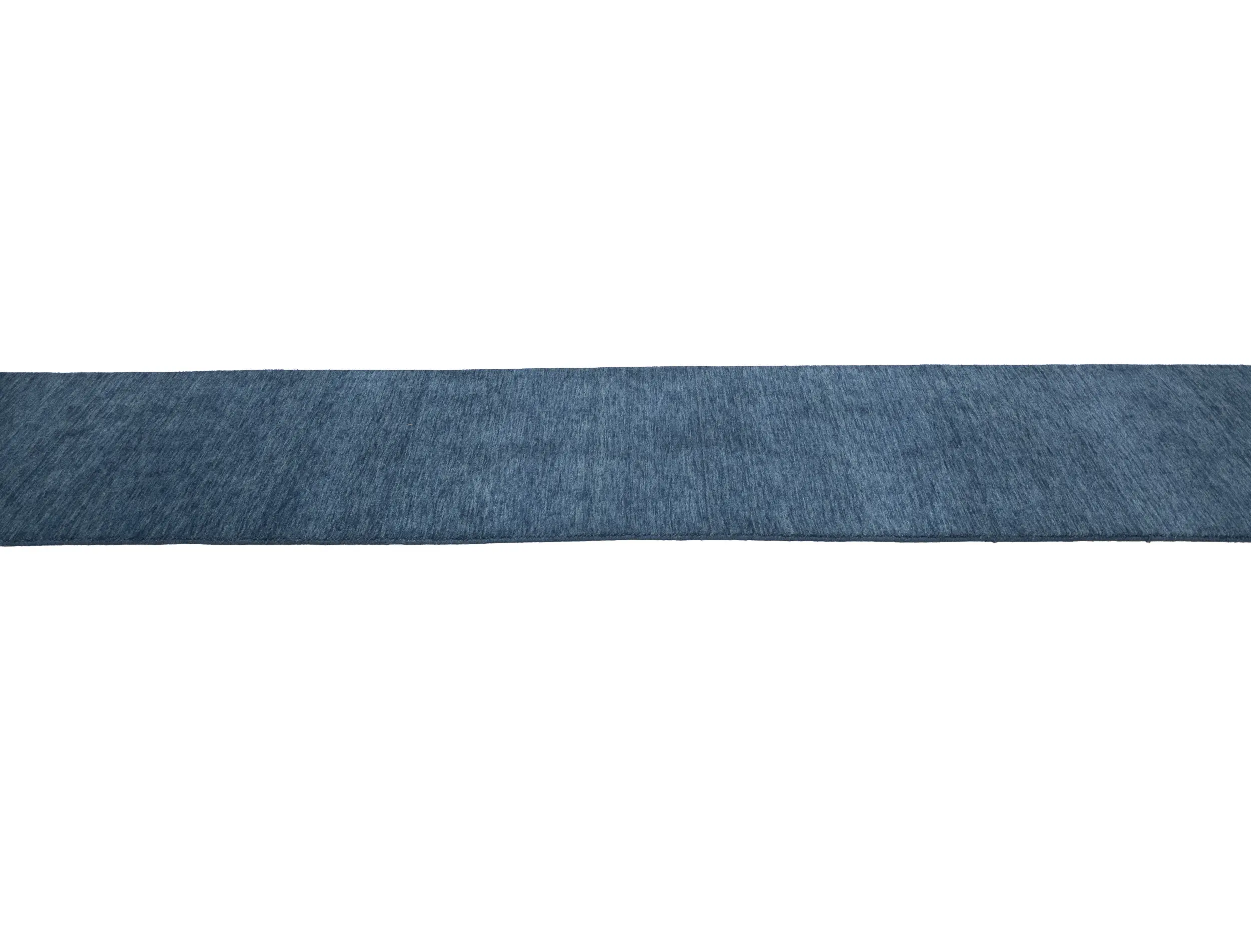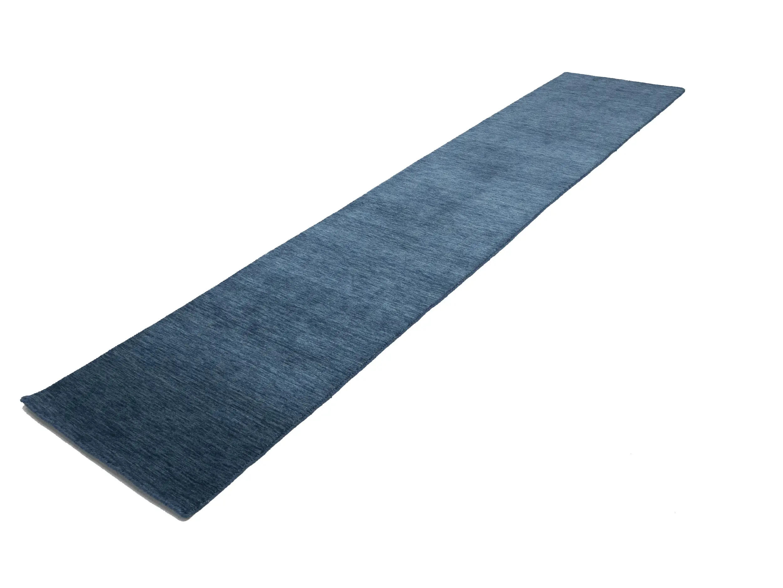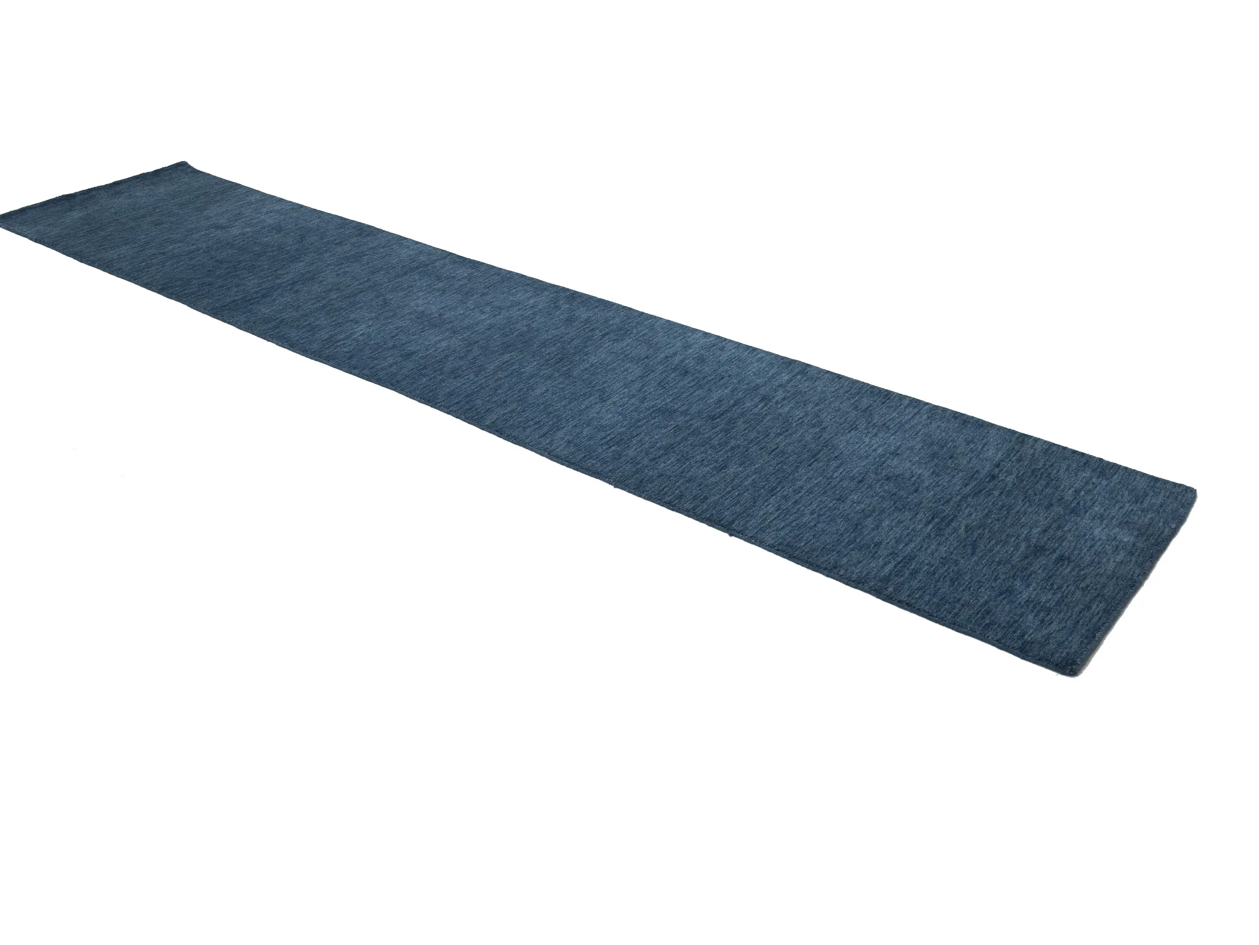 This hand-loomed 3X12 Steel Blue Oriental Runner rug from India features a modern, Solid design that seamlessly integrates traditional craftsmanship with contemporary style, showcasing a striking Steel Blue primary color. It provides a luxuriant softness and durability underfoot, as it is constructed from premium wool with a cotton foundation. The rug is optimized for high-traffic areas due to its medium pile height and knot density of 100 knots per square inch, which ensures durability and comfort. This rug, which is in exceptional condition and was recently manufactured, is an ideal complement to any contemporary setting, providing both versatility and timeless elegance.