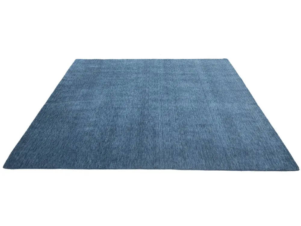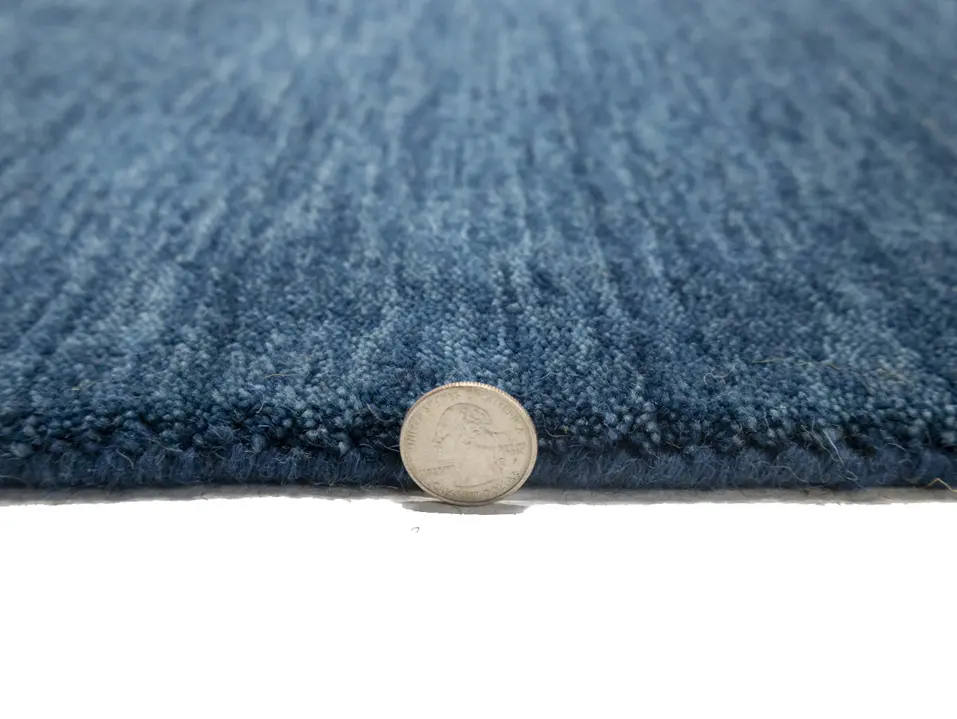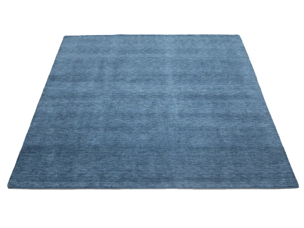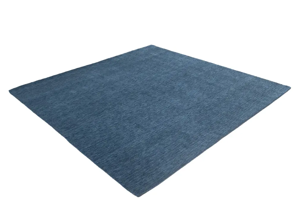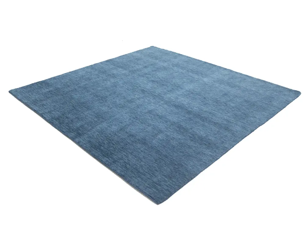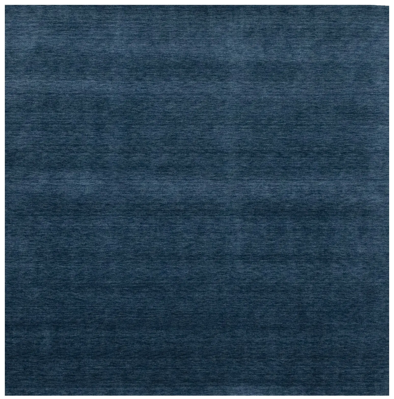 This hand-loomed 8X8 Steel Blue Oriental Square rug from India features a modern, Solid design that seamlessly integrates traditional craftsmanship with contemporary style, showcasing a striking Steel Blue primary color. It provides a luxuriant softness and durability underfoot, as it is constructed from premium wool with a cotton foundation. The rug is optimized for high-traffic areas due to its medium pile height and knot density of 100 knots per square inch, which ensures durability and comfort. This rug, which is in exceptional condition and was recently manufactured, is an ideal complement to any contemporary setting, providing both versatility and timeless elegance.