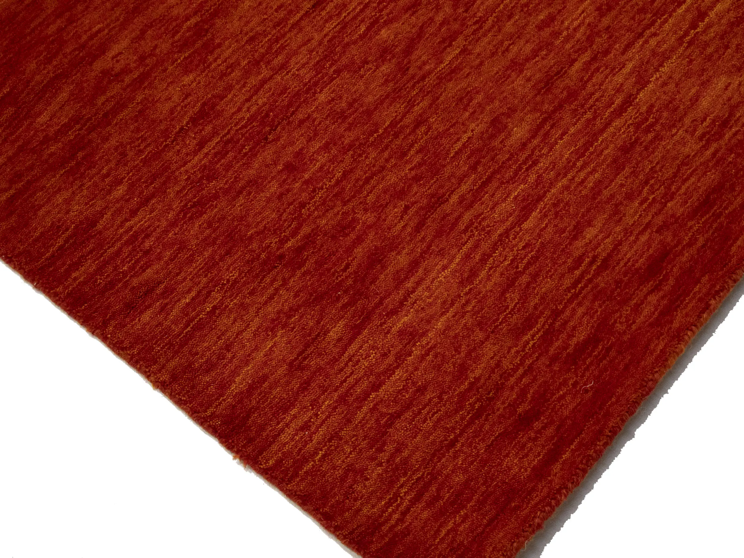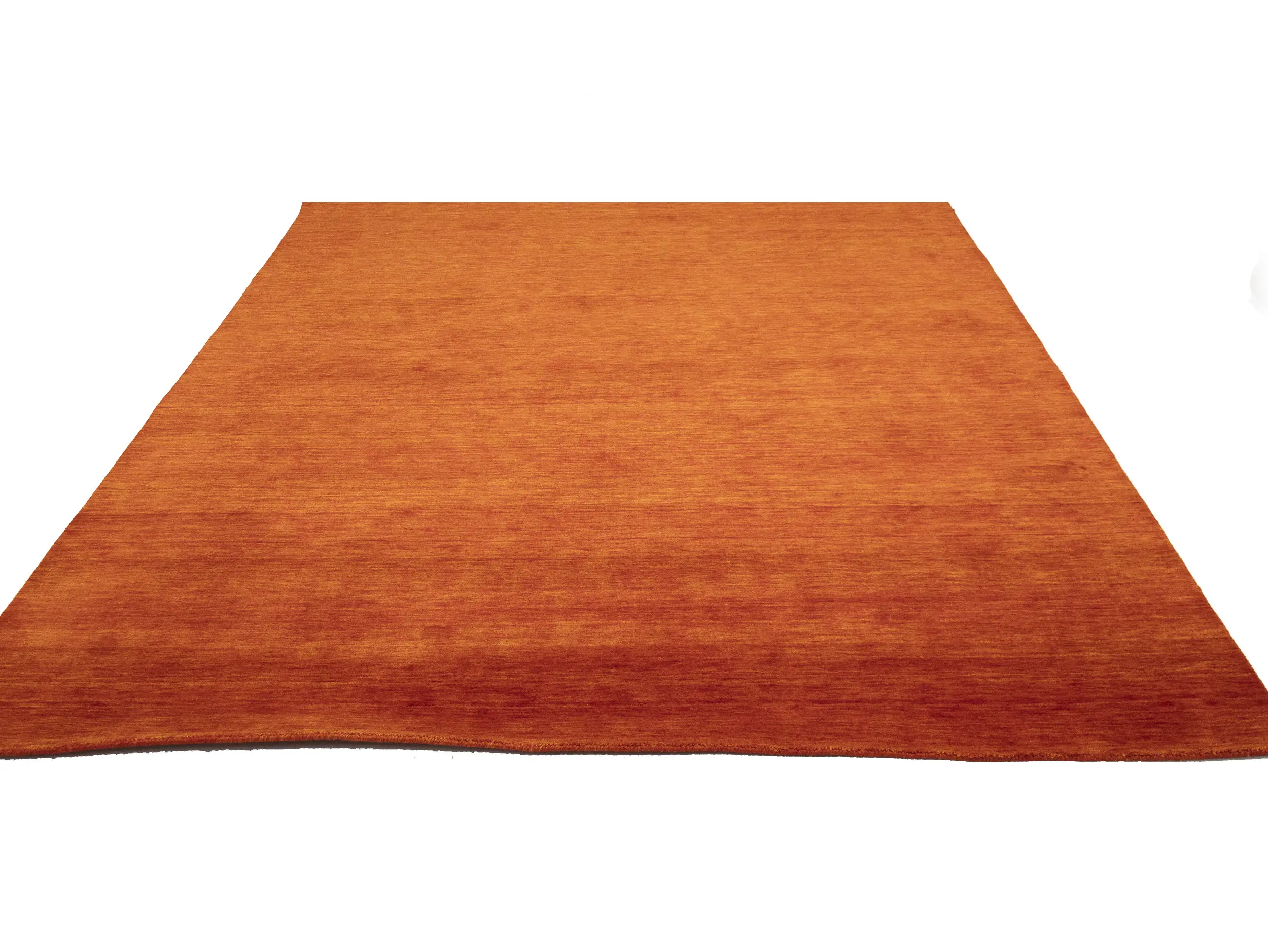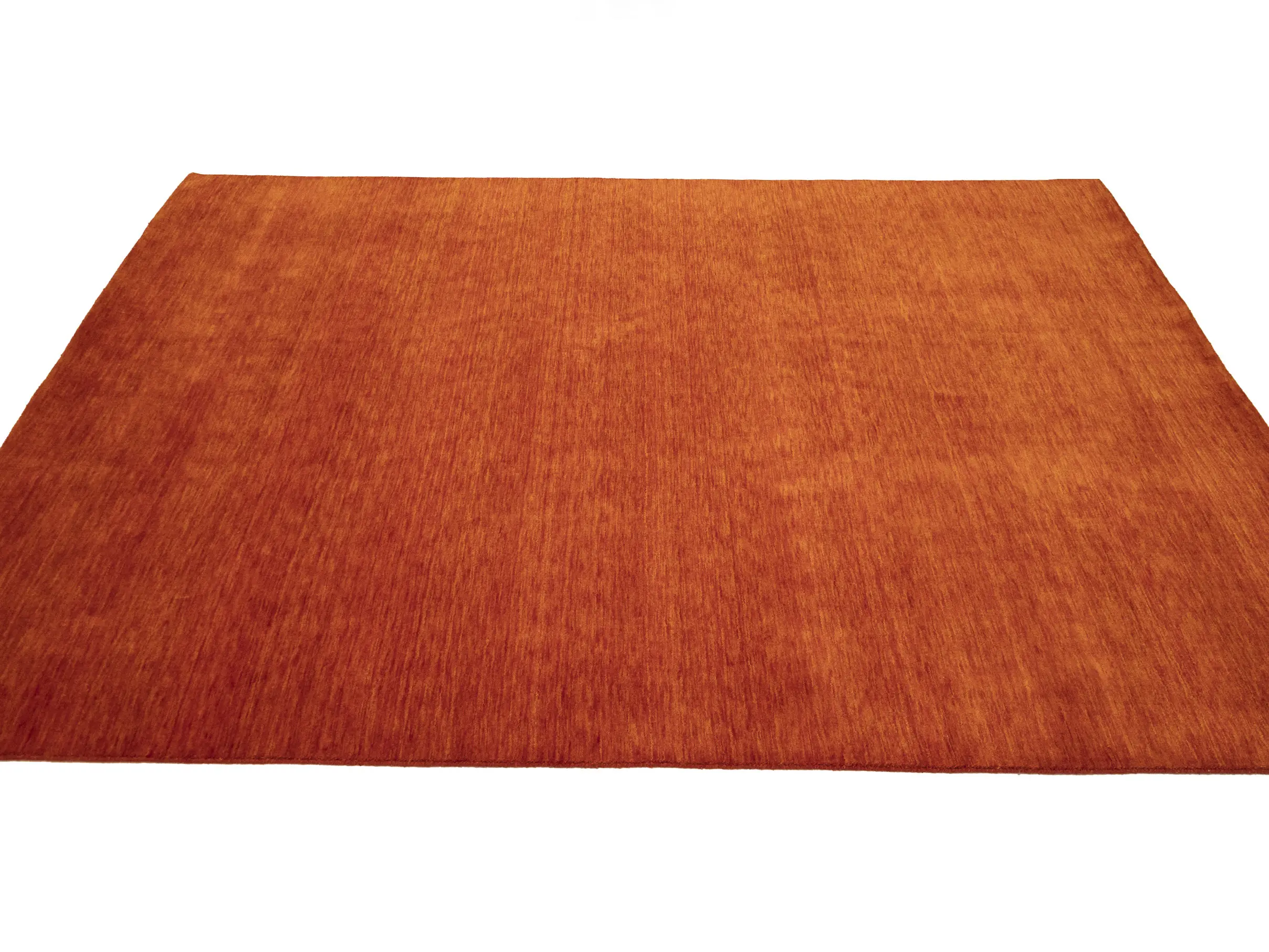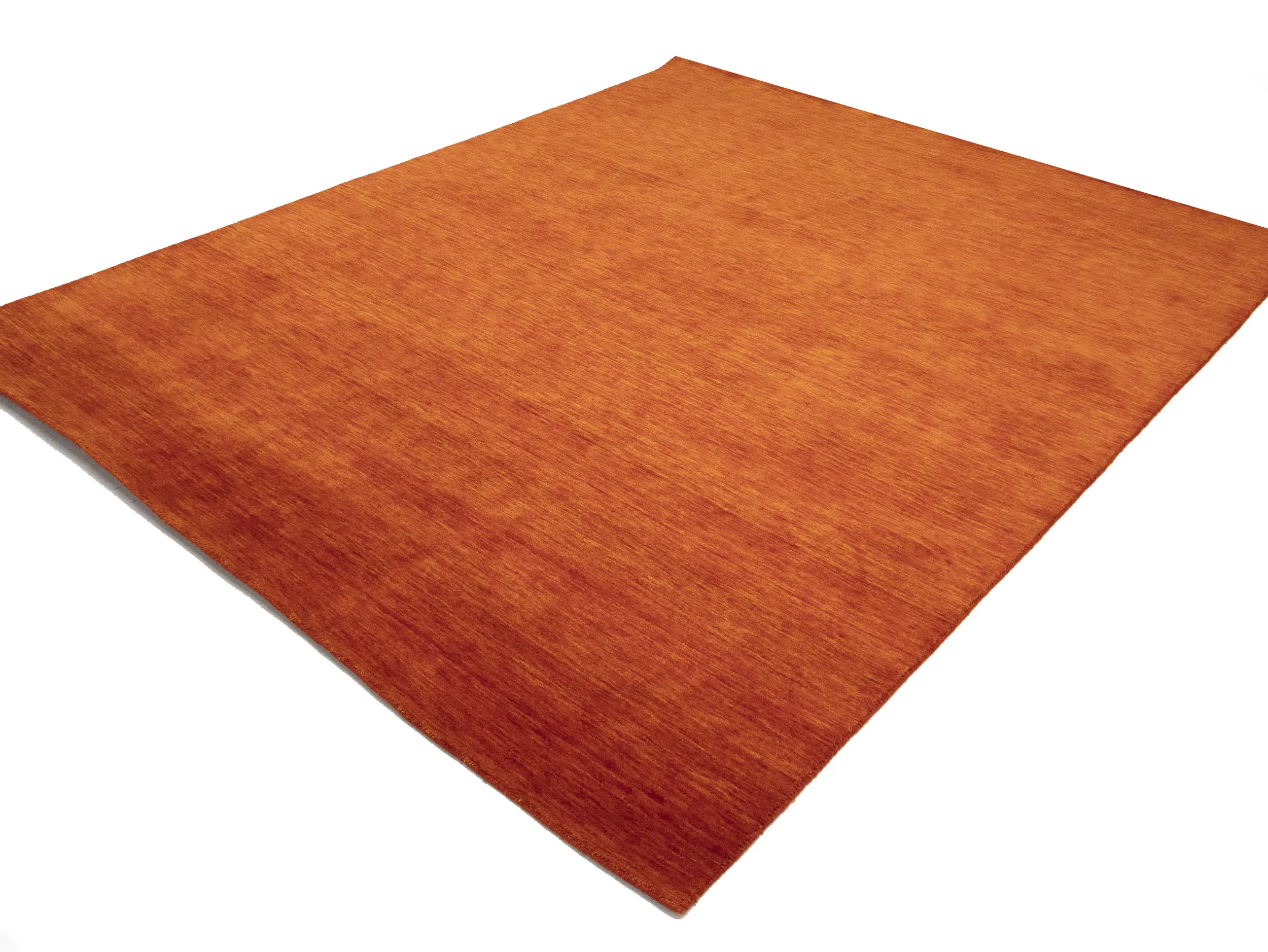 This hand-loomed 8X10 Orange Red Oriental rug from India features a modern, Solid design that seamlessly integrates traditional craftsmanship with contemporary style, showcasing a striking Orange Red primary color. It provides a luxuriant softness and durability underfoot, as it is constructed from premium wool with a cotton foundation. The rug is optimized for high-traffic areas due to its medium pile height and knot density of 100 knots per square inch, which ensures durability and comfort. This rug, which is in exceptional condition and was recently manufactured, is an ideal complement to any contemporary setting, providing both versatility and timeless elegance.