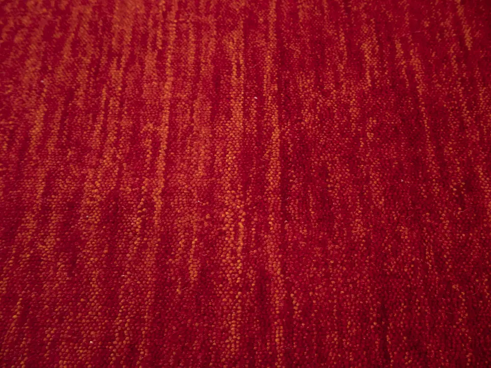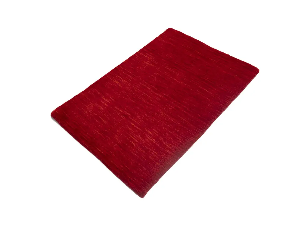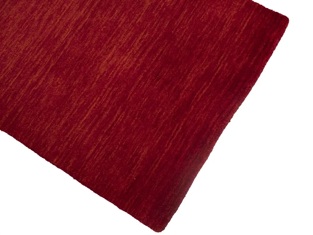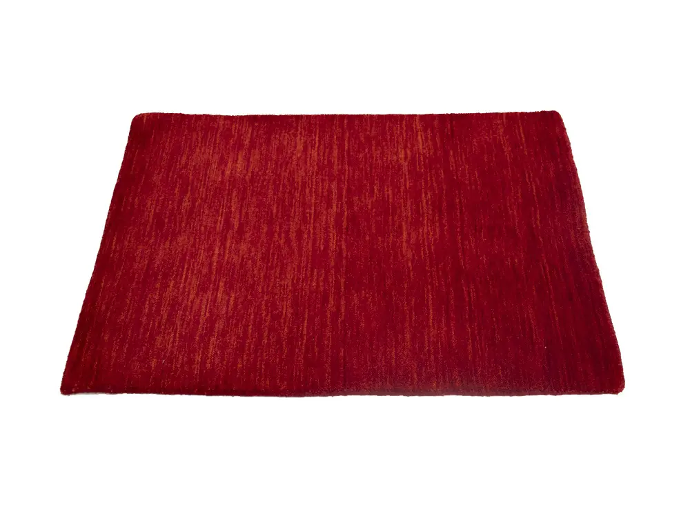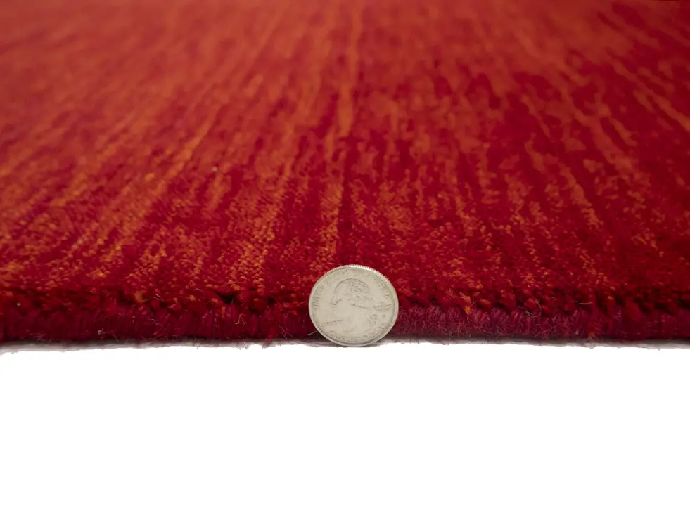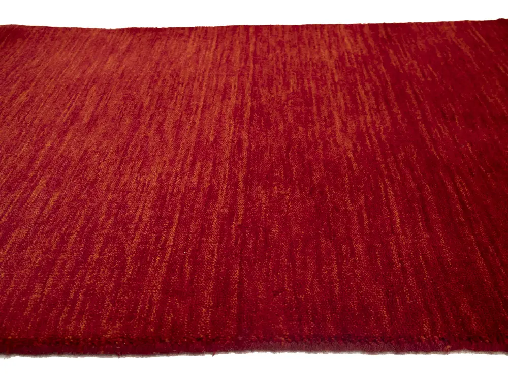 This hand-loomed 2x3 Red Oriental rug from India features a modern, Solid design that seamlessly integrates traditional craftsmanship with contemporary style, showcasing a striking Cherry Red primary color. It provides a luxuriant softness and durability underfoot, as it is constructed from premium wool with a cotton foundation. The rug is optimized for high-traffic areas due to its medium pile height and knot density of 100 knots per square inch, which ensures durability and comfort. This rug, which is in exceptional condition and was recently manufactured, is an ideal complement to any contemporary setting, providing both versatility and timeless elegance.