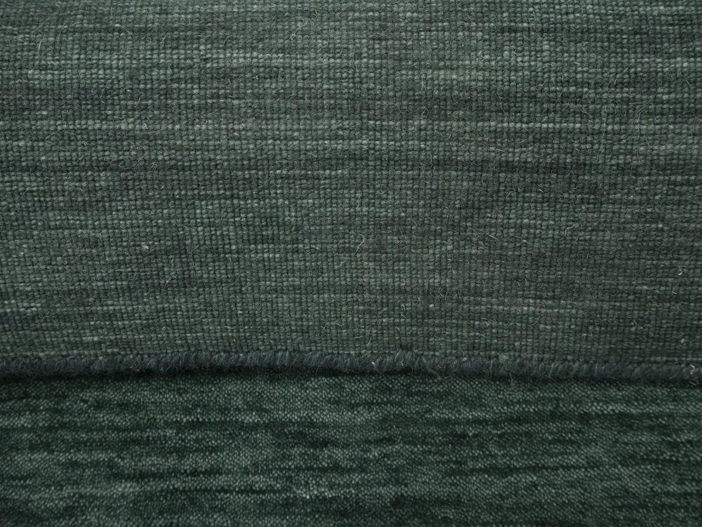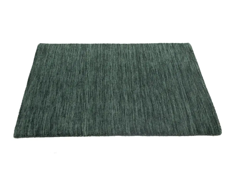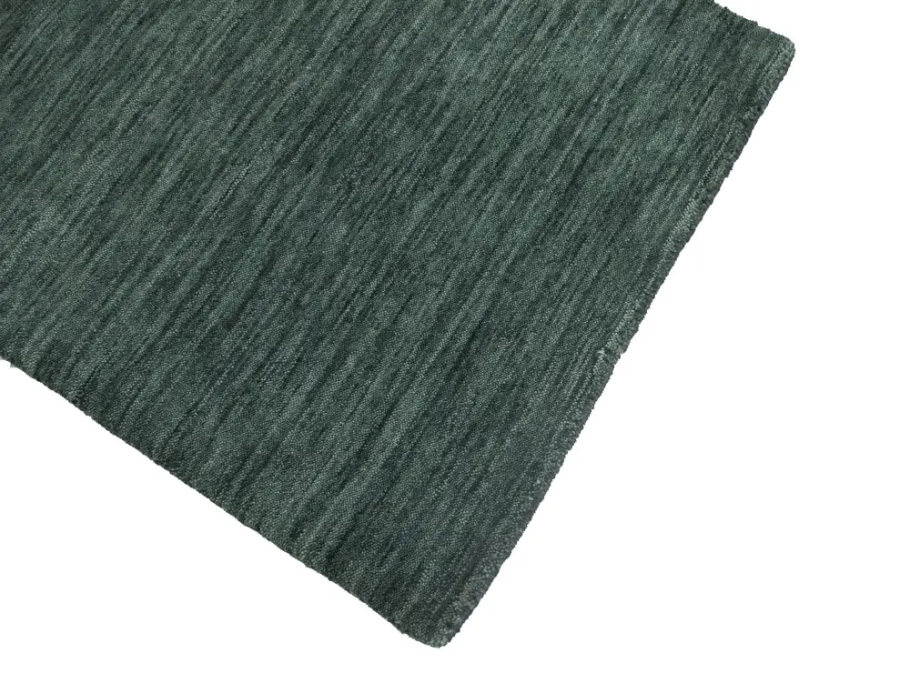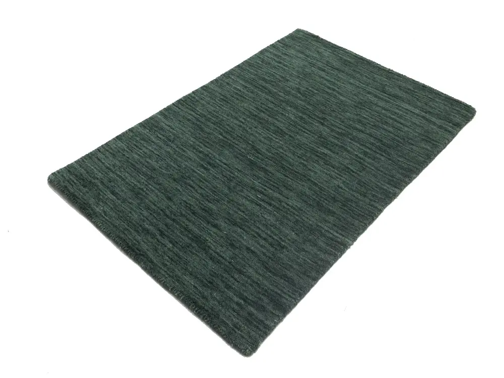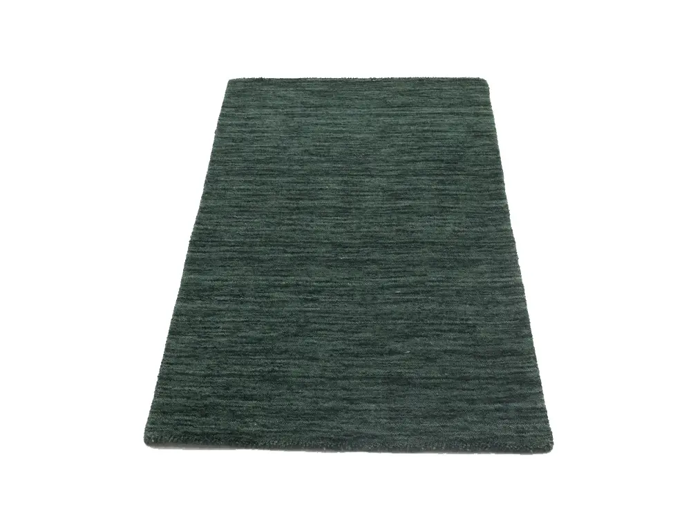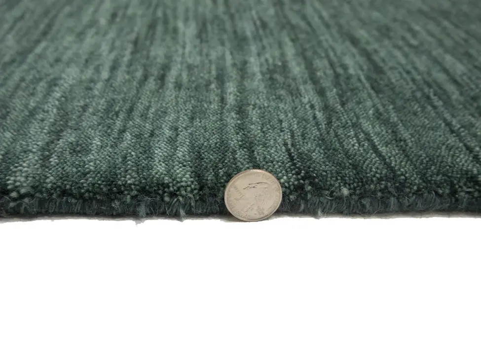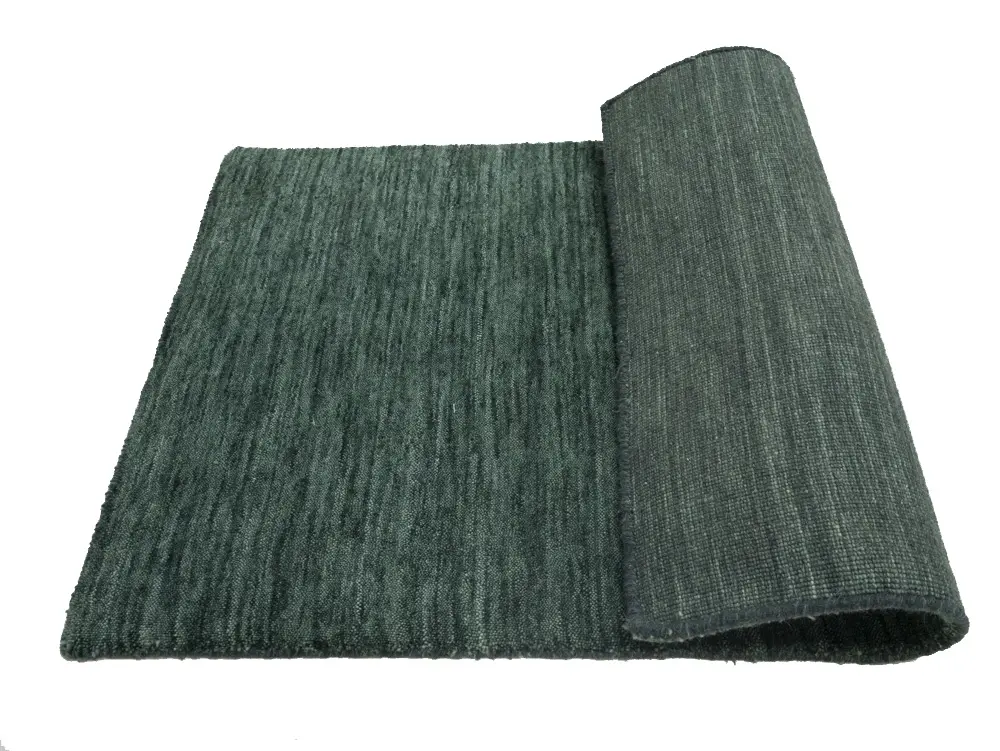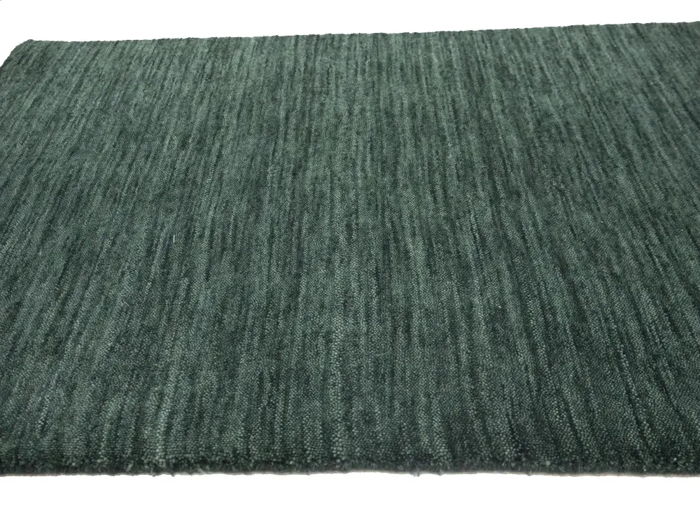 This hand-loomed Oriental rug from India features a modern, Solid design that seamlessly integrates traditional craftsmanship with contemporary style, showcasing a striking Dark Green primary color. It provides a luxuriant softness and durability underfoot, as it is constructed from premium wool with a cotton foundation. The rug is optimized for high-traffic areas due to its medium pile height and knot density of 100 knots per square inch, which ensures durability and comfort. This rug, which is in exceptional condition and was recently manufactured, is an ideal complement to any contemporary setting, providing both versatility and timeless elegance.