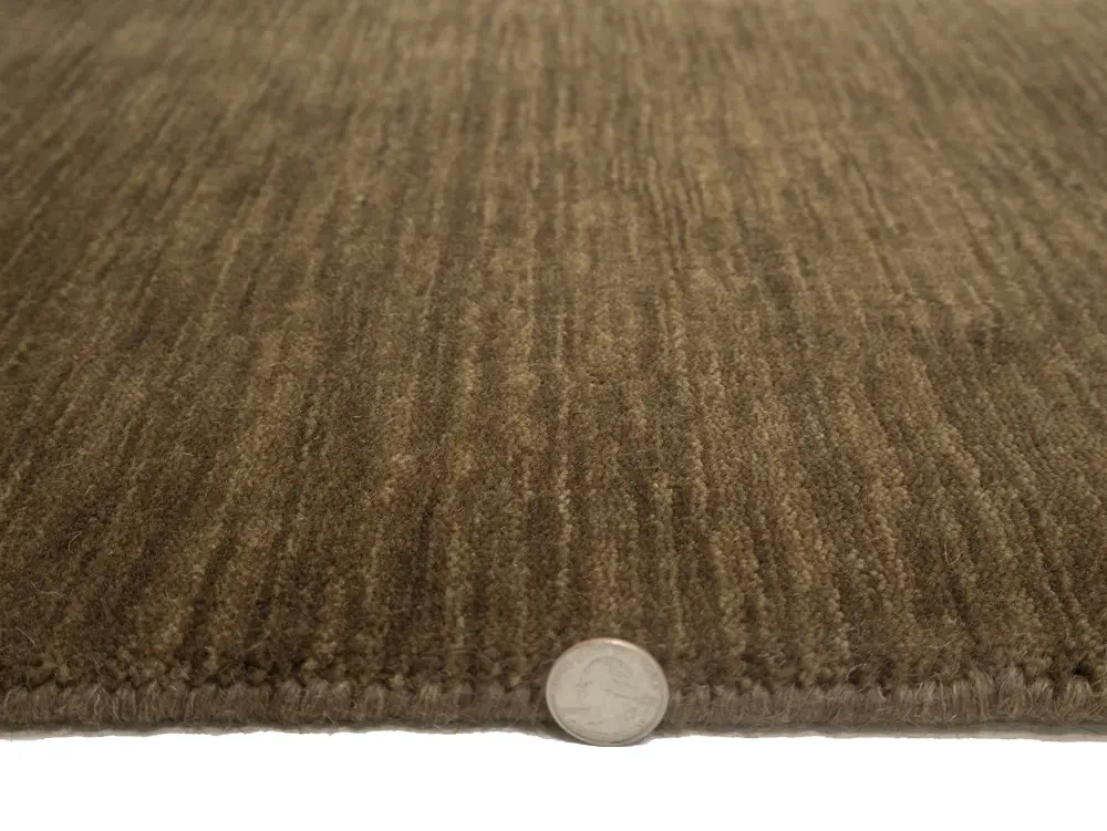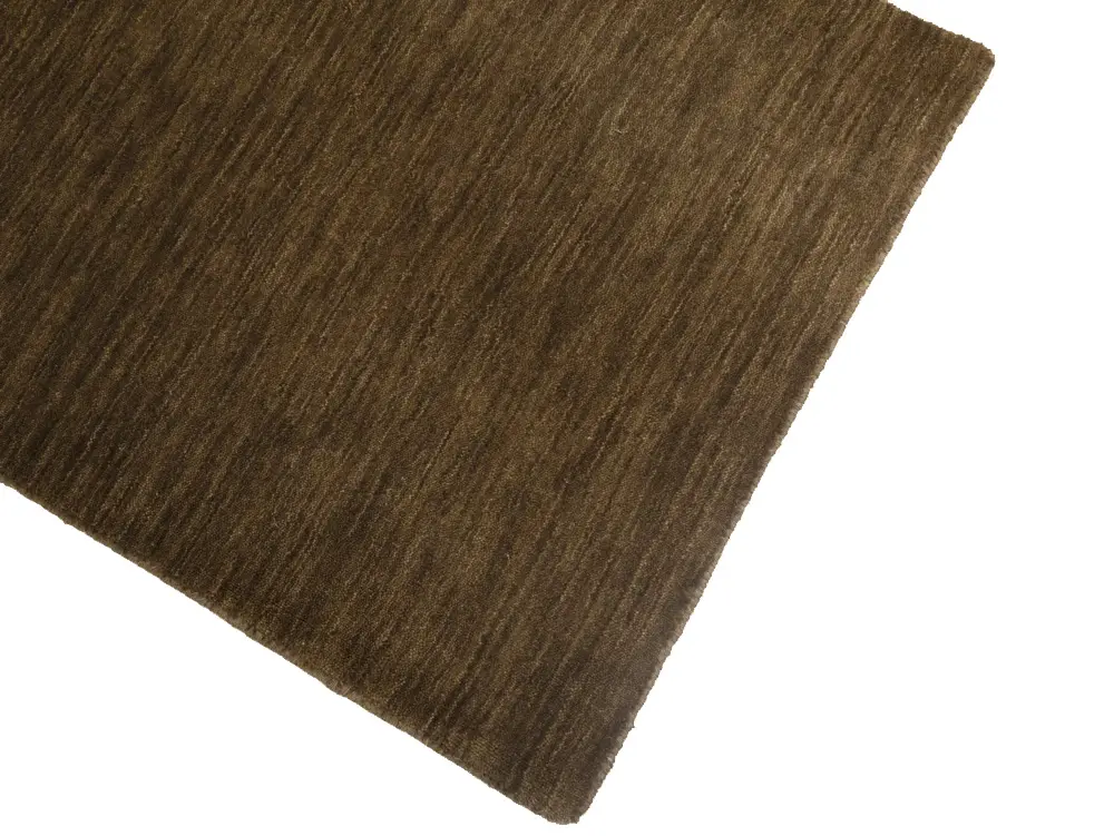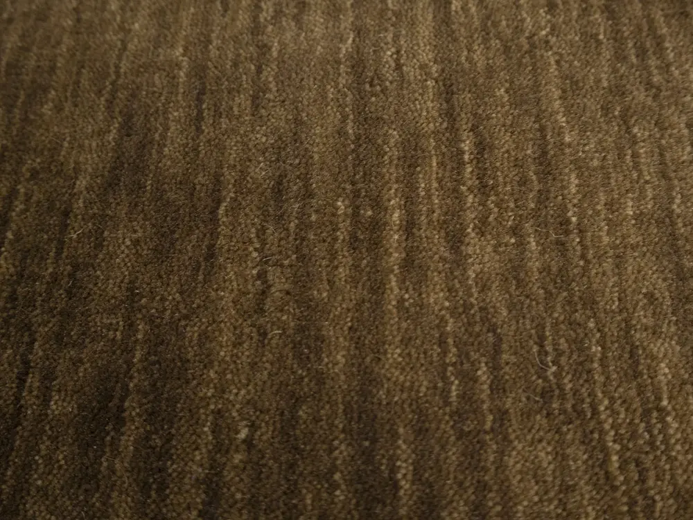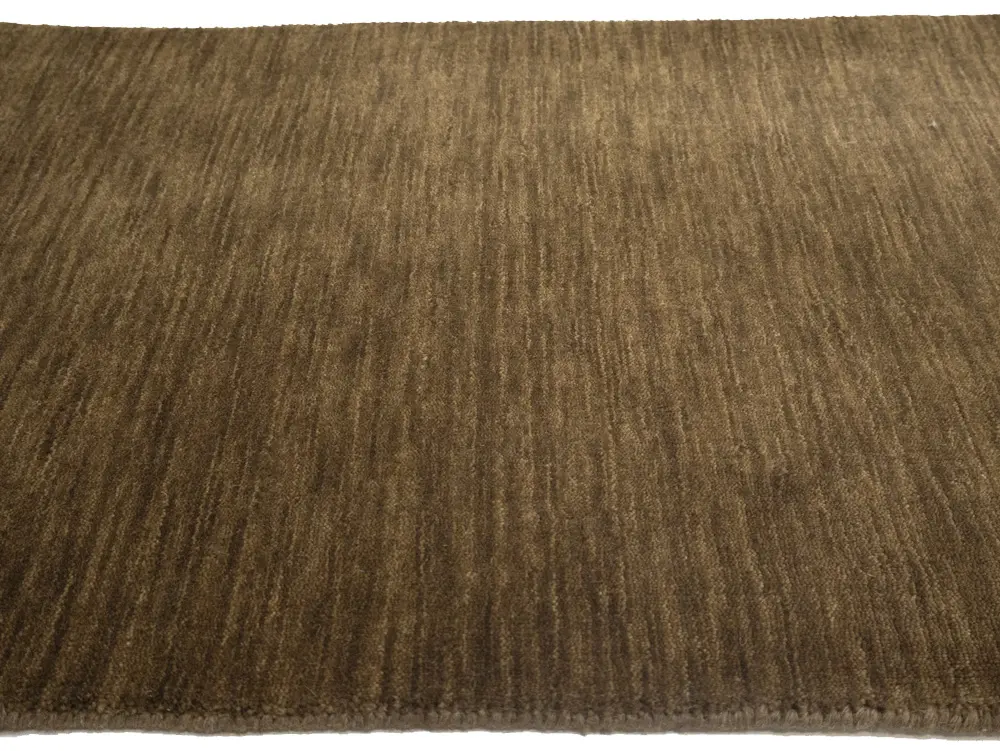 This hand-loomed Oriental rug from India features a modern, Solid design that seamlessly integrates traditional craftsmanship with contemporary style, showcasing a striking Brown primary color. It provides a luxuriant softness and durability underfoot, as it is constructed from premium wool with a cotton foundation. The rug is optimized for high-traffic areas due to its medium pile height and knot density of 100 knots per square inch, which ensures durability and comfort. This rug, which is in exceptional condition and was recently manufactured, is an ideal complement to any contemporary setting, providing both versatility and timeless elegance.