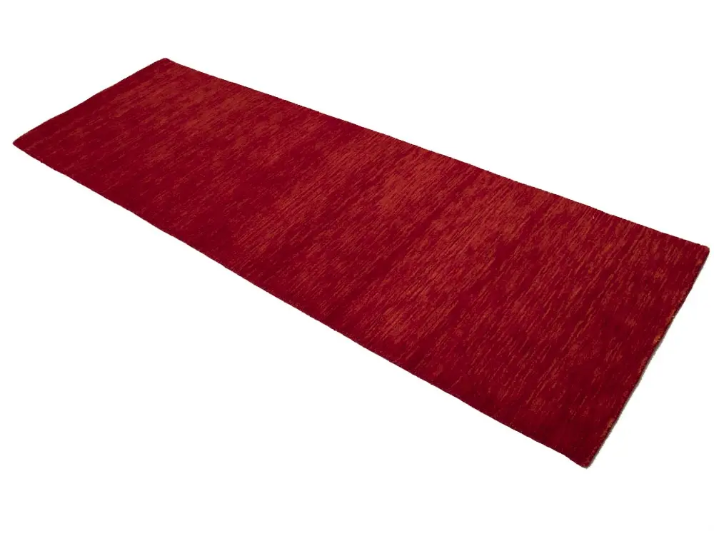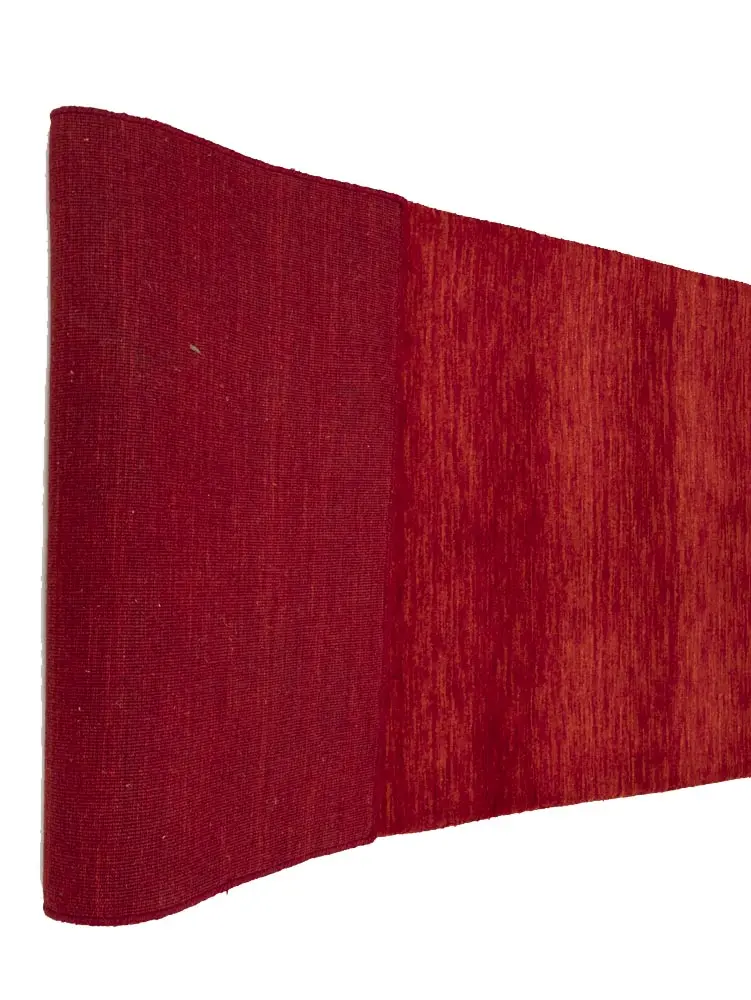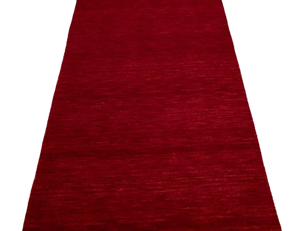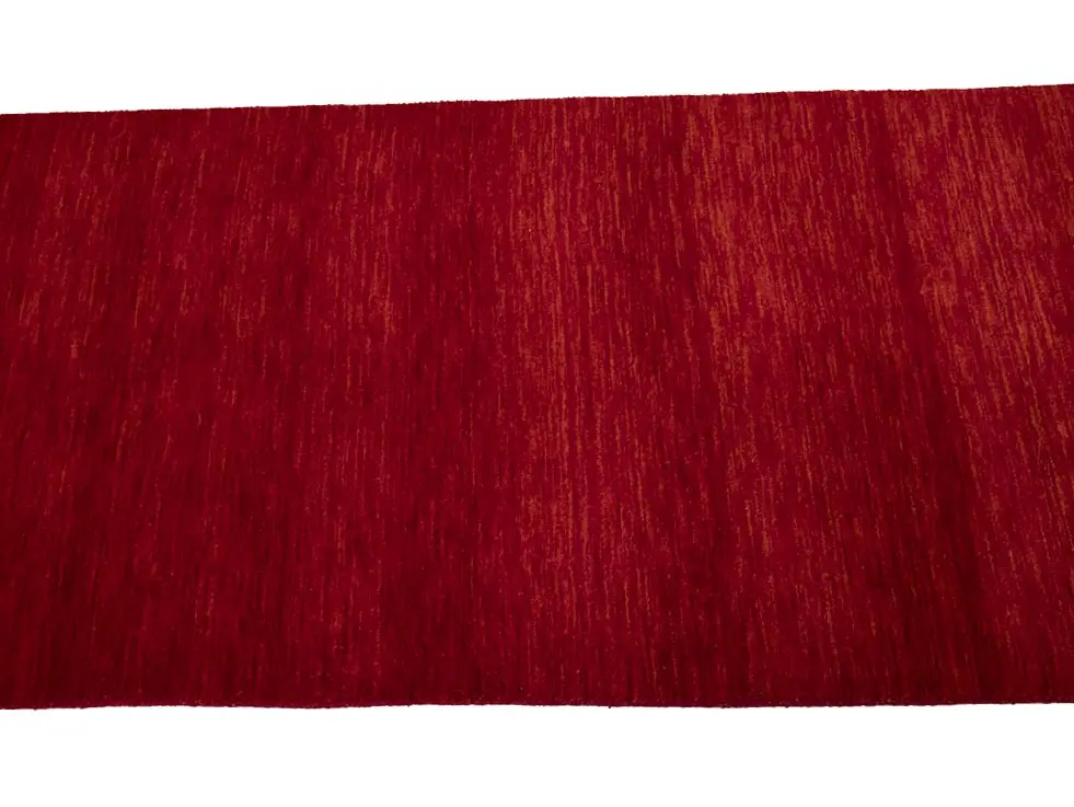 This hand-loomed 3X8 Red Oriental Runner rug from India features a modern, Solid design that seamlessly integrates traditional craftsmanship with contemporary style, showcasing a striking Cherry Red primary color. It provides a luxuriant softness and durability underfoot, as it is constructed from premium wool with a cotton foundation. The rug is optimized for high-traffic areas due to its medium pile height and knot density of 100 knots per square inch, which ensures durability and comfort. This rug, which is in exceptional condition and was recently manufactured, is an ideal complement to any contemporary setting, providing both versatility and timeless elegance.