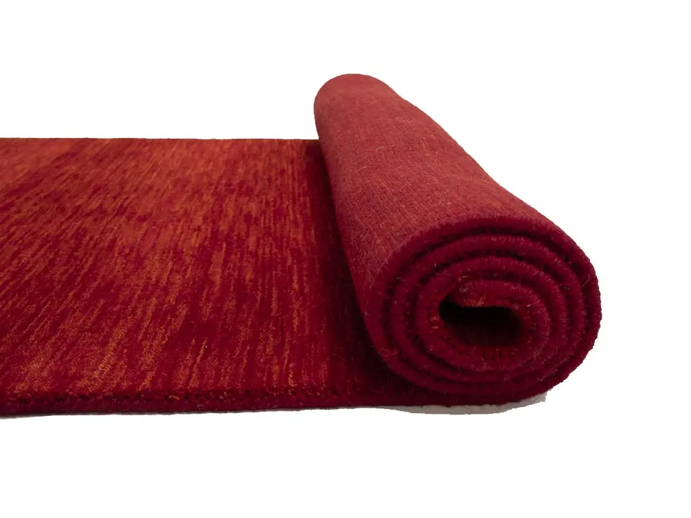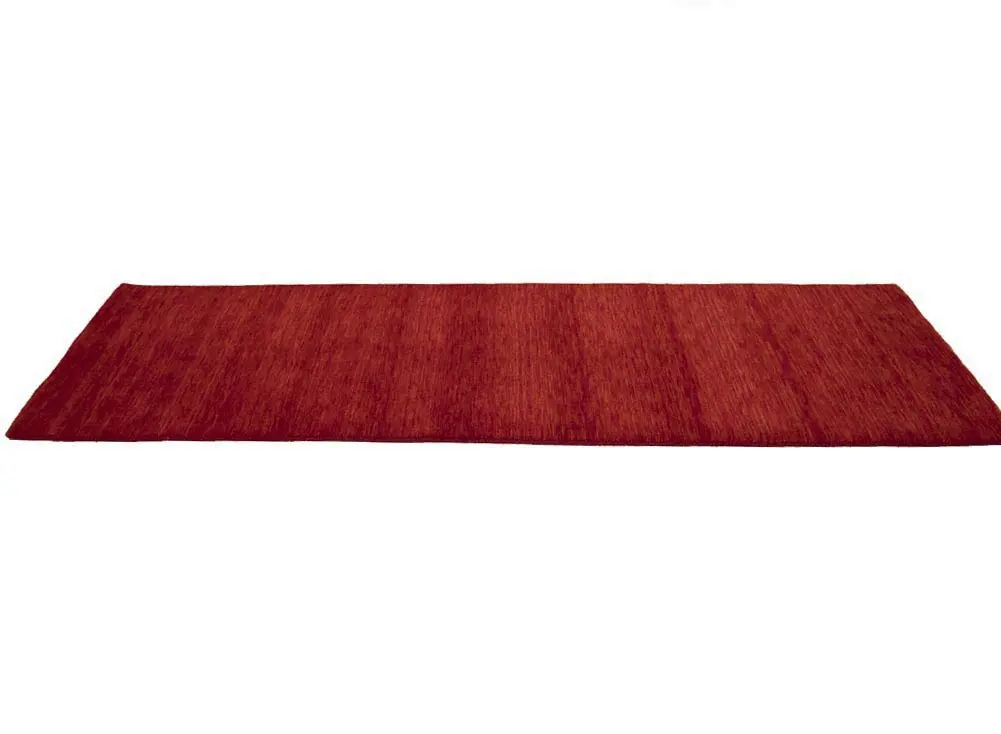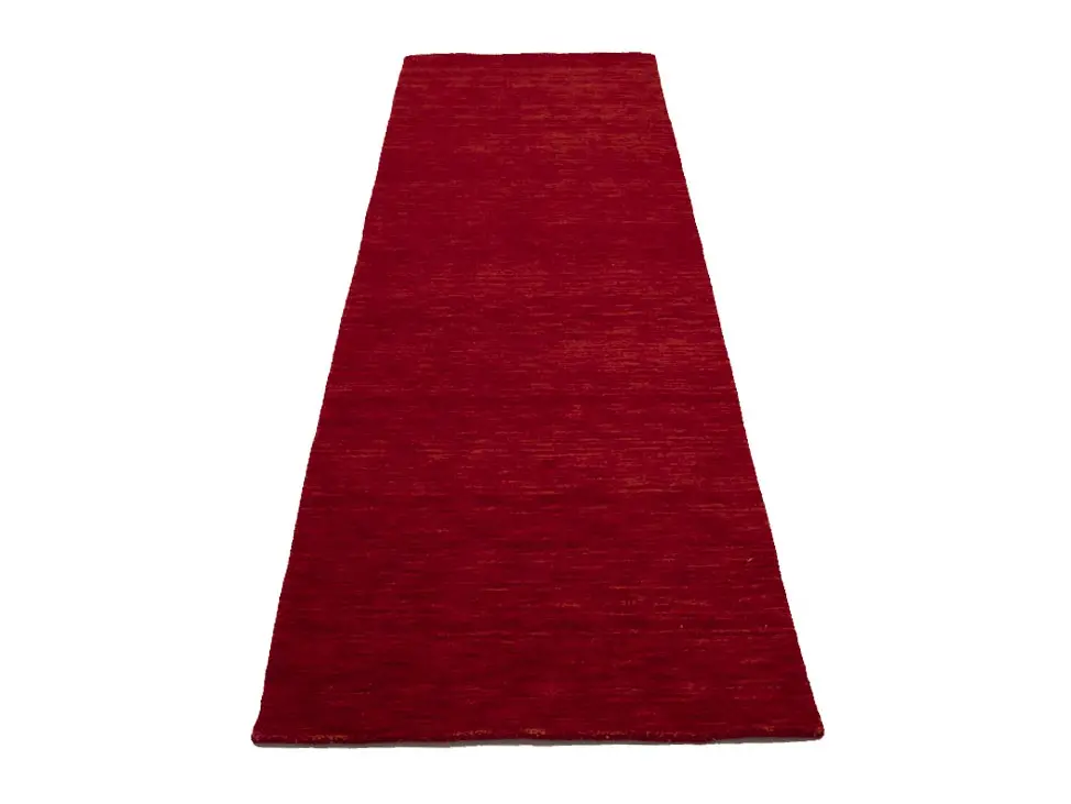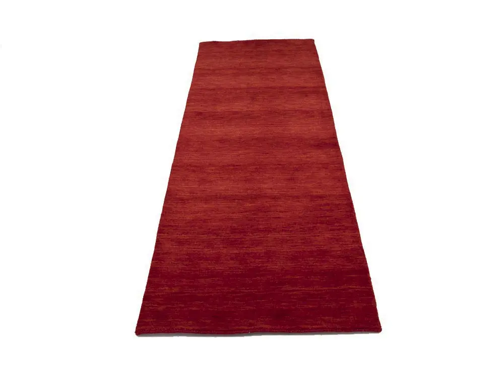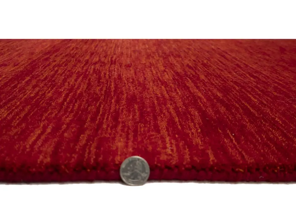 This hand-loomed 3X8 Red Oriental Runner rug from India features a modern, Solid design that seamlessly integrates traditional craftsmanship with contemporary style, showcasing a striking Cherry Red primary color. It provides a luxuriant softness and durability underfoot, as it is constructed from premium wool with a cotton foundation. The rug is optimized for high-traffic areas due to its medium pile height and knot density of 100 knots per square inch, which ensures durability and comfort. This rug, which is in exceptional condition and was recently manufactured, is an ideal complement to any contemporary setting, providing both versatility and timeless elegance.