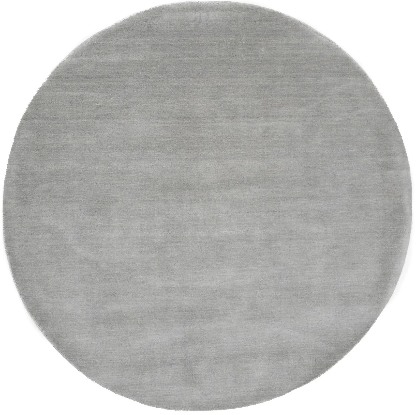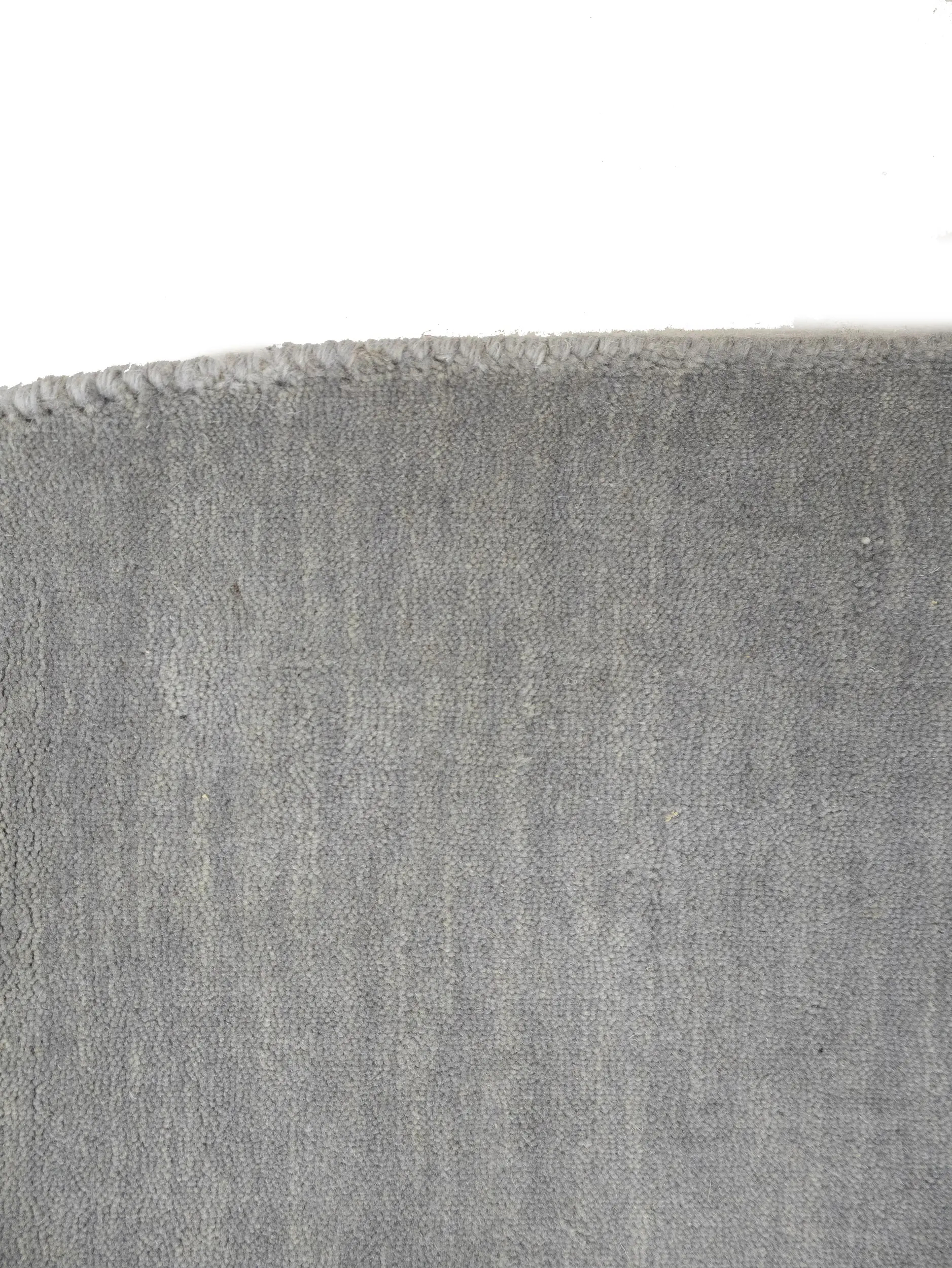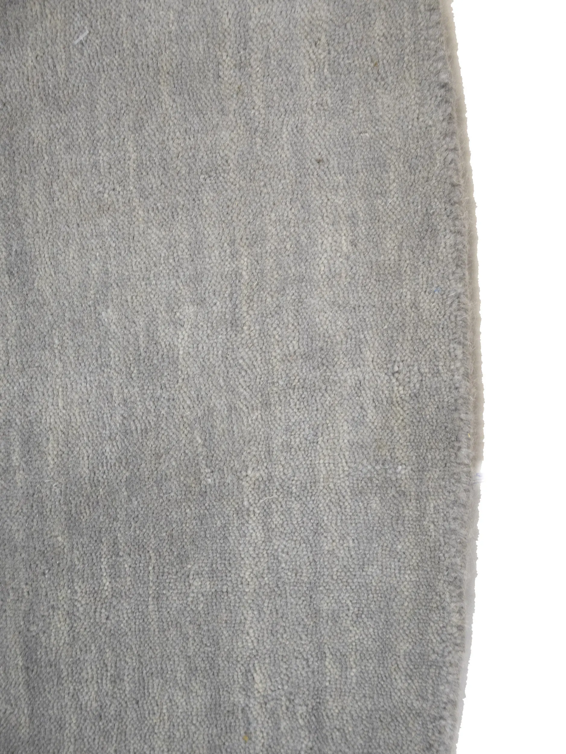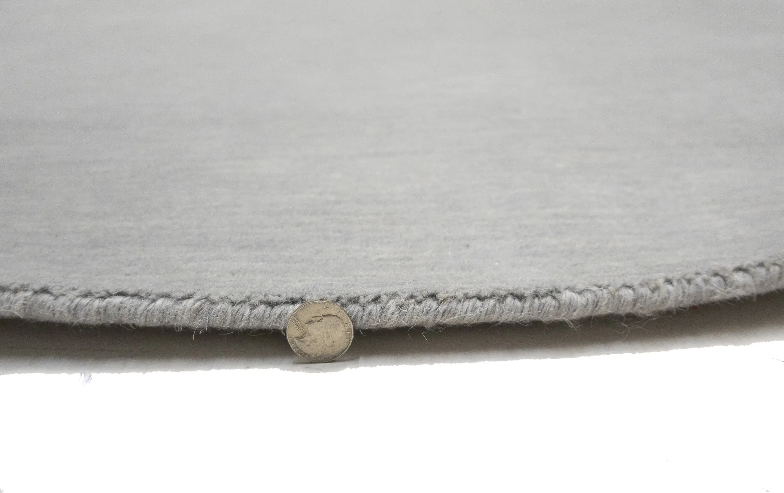 This hand-loomed 6X6 Gray Oriental Round rug from India features a modern, Solid design that seamlessly integrates traditional craftsmanship with contemporary style, showcasing a striking Gray primary color. It provides a luxuriant softness and durability underfoot, as it is constructed from premium wool with a cotton foundation. The rug is optimized for high-traffic areas due to its medium pile height and knot density of 100 knots per square inch, which ensures durability and comfort. This rug, which is in exceptional condition and was recently manufactured, is an ideal complement to any contemporary setting, providing both versatility and timeless elegance.
