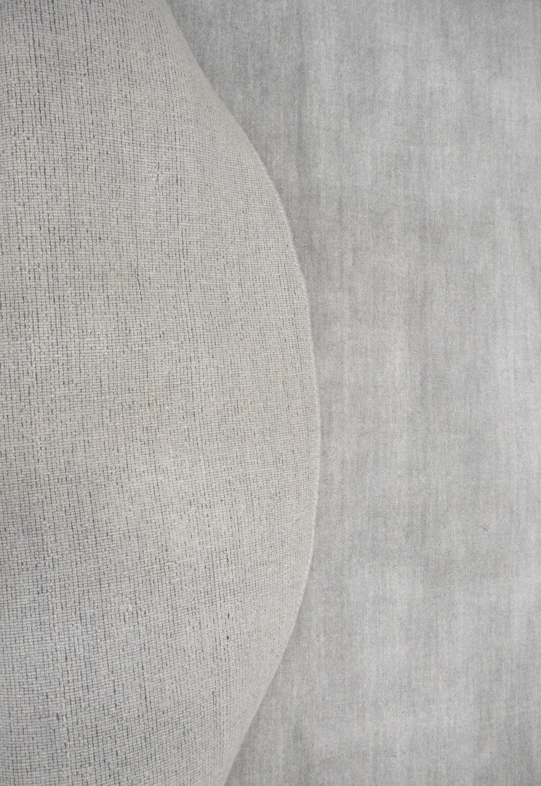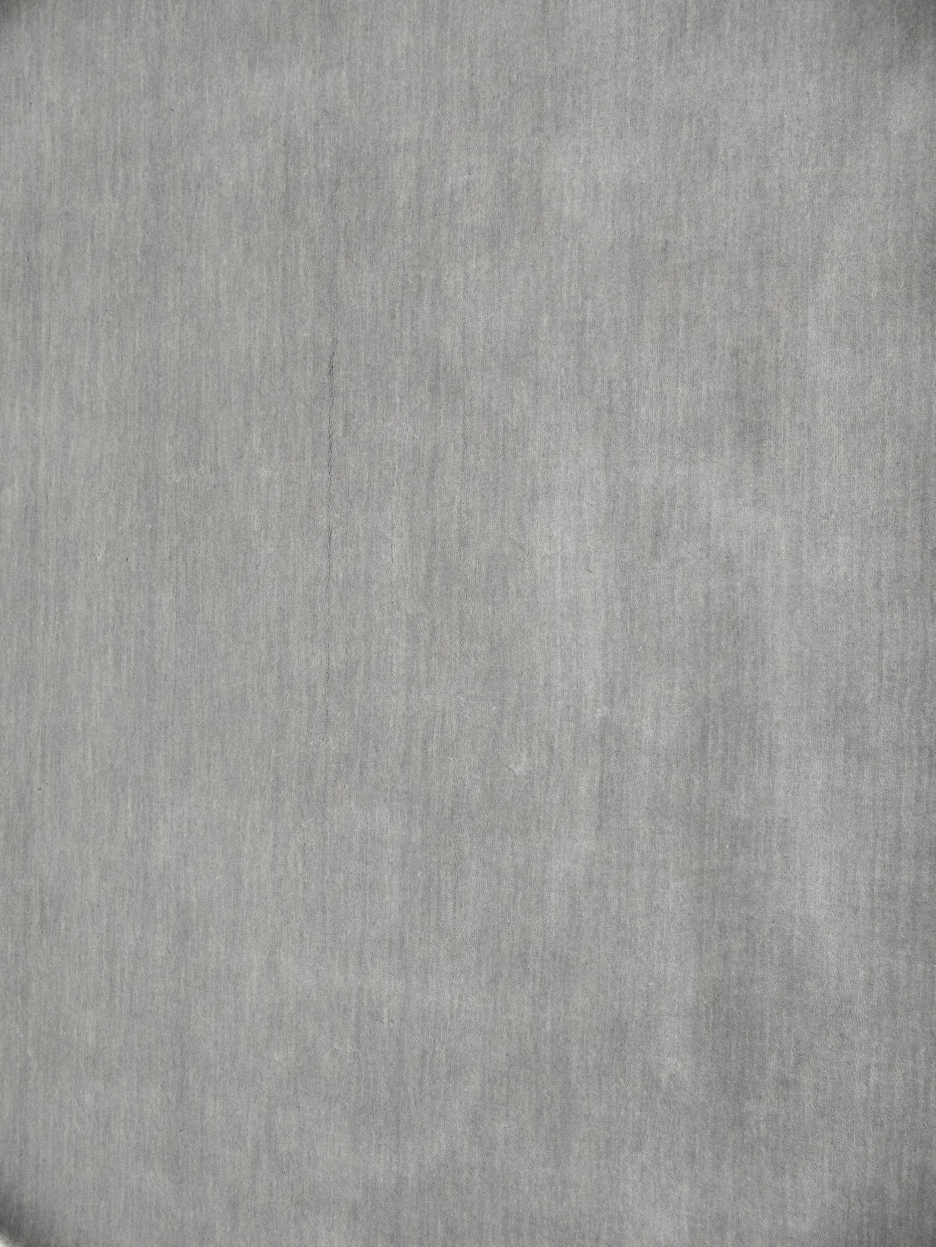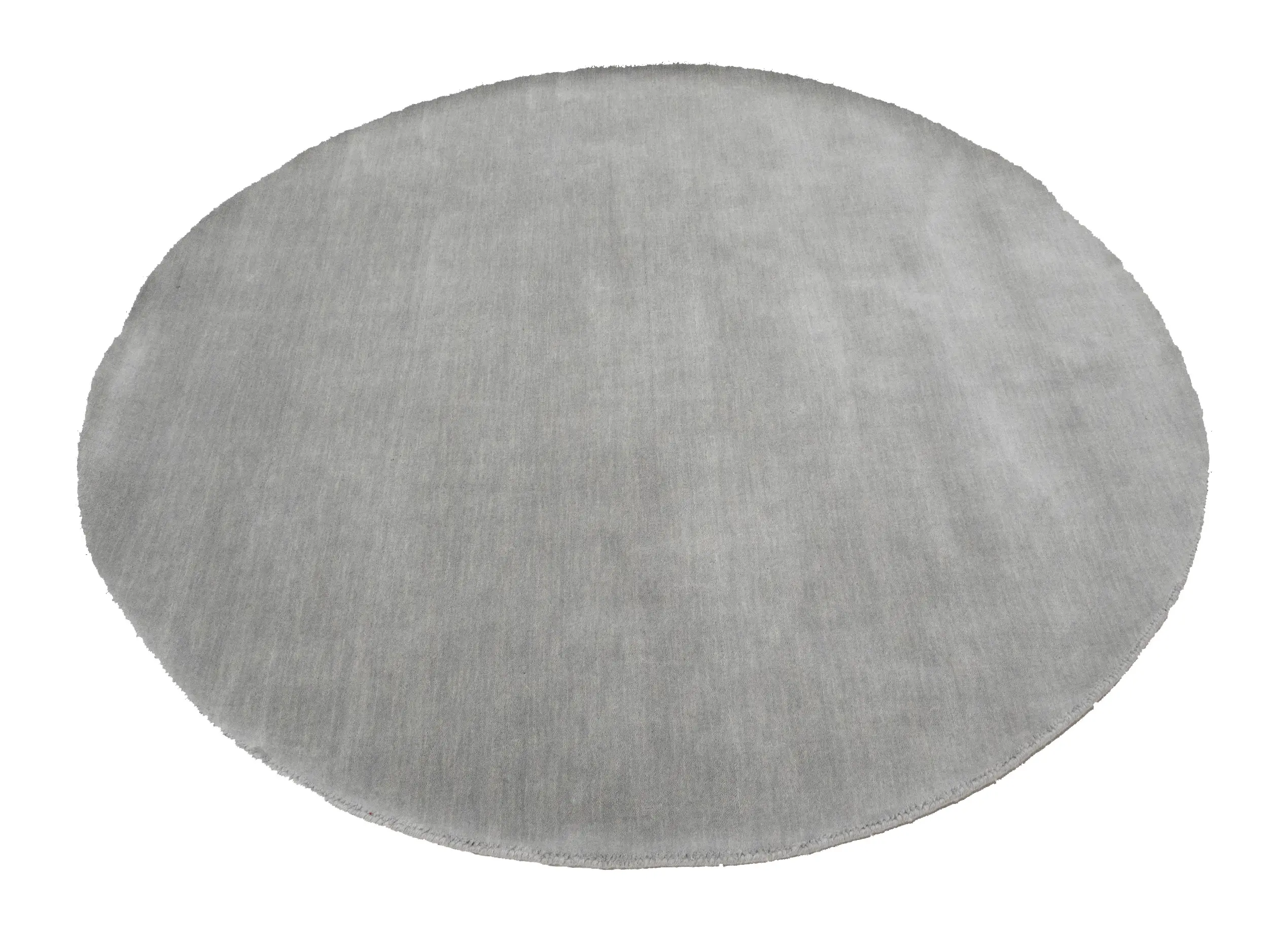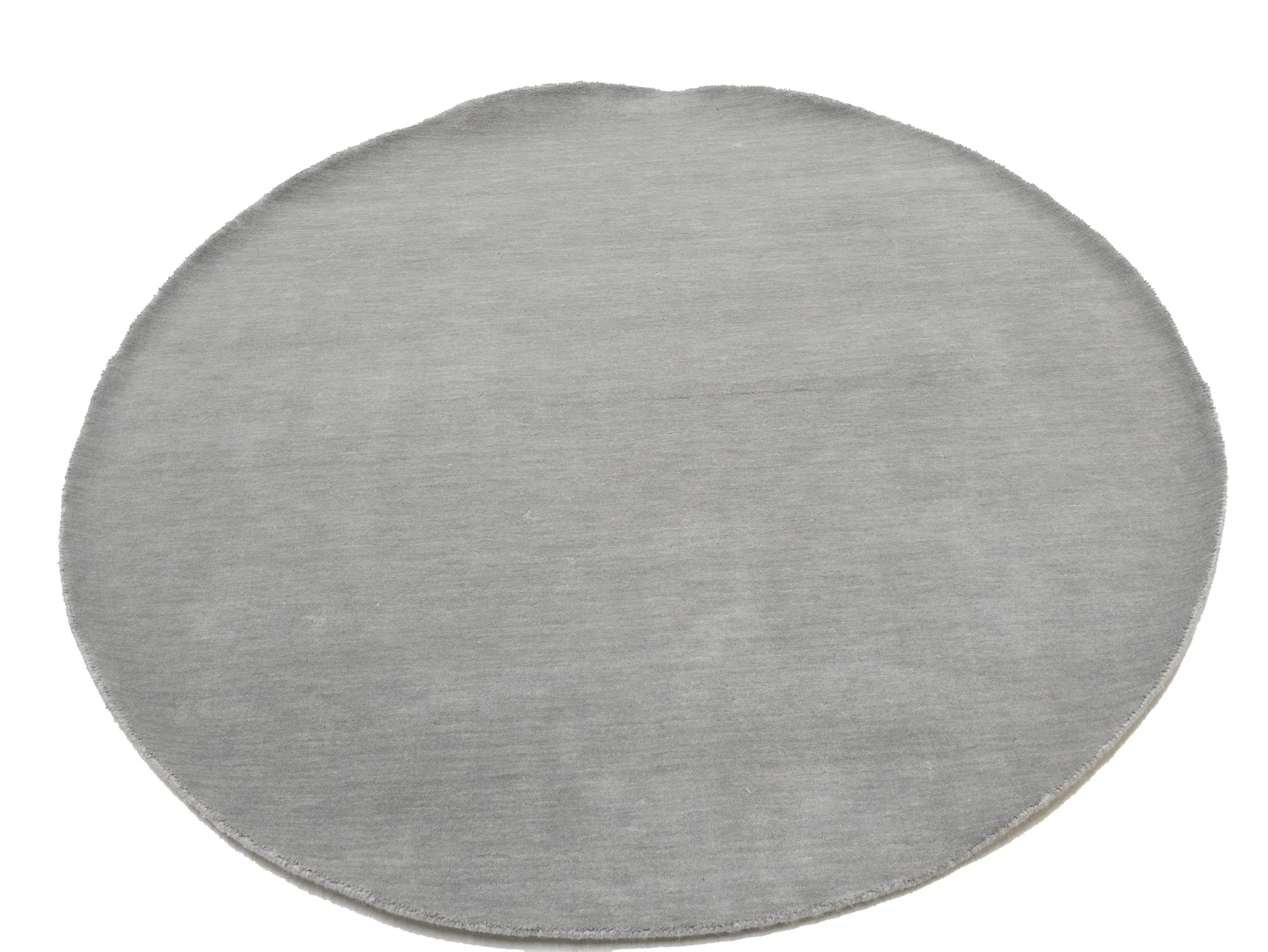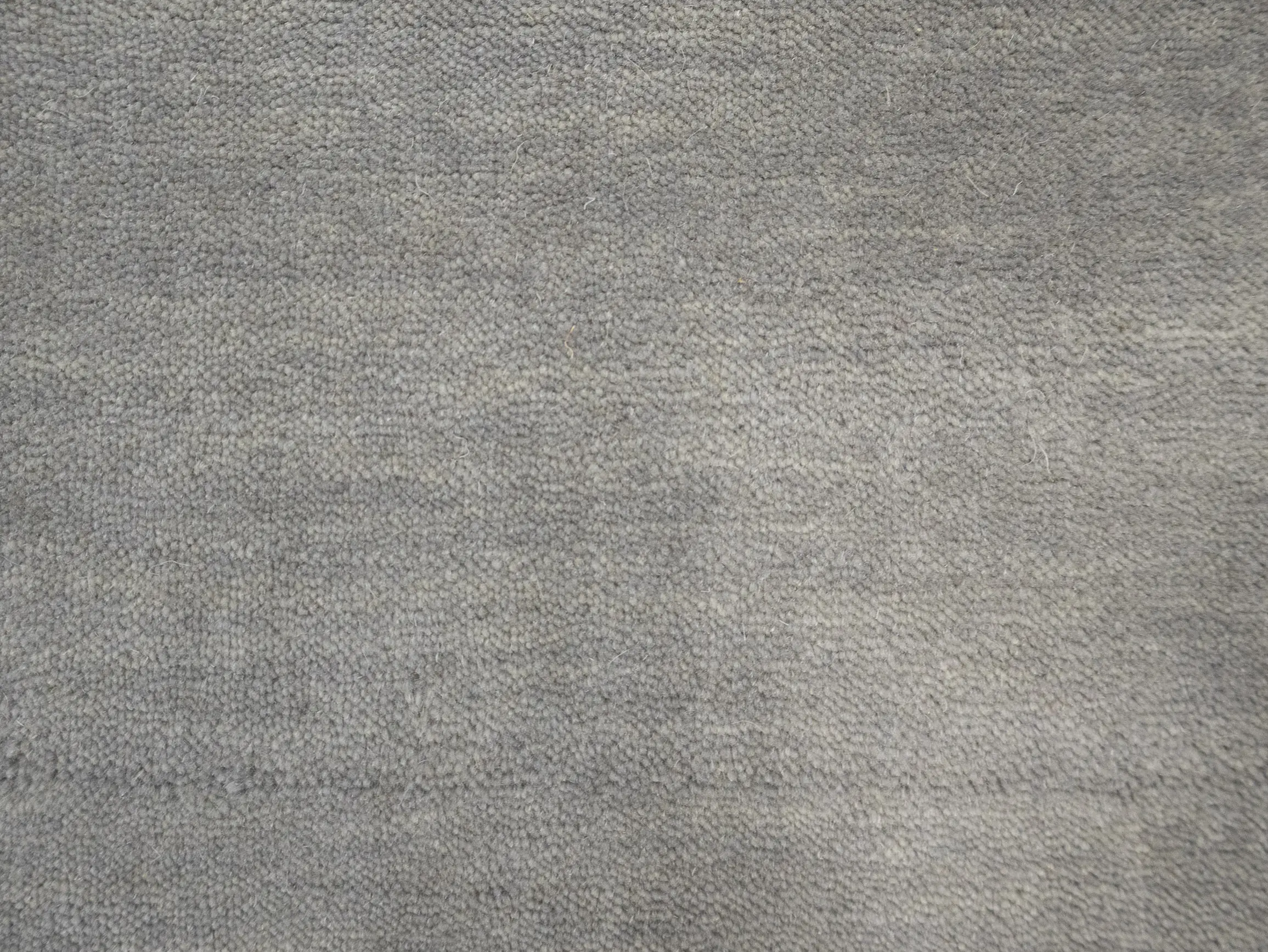 This hand-loomed 6X6 Gray Oriental Round rug from India features a modern, Solid design that seamlessly integrates traditional craftsmanship with contemporary style, showcasing a striking Gray primary color. It provides a luxuriant softness and durability underfoot, as it is constructed from premium wool with a cotton foundation. The rug is optimized for high-traffic areas due to its medium pile height and knot density of 100 knots per square inch, which ensures durability and comfort. This rug, which is in exceptional condition and was recently manufactured, is an ideal complement to any contemporary setting, providing both versatility and timeless elegance.