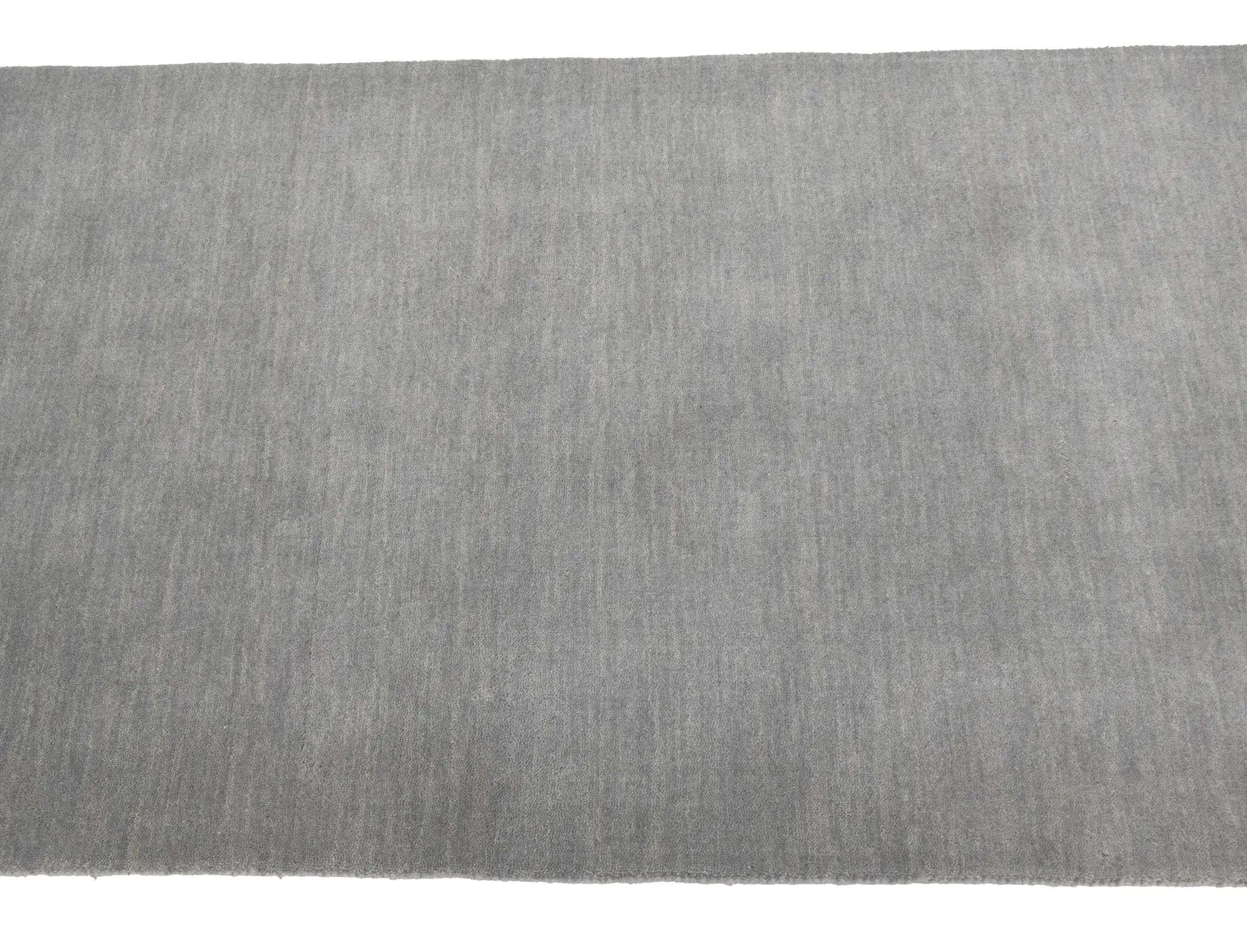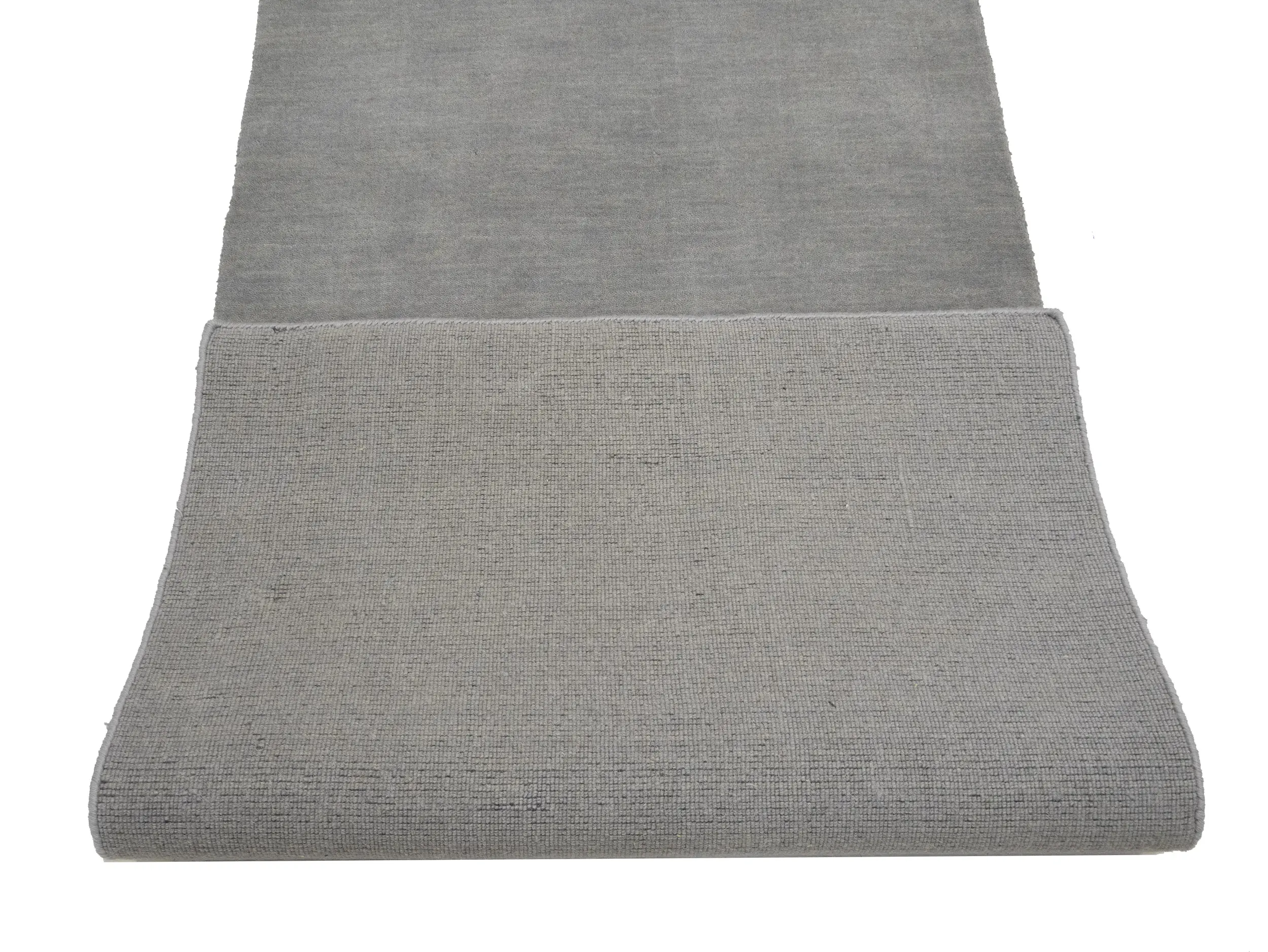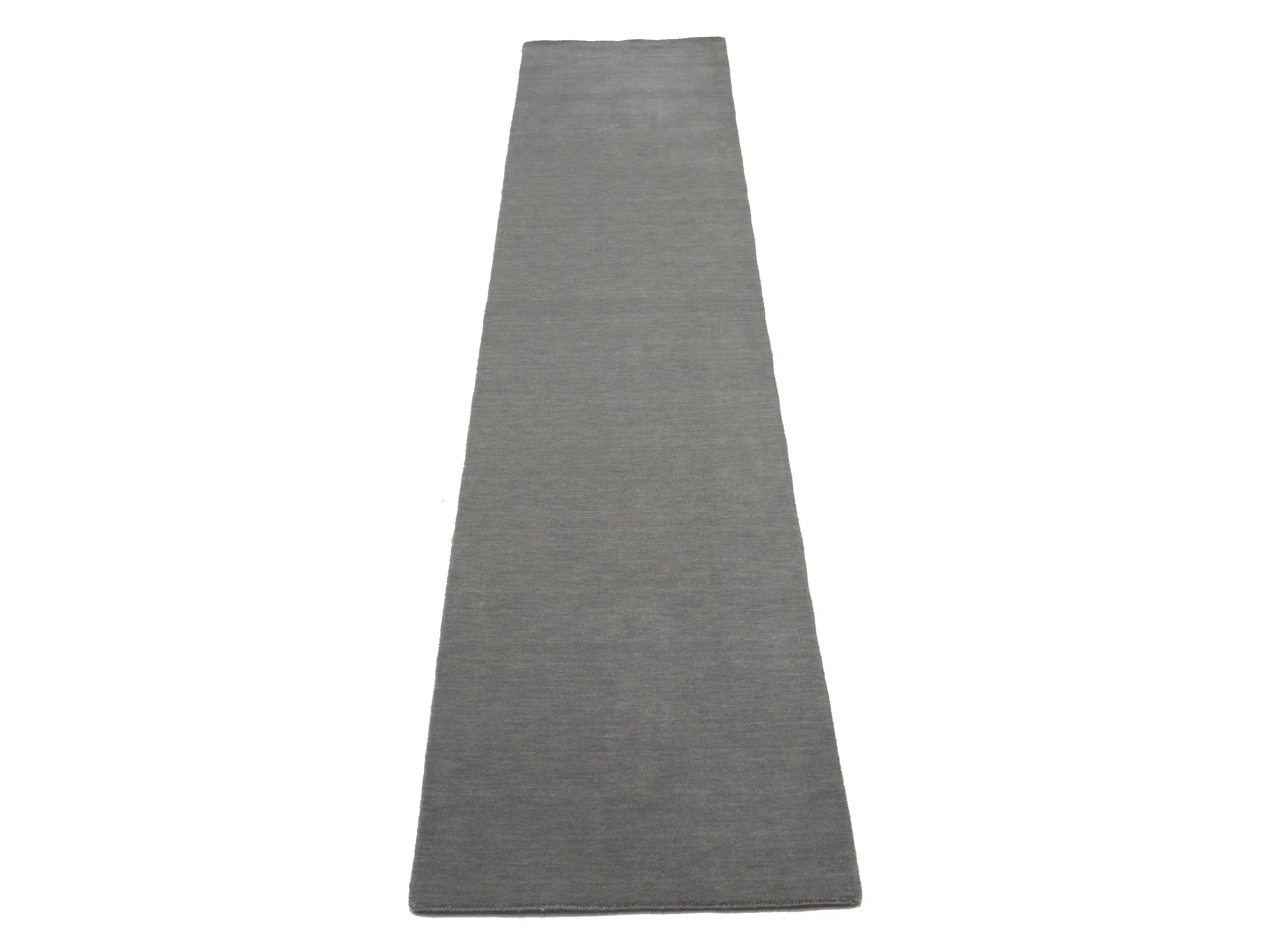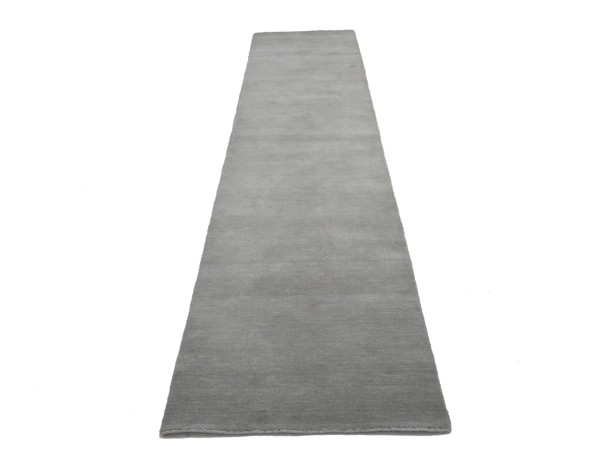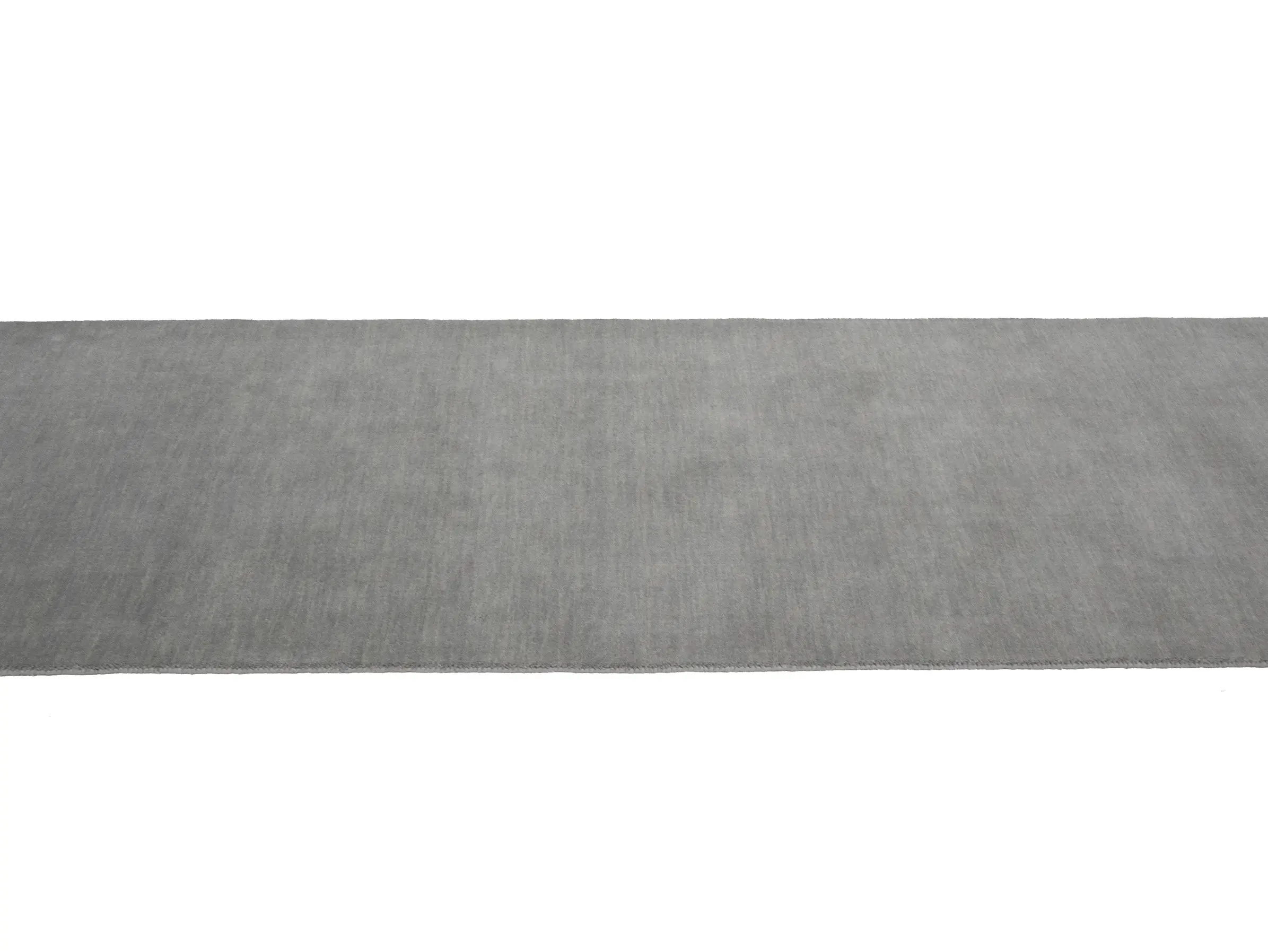 This hand-loomed 3X12 Gray Oriental Runner rug from India features a modern, Solid design that seamlessly integrates traditional craftsmanship with contemporary style, showcasing a striking Gray primary color. It provides a luxuriant softness and durability underfoot, as it is constructed from premium wool with a cotton foundation. The rug is optimized for high-traffic areas due to its medium pile height and knot density of 100 knots per square inch, which ensures durability and comfort. This rug, which is in exceptional condition and was recently manufactured, is an ideal complement to any contemporary setting, providing both versatility and timeless elegance.